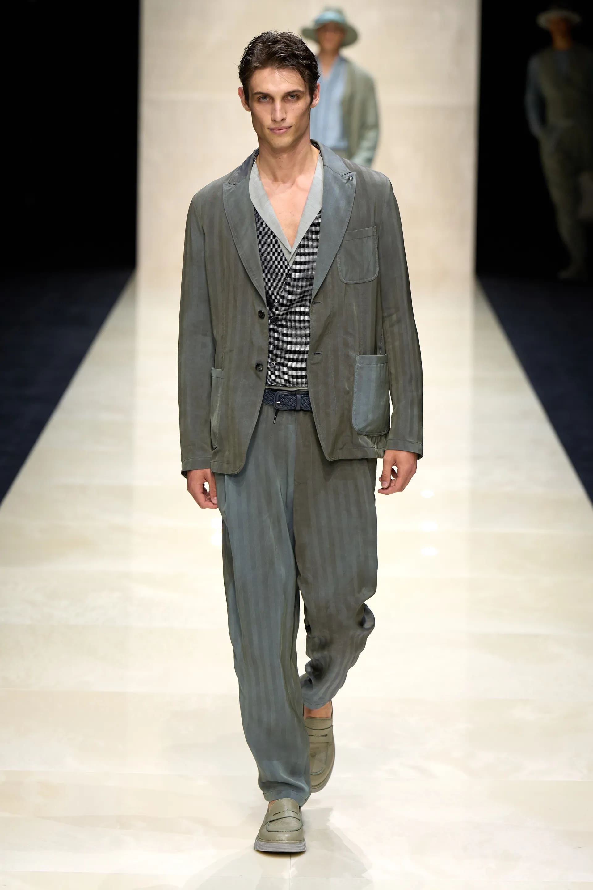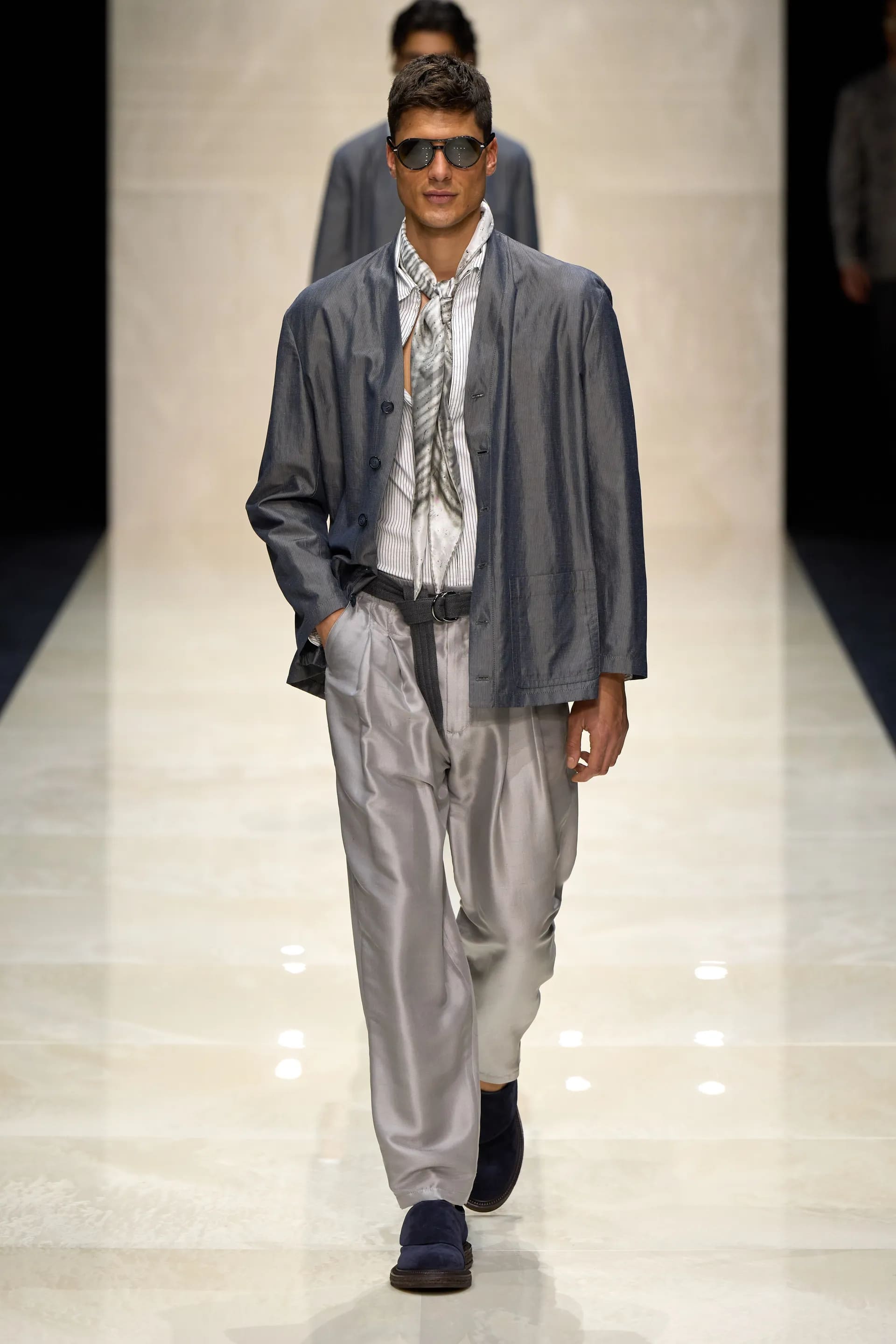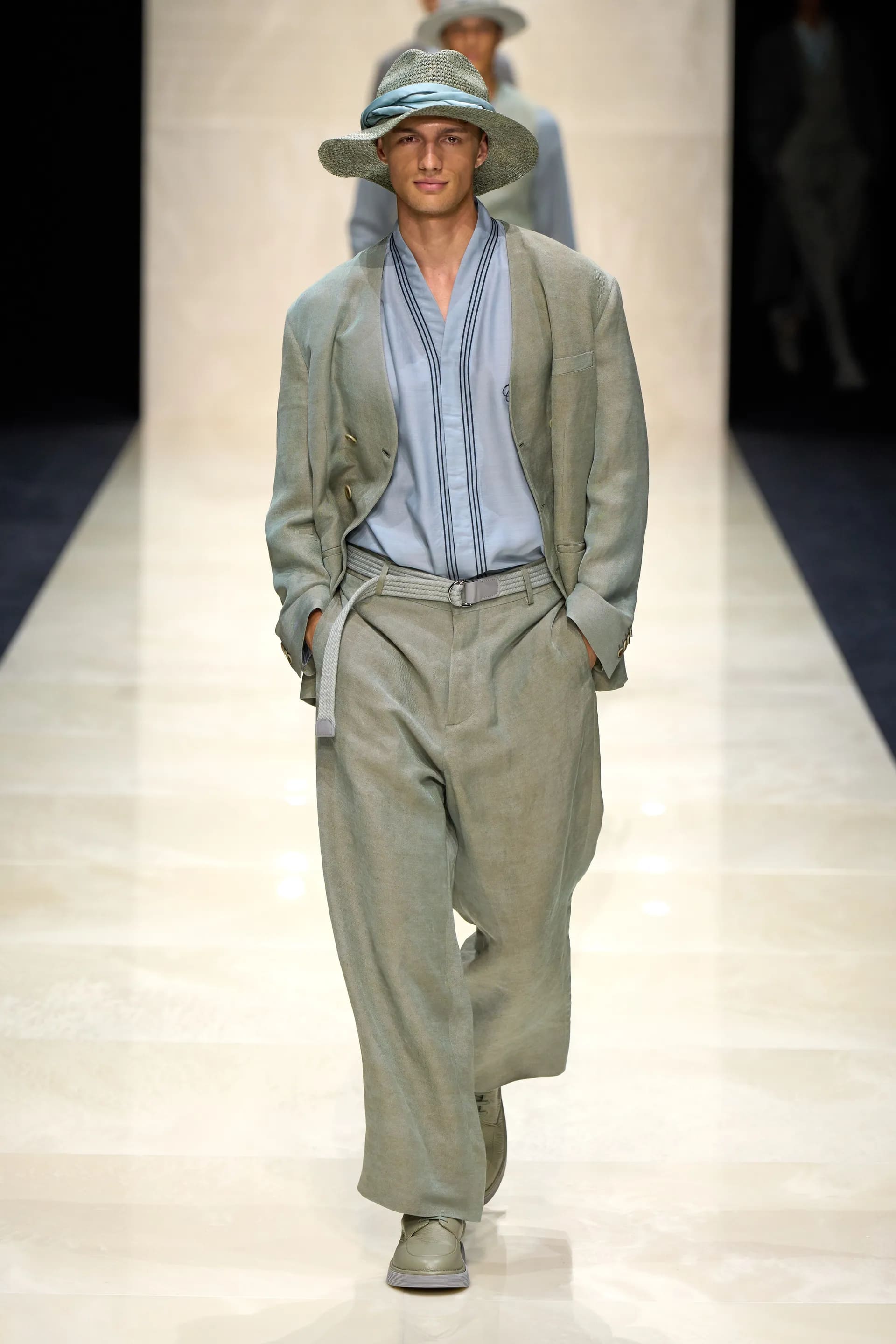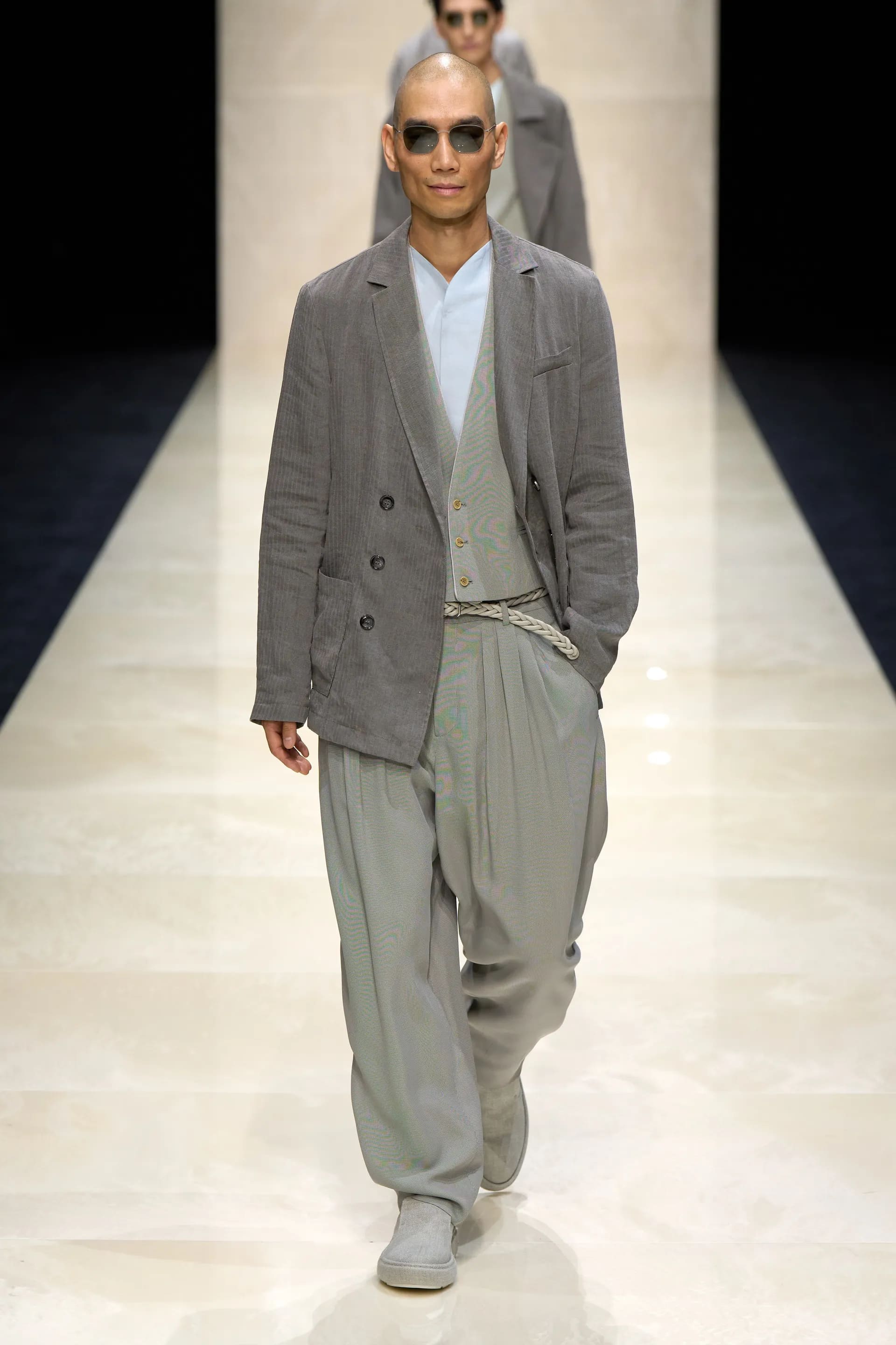 Втомившись від міської рутини та швидкоплинності життя, Giorgio Armani шукали втіху в позачасових силуетах та текстурах. Колекція сезону весна-літо 2025 стала втіленням високої майстерності модного дому, де тейлоринг та деконструкція можуть вдало поєднуватися. Так, на подіумі Giorgio Armani з’явилися шовкові бомбери з накладними кишенями, лляні костюми без лацканів та комірців, вільні сорочки та футболки зі знаковими геометричними принтами.
