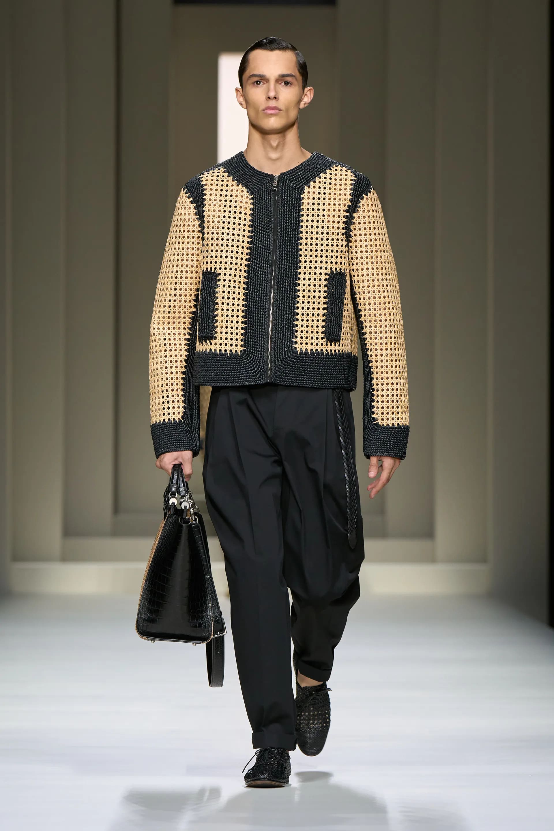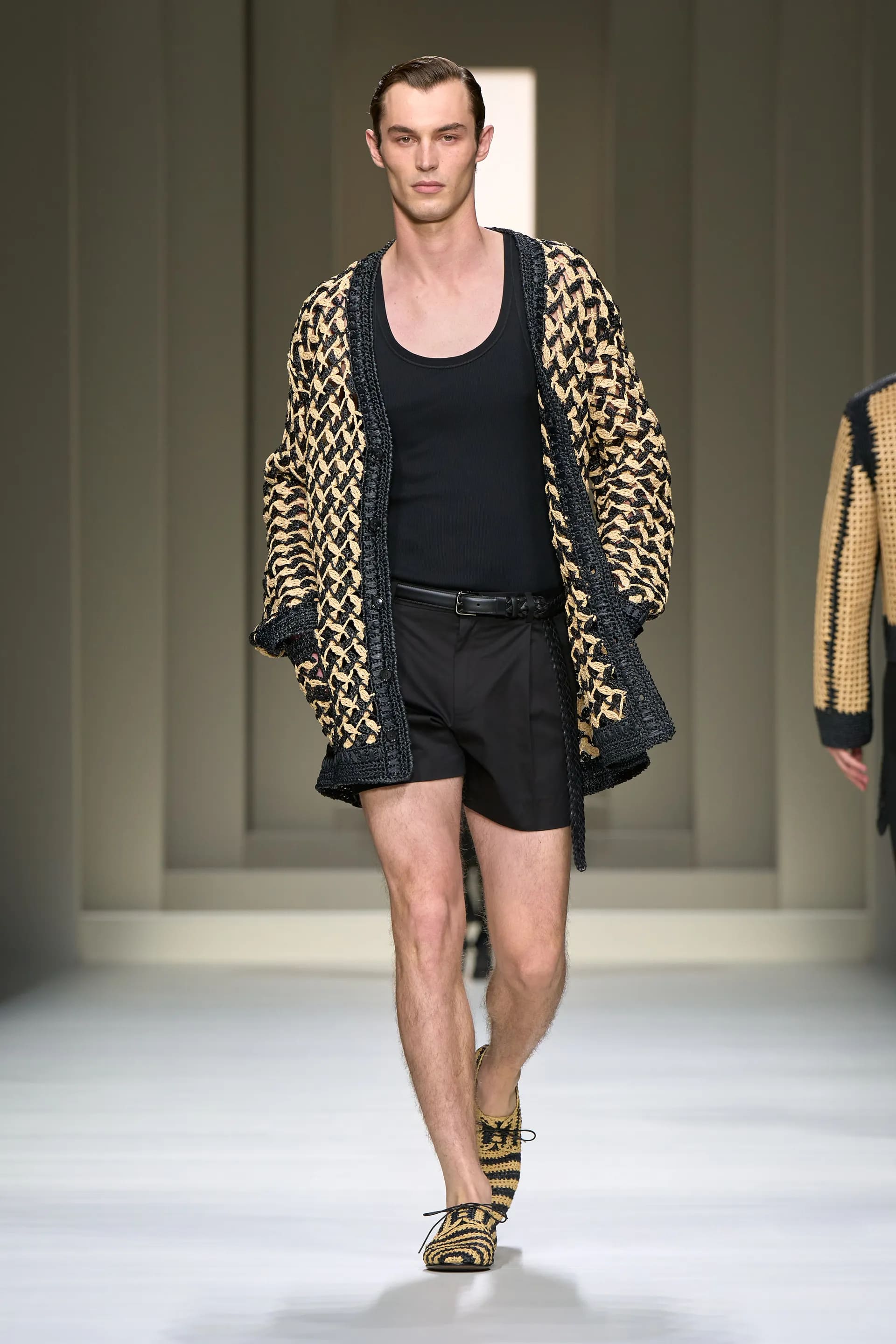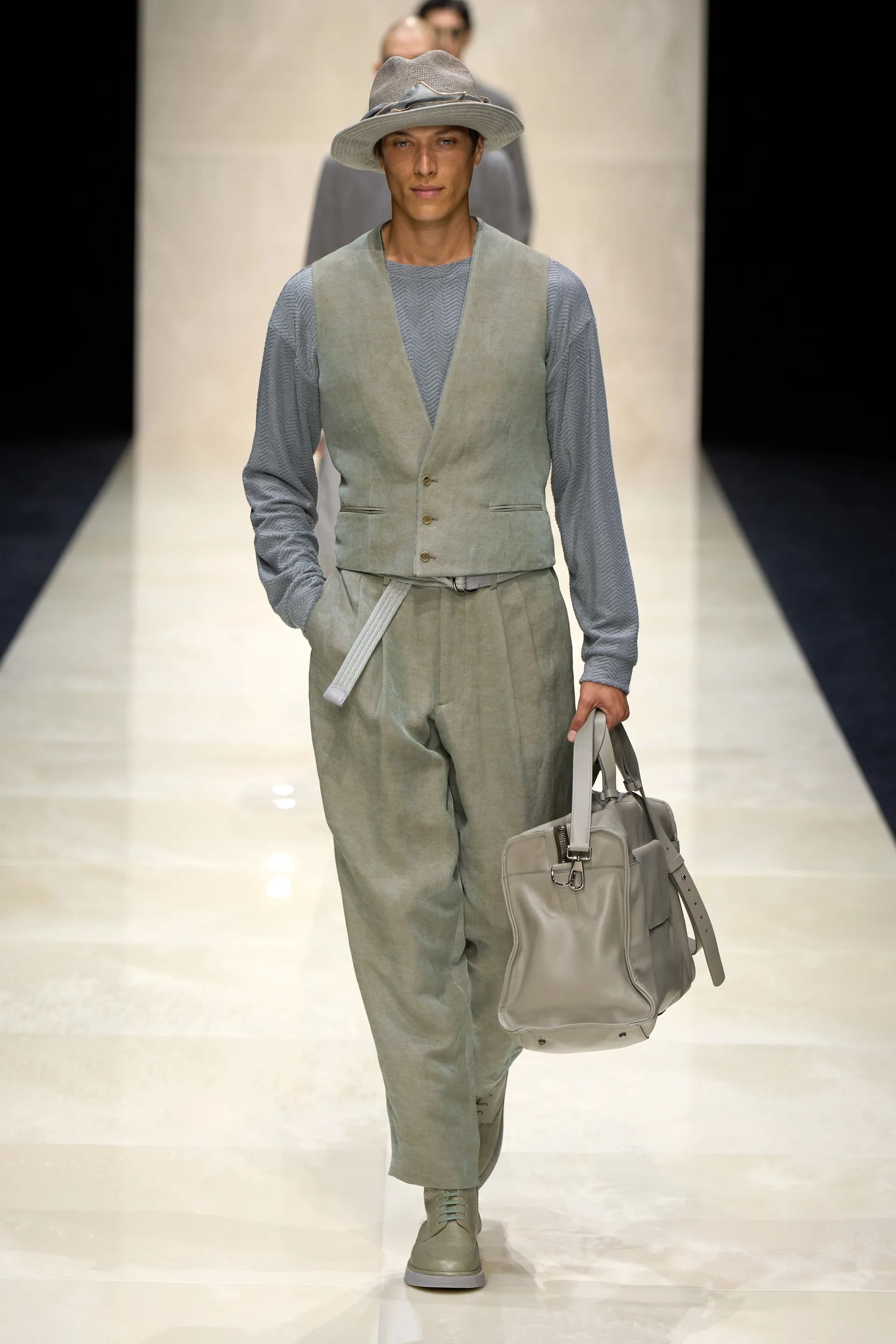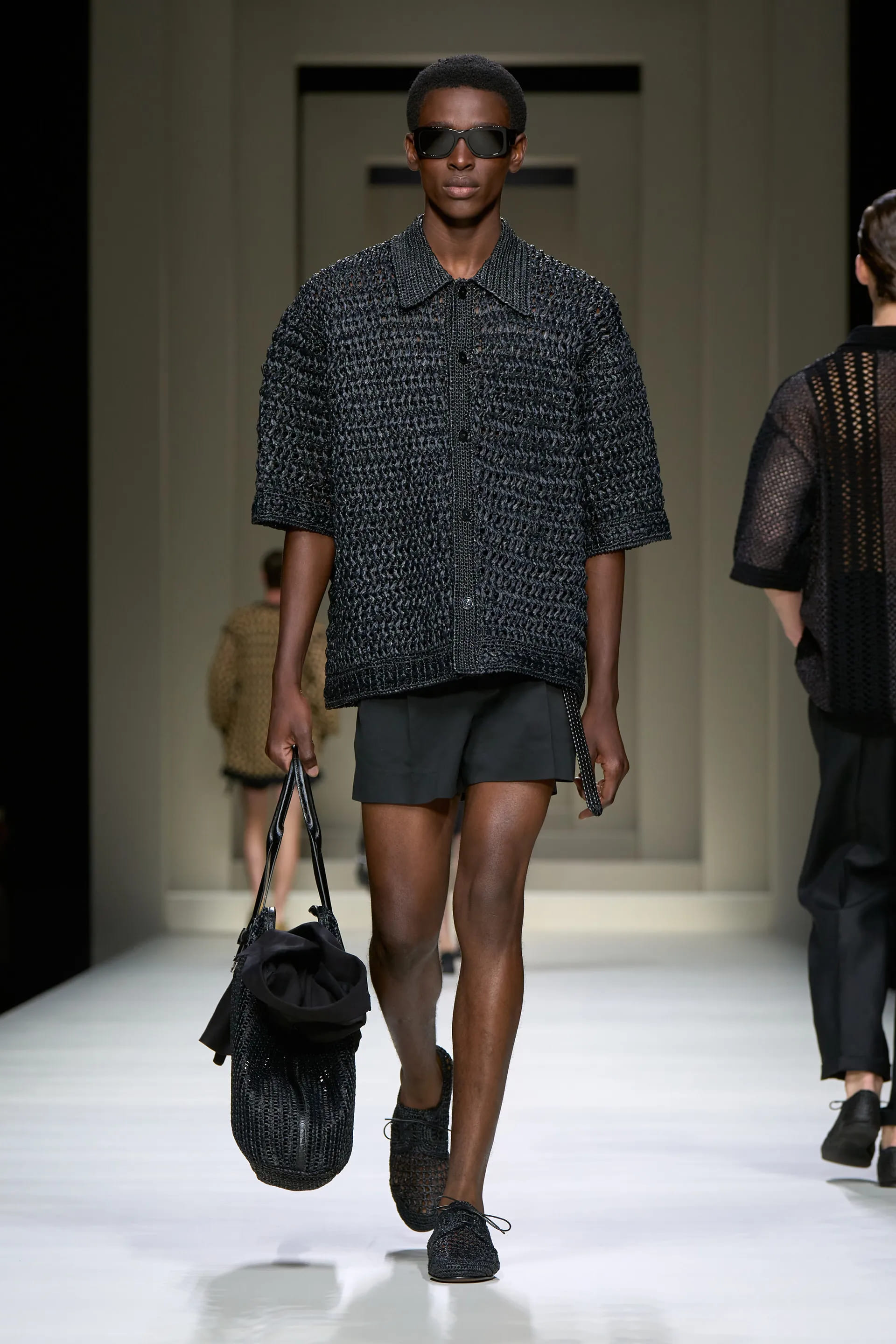 Втомившись від міської рутини та швидкоплинності життя, Giorgio Armani шукали втіху в позачасових силуетах та текстурах. Колекція сезону весна-літо 2025 стала втіленням високої майстерності модного дому, де тейлоринг та деконструкція можуть вдало поєднуватися. Так, на подіумі Giorgio Armani з’явилися шовкові бомбери з накладними кишенями, лляні костюми без лацканів та комірців, вільні сорочки та футболки зі знаковими геометричними принтами.