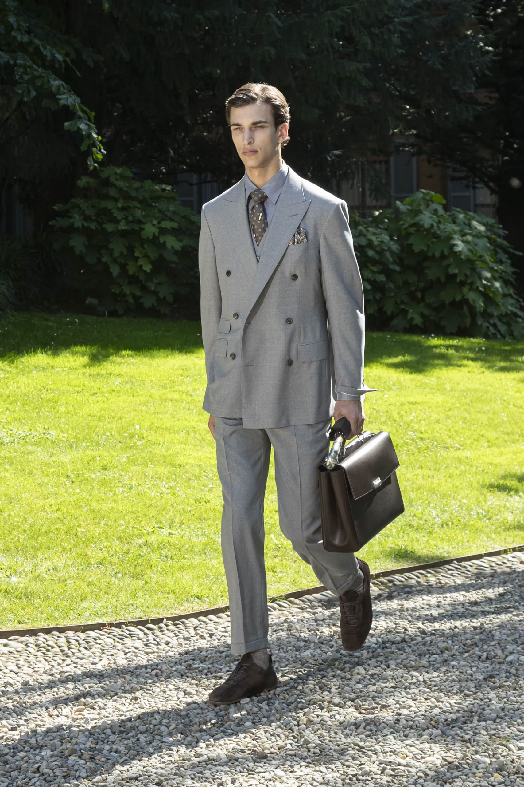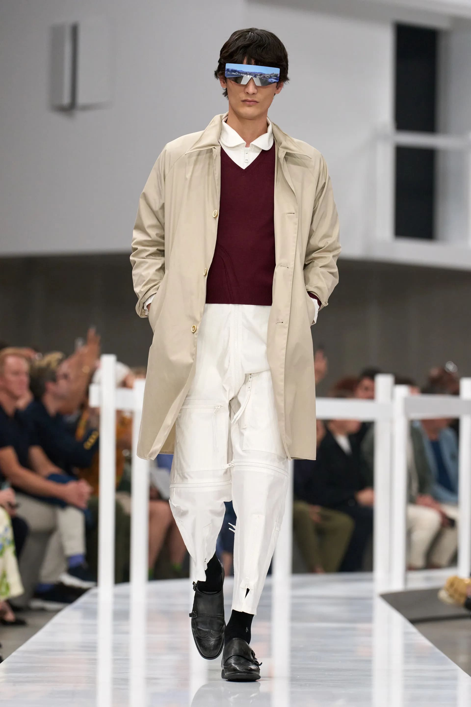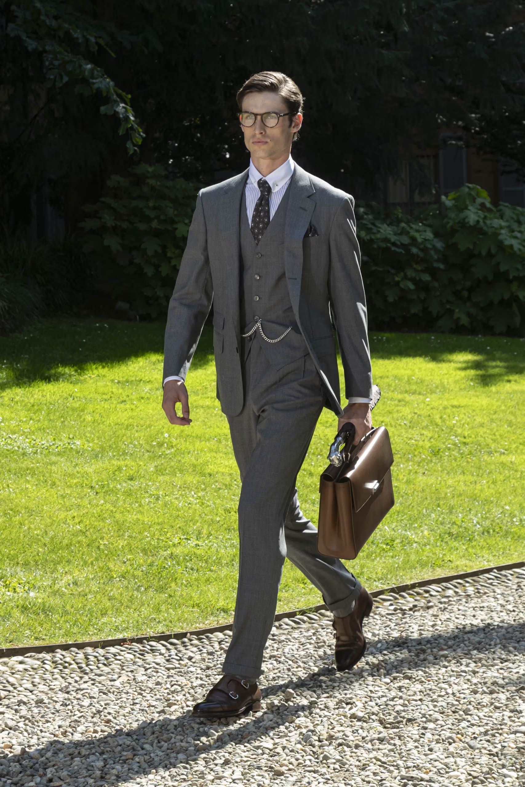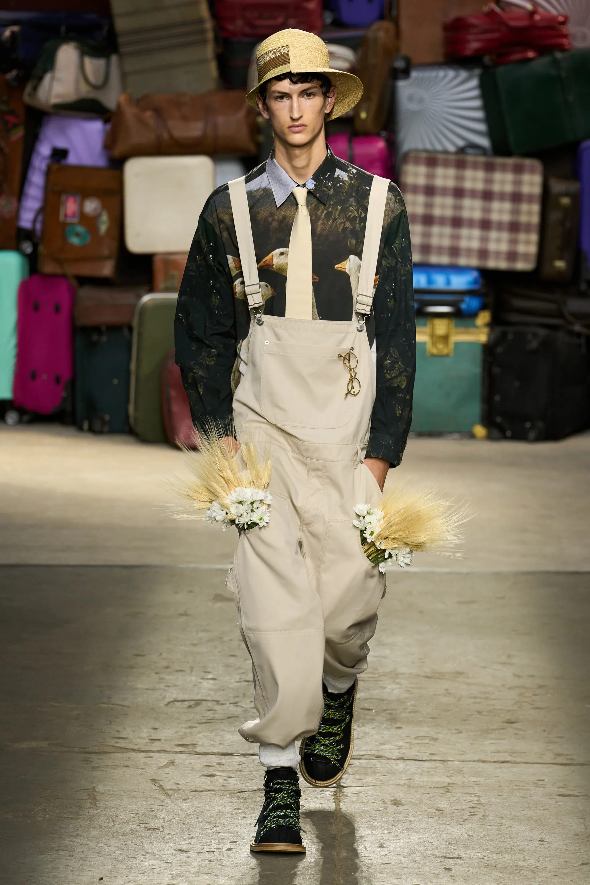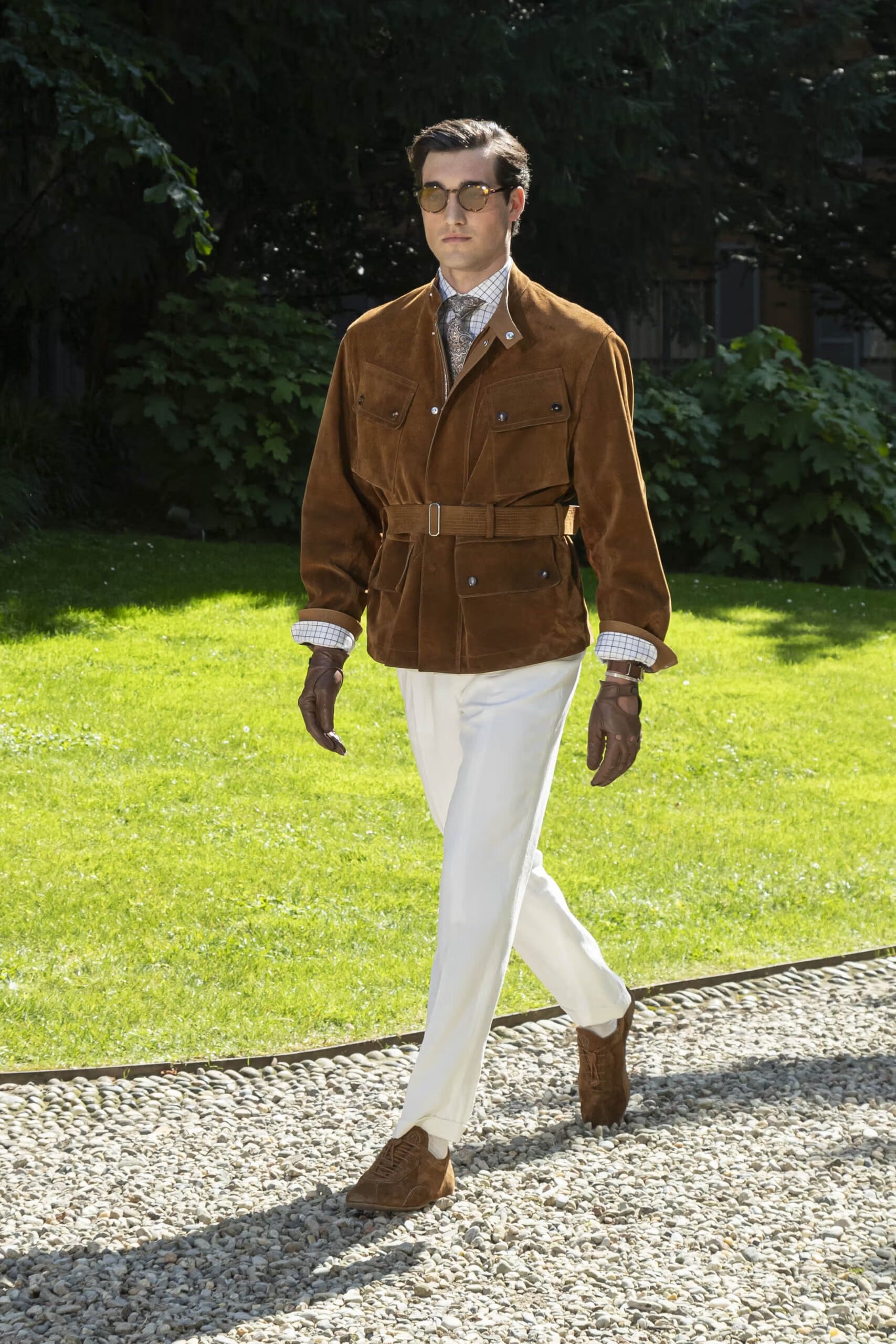 У відкритих садах у самому центрі Мілана під звуки скрипки пройшов показ британського бренду Dunhill. «Одяг для задоволення, для добре прожитого життя» — під таким лозунгом пройшов показ сезону весна-літо 2025. Колекцію представили ідеально скроєні замшеві тренчі, шкіряні куртки, костюми-трійки та легкі гольфи. Серед аксесуарів — автомобільні рукавиці, парасольки та взуття, в якому варто крокувати в елітний заміський клуб.