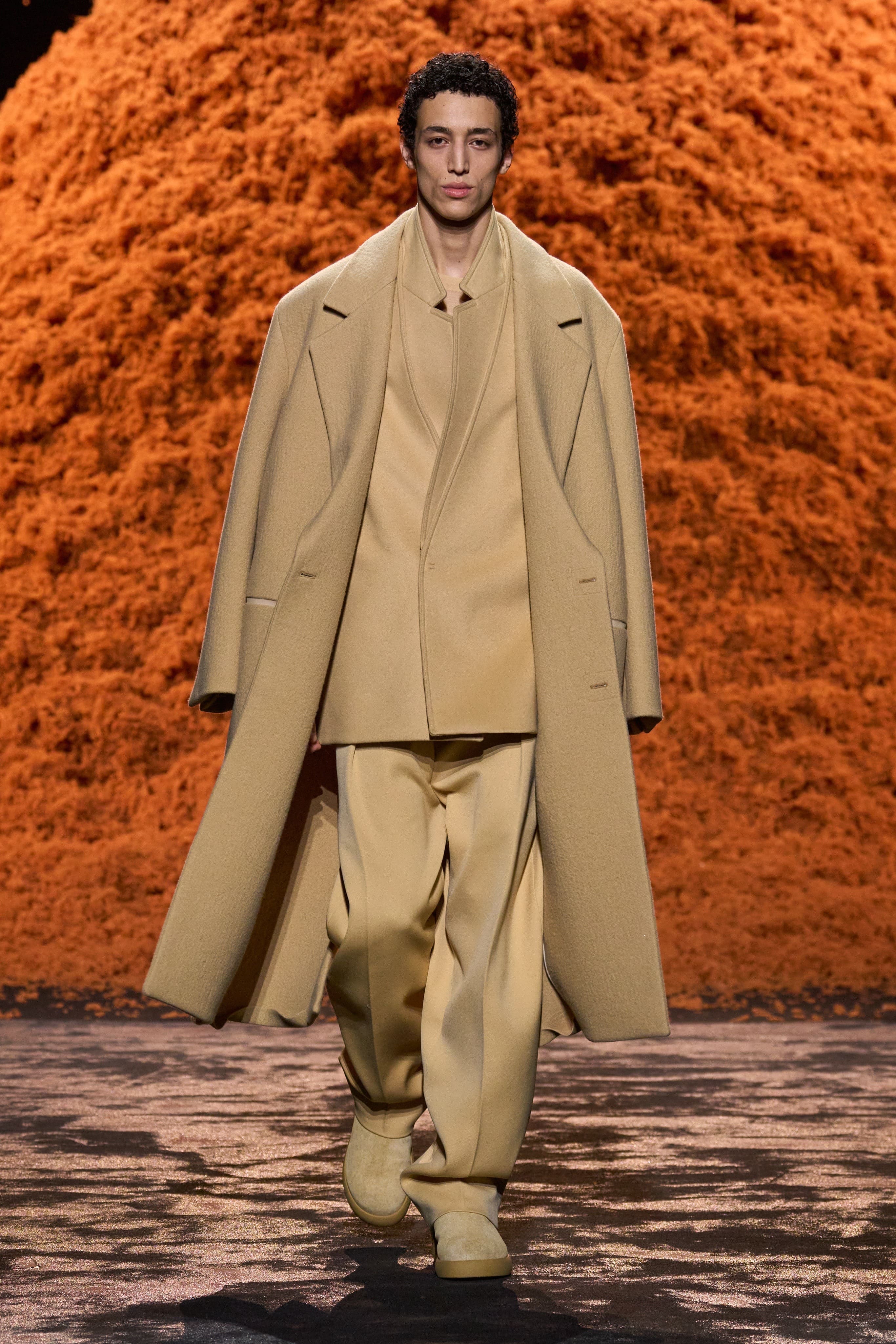 Кашемірові волокна кружляли подіумом, створюючи полум’яну пухнасту гору, на показі Zegna. Матеріал був пофарбована в класичний для італійського модного дому відтінок vicuna, а перформанс мав нагадувати sala delle mischie – виробничу кімнату в в штаб-квартирі дому. Цей показ мав на меті висвітлити досягнення виробництва тканин, де, за словами креативного директора Алессандро Сарторі, він може невтомно досліджувати нові технології, розробляти нові форми, перспективні рішення для одягу, що відповідають вимогам сьогодення.