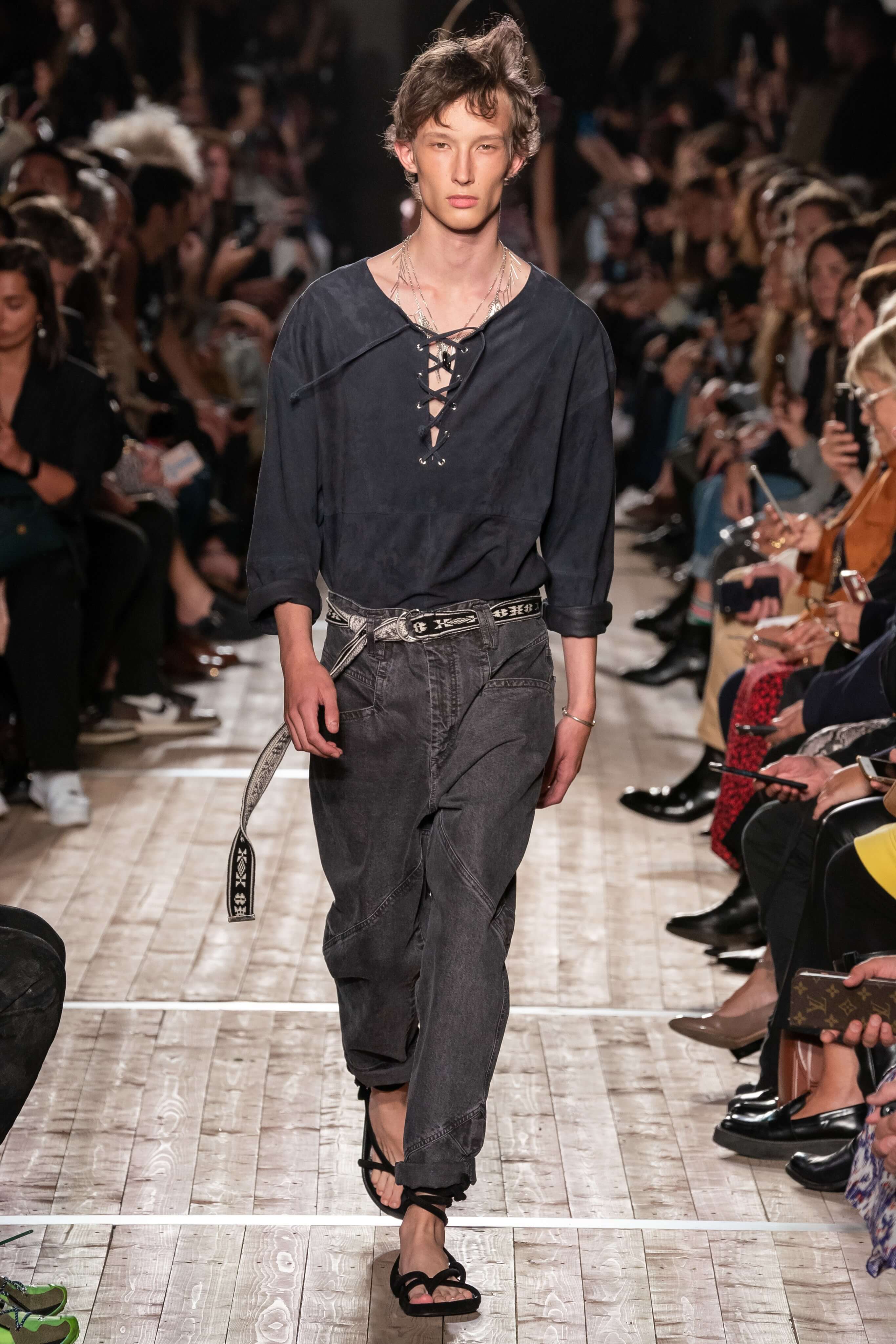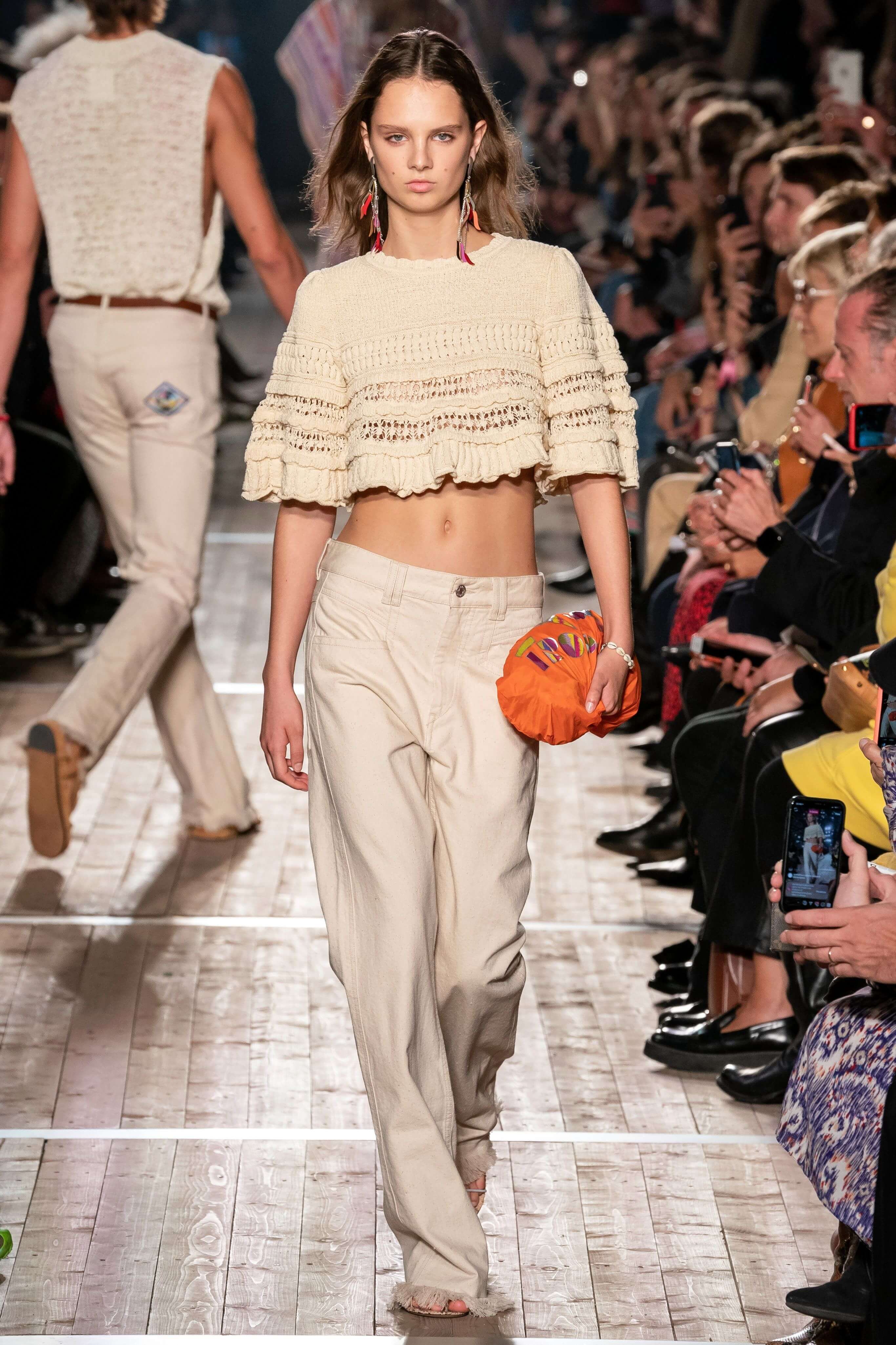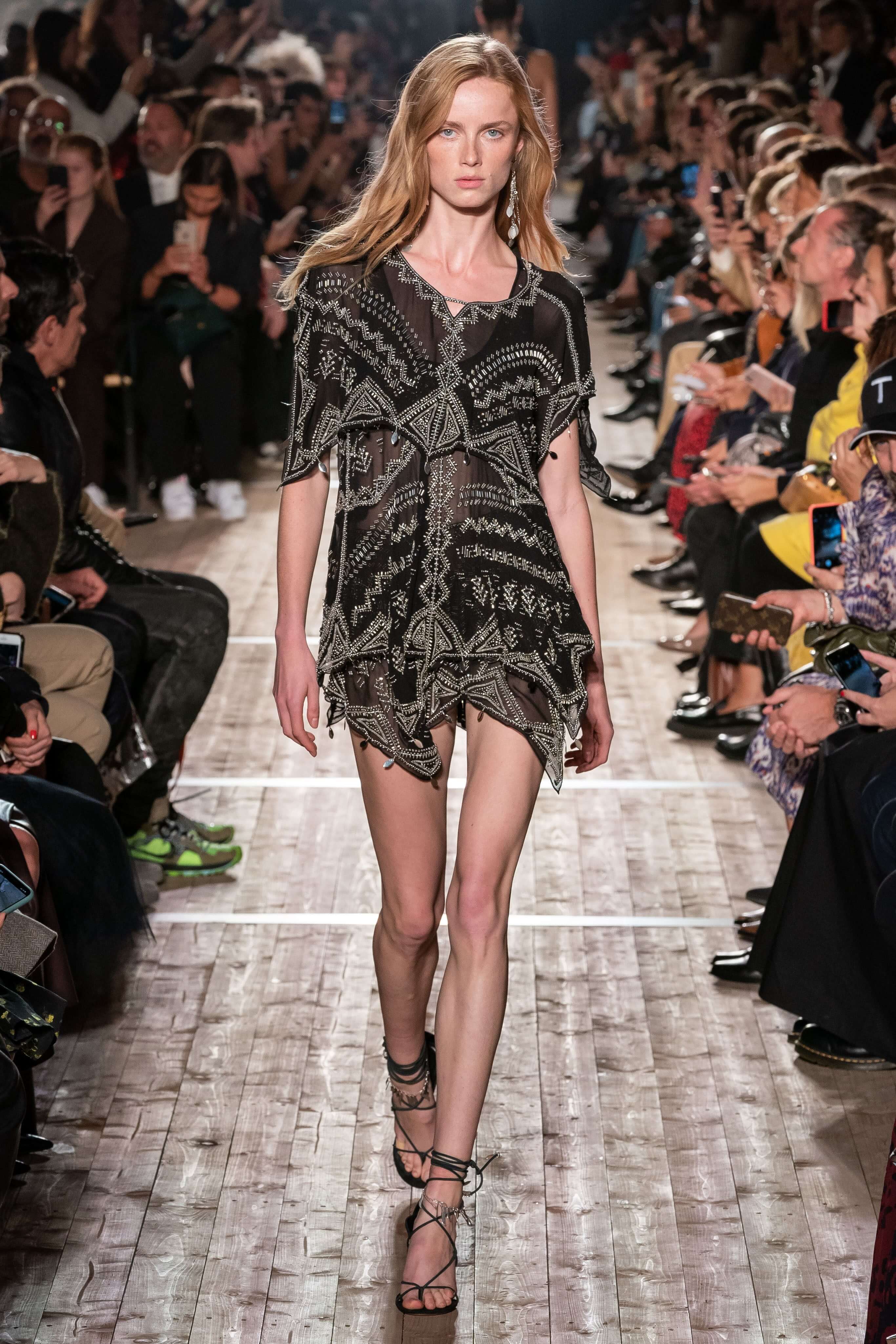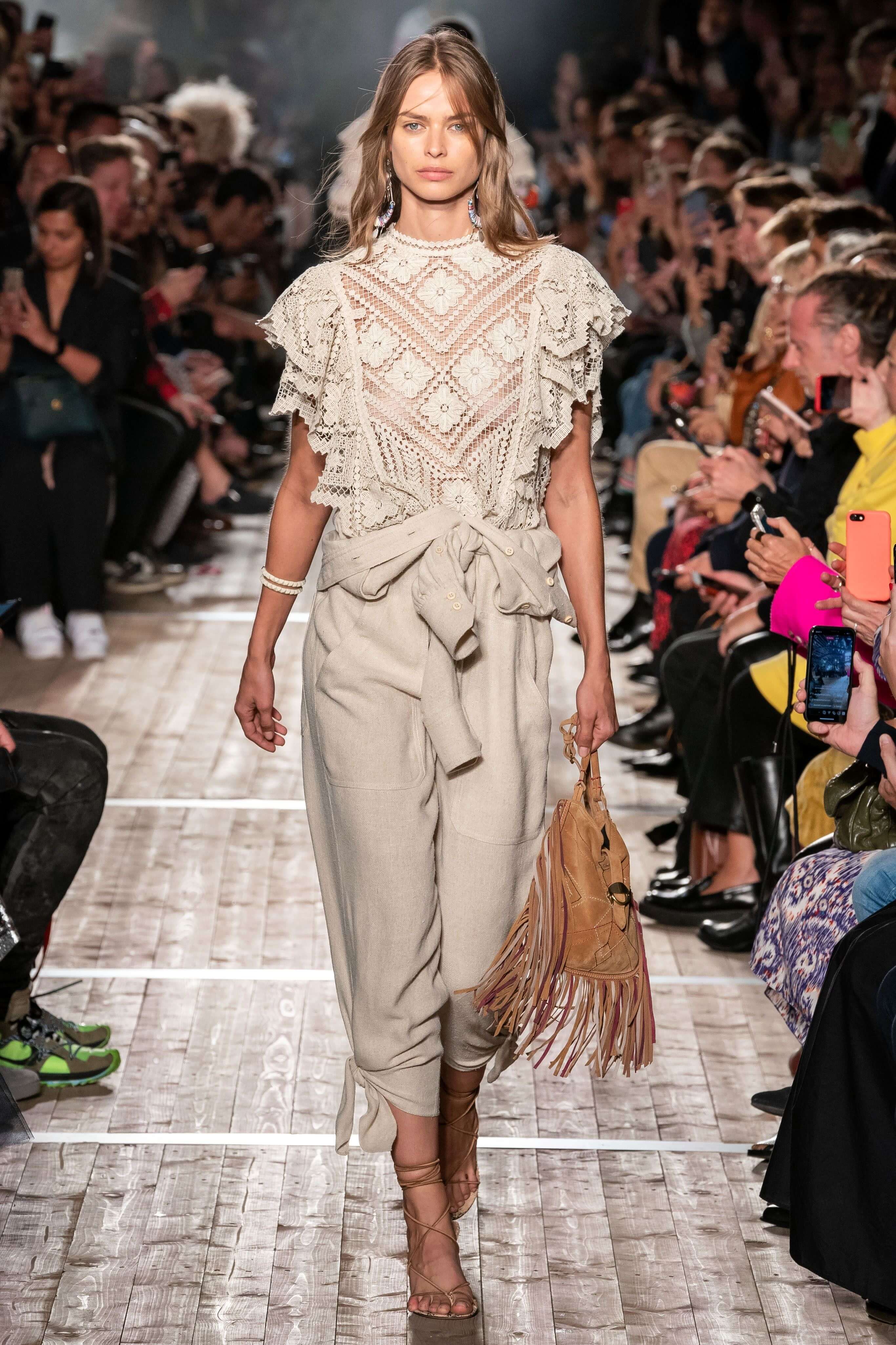 Показ новой коллекции Изабель Маран заставил всех мысленно перенестись на тропические острова или в самую гущу музыкального фестиваля Coachella. Микрошорты с резными фестонами, топы, будто сшитые из двух платков, цыганские блузы и футболки с длинной бахромой, украшенной бусинами, — модели напоминали жителей хиппи-коммуны, но только очень особенной — гламурной и высокой. Костюмы из укороченных плечистых топов-блуз и мини в этнических принтах выглядели скорее элегантно, чем неформально, а в белых платьях и комбинезонах из вареного денима хочется проходить всё будущее лето. Линия аксессуаров выражена в серьгах-кистях, длиной доходящих до талии, многоярусных браслетах из бисера и подвесок с разноцветными полудрагоценными камнями. Мужская часть коллекции — расслабленные брючные костюмы и рубашки в цветах, которые дизайнер предлагает заправлять в голубые джинсы.