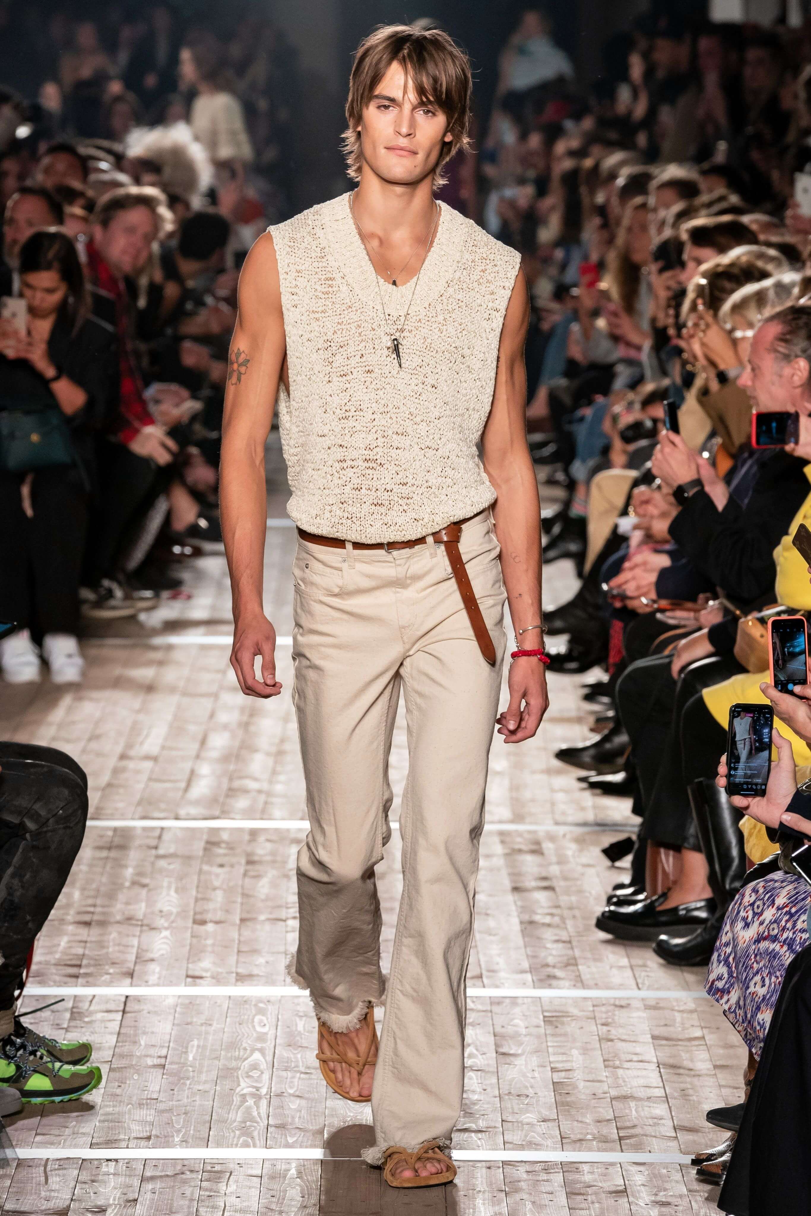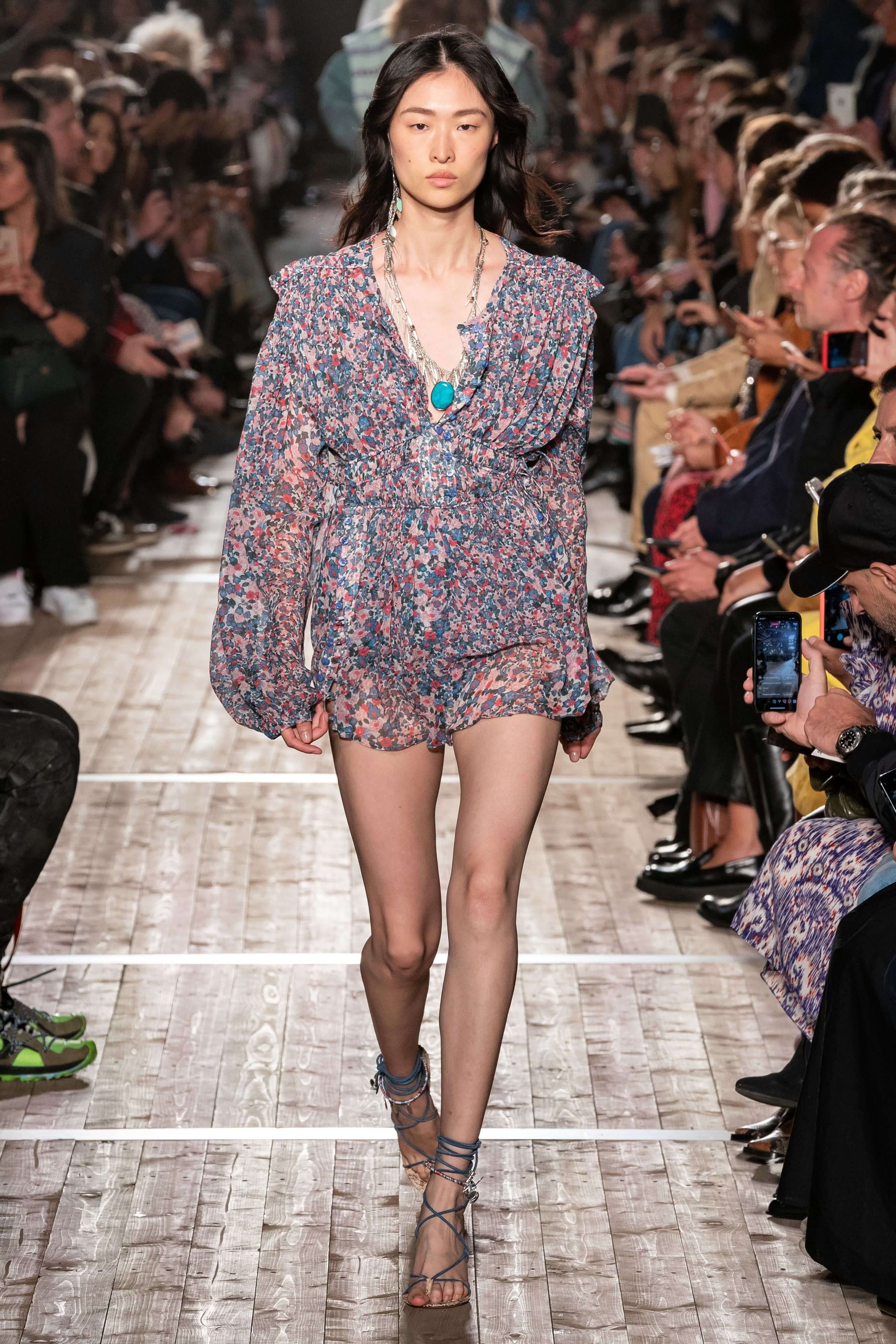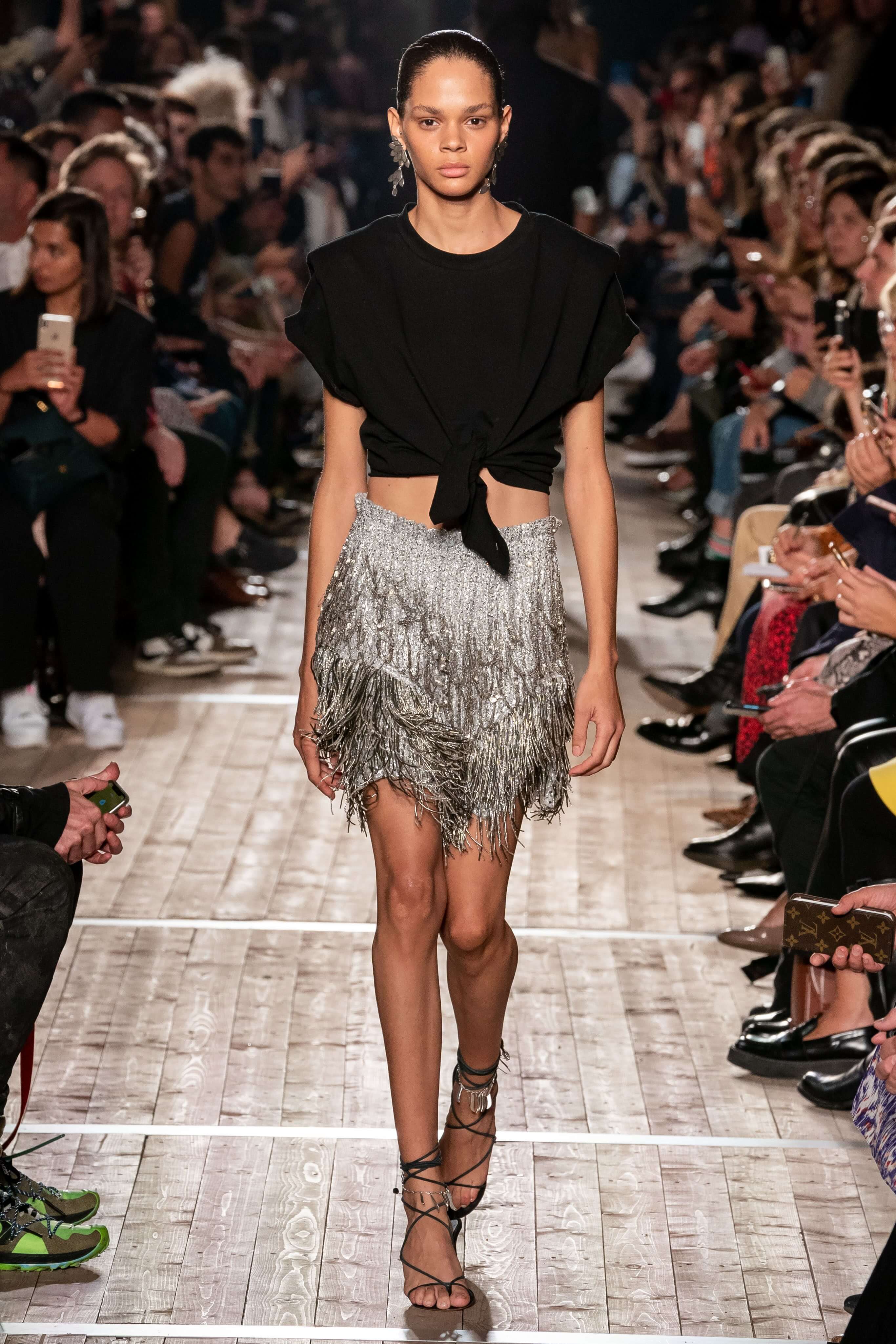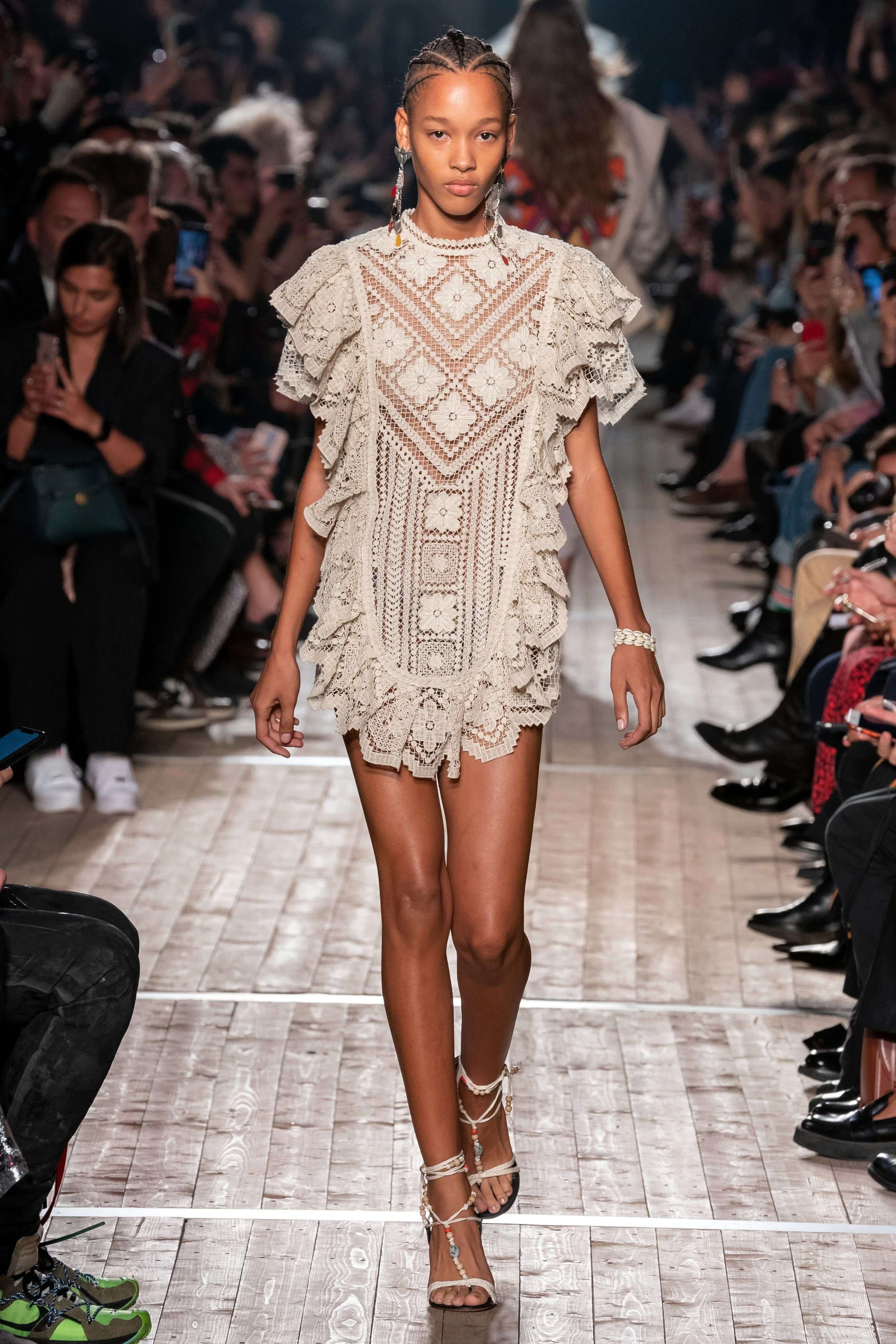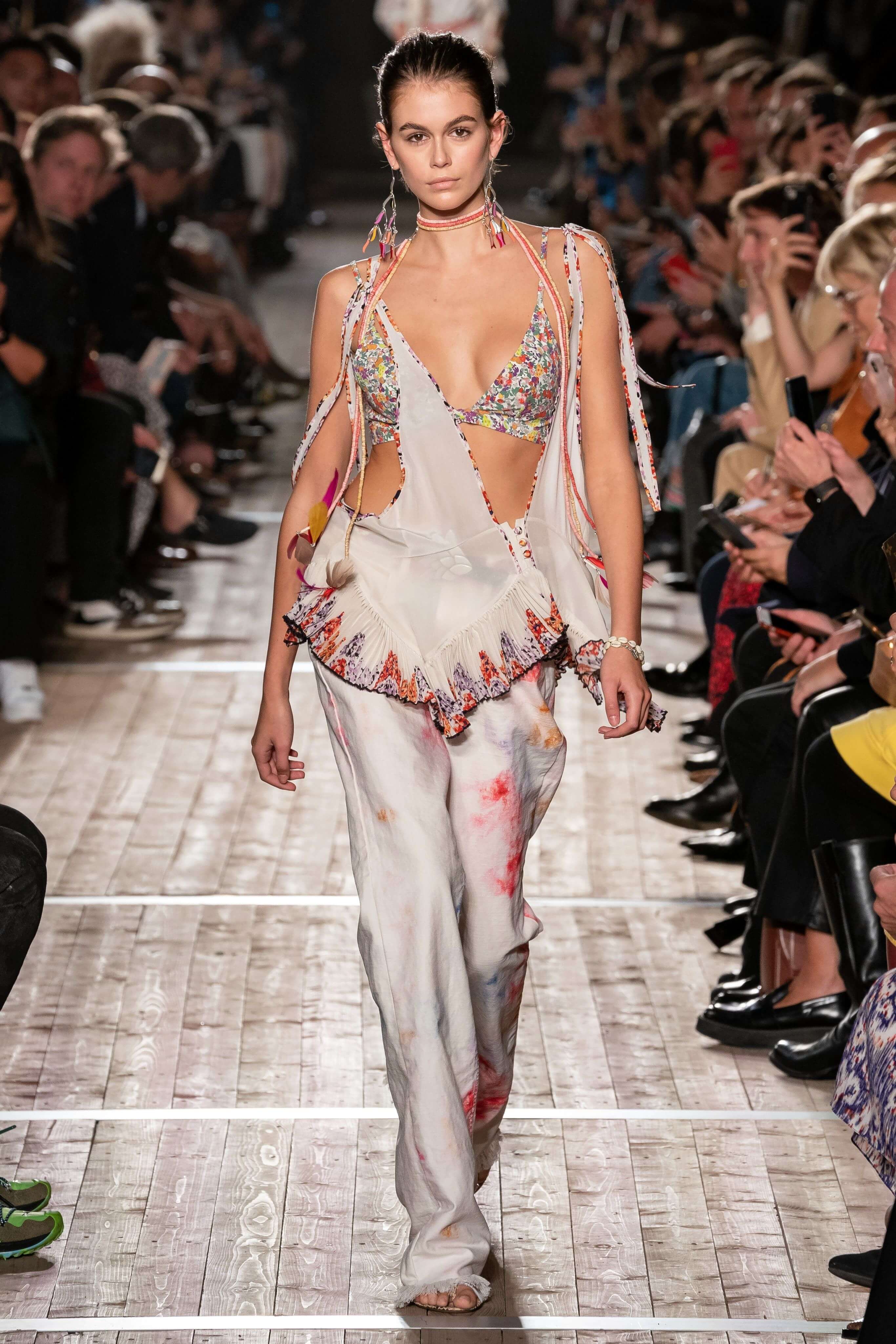 Показ новой коллекции Изабель Маран заставил всех мысленно перенестись на тропические острова или в самую гущу музыкального фестиваля Coachella. Микрошорты с резными фестонами, топы, будто сшитые из двух платков, цыганские блузы и футболки с длинной бахромой, украшенной бусинами, — модели напоминали жителей хиппи-коммуны, но только очень особенной — гламурной и высокой. Костюмы из укороченных плечистых топов-блуз и мини в этнических принтах выглядели скорее элегантно, чем неформально, а в белых платьях и комбинезонах из вареного денима хочется проходить всё будущее лето. Линия аксессуаров выражена в серьгах-кистях, длиной доходящих до талии, многоярусных браслетах из бисера и подвесок с разноцветными полудрагоценными камнями. Мужская часть коллекции — расслабленные брючные костюмы и рубашки в цветах, которые дизайнер предлагает заправлять в голубые джинсы.