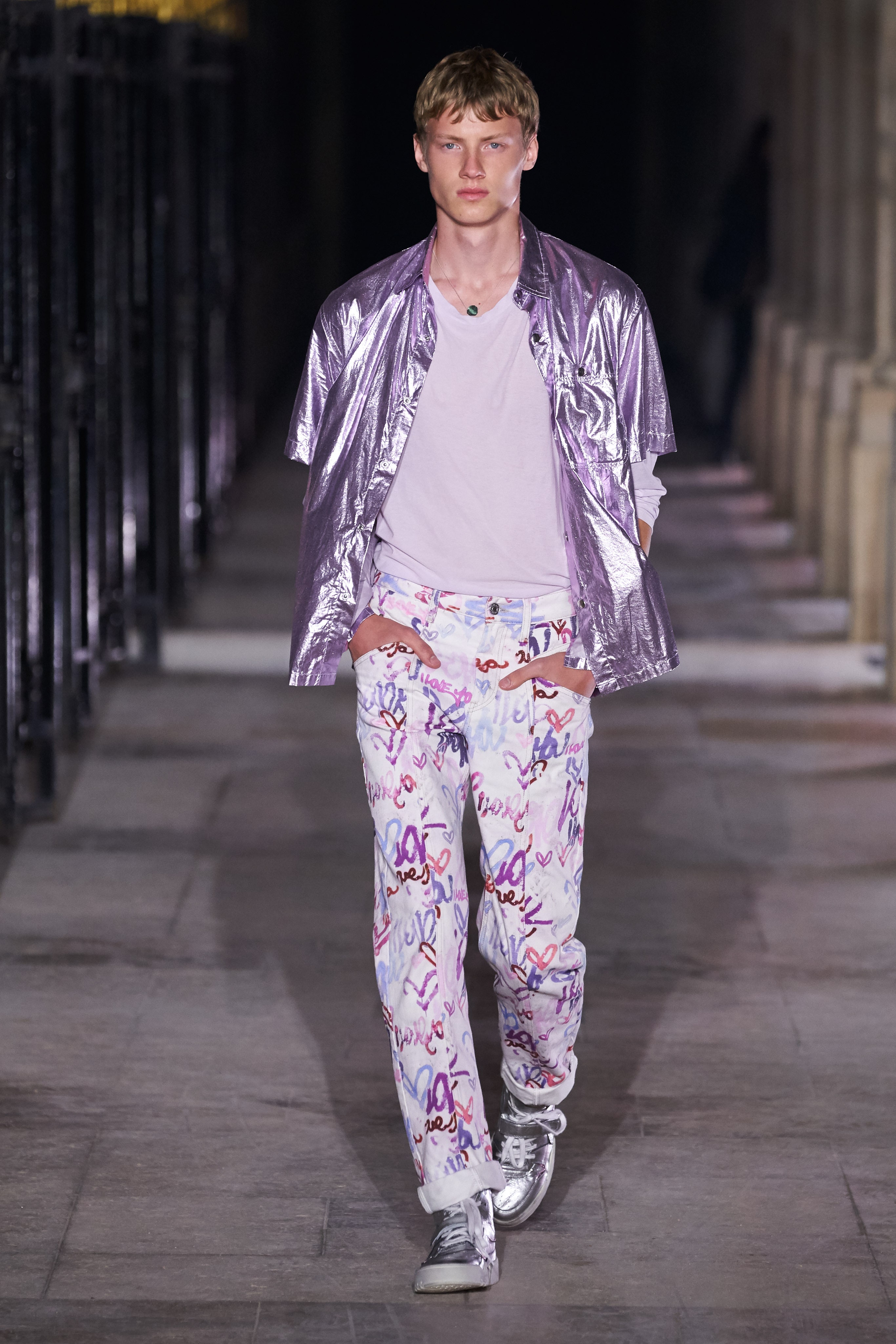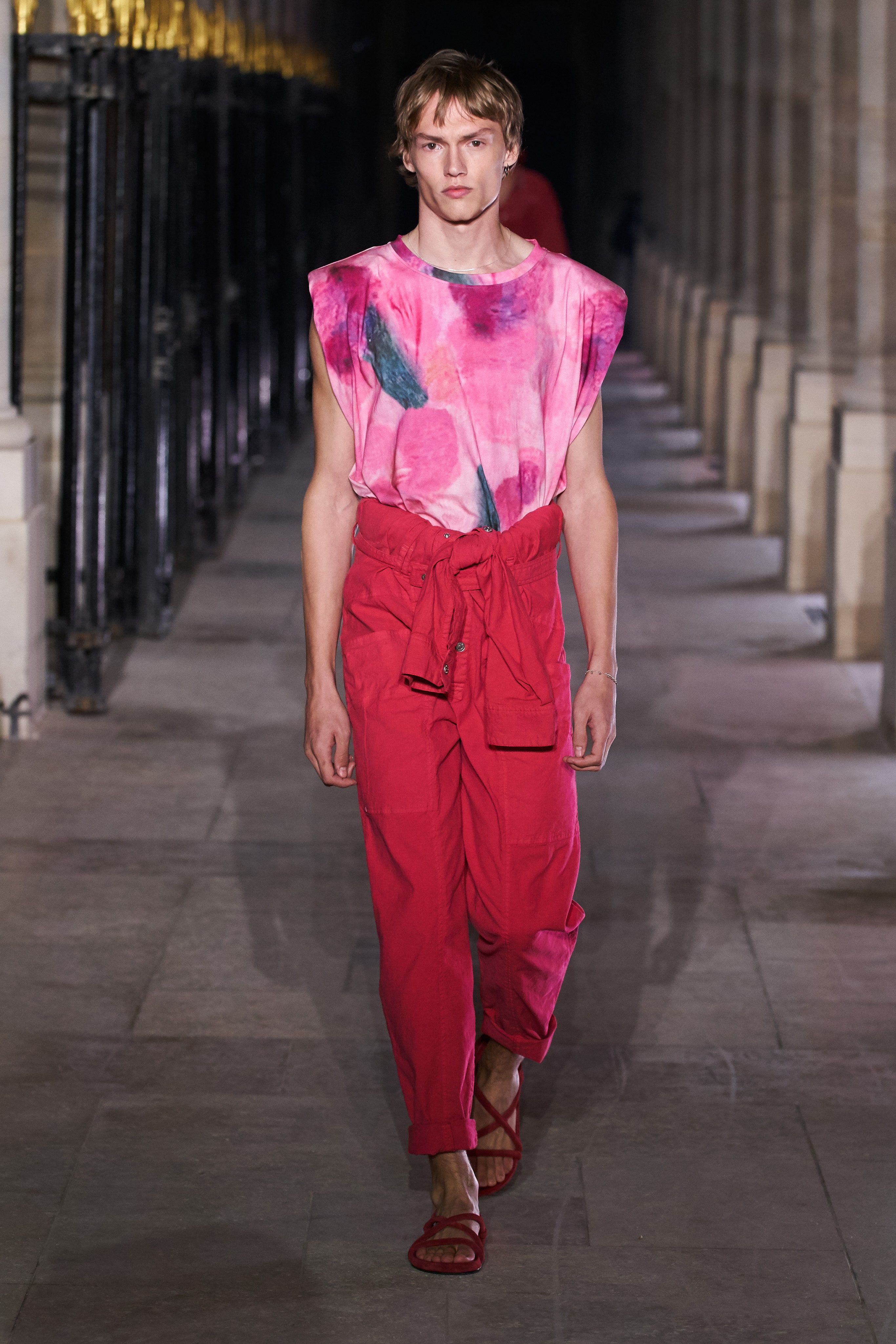На девушках были кокетливые мини с насыщенным цветочным принтом и рукавами-фонариками, эффектные комбинезоны, спортивные брюки в духе R&B и кроп-топы с викторианскими буфами. Мужская линия включала в себя алые сорочки, едва балансирующие на грани джипси-шика, глянцевые разноцветные рубашки, свободные брюки и скульптурные футболки с заостренными плечами. Расслабленные 80-е разбавили объемные белоснежные костюмы, корсетные платья из денима, кожаные комбинезоны и купальники из люрекса.
