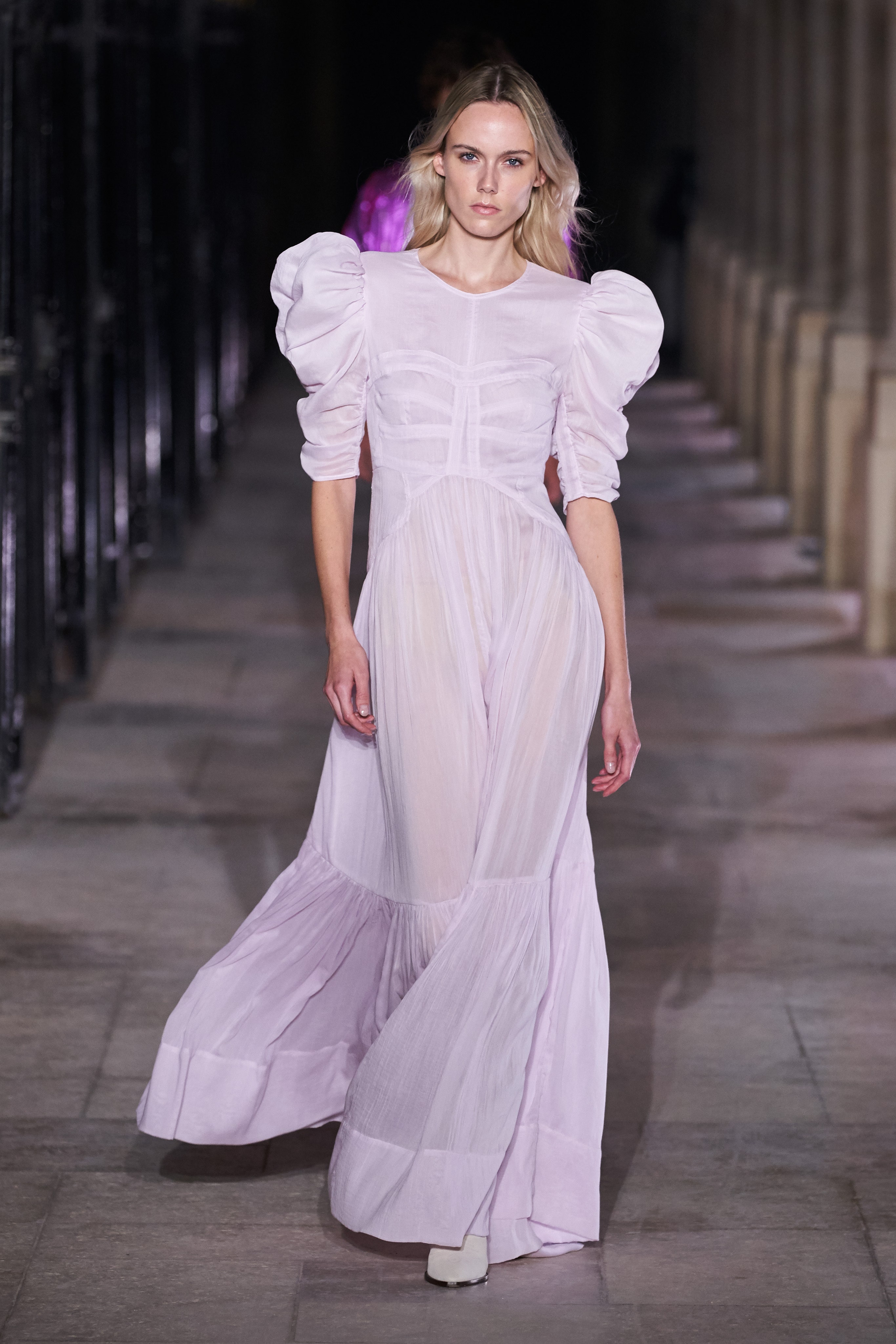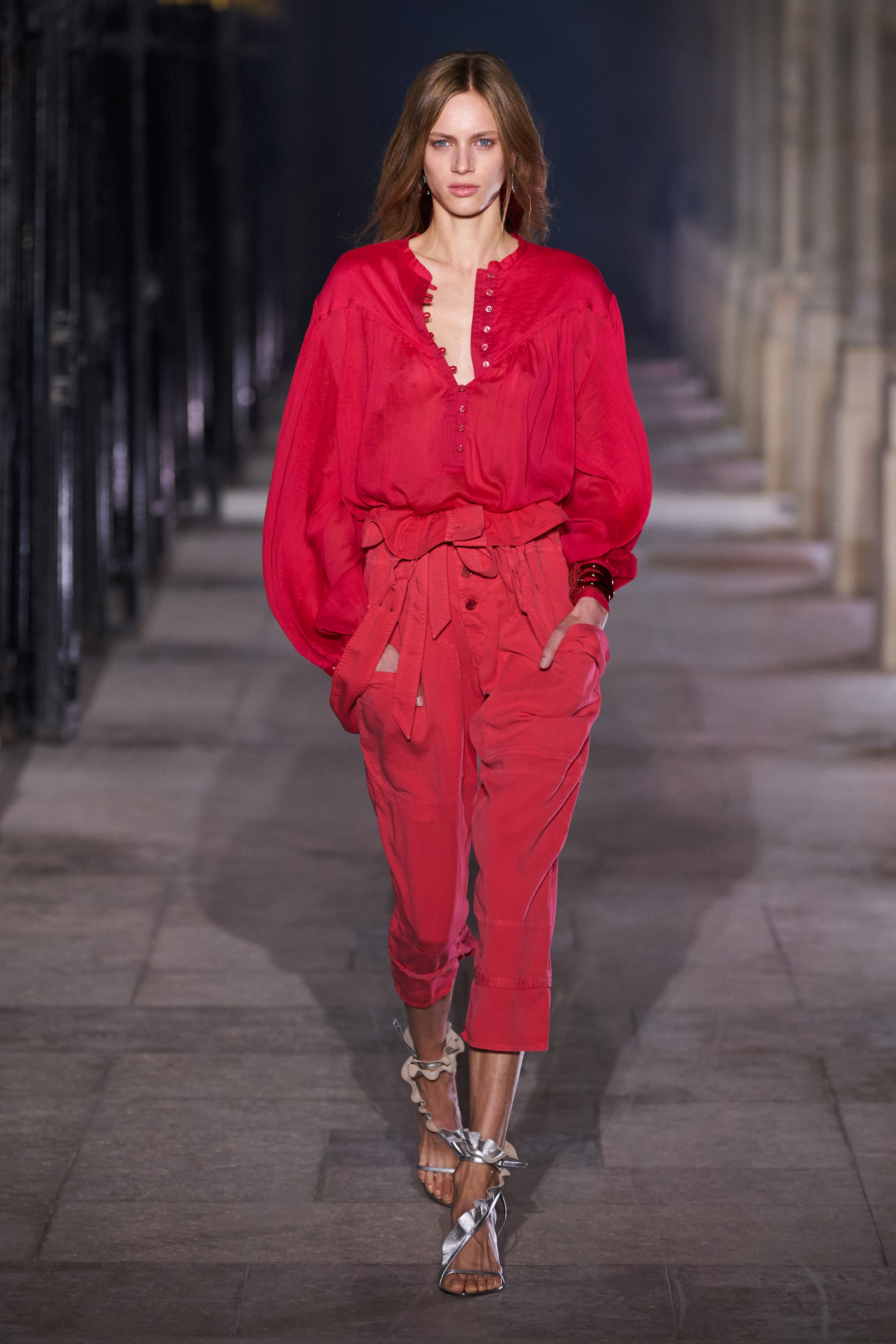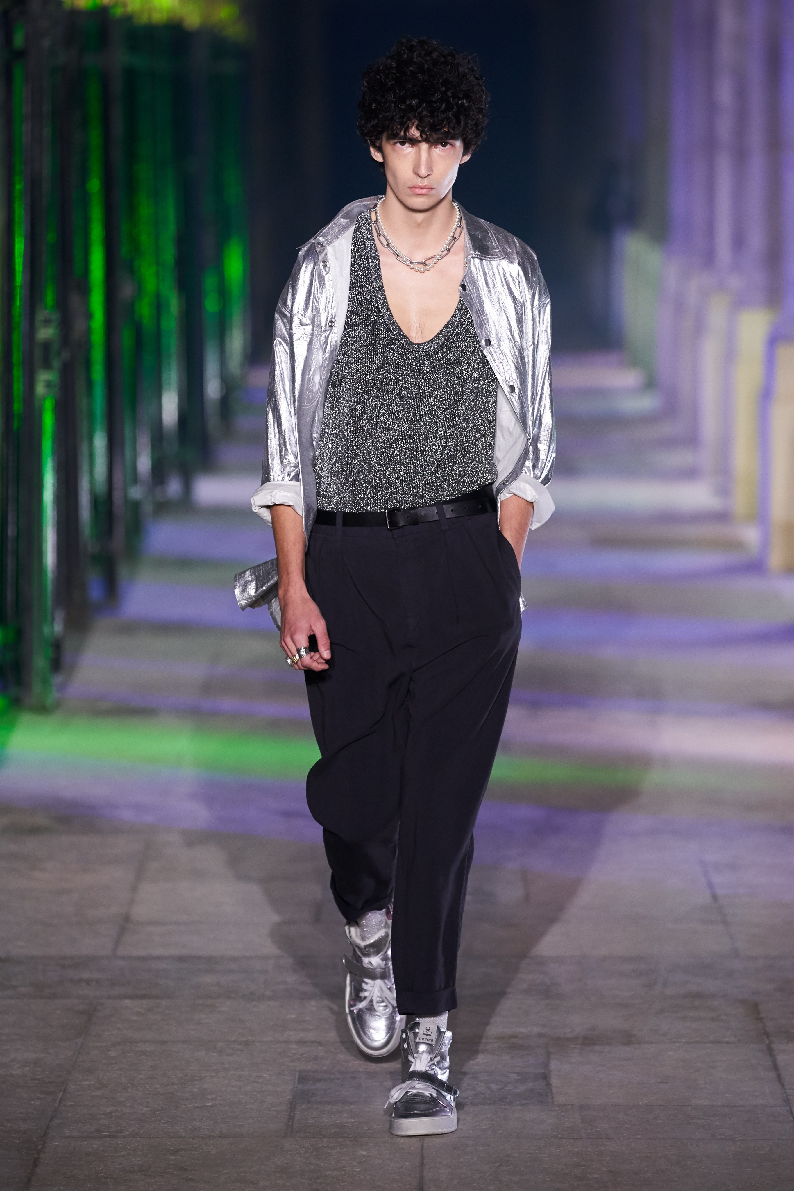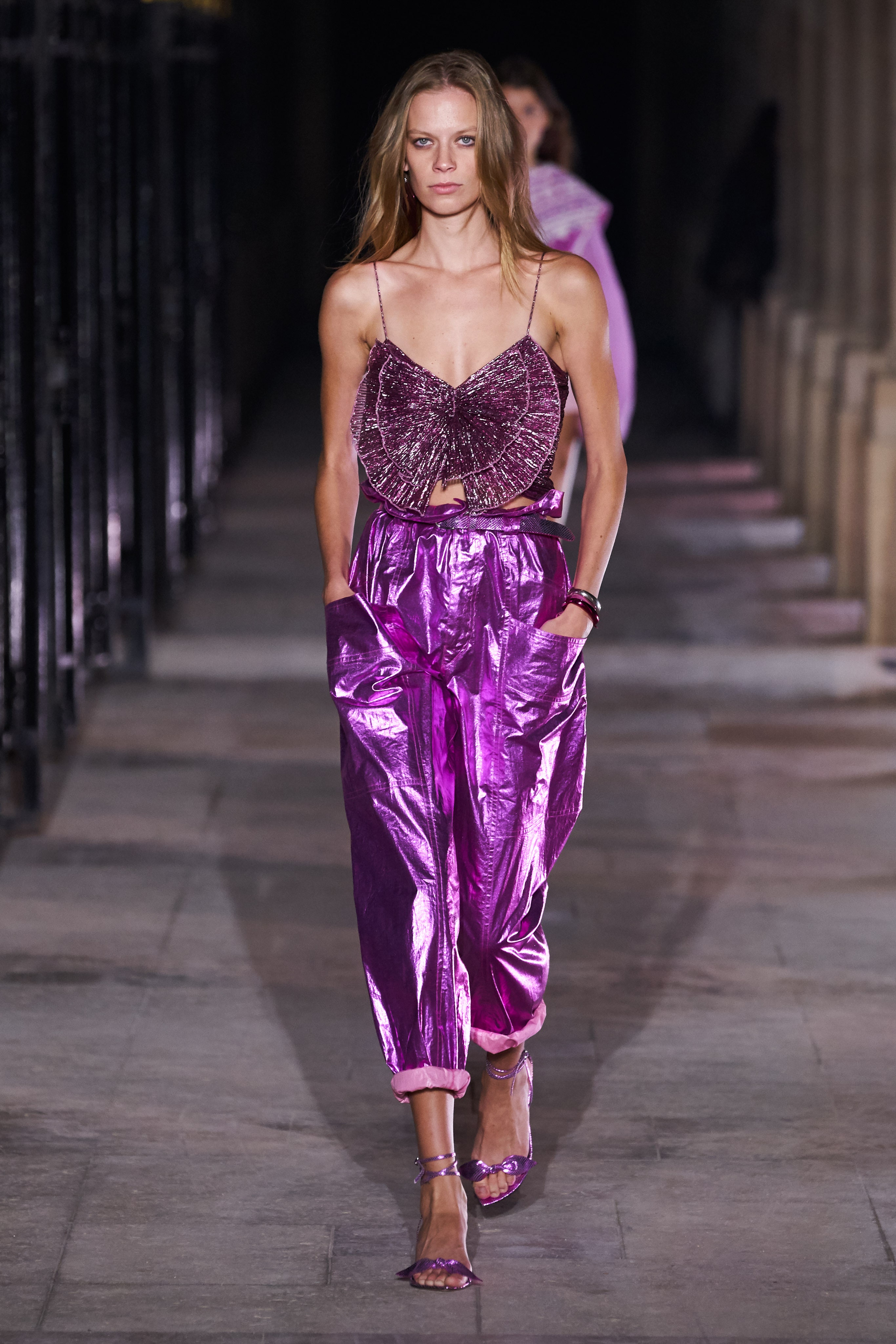 Еще неделю назад Изабель Маран совсем не хотела проводить показ. Однако прошедшей ночью у неё получилась настоящая клубная вечеринка, какой она могла бы быть после долгих месяцев самоизоляции. Саундтреком к показу стал техно-ремикс песни Донны Саммер I Feell Love, которая также звучала днем ранее в шоу Рика Оуэнса.