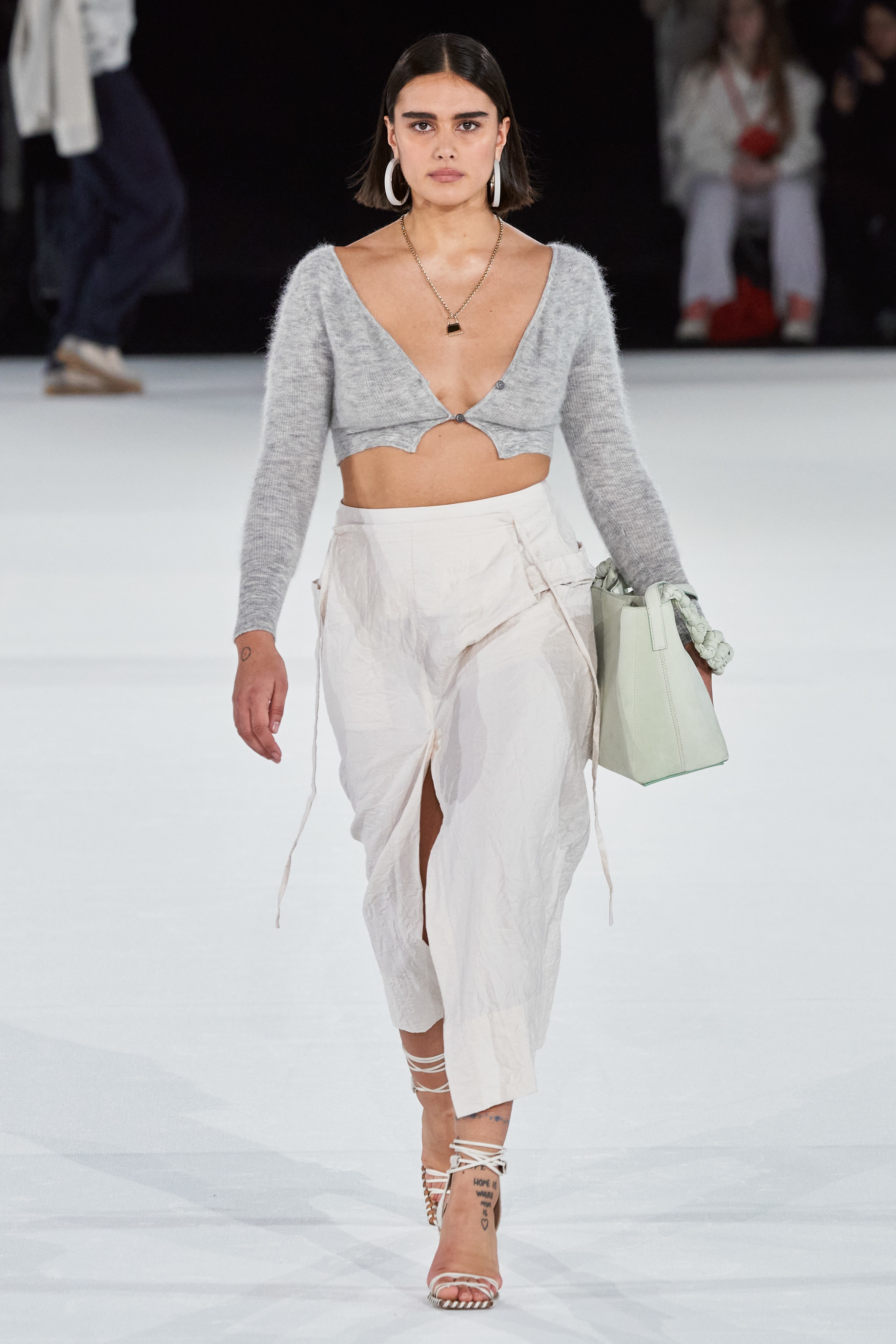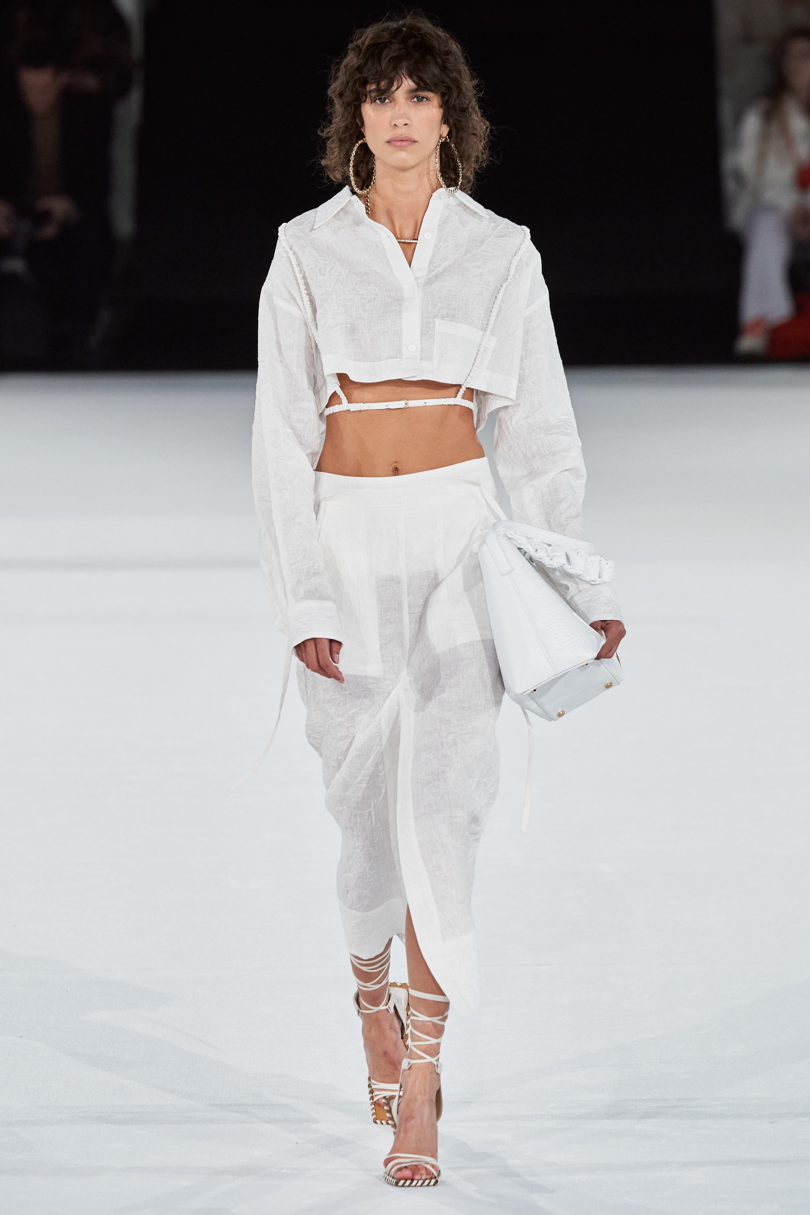 В женскую коллекцию вошли топы с открытыми плечами, перфорированные юбки, сложносочиненные платья разной длины, кроп-кардиганы на одной пуговице, льняные комбинезоны и брюки с завышенной талией. Образы дополняли высокие сапоги с открытой пяткой, сумки-шоперы с тремя ручками, туфли с квадратным носком, надетые поверх плотных гольфов, сумки-бананки, серьги-кольца, подвески и кольца в виде знаковой модели бренда — микросумки Le petit Chiquito.