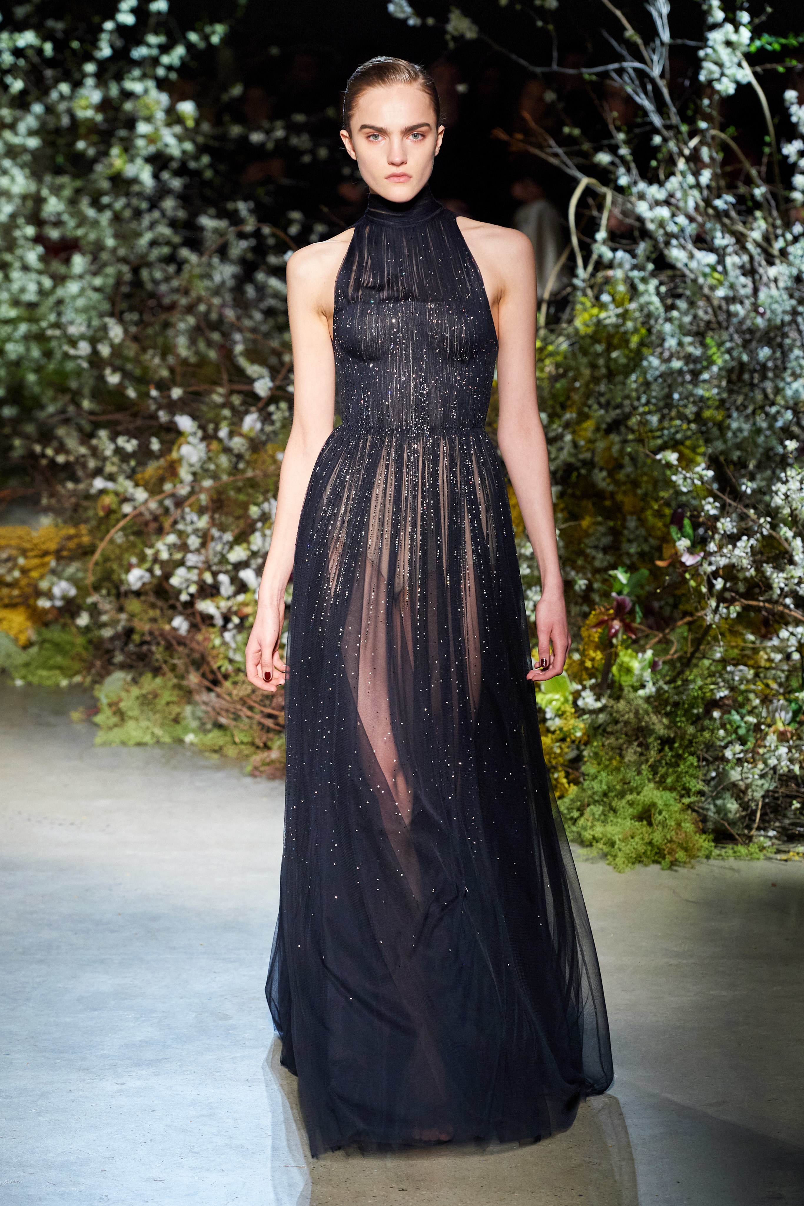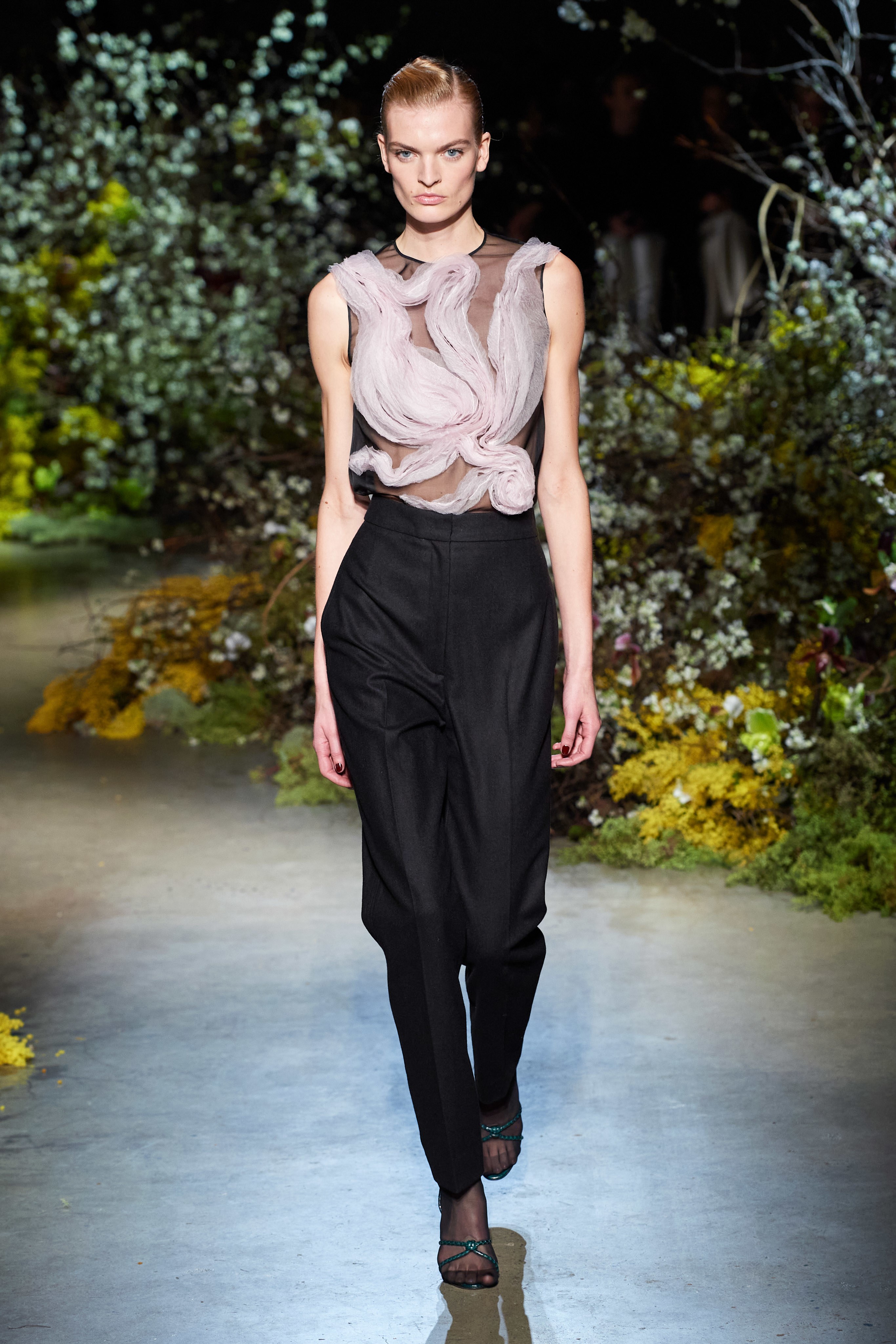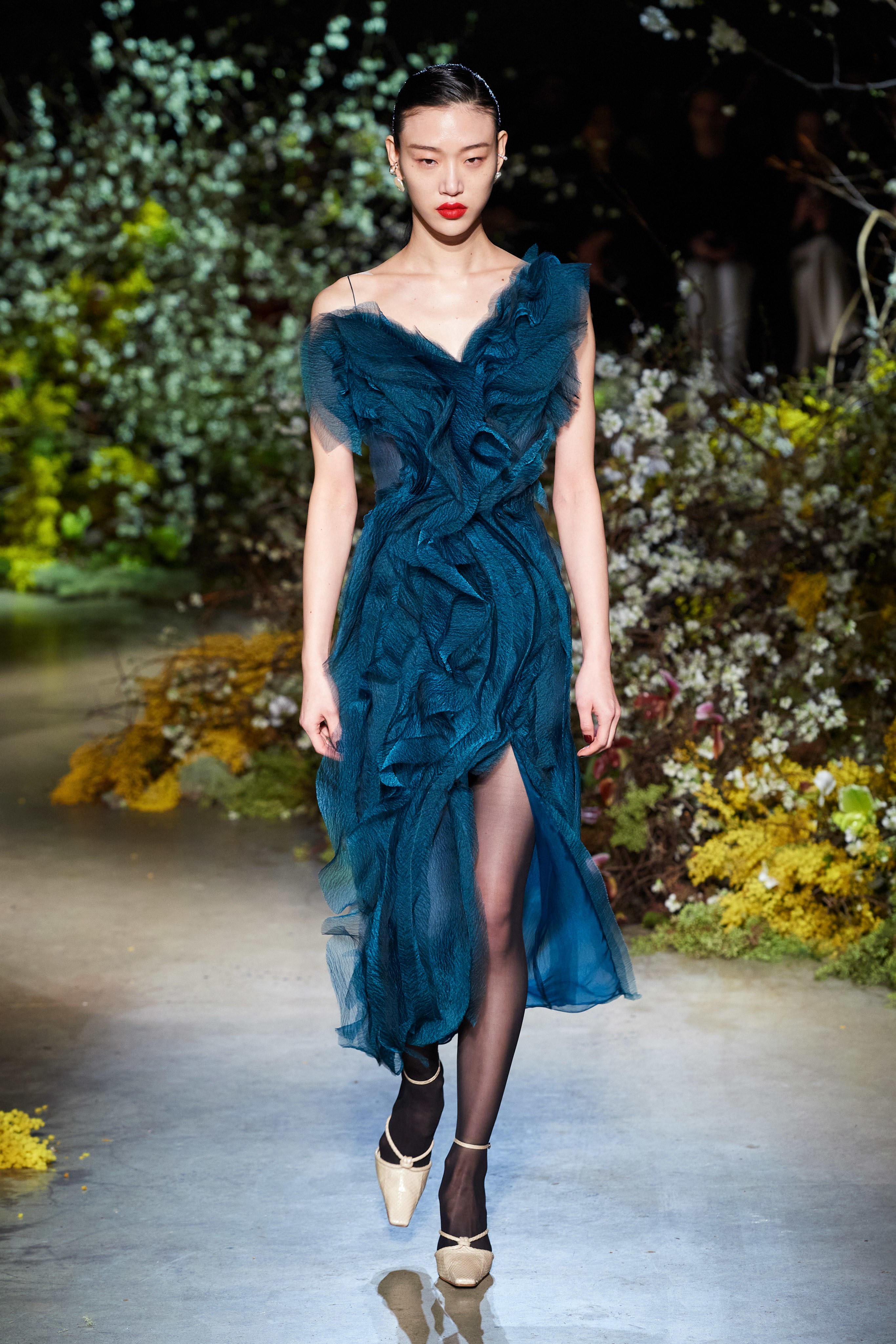 Ключевые элементы: объемные аппликации из органзы и тюля, кейп, блузы с горловиной и бантом на шее у спины, многослойные объёмные драпировки.