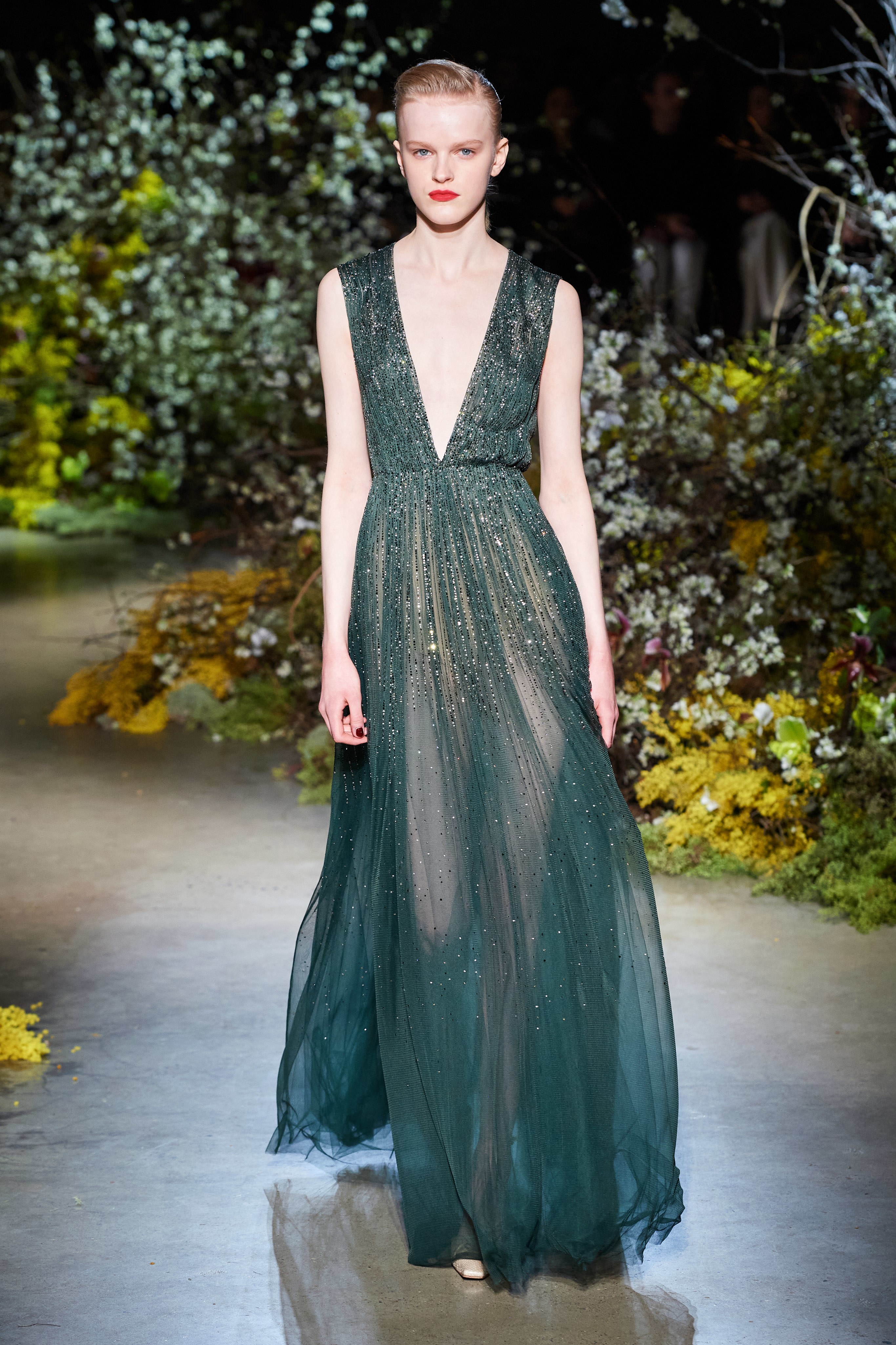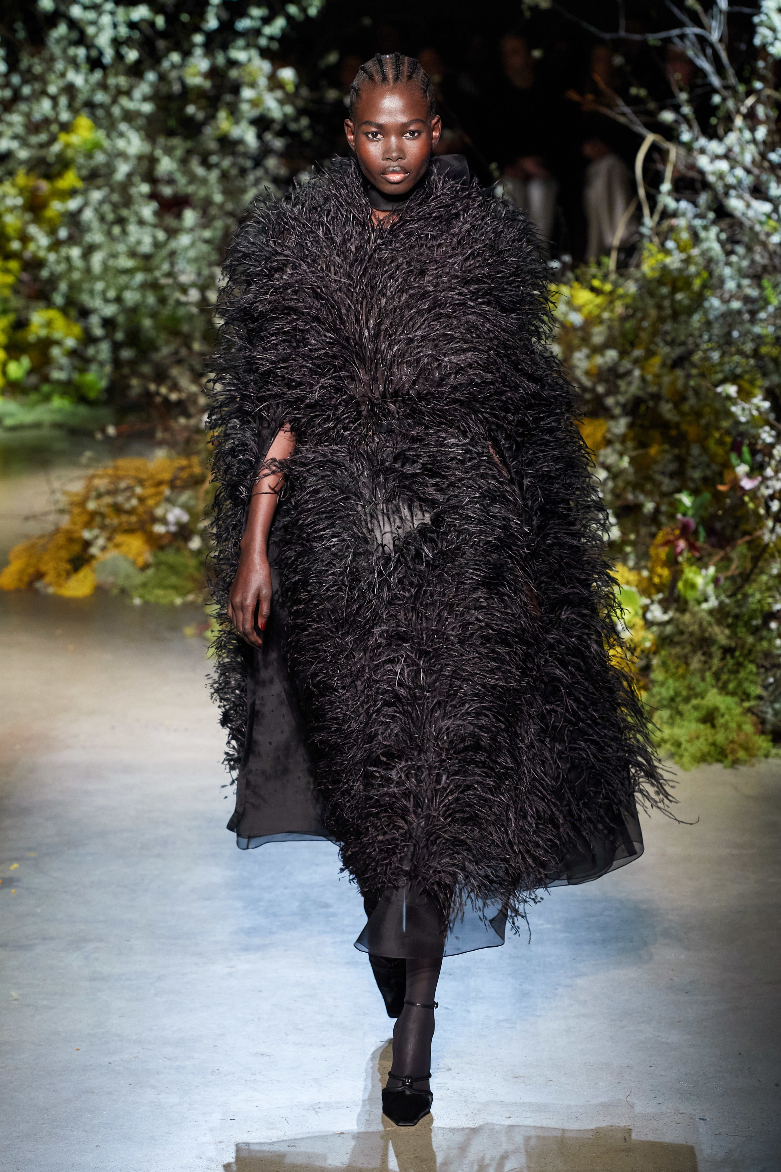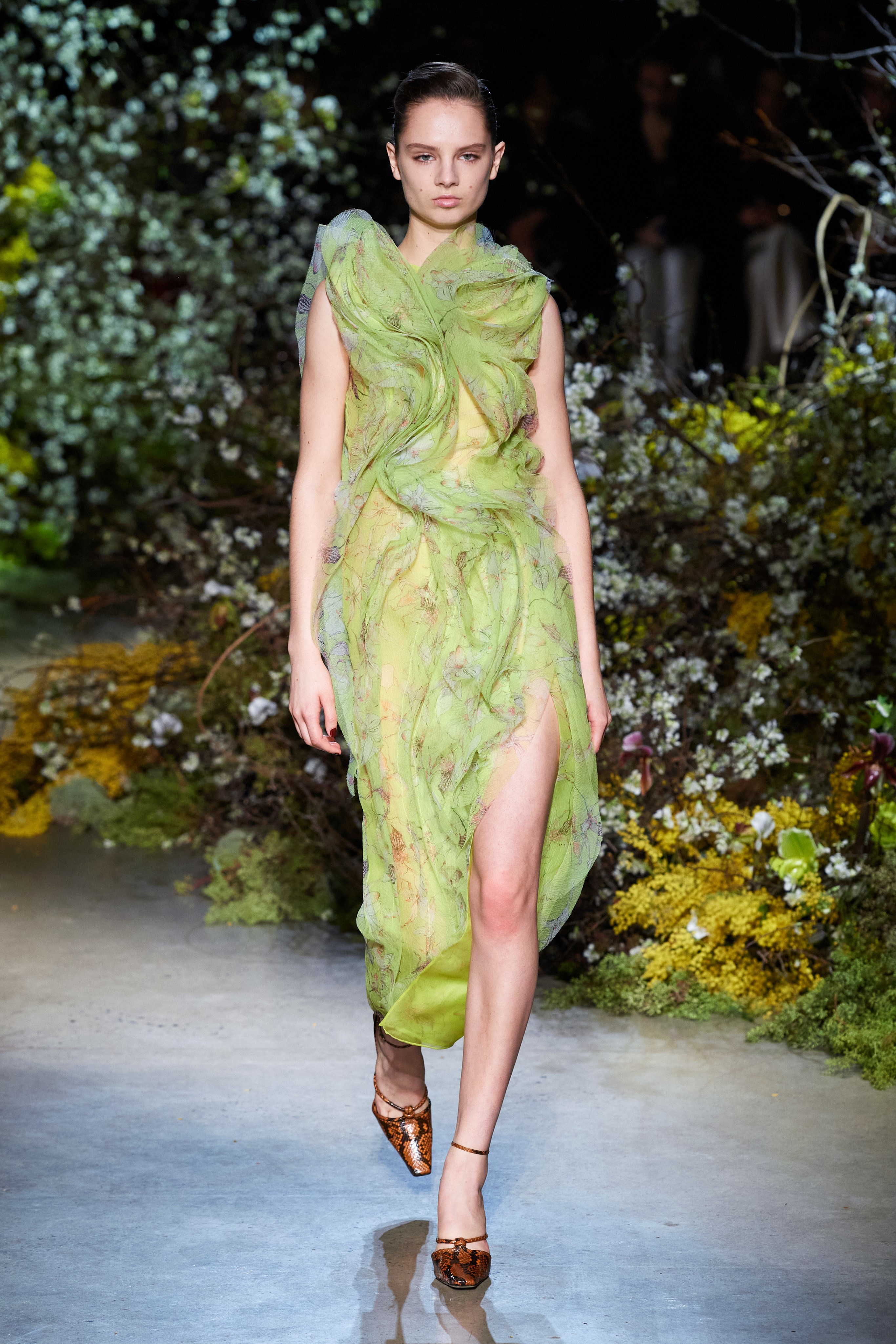 Ключевые элементы: объемные аппликации из органзы и тюля, кейп, блузы с горловиной и бантом на шее у спины, многослойные объёмные драпировки.