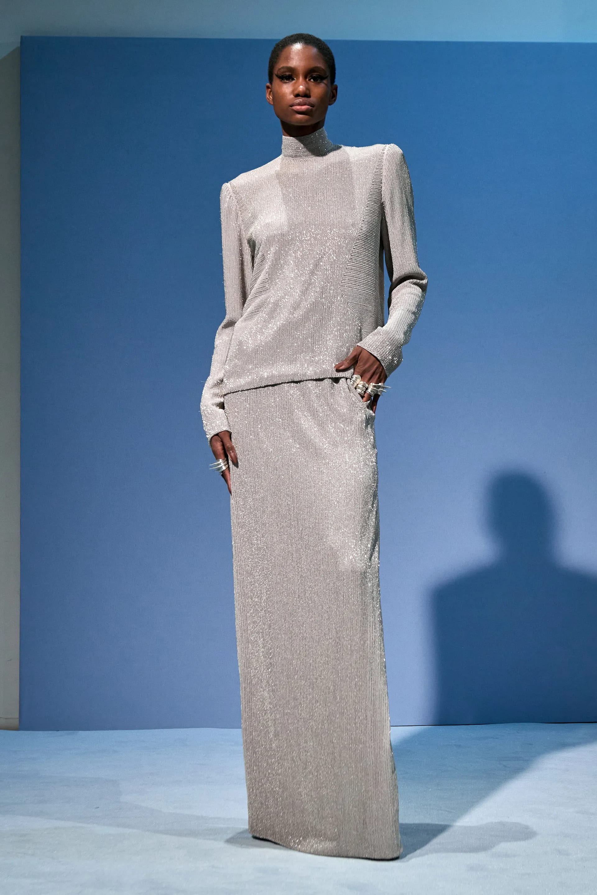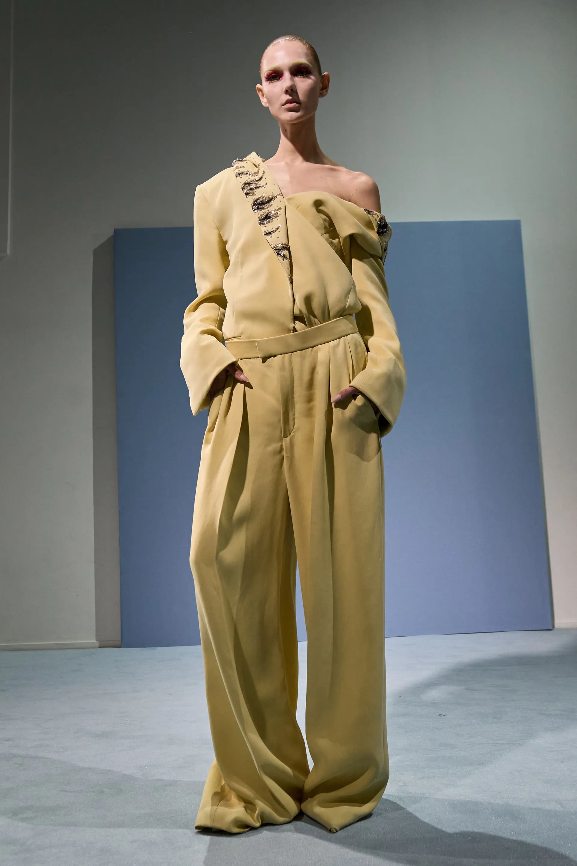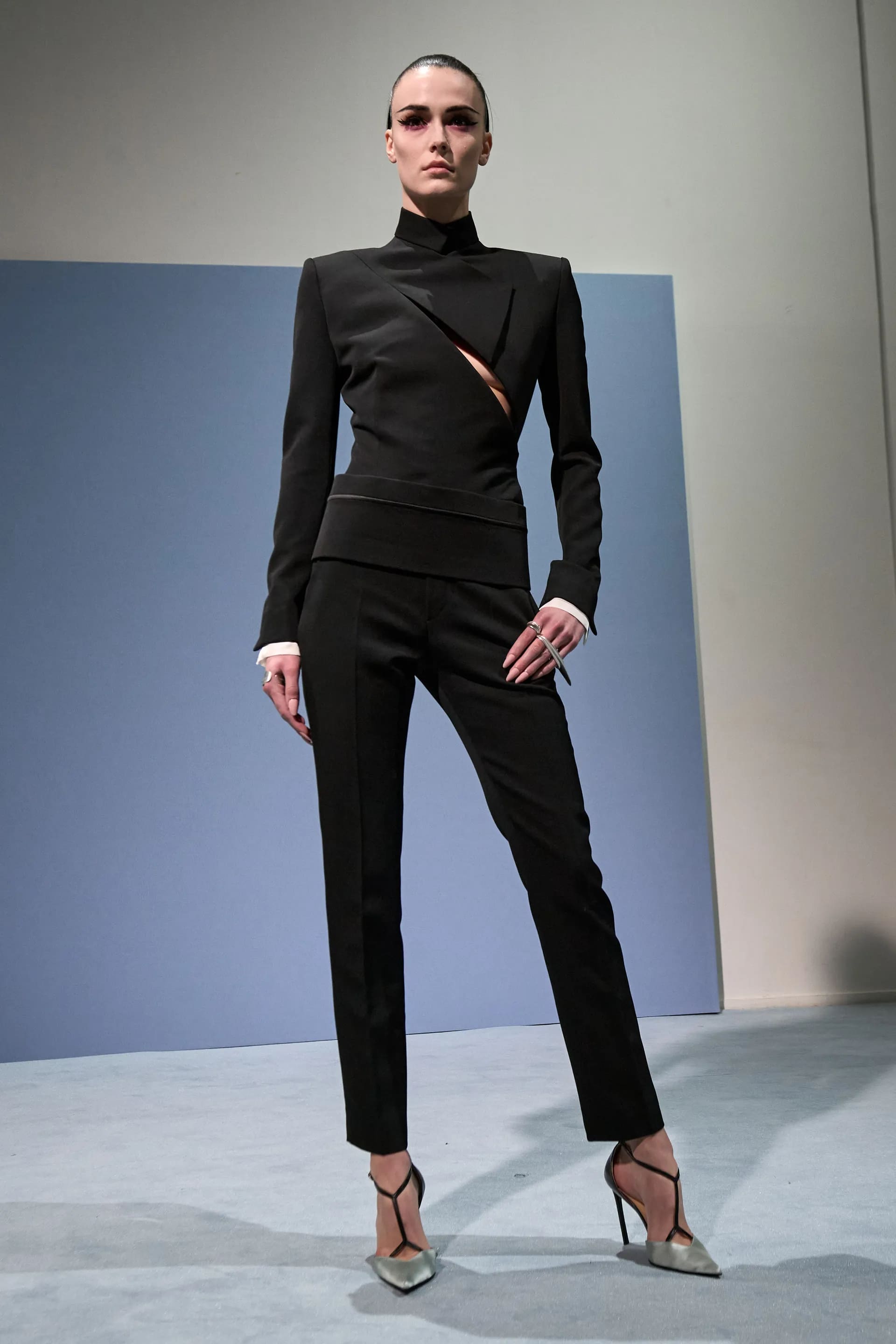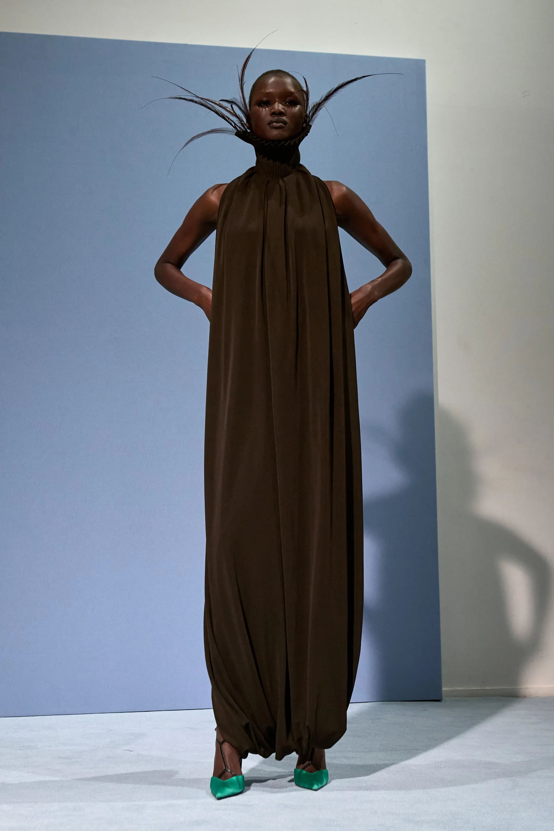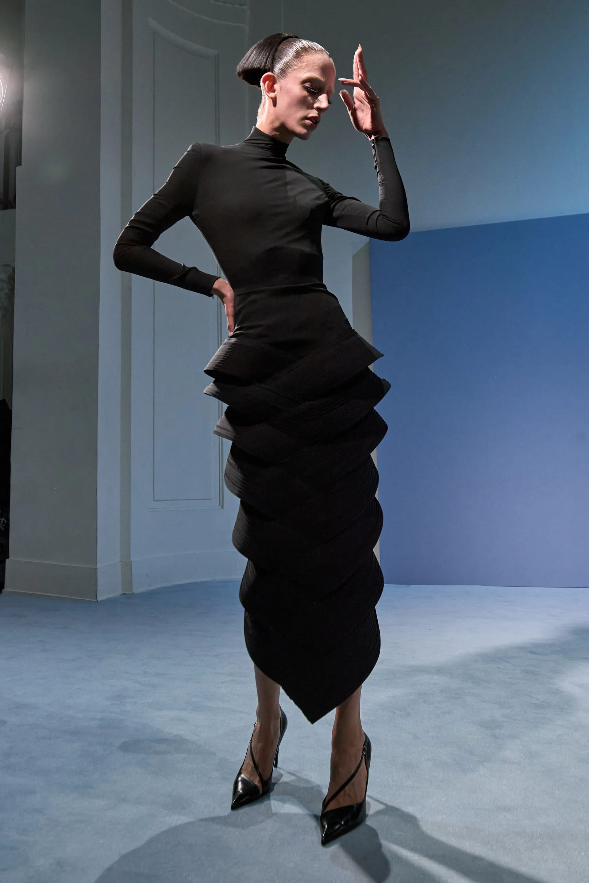 Гострі кути, які так полюбляв Жан Поль Готьє, перенеслися не лише в костюми. Гайдер Акерманн обрамляє ними пальта та сукні максі. Водночас дизайнер балансує архітектурні настрої м’якими лініями та кольорами. Банти, трендове складне плісерування та асиметричні об’єми: так Акерманн доповнює сукні, які ми ще точно побачимо на червоних доріжках.