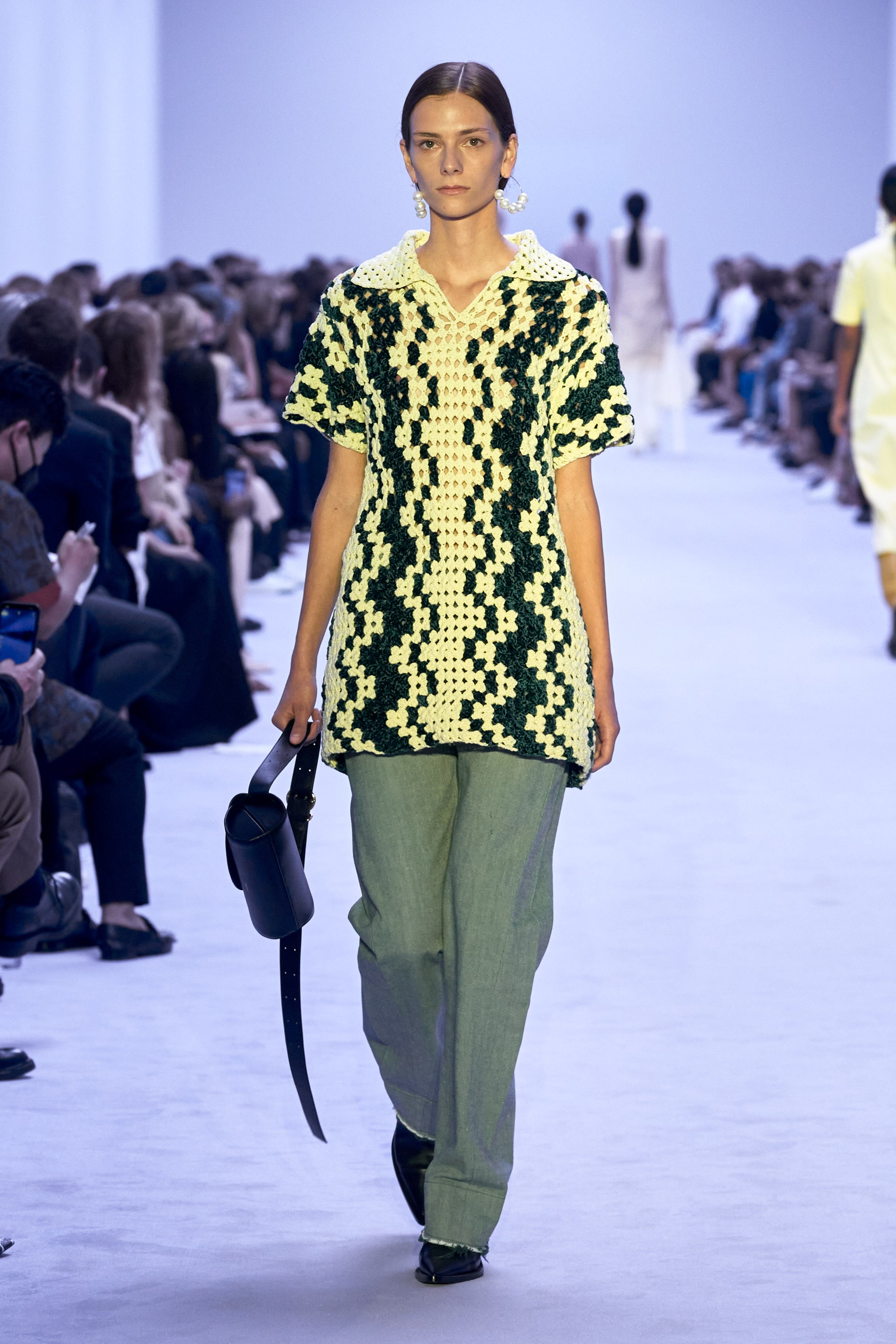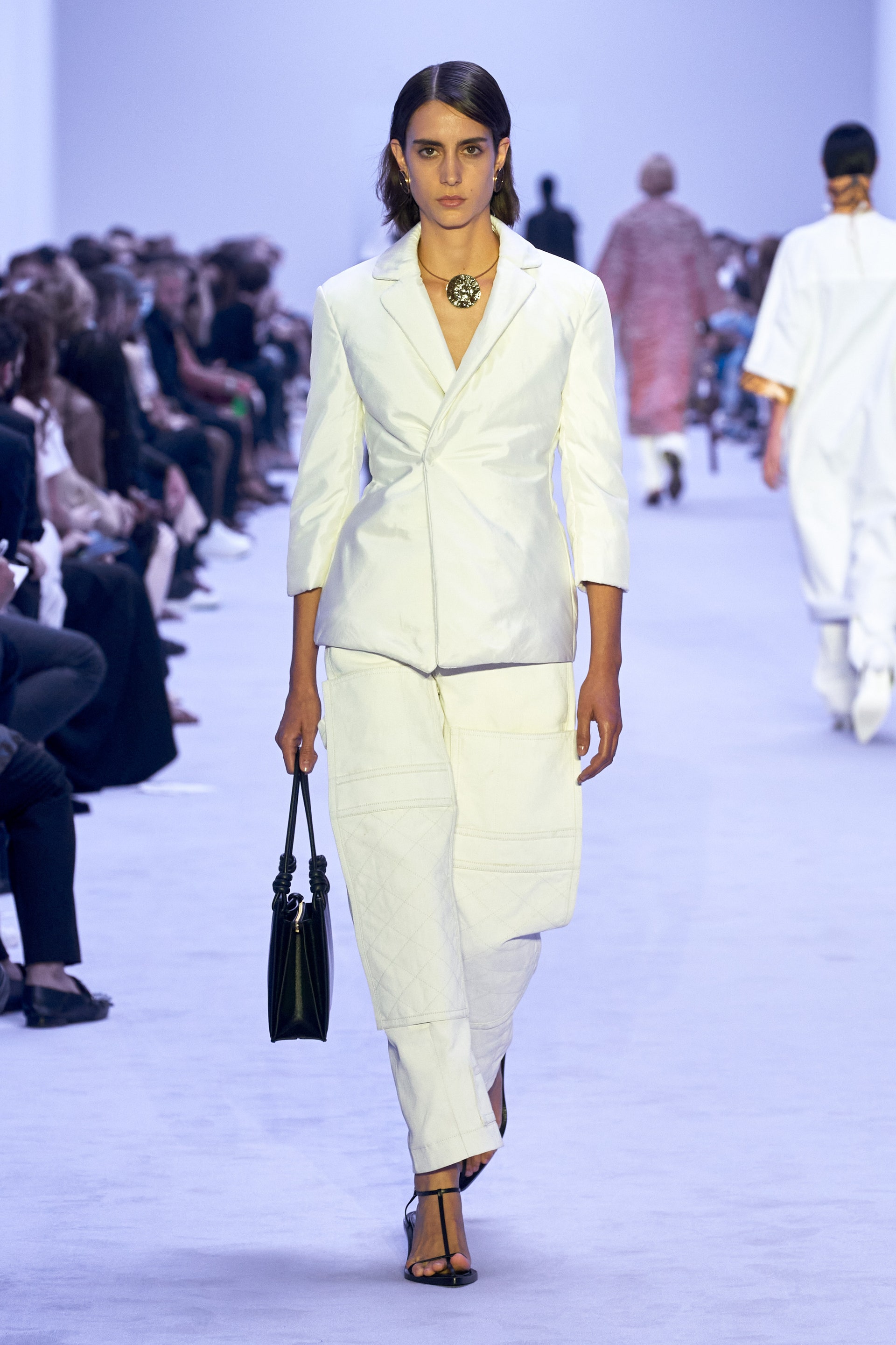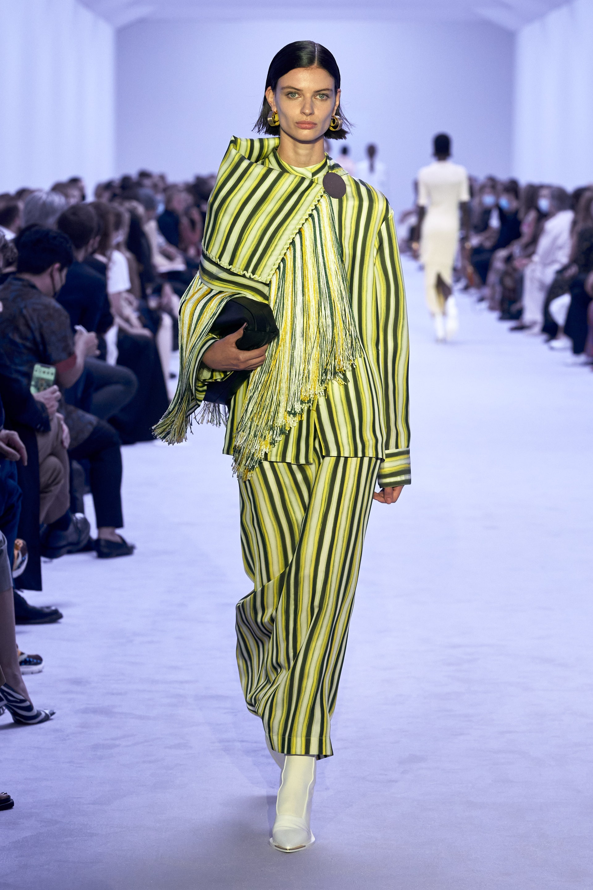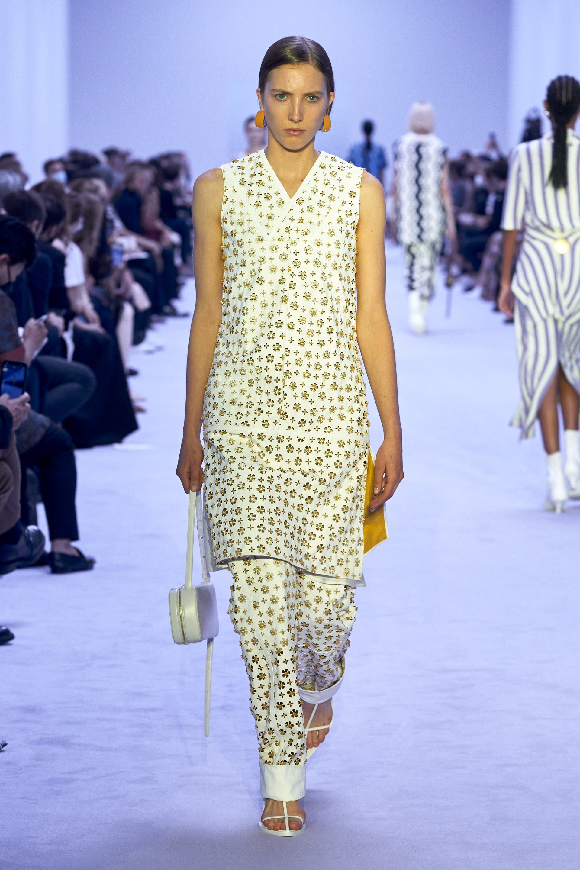 Безупречная холодная элегантность Jil Sander окрасилась новыми красками на весеннем подиуме. Оптимистичные орнаменты пейсли в молочно-неоновых оттенках, пальто в тигровый принт, блестящие костюмы цветов сладостей — Люси и Люк Мейер поддались волне ренессанса, которая захватила нью-йоркскую, лондонскую, а следом и миланскую Неделю моды. У дизайнеров родилась дочь (беби-бум в моде продолжается), и это не могло не отразиться на дизайне новой коллекции, который стал более дружелюбным: комфортные каблуки на сапогах, инфантильные вороты-воланы и стилизованные детские манишки, превращенные в элегантные шарфы. Эксперименты с неоном и пастелью, просторные силуэты и крошечные пуантилические цветы на топах сделали Jil Sander немного более легкомысленным брендом, по крайней мере на один сезон.