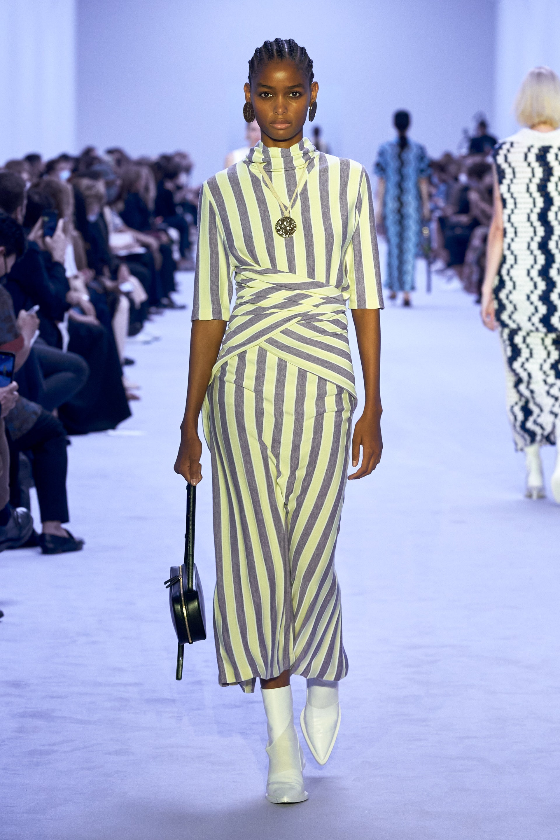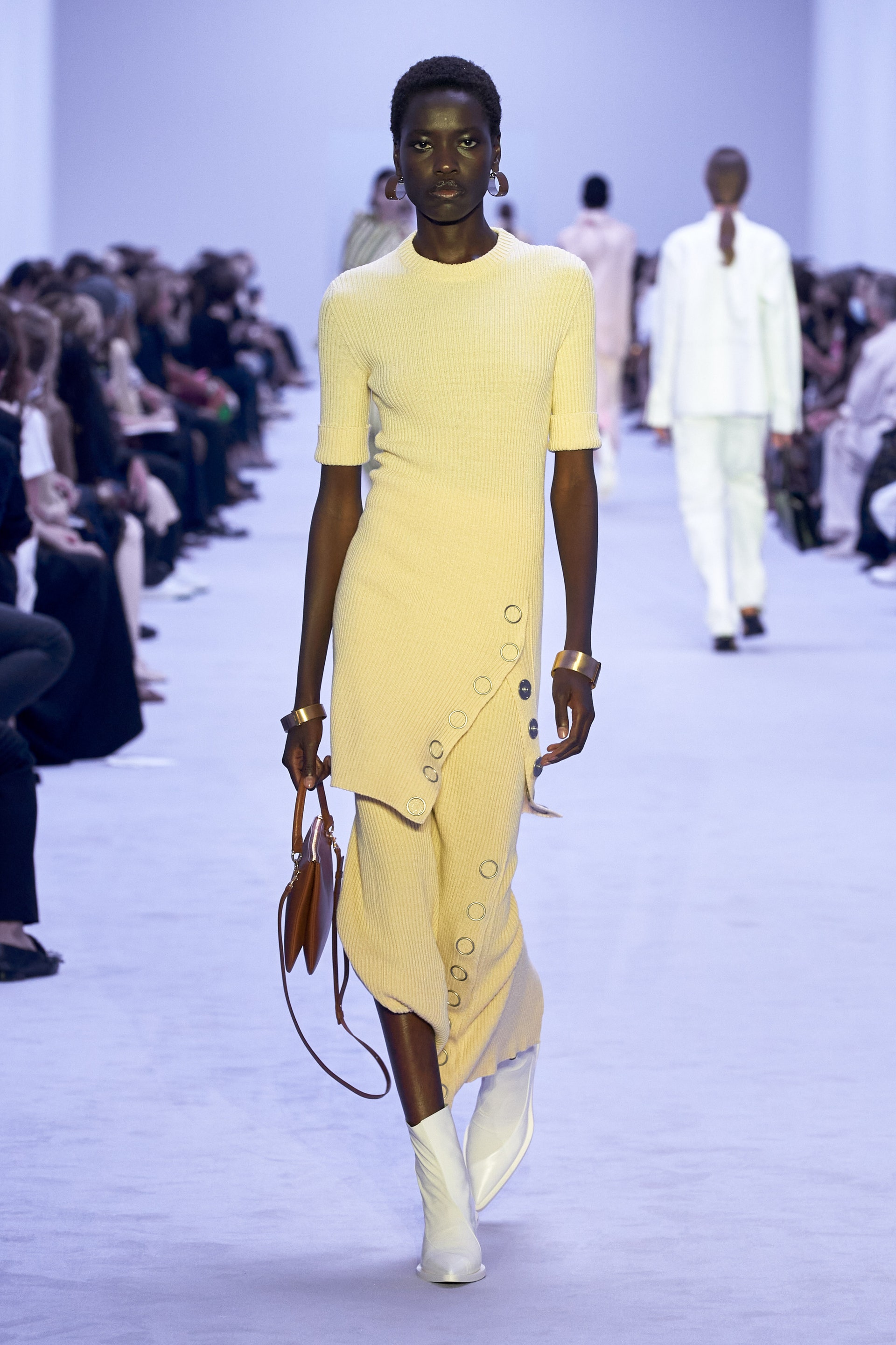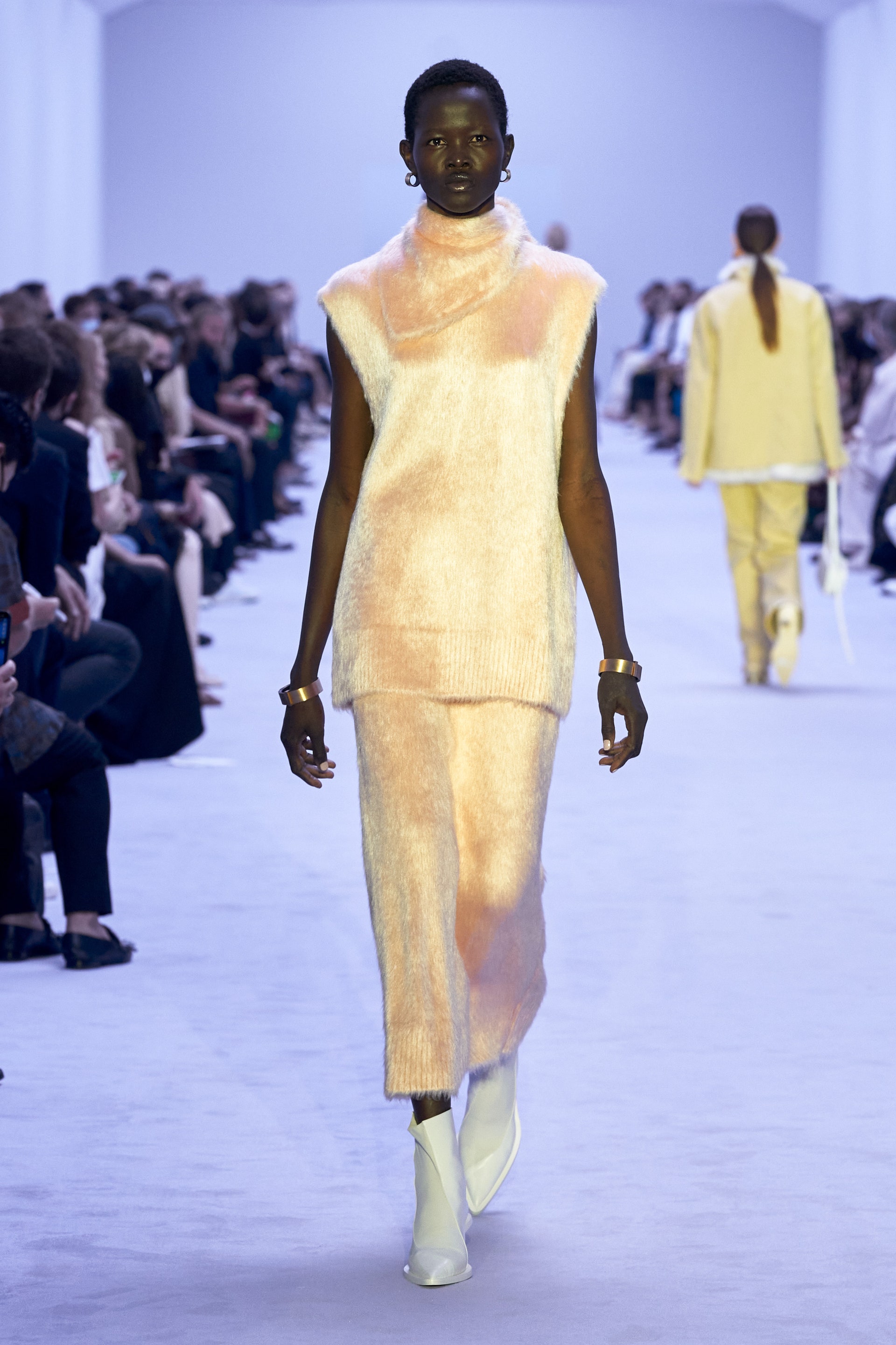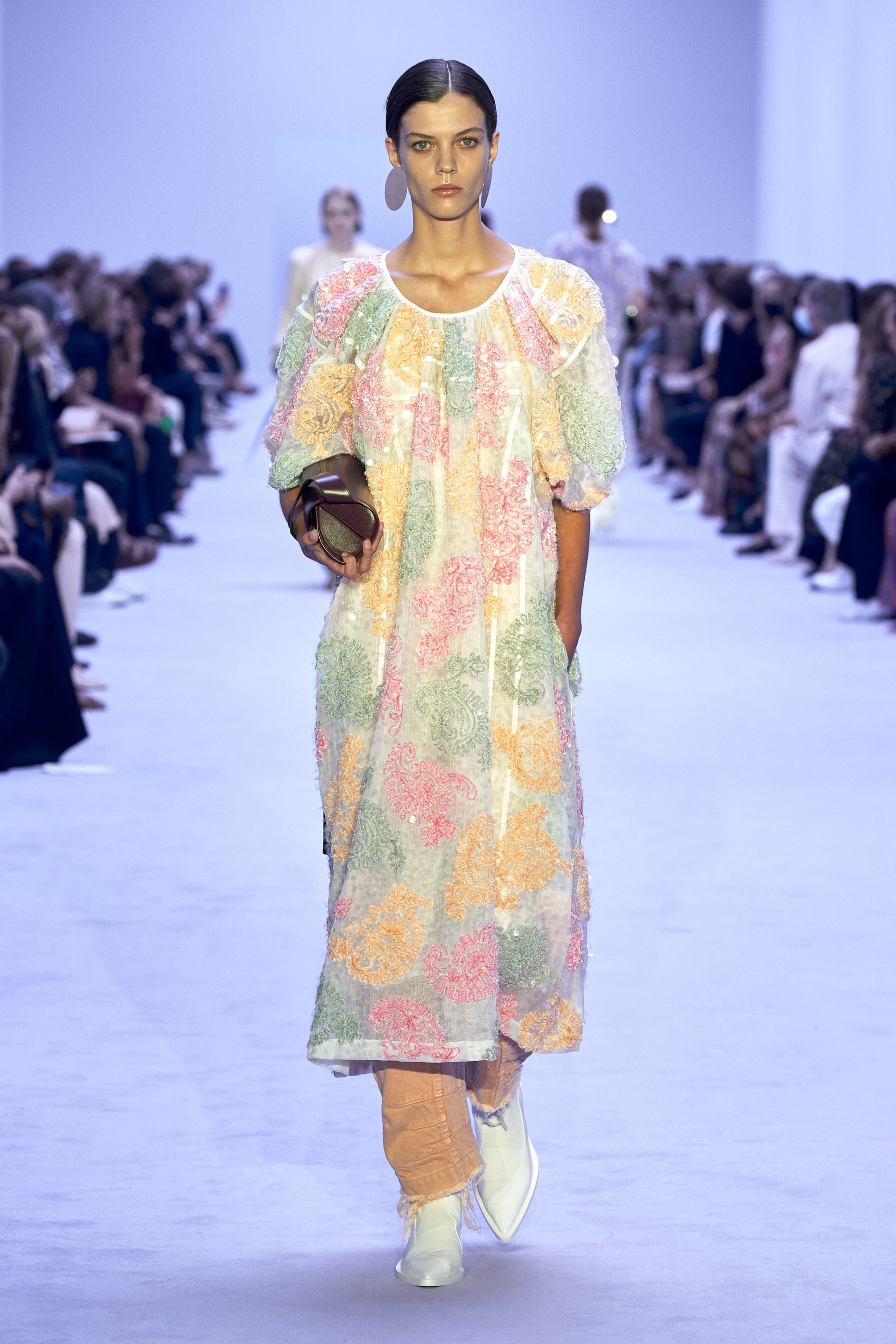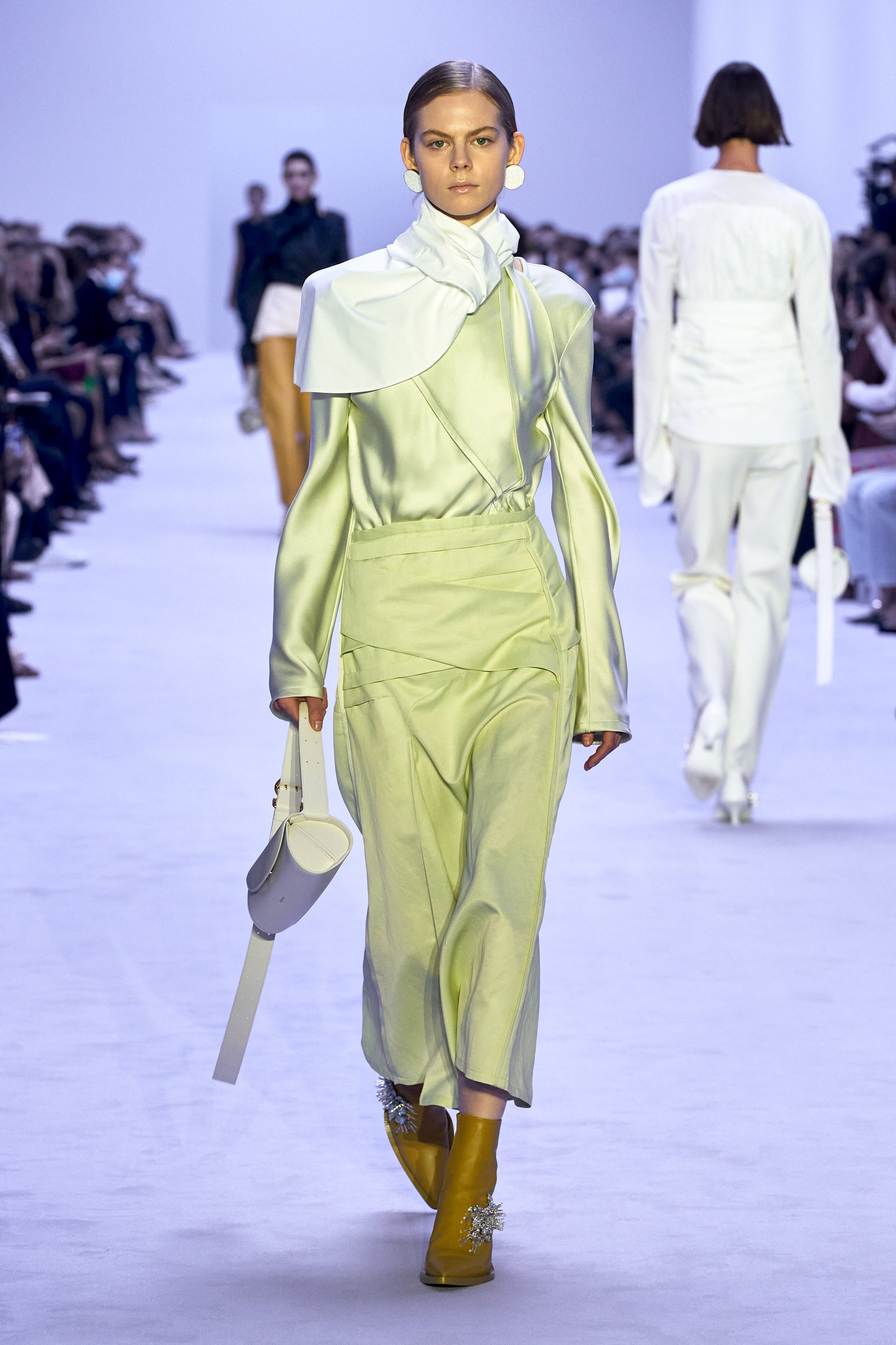 Безупречная холодная элегантность Jil Sander окрасилась новыми красками на весеннем подиуме. Оптимистичные орнаменты пейсли в молочно-неоновых оттенках, пальто в тигровый принт, блестящие костюмы цветов сладостей — Люси и Люк Мейер поддались волне ренессанса, которая захватила нью-йоркскую, лондонскую, а следом и миланскую Неделю моды. У дизайнеров родилась дочь (беби-бум в моде продолжается), и это не могло не отразиться на дизайне новой коллекции, который стал более дружелюбным: комфортные каблуки на сапогах, инфантильные вороты-воланы и стилизованные детские манишки, превращенные в элегантные шарфы. Эксперименты с неоном и пастелью, просторные силуэты и крошечные пуантилические цветы на топах сделали Jil Sander немного более легкомысленным брендом, по крайней мере на один сезон.