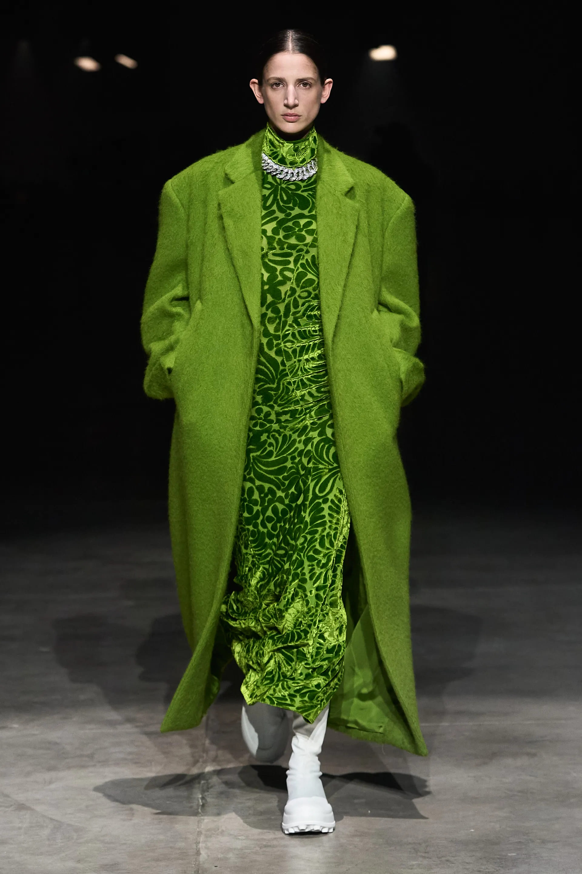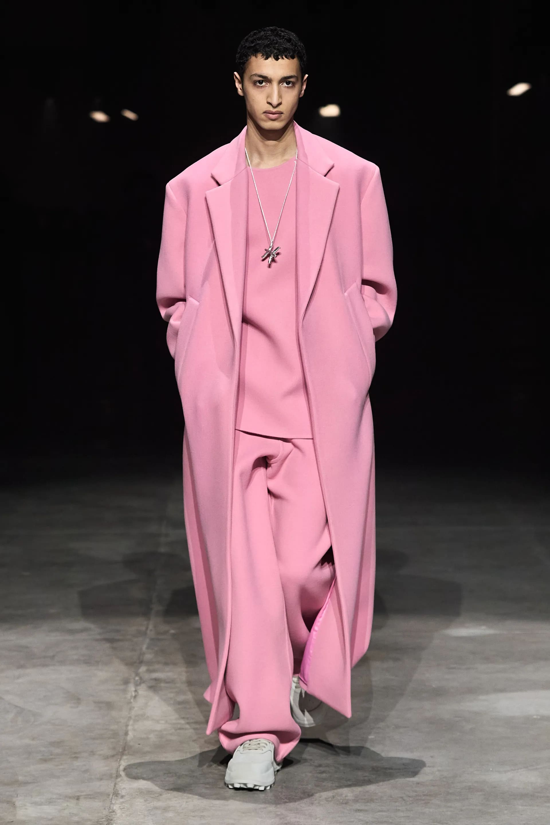 Довгі сірі, рожеві, зелені та чорні вовняні пальта, костюмні блейзери, максісукні – це все класичні для бренду типи речей, що з’являються з сезону в сезон. Частина образів була поєднана з чепчиками. Узагалі, чепчики у FW23/24 – дуже помітний елемент. Вони так само представлені в різних кольорах і в жіночій, і в чоловічій лініях.