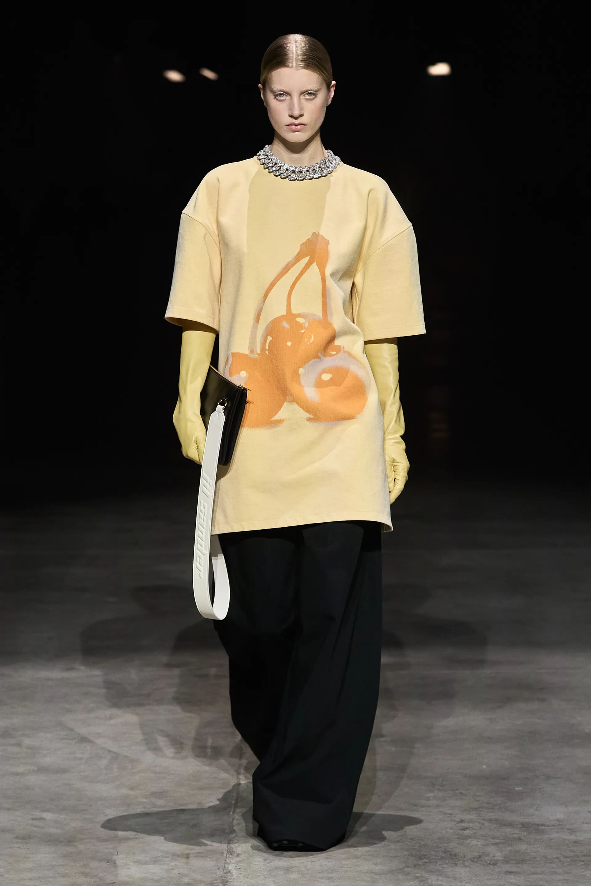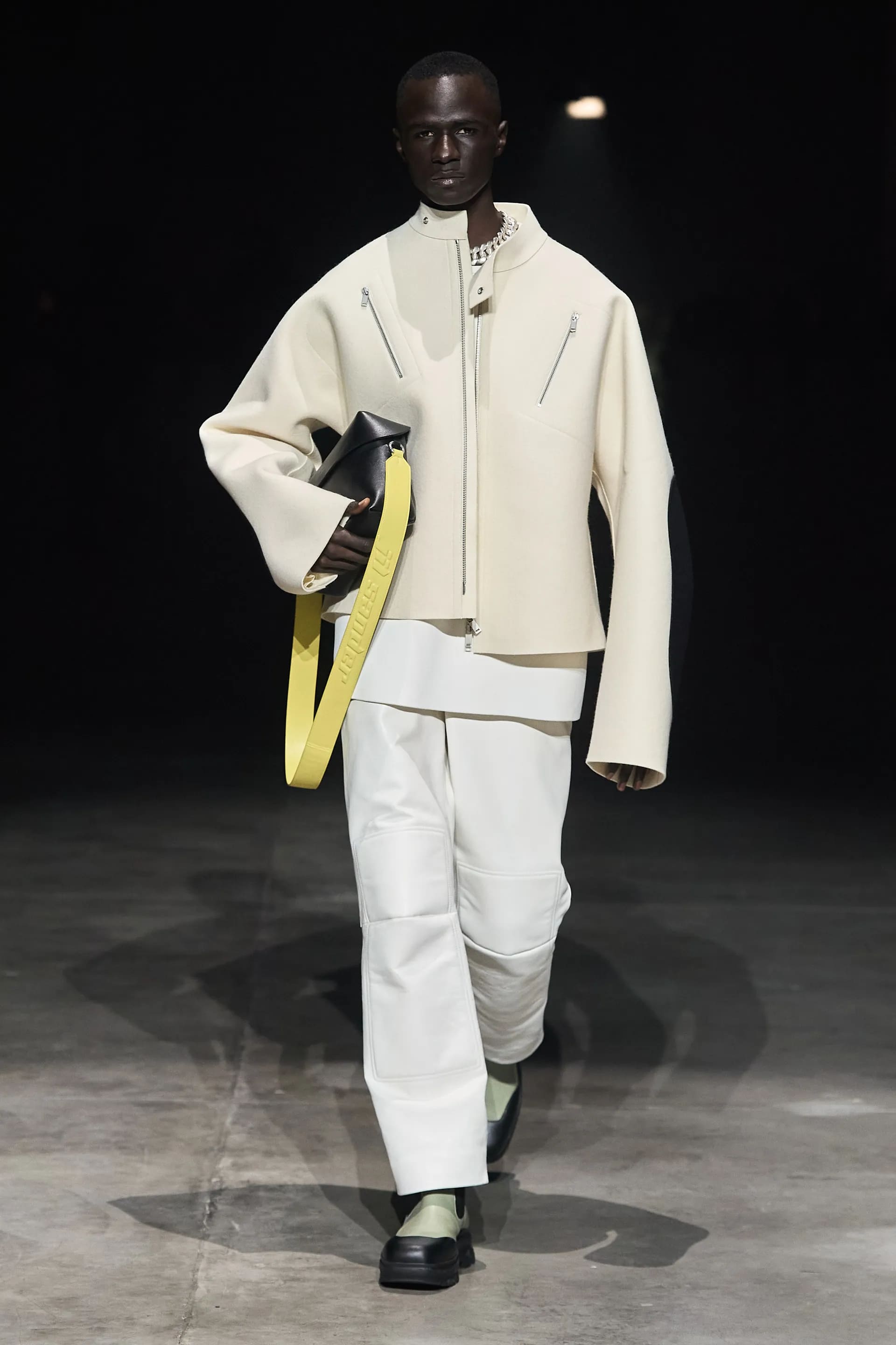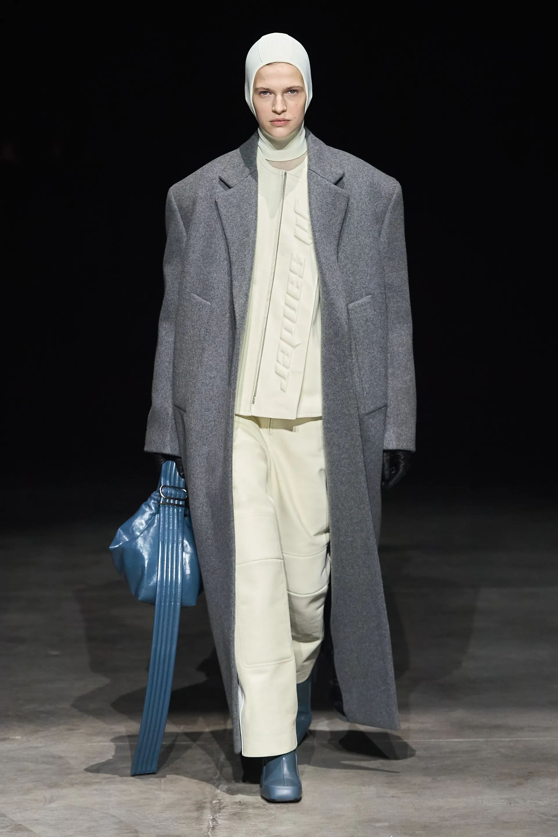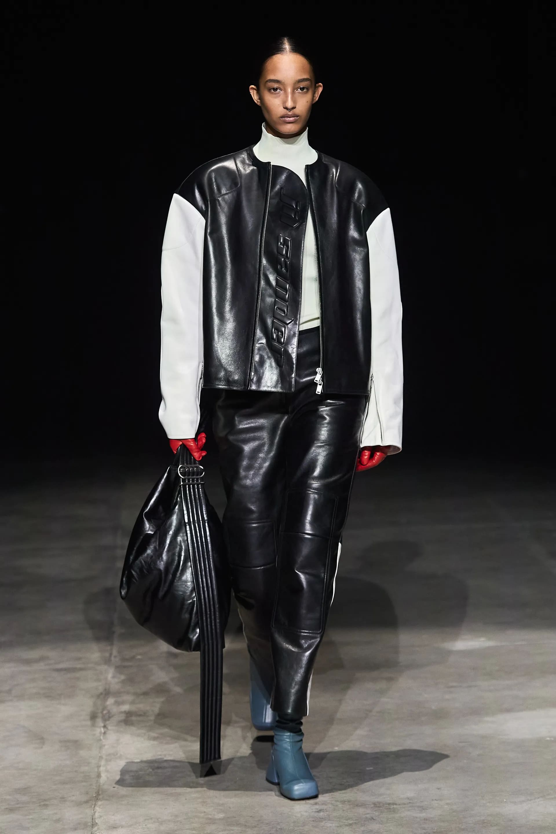 Показ відкривав досить незвичний для мінімалістичного Jil Sander лук: об’ємна біло-чорна байкерська куртка з великим горизонтальним лого та байкерські штани, ніби для гонок на Формулі-1. Яскравими елементами були червоні шкіряні рукавиці та бірюзові черевики на знаковому каблуці форми м’якого квадрату. Увесь образ доєднувала мішкувата сумка. Хоча, можливо, сюди не вистачало байкерського шолому.