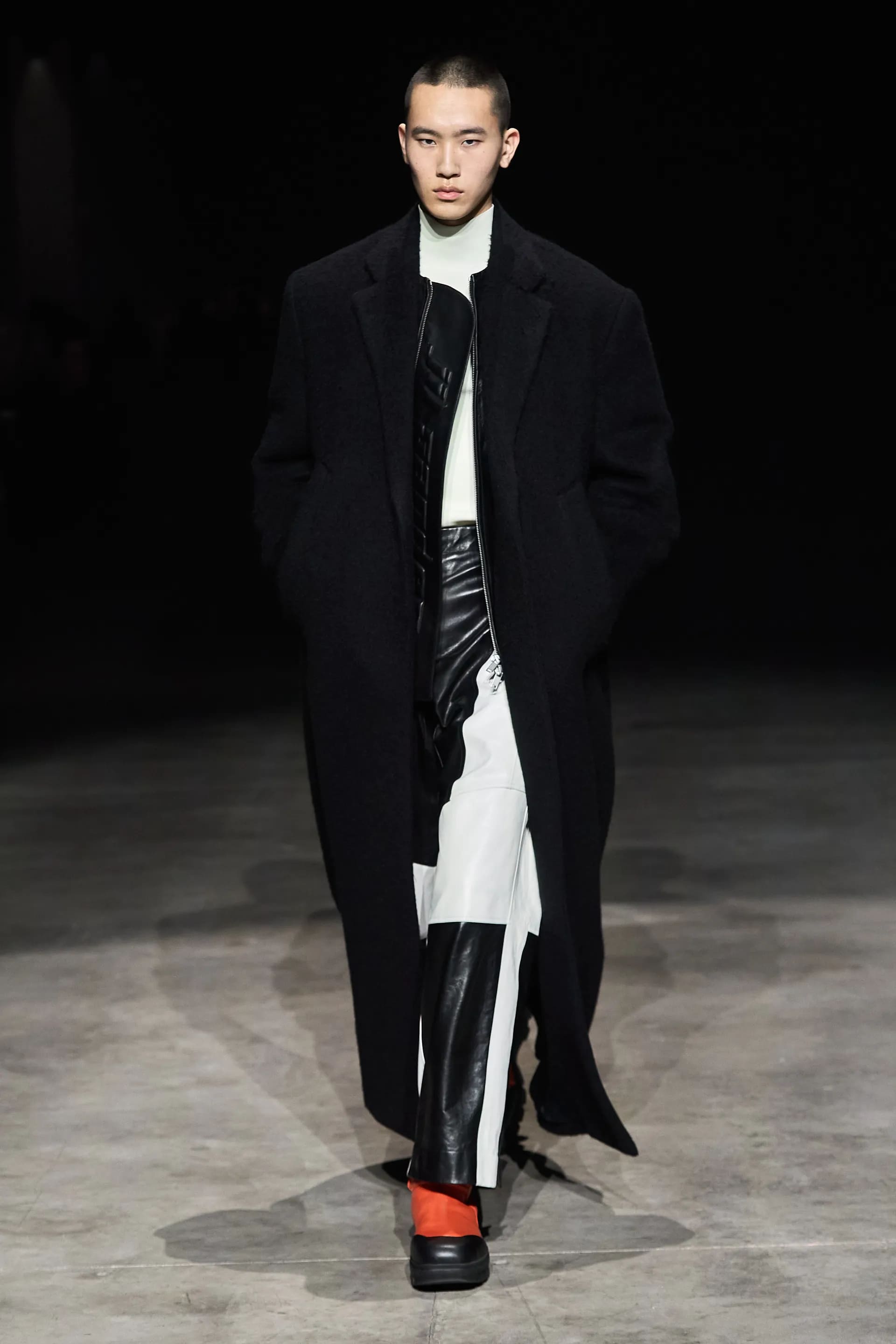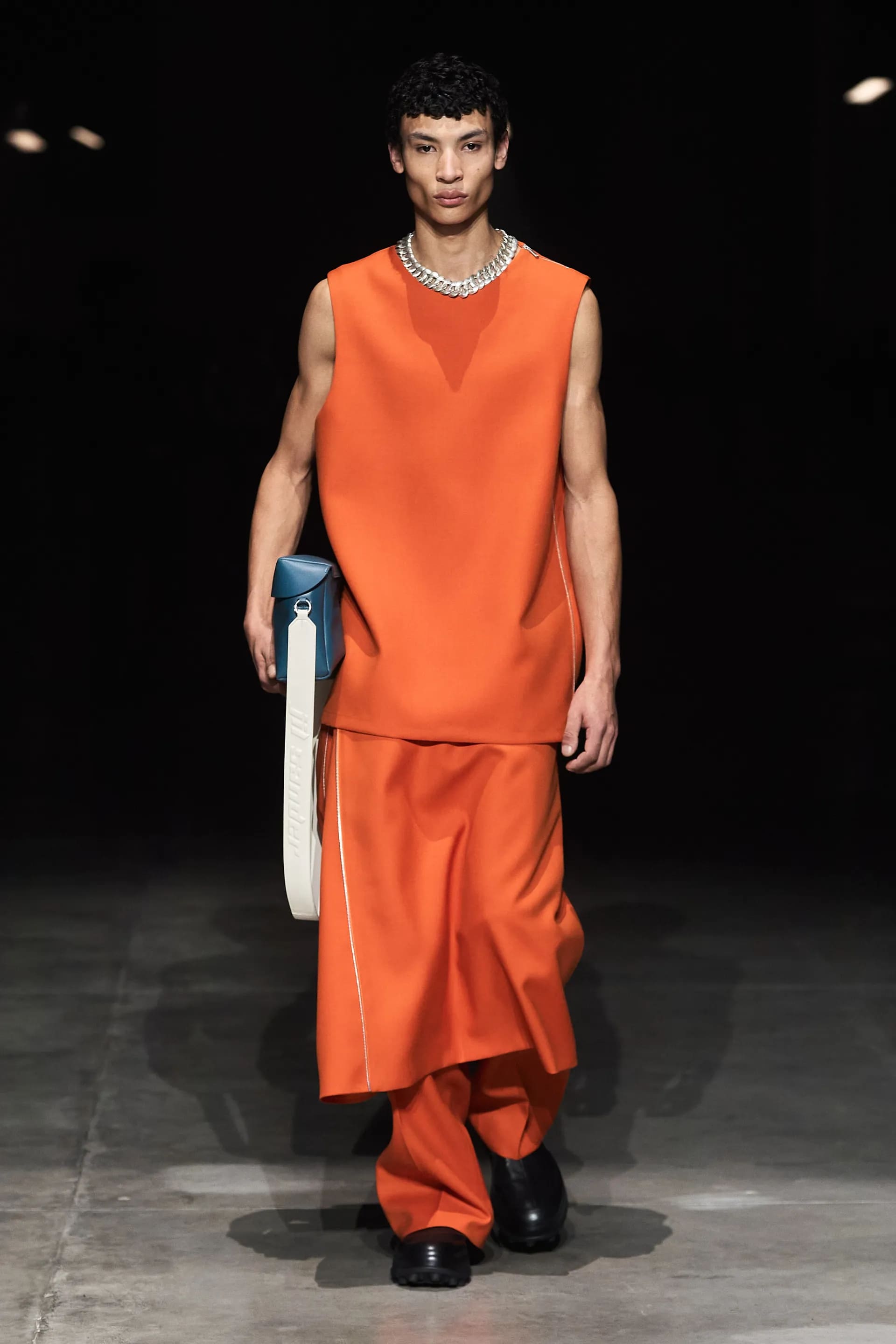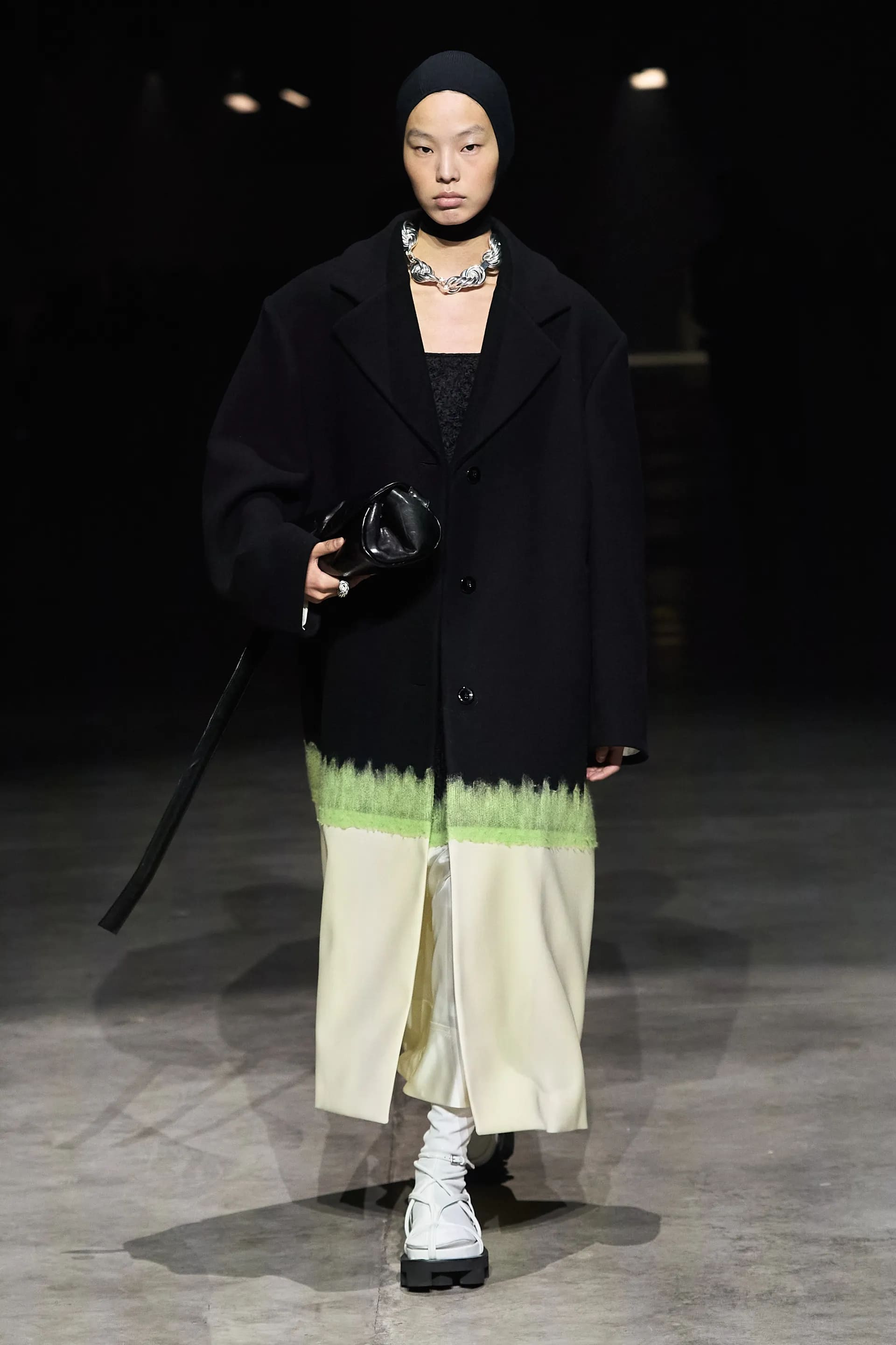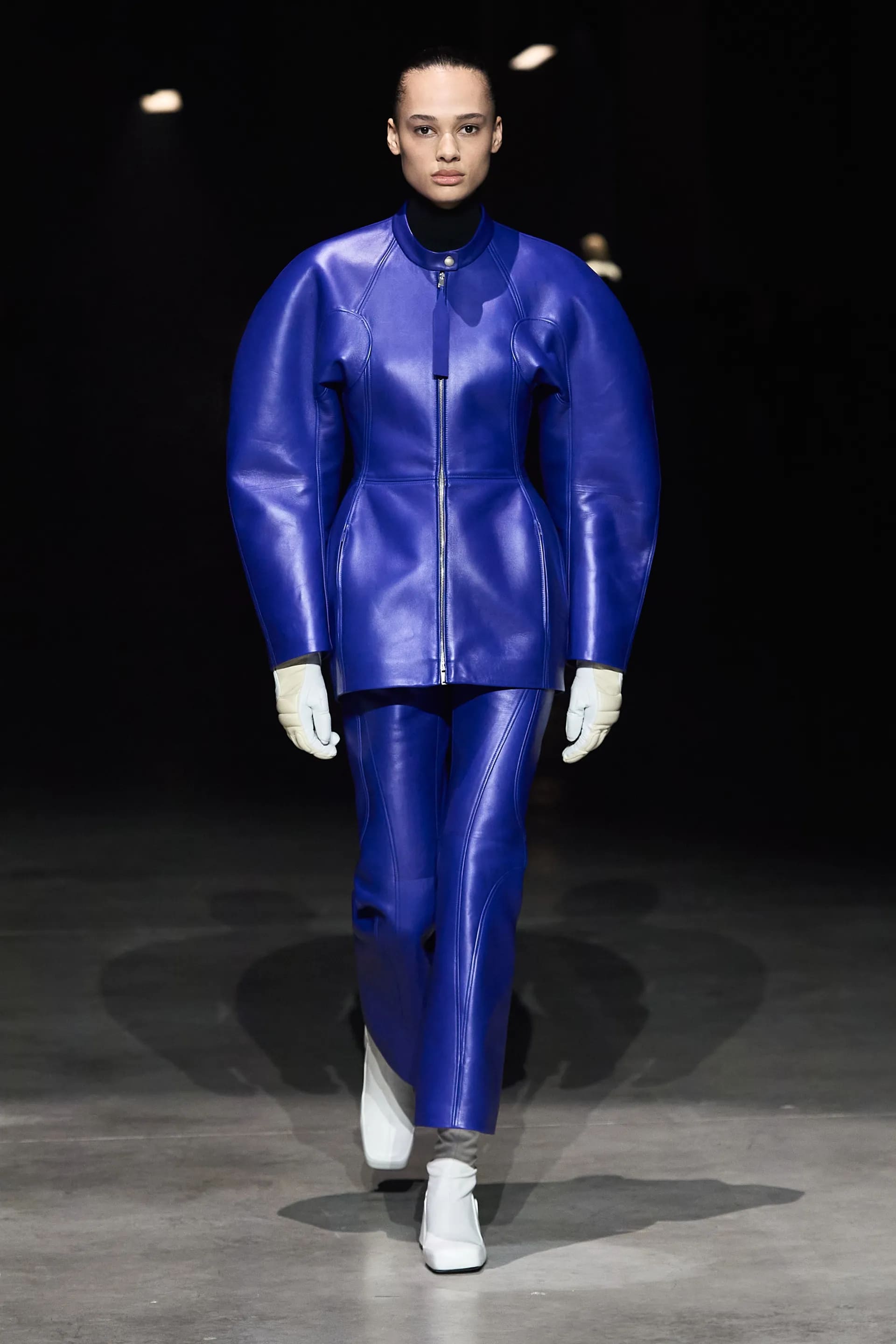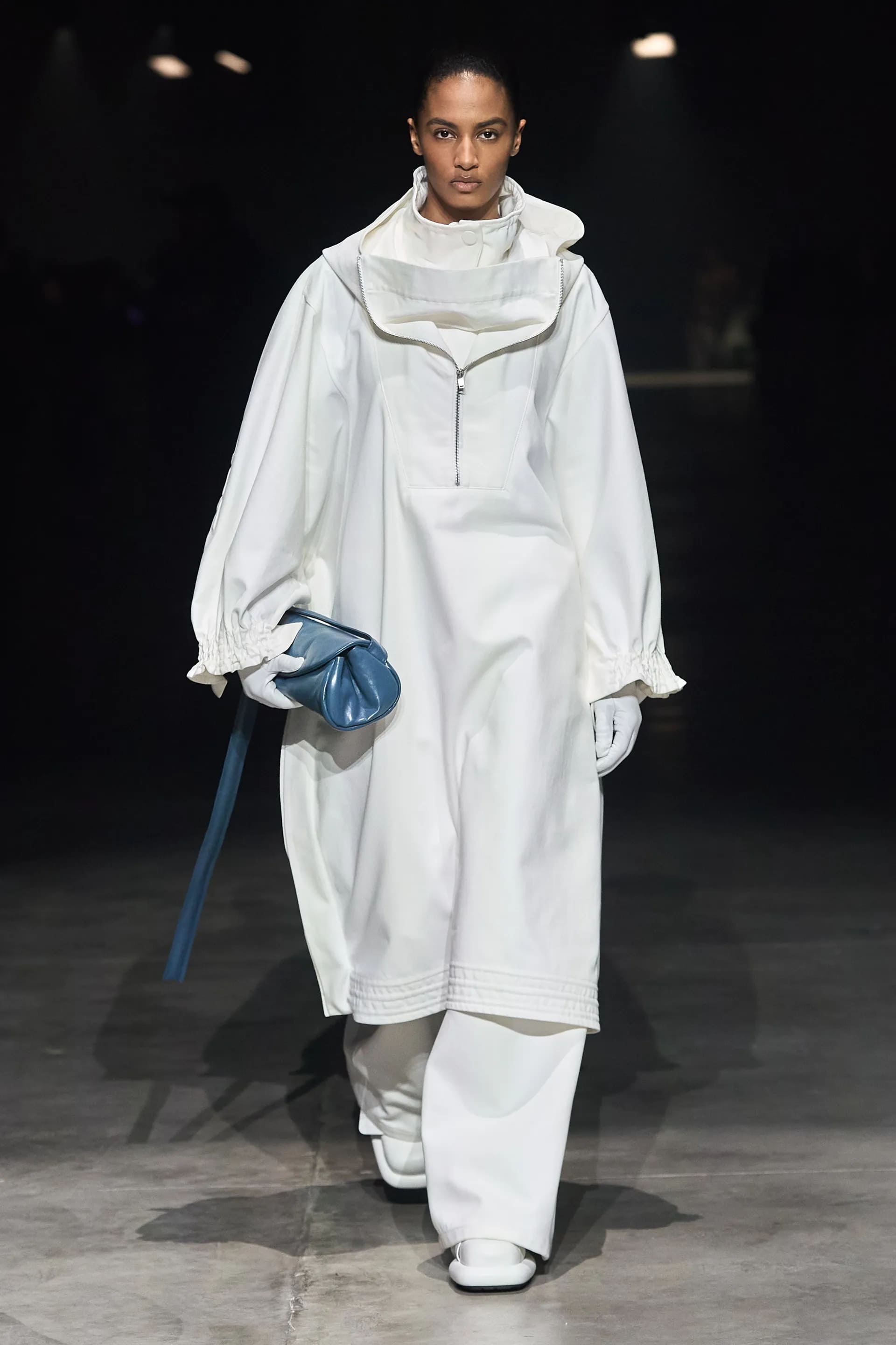 Показ відкривав досить незвичний для мінімалістичного Jil Sander лук: об’ємна біло-чорна байкерська куртка з великим горизонтальним лого та байкерські штани, ніби для гонок на Формулі-1. Яскравими елементами були червоні шкіряні рукавиці та бірюзові черевики на знаковому каблуці форми м’якого квадрату. Увесь образ доєднувала мішкувата сумка. Хоча, можливо, сюди не вистачало байкерського шолому.