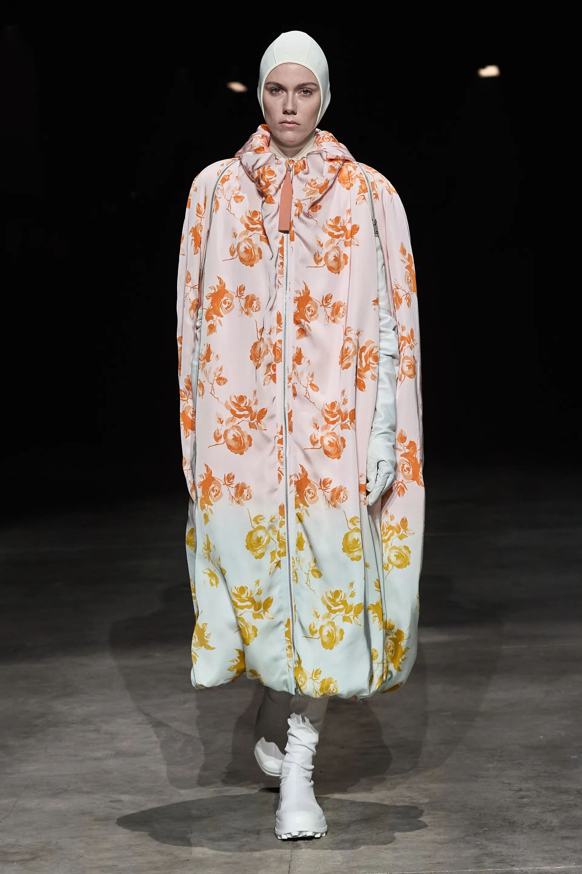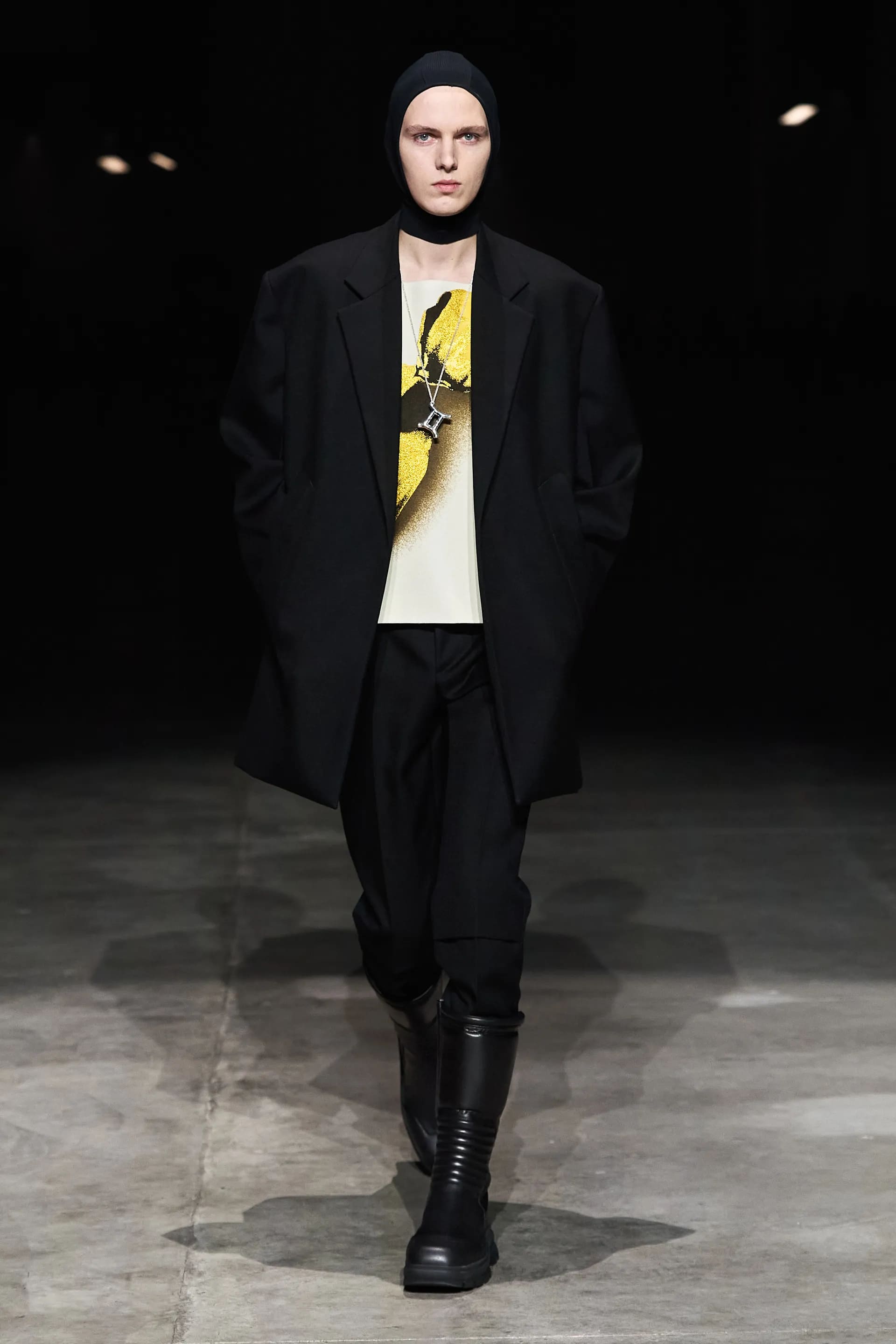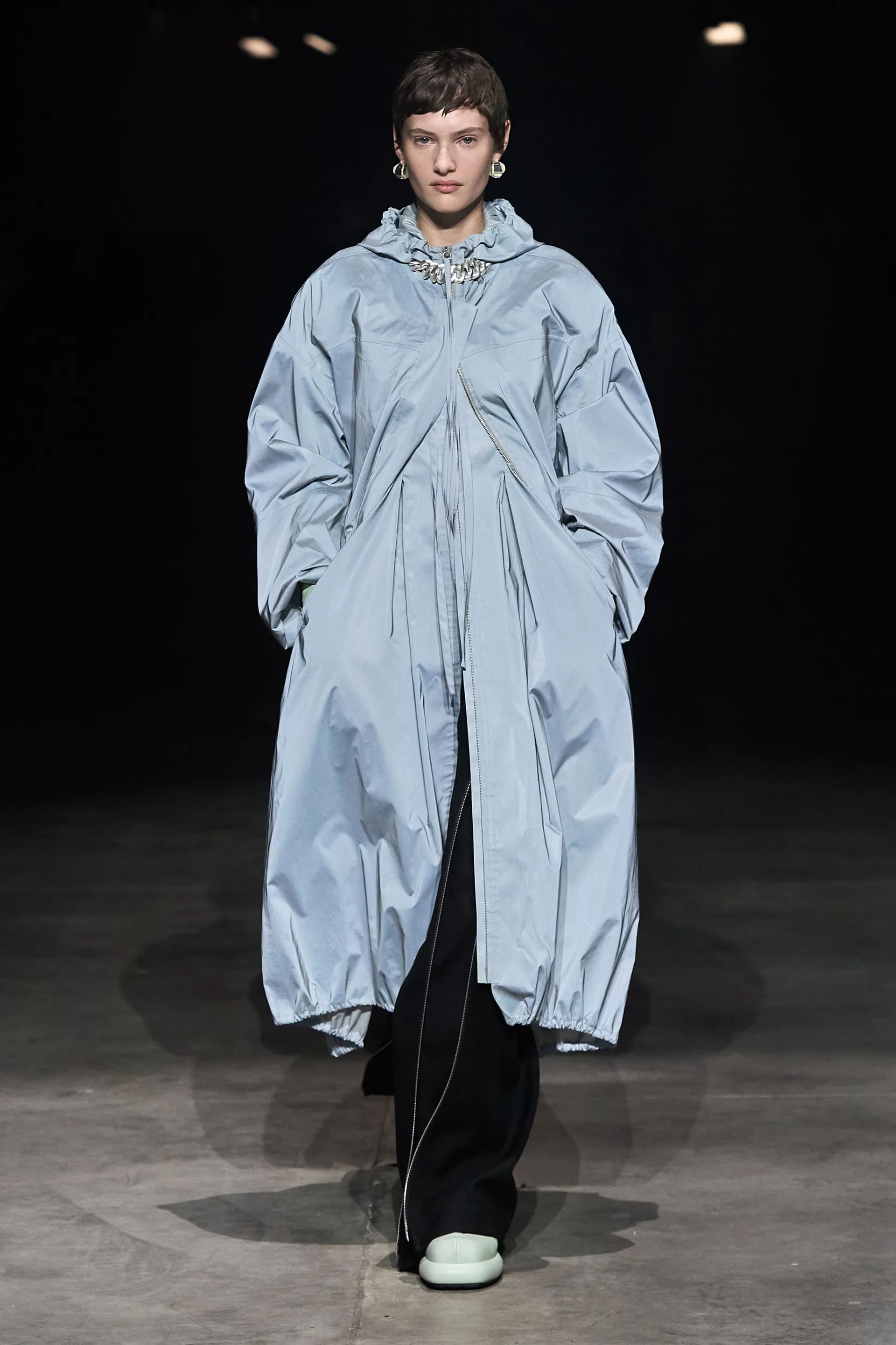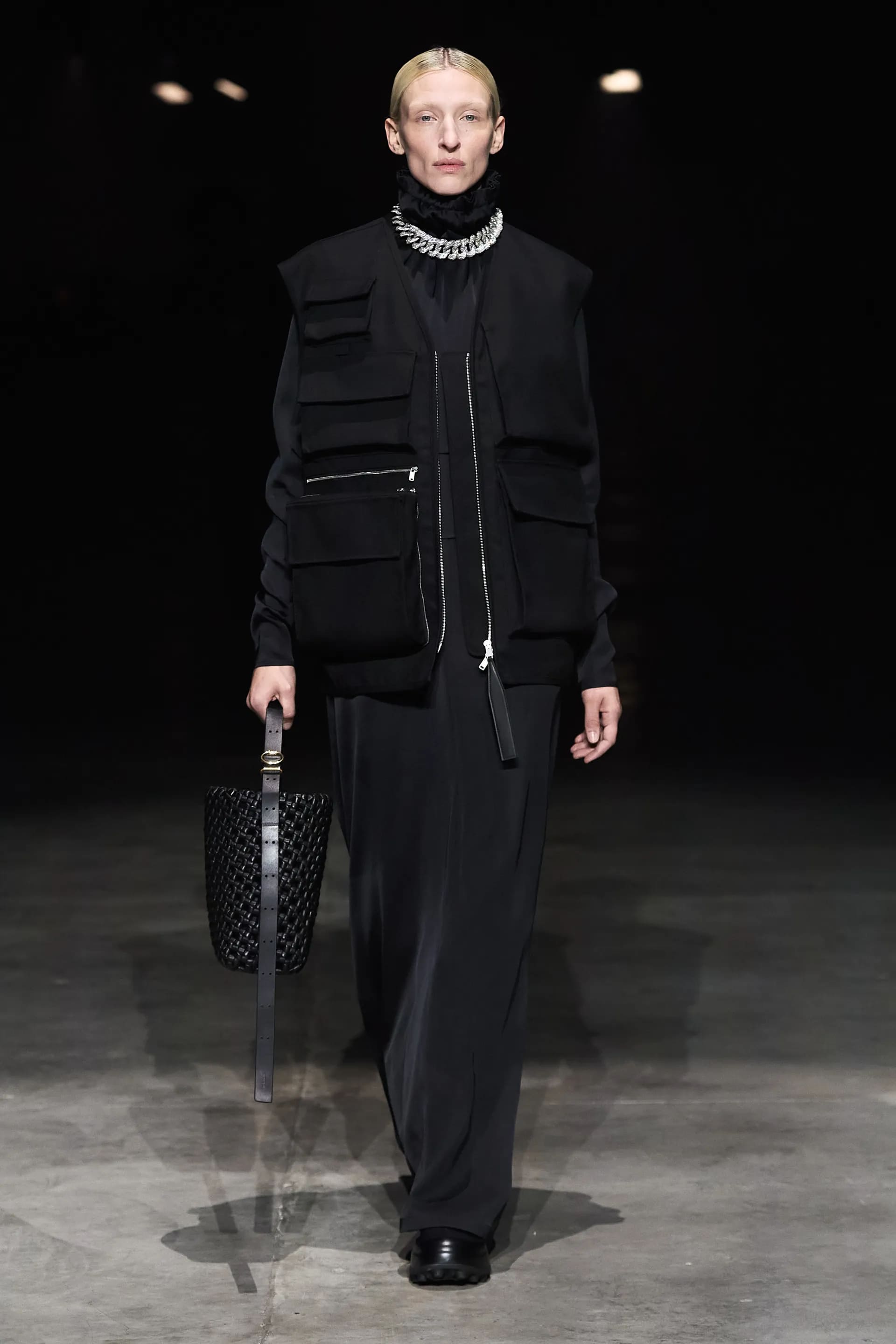 Показ відкривав досить незвичний для мінімалістичного Jil Sander лук: об’ємна біло-чорна байкерська куртка з великим горизонтальним лого та байкерські штани, ніби для гонок на Формулі-1. Яскравими елементами були червоні шкіряні рукавиці та бірюзові черевики на знаковому каблуці форми м’якого квадрату. Увесь образ доєднувала мішкувата сумка. Хоча, можливо, сюди не вистачало байкерського шолому.