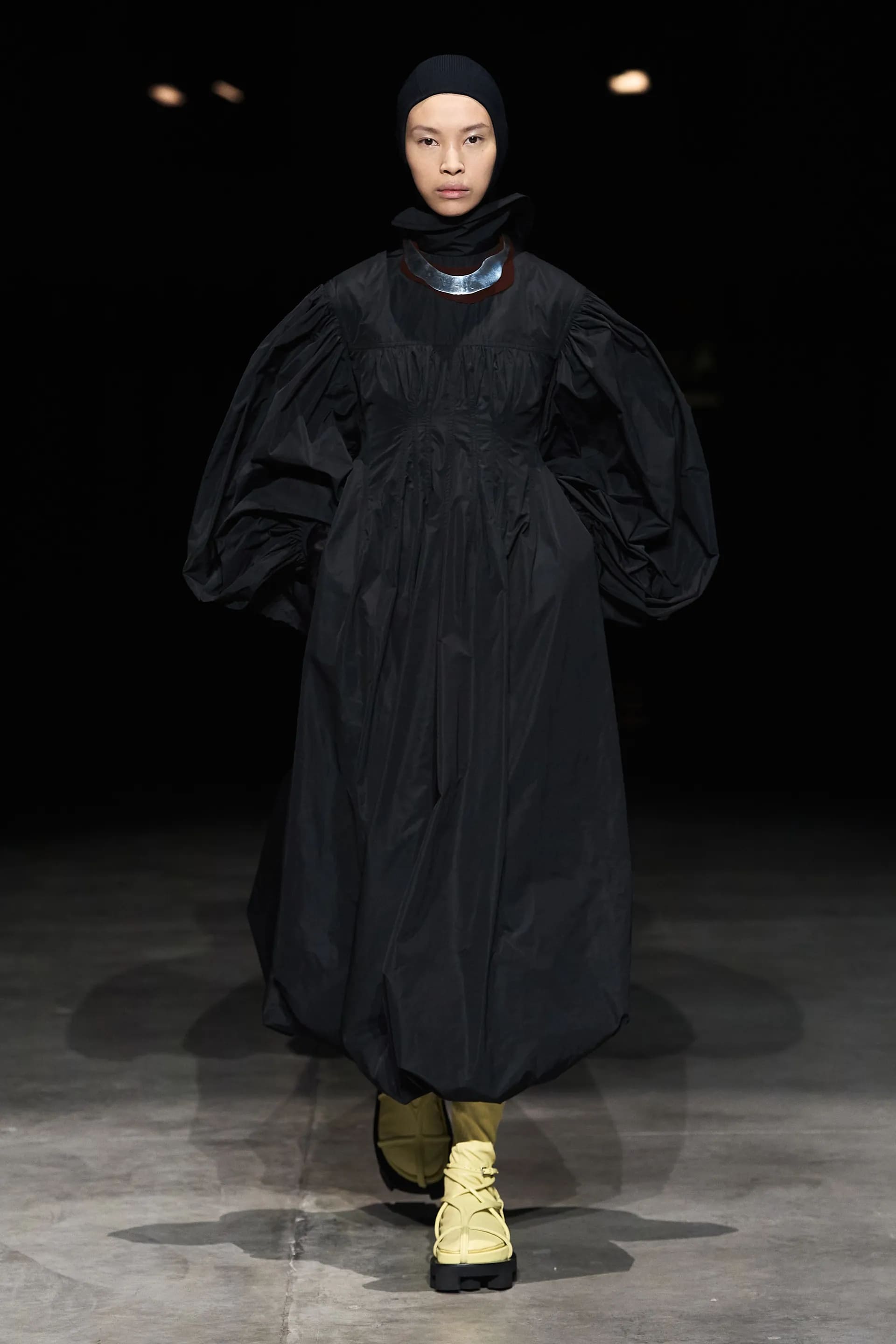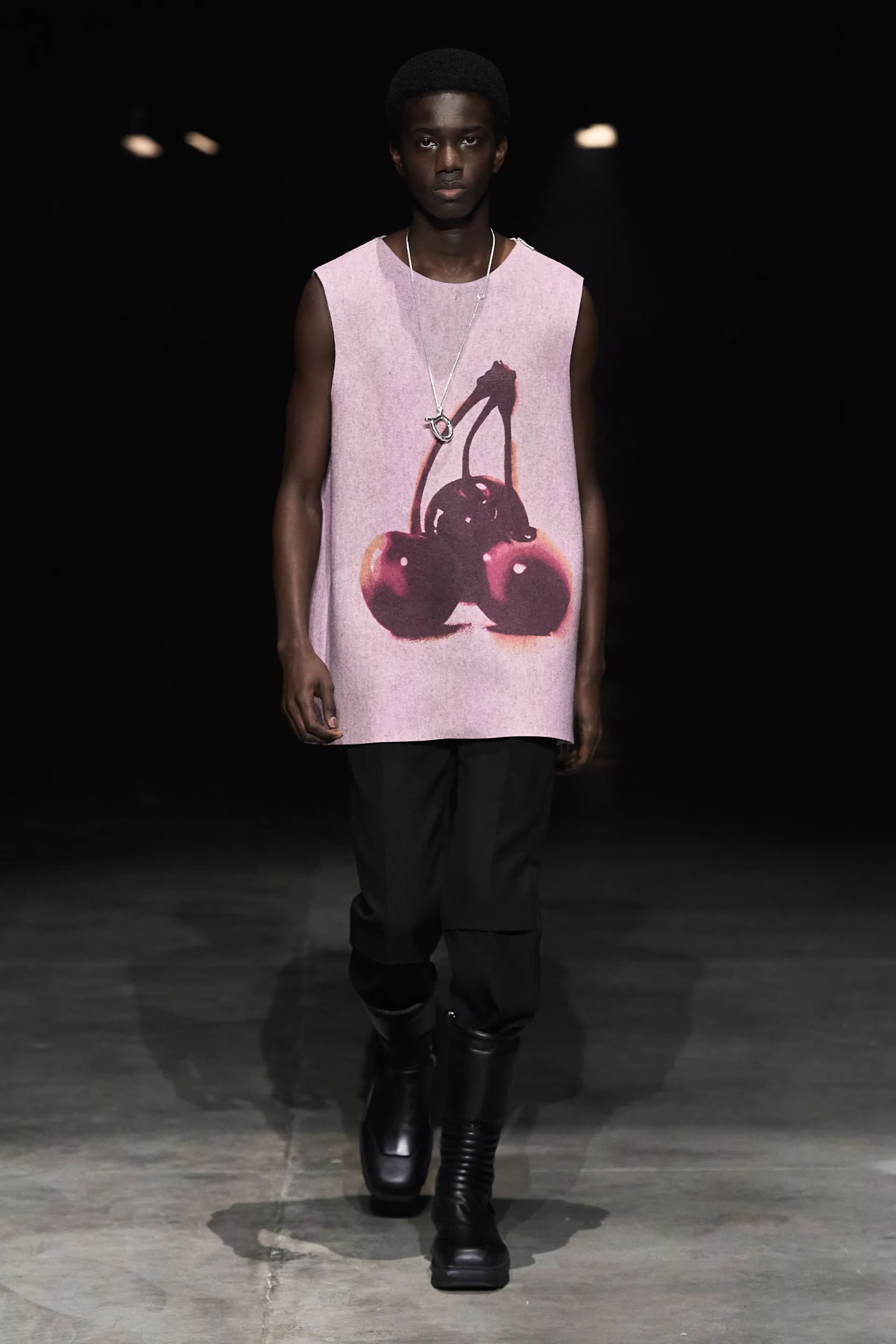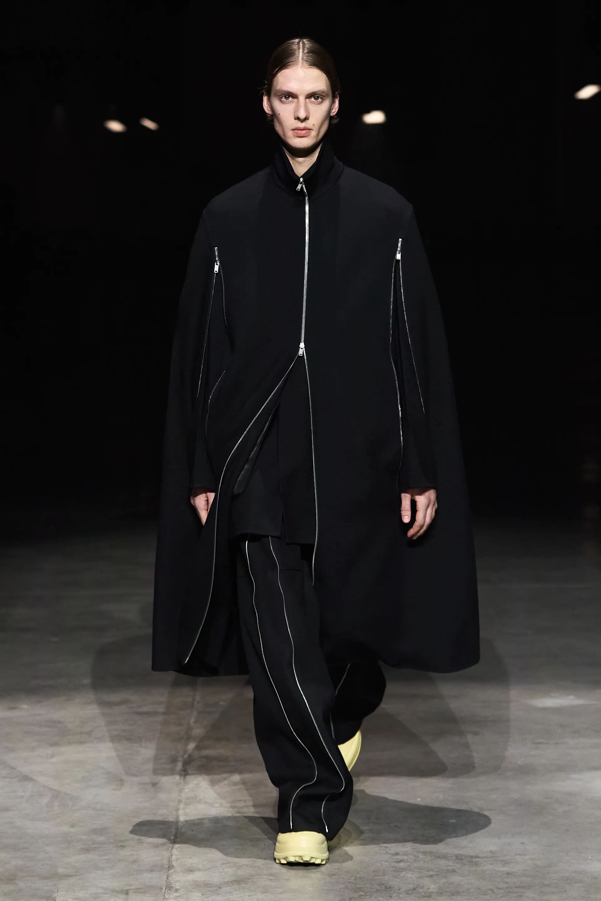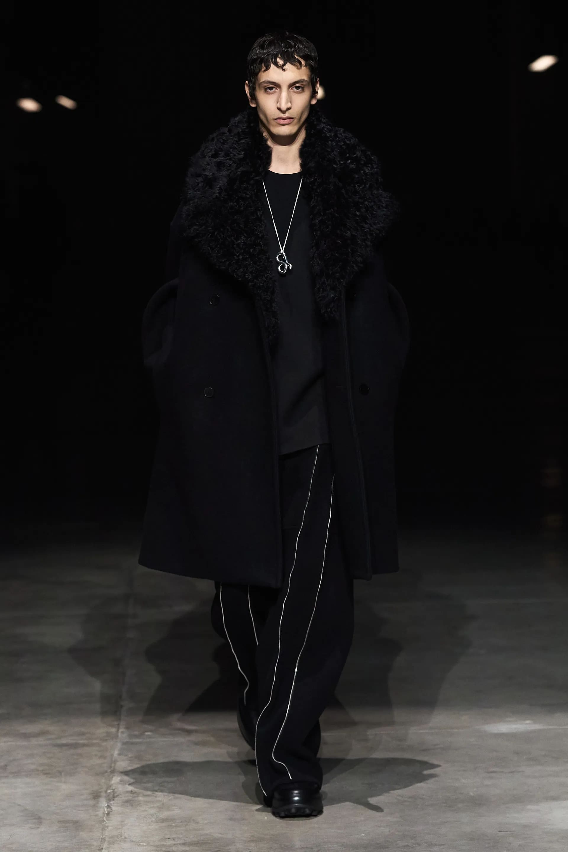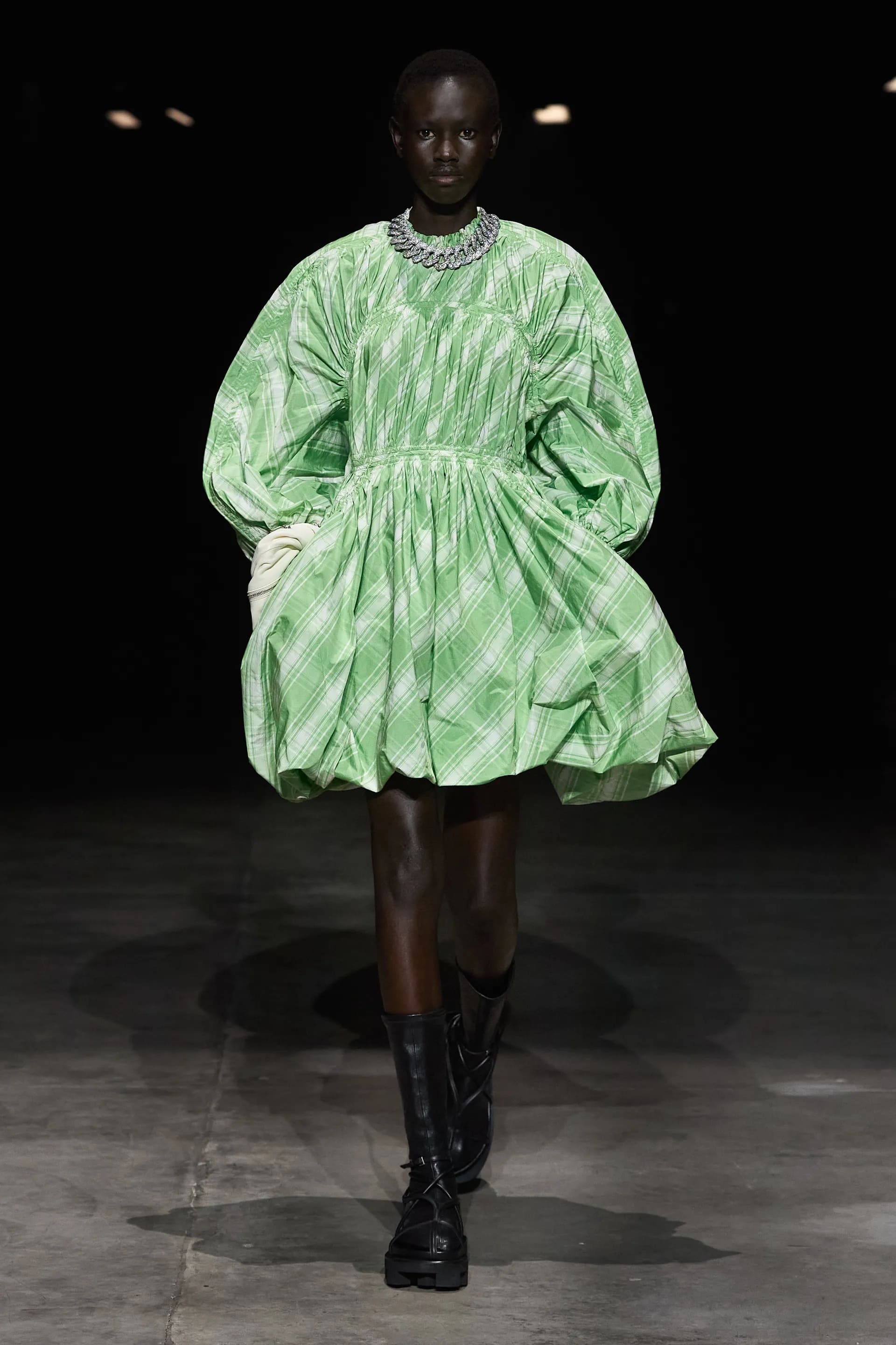 Показ відкривав досить незвичний для мінімалістичного Jil Sander лук: об’ємна біло-чорна байкерська куртка з великим горизонтальним лого та байкерські штани, ніби для гонок на Формулі-1. Яскравими елементами були червоні шкіряні рукавиці та бірюзові черевики на знаковому каблуці форми м’якого квадрату. Увесь образ доєднувала мішкувата сумка. Хоча, можливо, сюди не вистачало байкерського шолому.