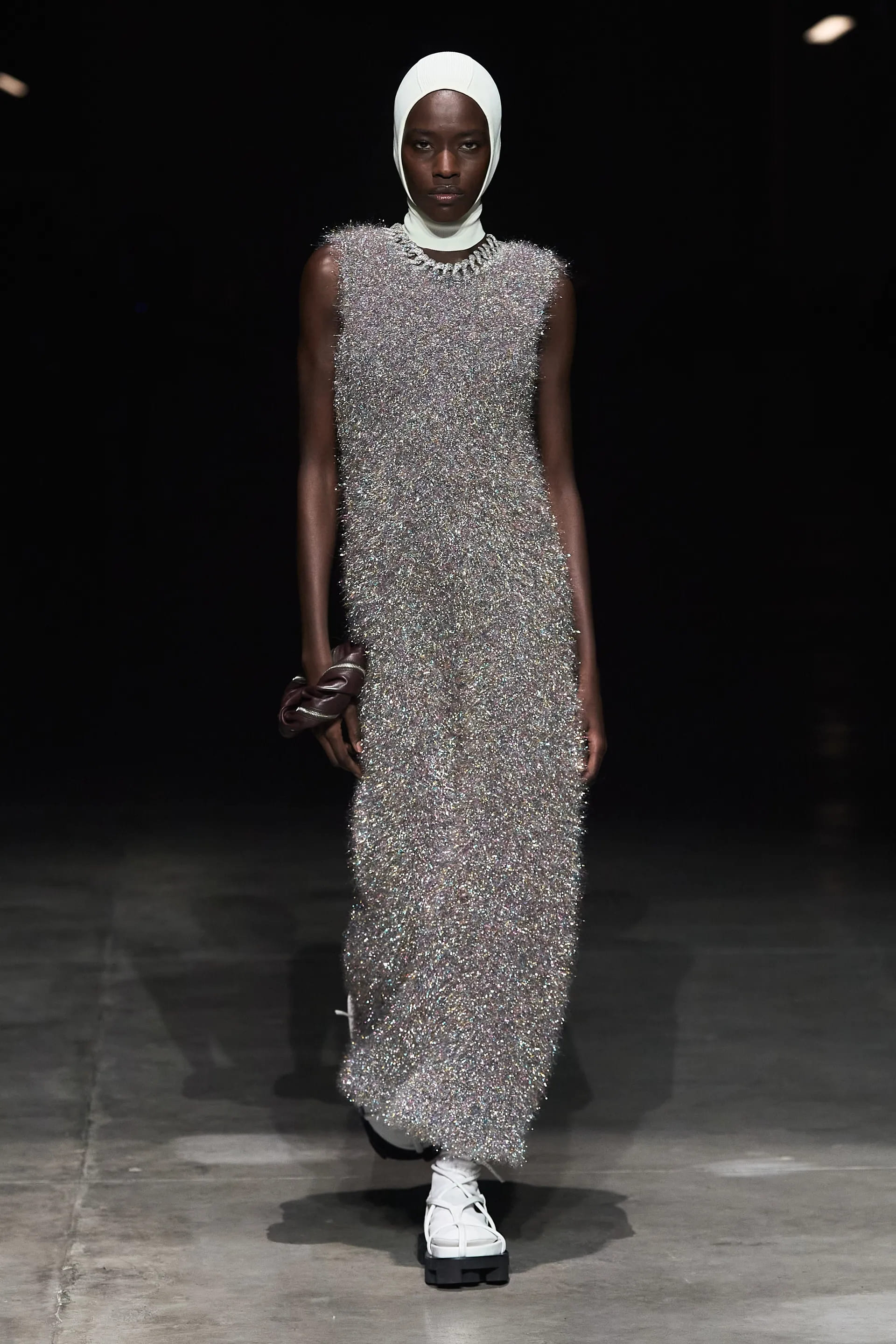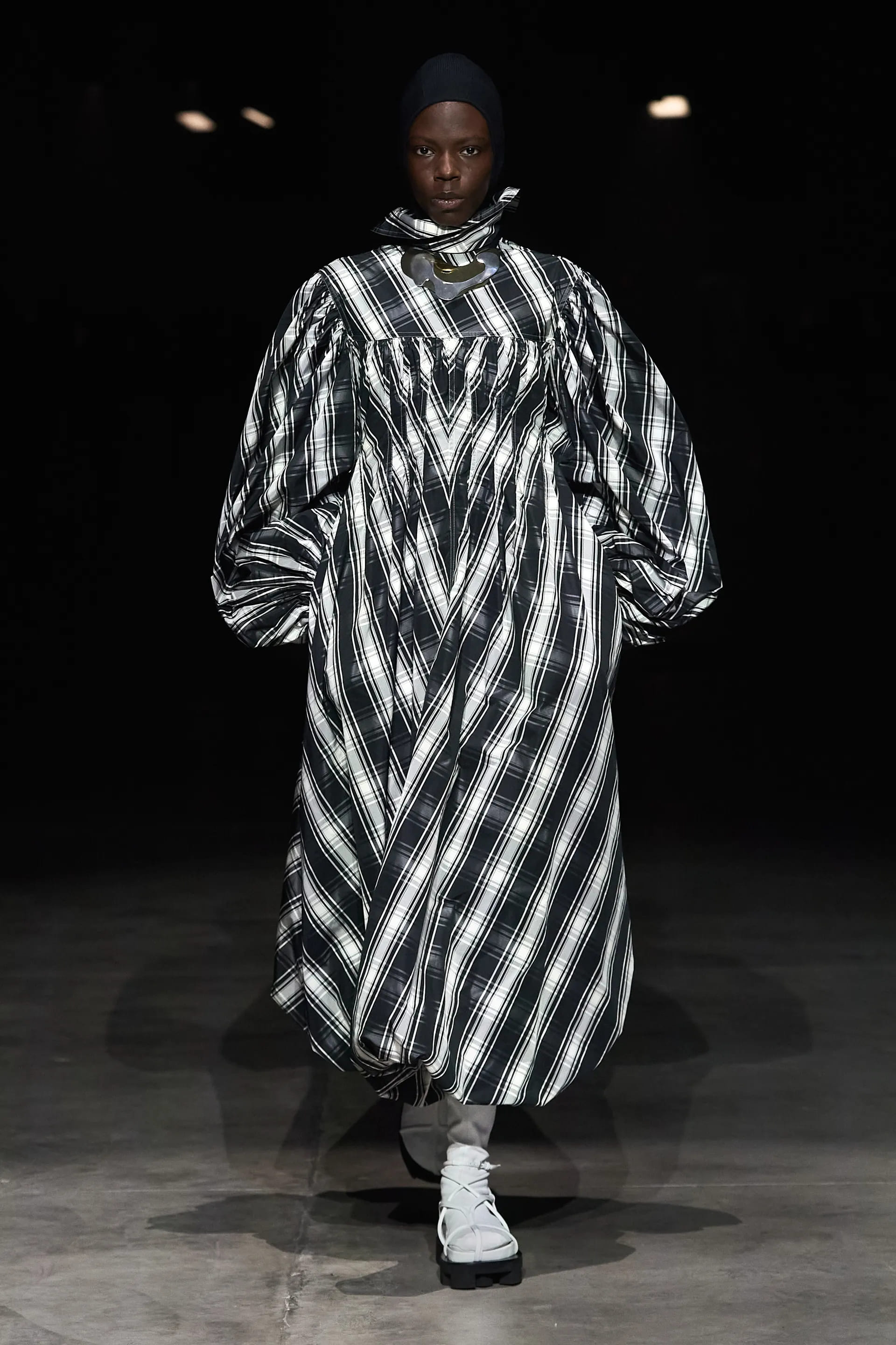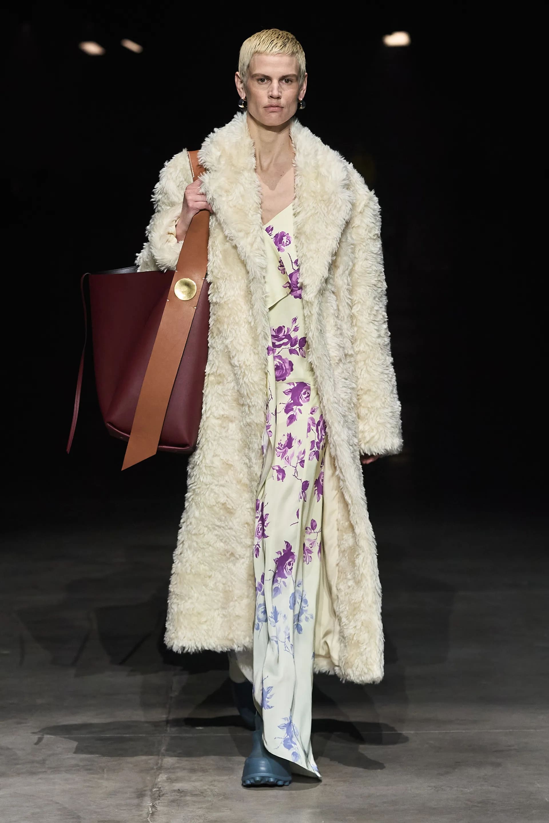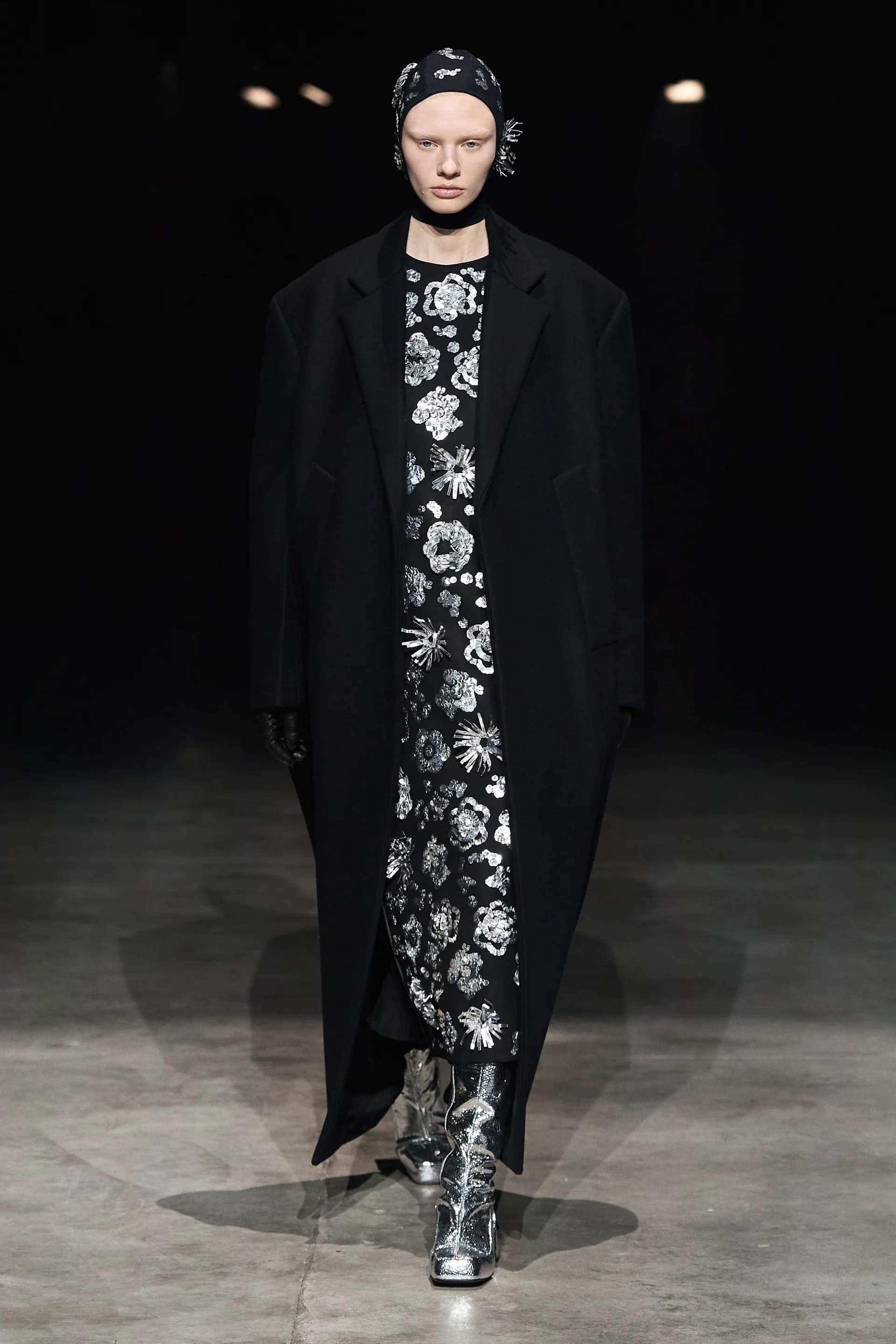 Показ відкривав досить незвичний для мінімалістичного Jil Sander лук: об’ємна біло-чорна байкерська куртка з великим горизонтальним лого та байкерські штани, ніби для гонок на Формулі-1. Яскравими елементами були червоні шкіряні рукавиці та бірюзові черевики на знаковому каблуці форми м’якого квадрату. Увесь образ доєднувала мішкувата сумка. Хоча, можливо, сюди не вистачало байкерського шолому.