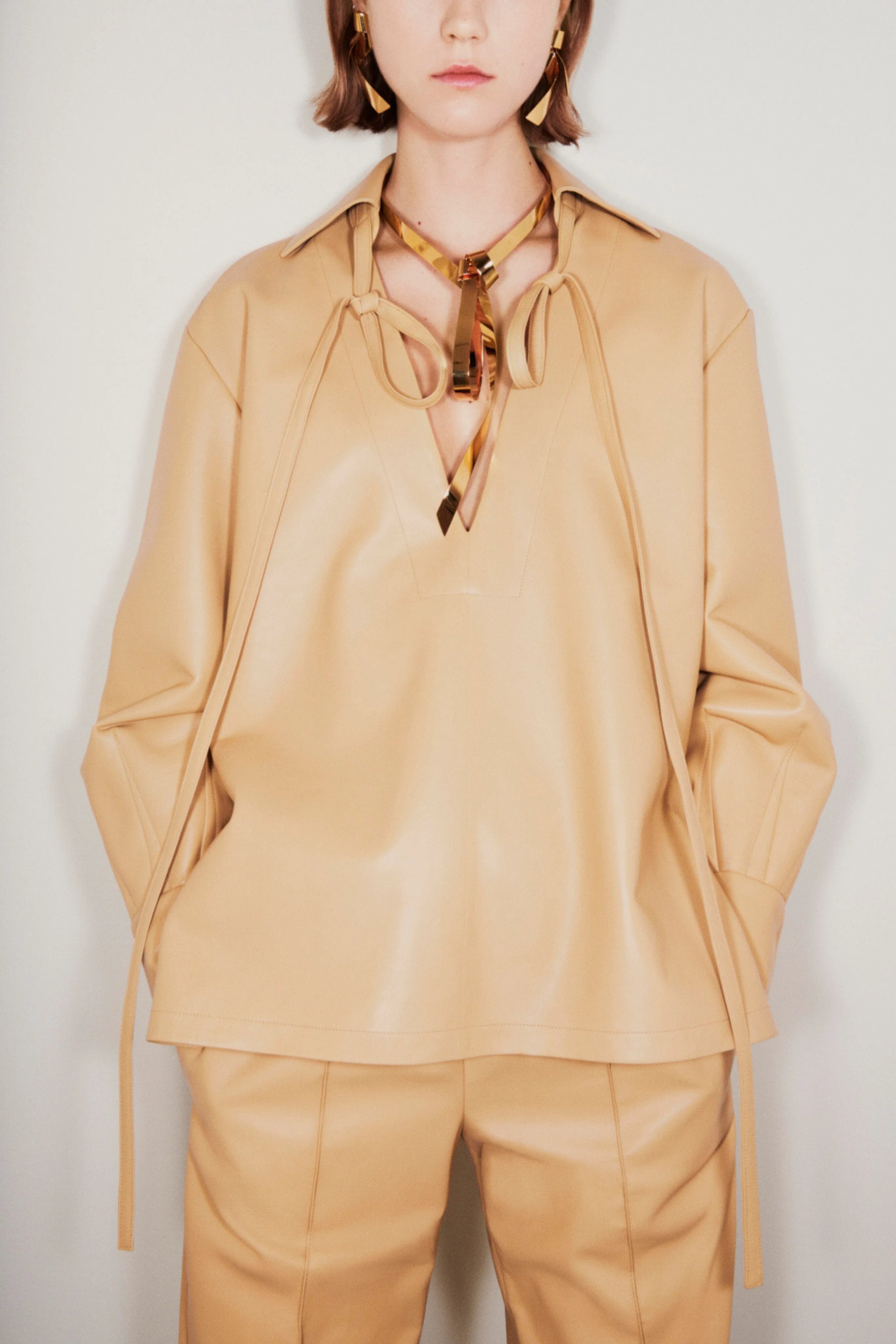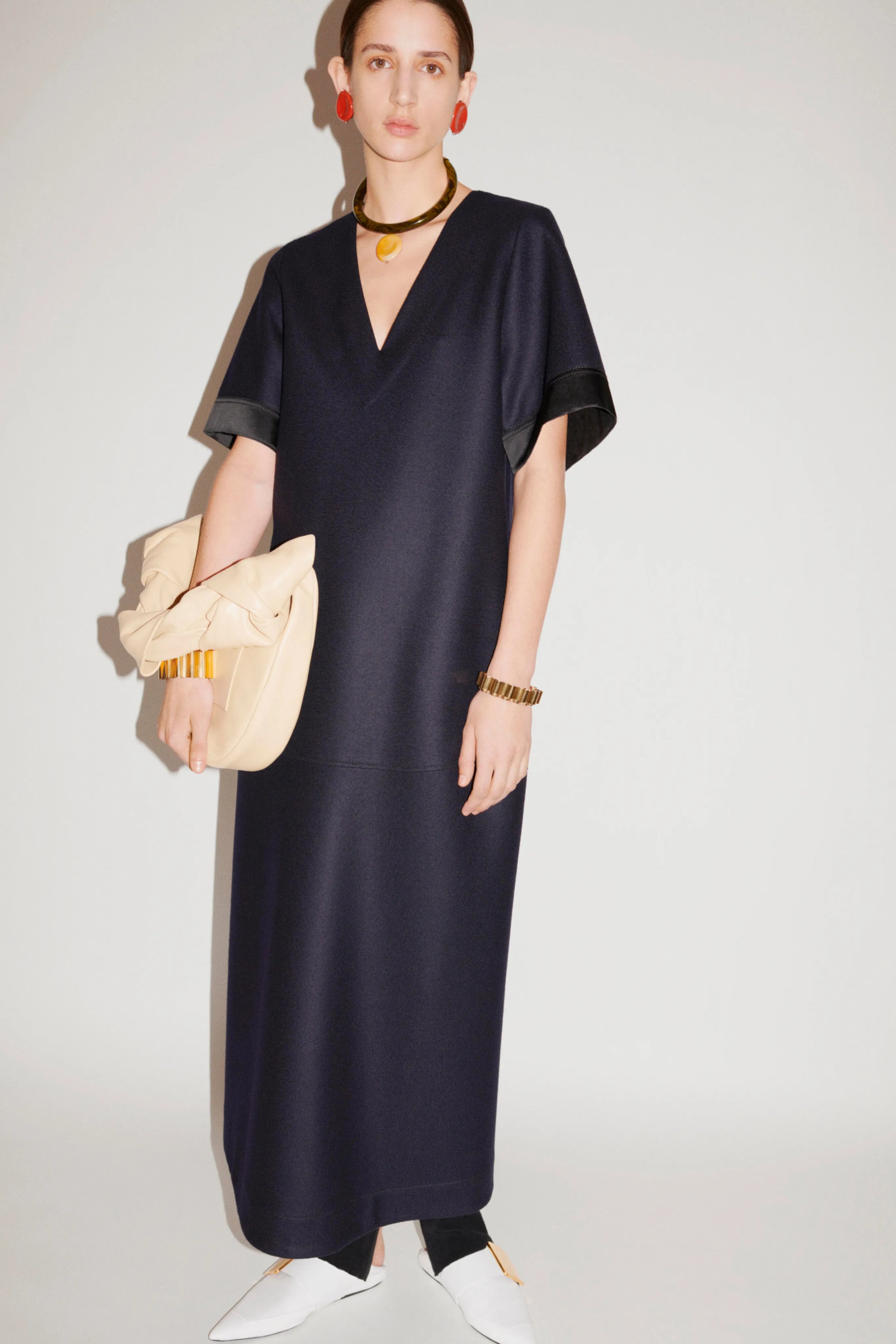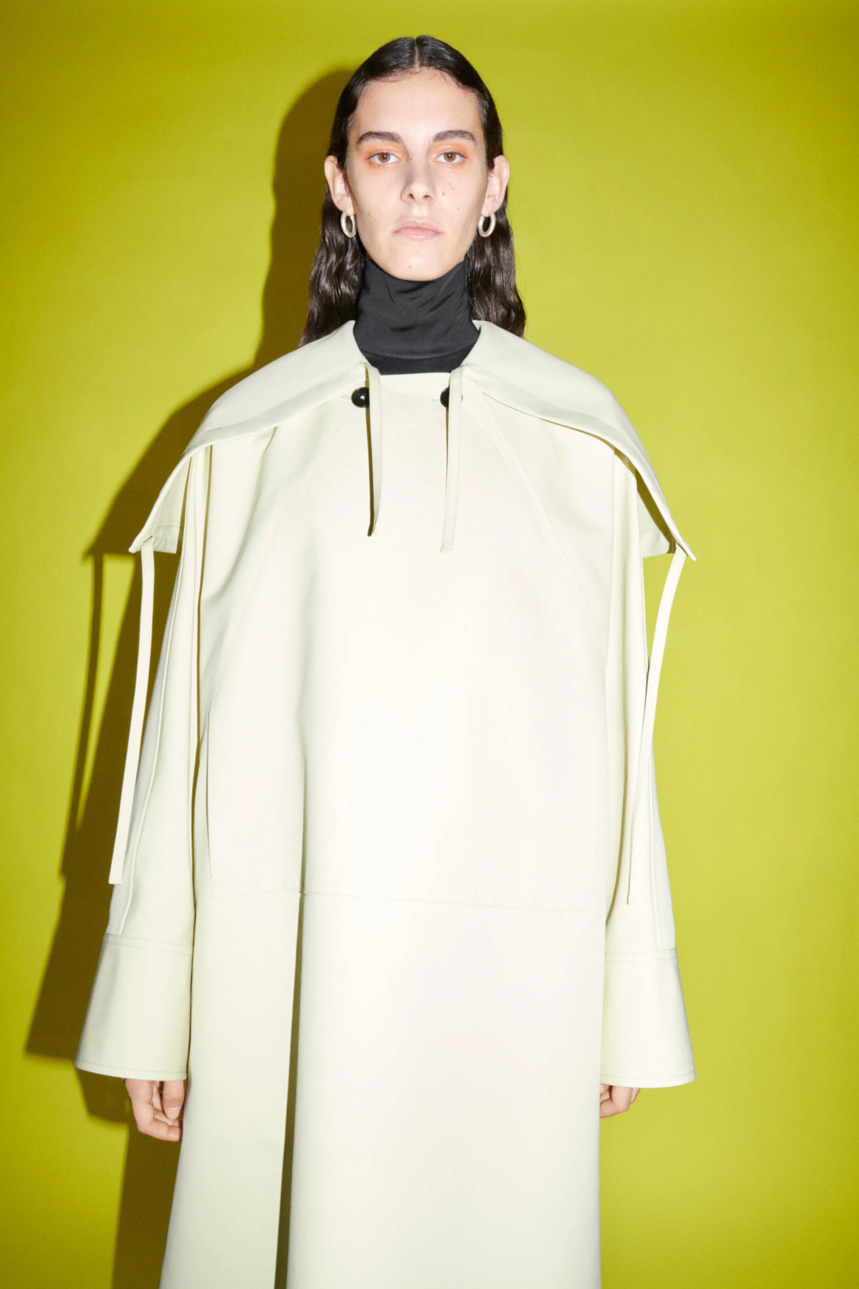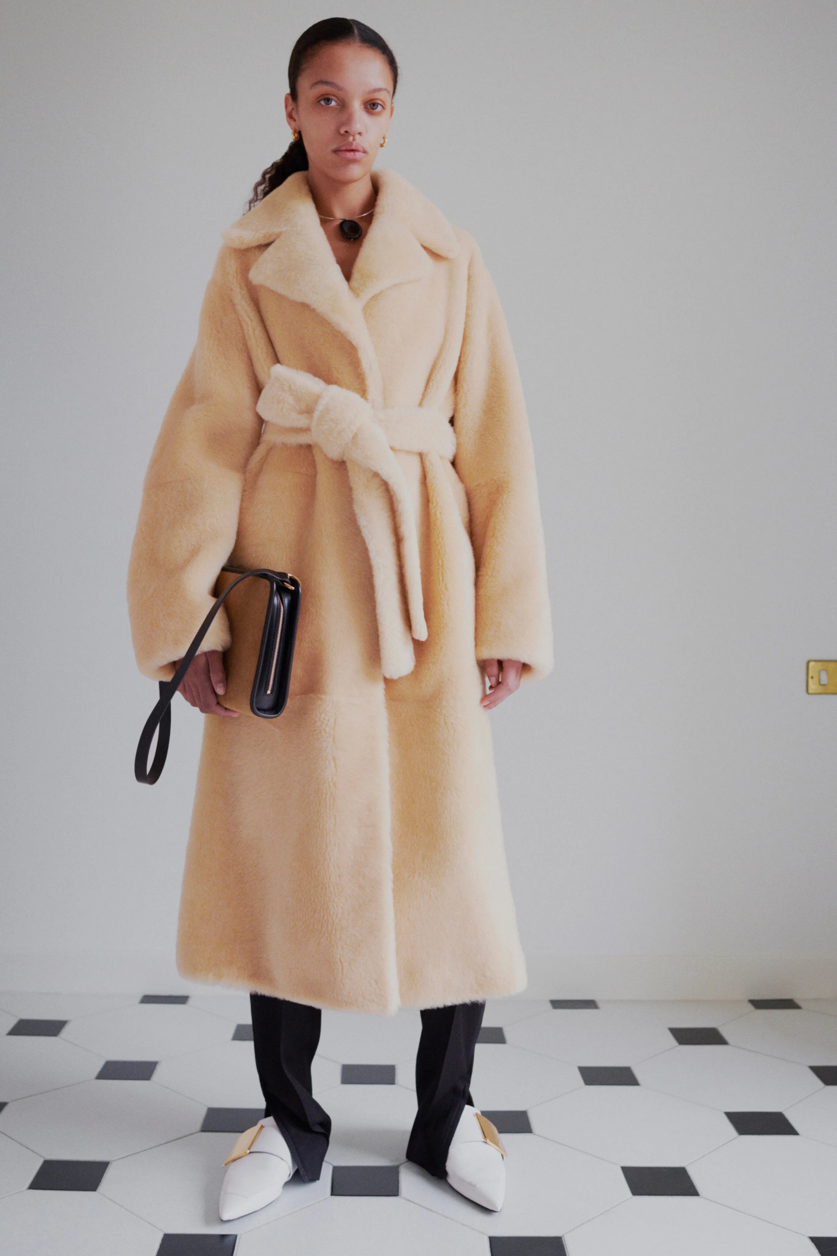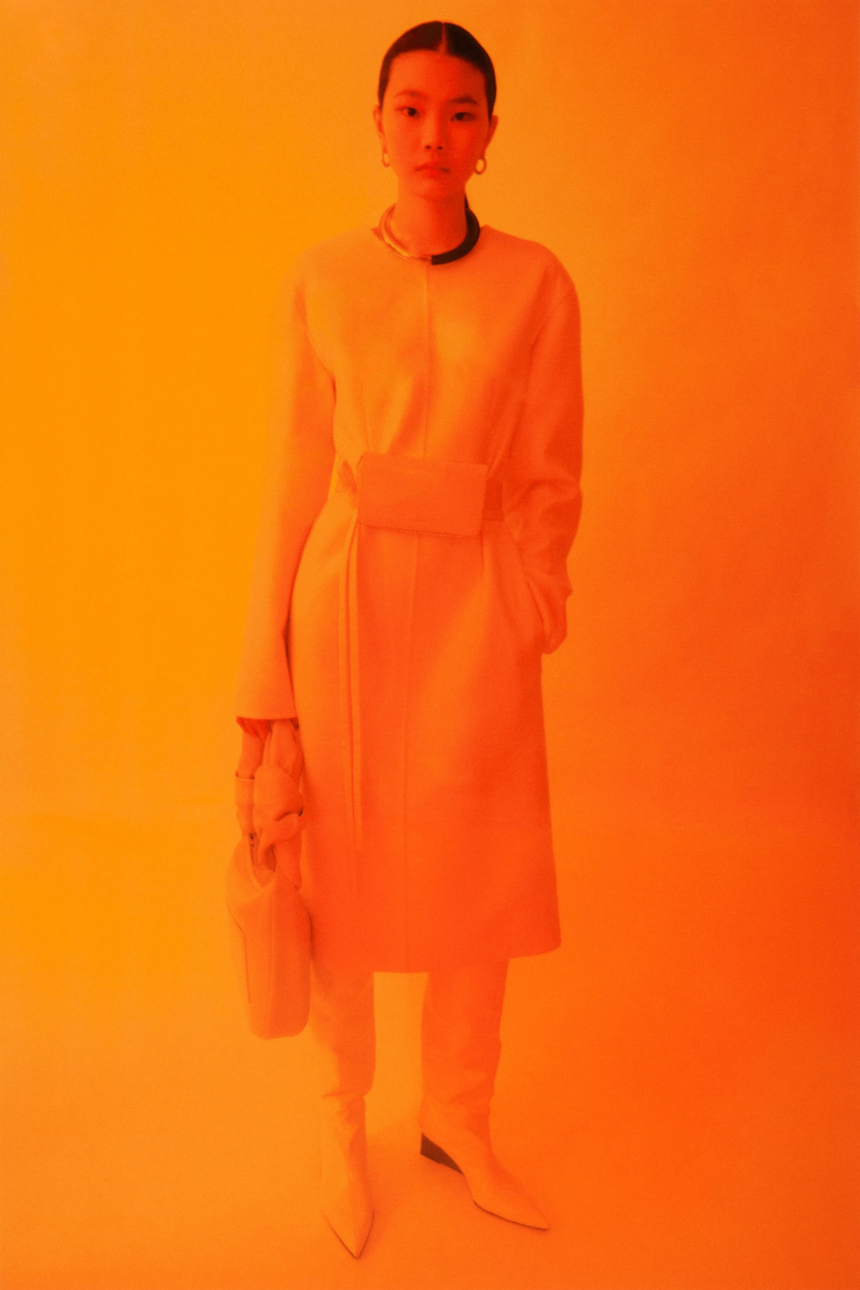 Так, коллекция будущего сезона выглядит прагматично и элегантно одновременно. В неё вошли анораки с капюшонами, парки и удлиненные блузы с юбками миди — всё в пастельных тонах. Лейтмотивом стал заостренный отложной ворот на платьях и блузах. Пижамные костюмы хвойного оттенка, землистые пальто и карамельные шубы дополняют вместительные объемные клатчи и геометричные клатчи-несессеры.