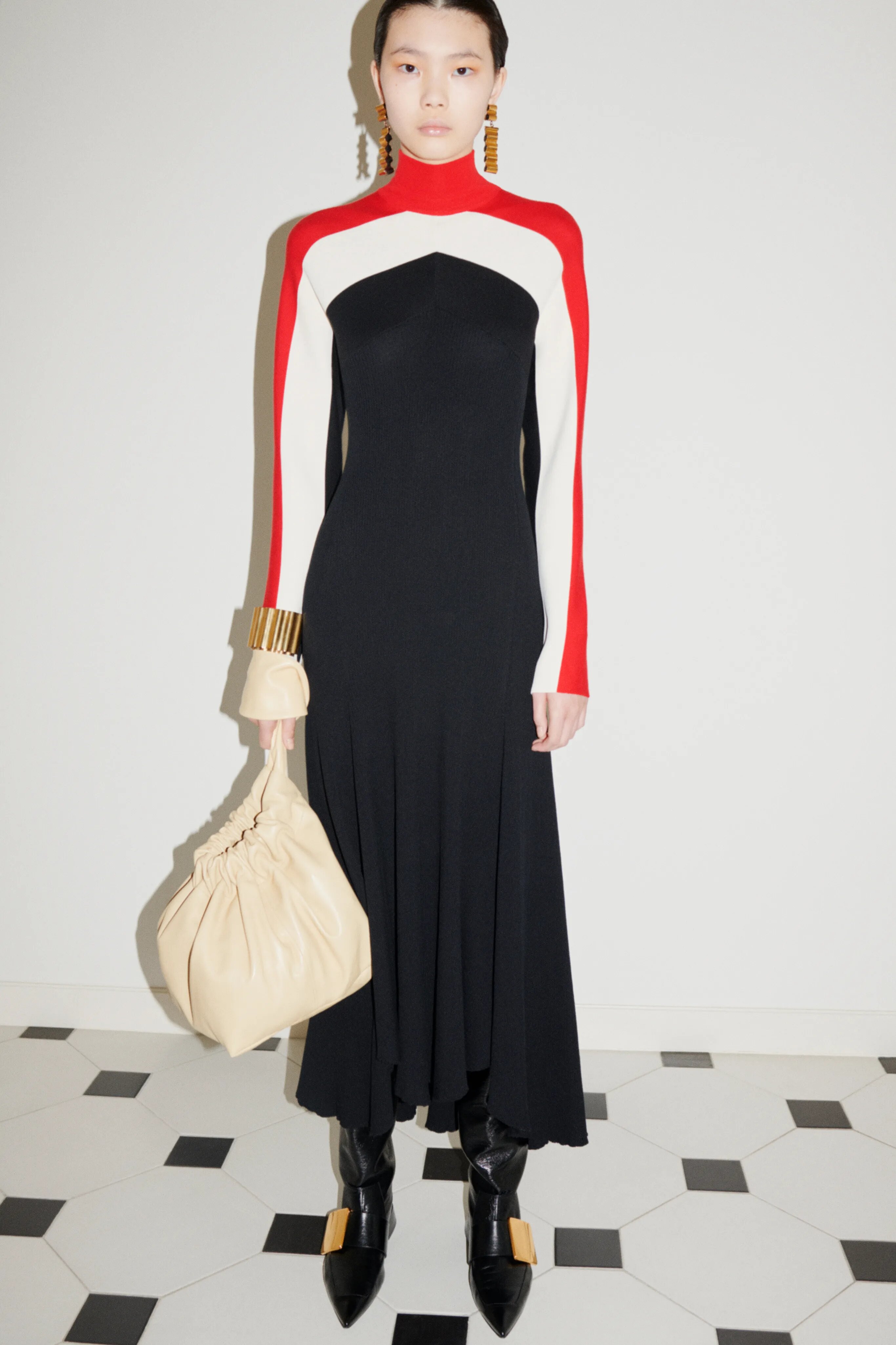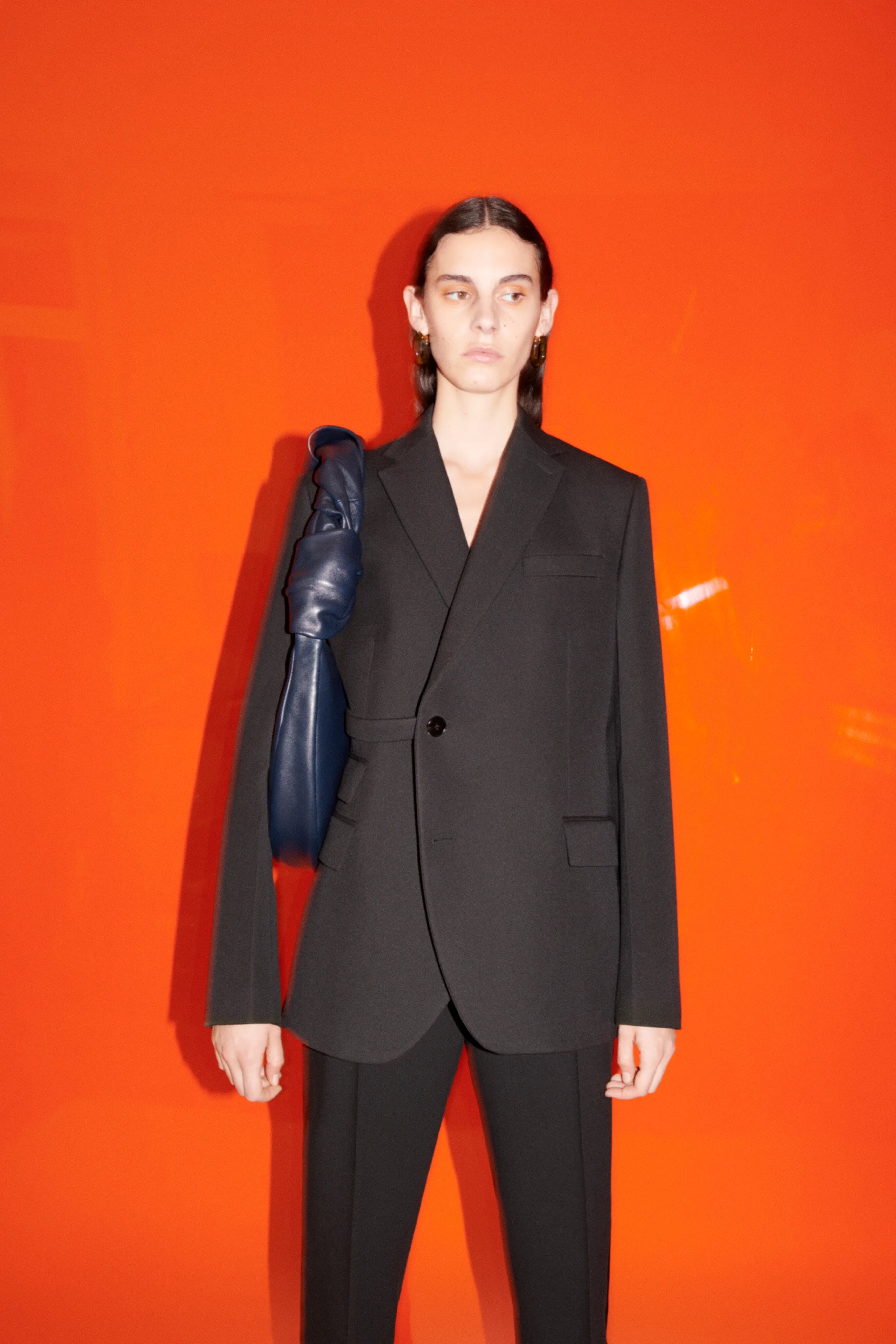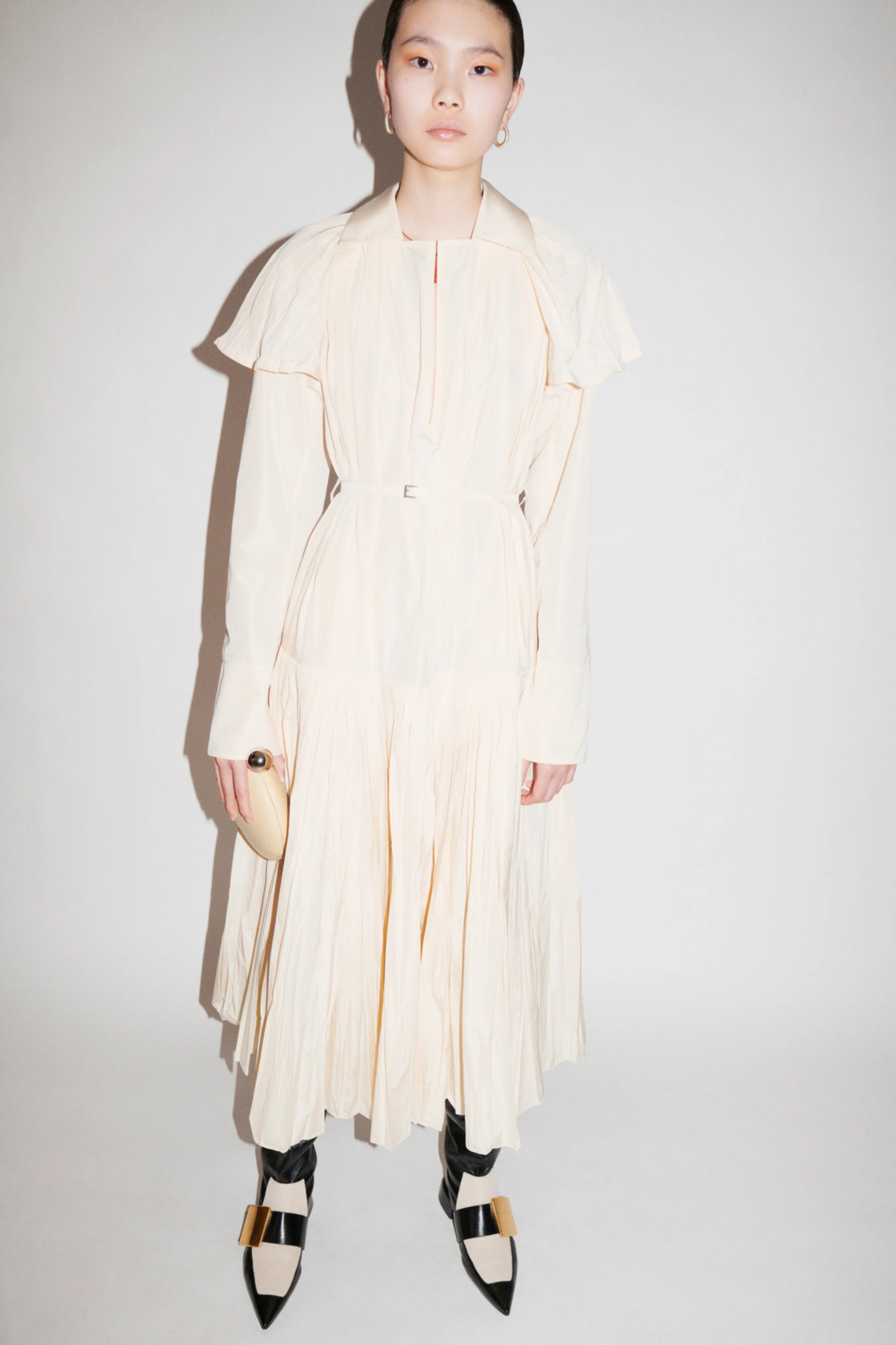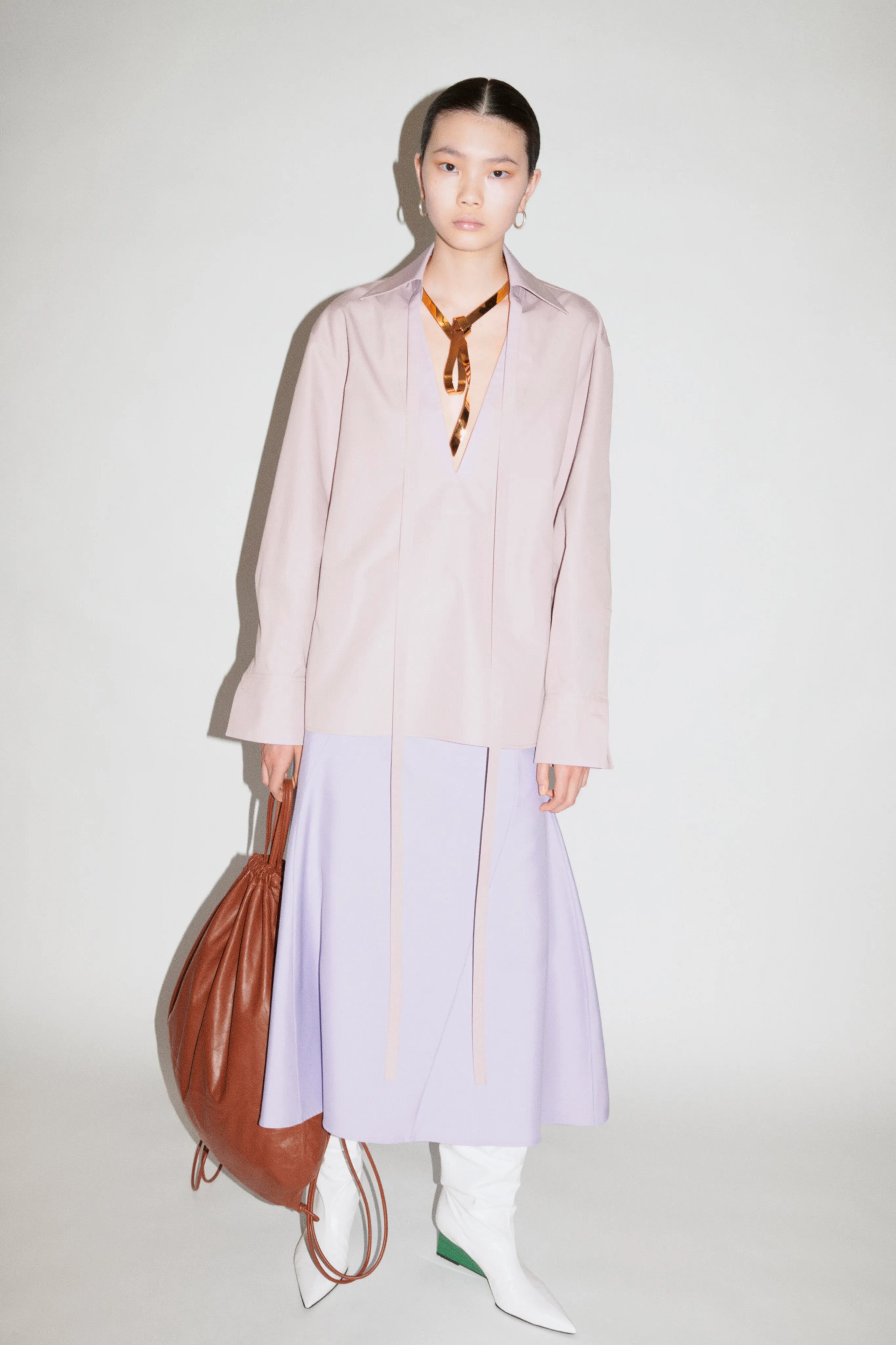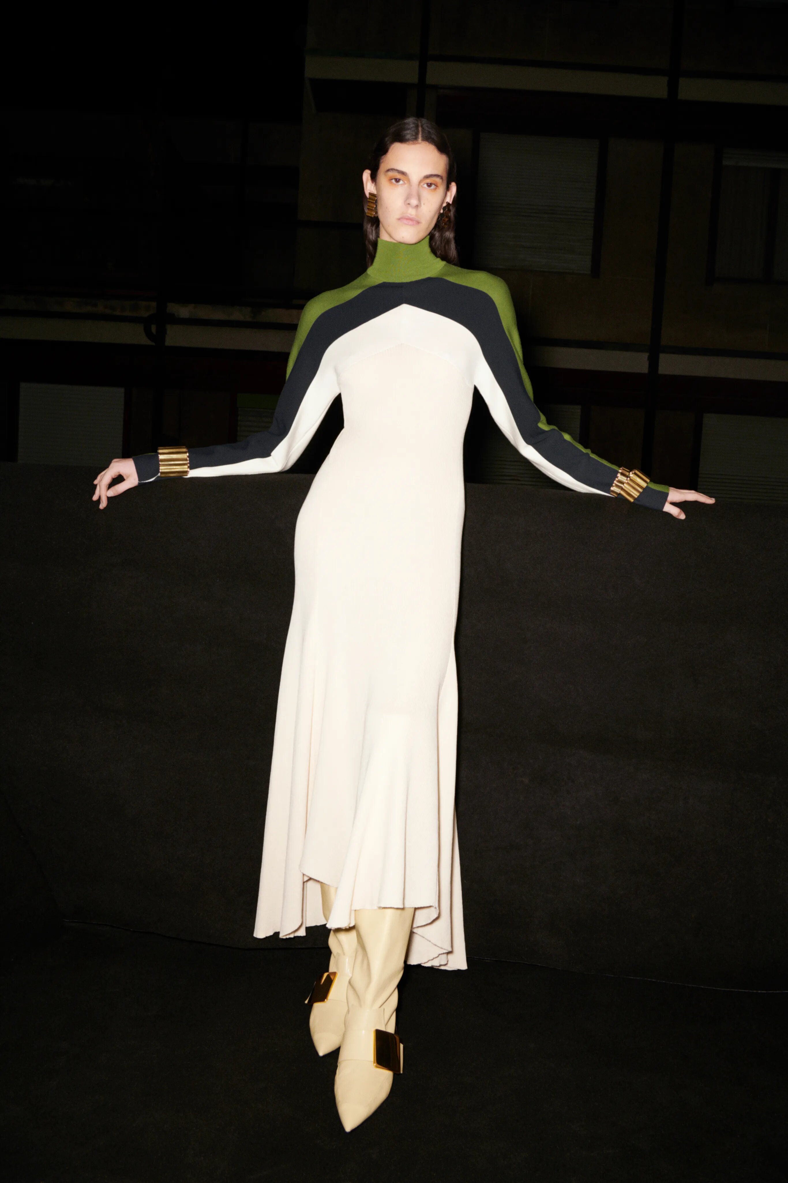 Так, коллекция будущего сезона выглядит прагматично и элегантно одновременно. В неё вошли анораки с капюшонами, парки и удлиненные блузы с юбками миди — всё в пастельных тонах. Лейтмотивом стал заостренный отложной ворот на платьях и блузах. Пижамные костюмы хвойного оттенка, землистые пальто и карамельные шубы дополняют вместительные объемные клатчи и геометричные клатчи-несессеры.