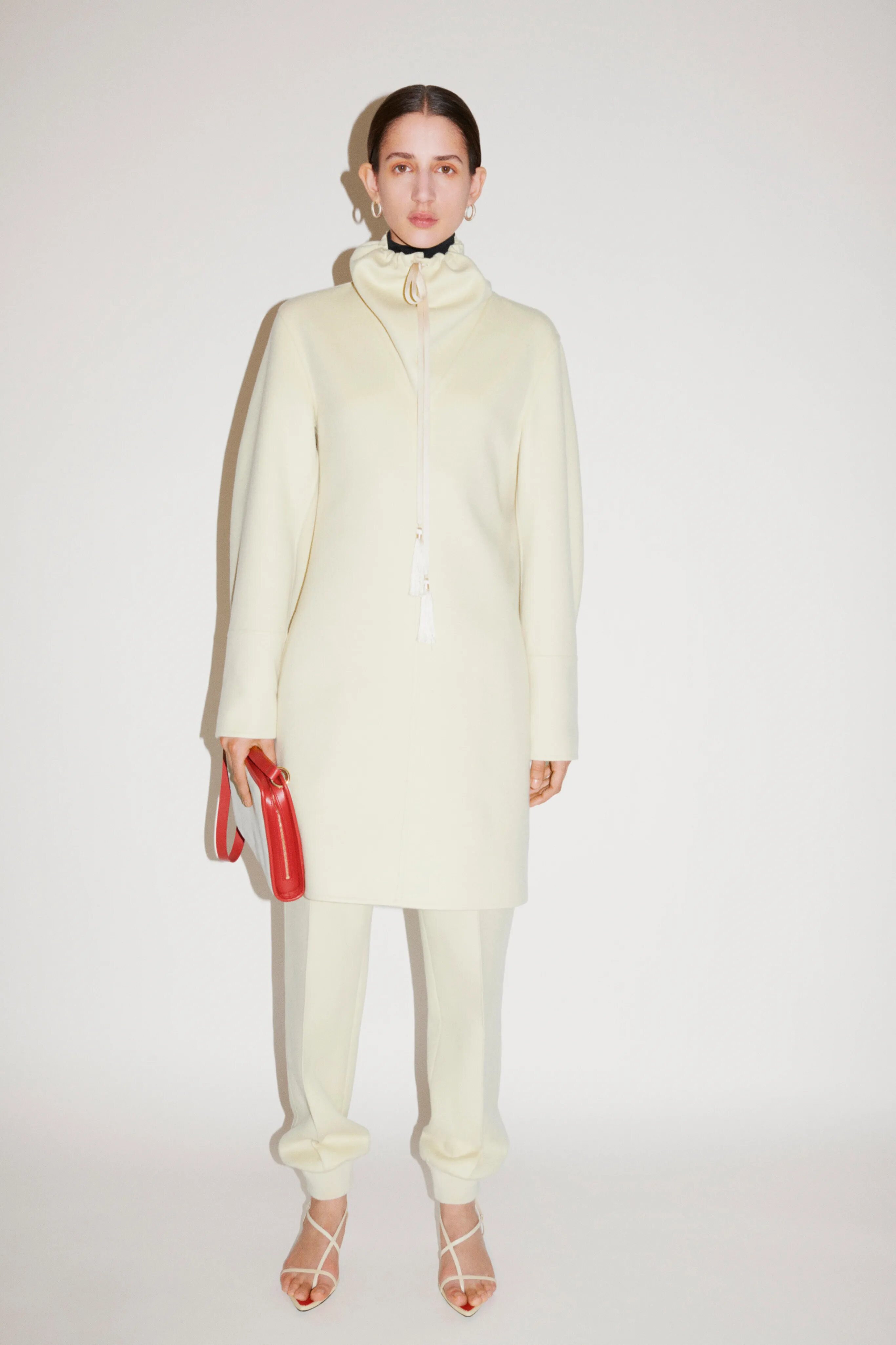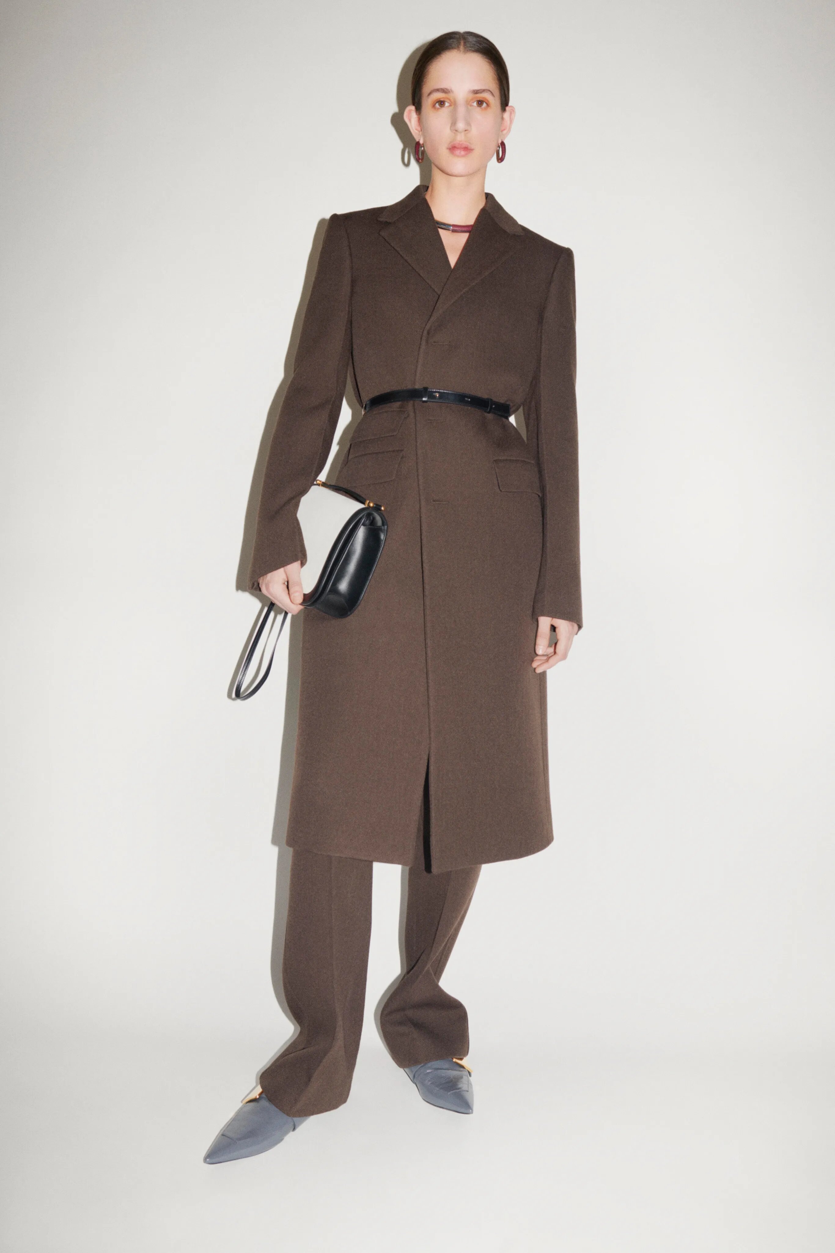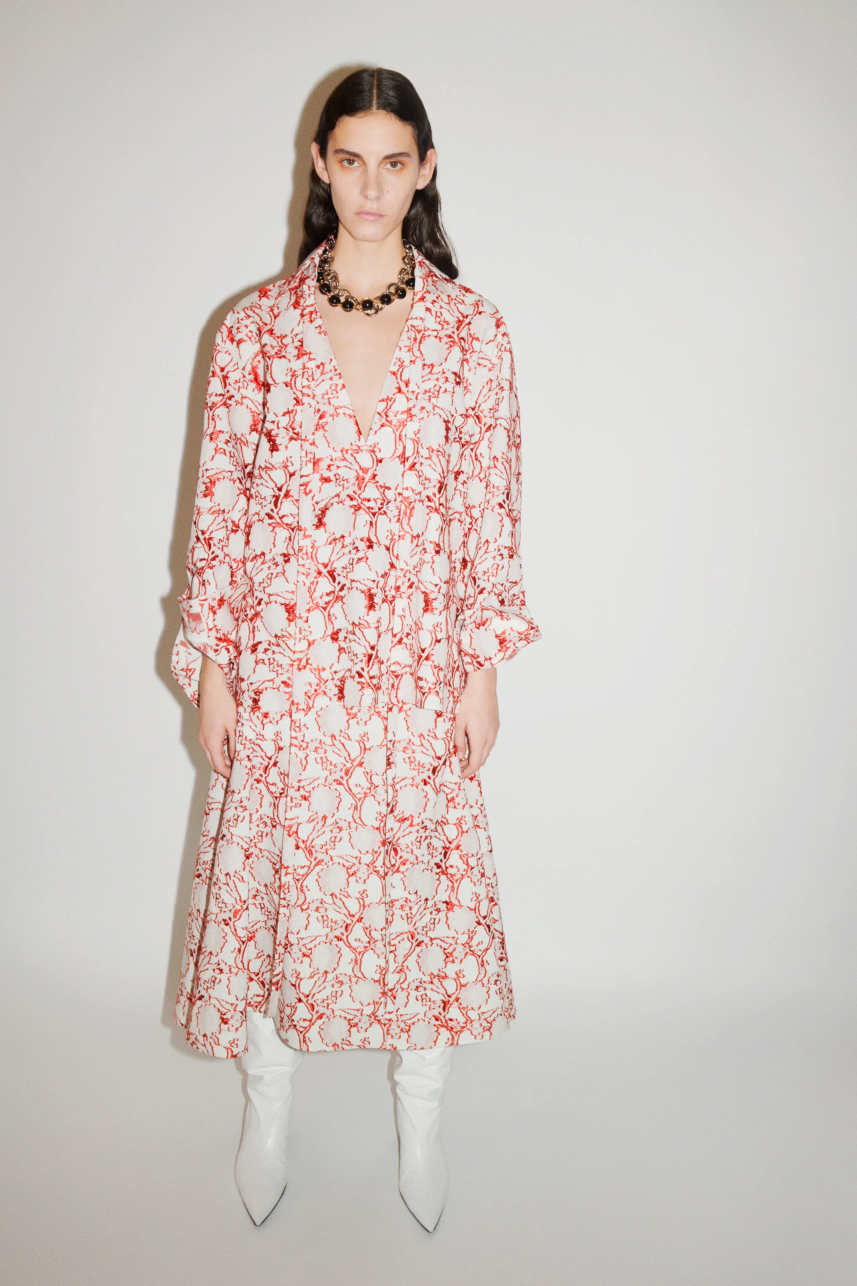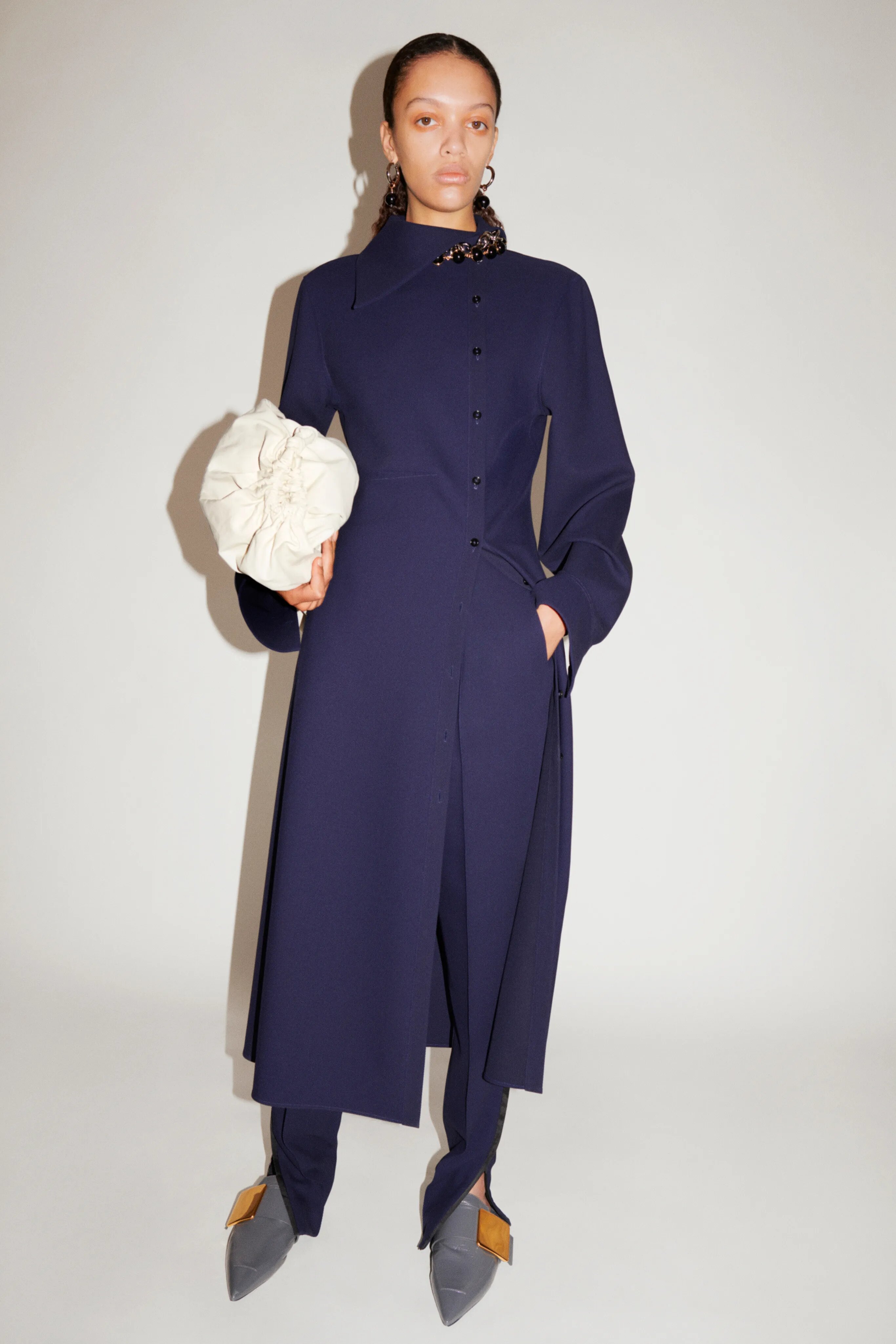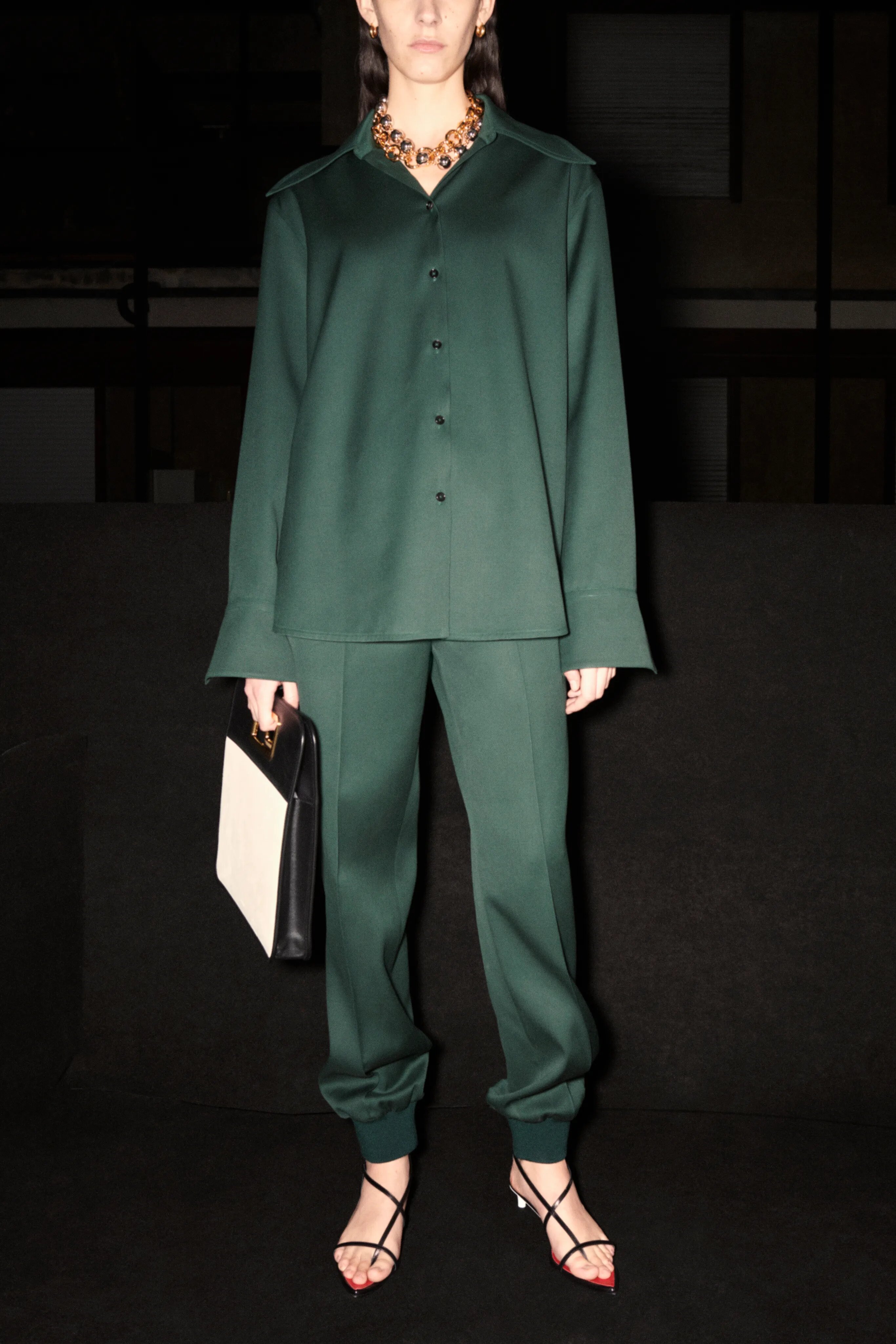Так, коллекция будущего сезона выглядит прагматично и элегантно одновременно. В неё вошли анораки с капюшонами, парки и удлиненные блузы с юбками миди — всё в пастельных тонах. Лейтмотивом стал заостренный отложной ворот на платьях и блузах. Пижамные костюмы хвойного оттенка, землистые пальто и карамельные шубы дополняют вместительные объемные клатчи и геометричные клатчи-несессеры.