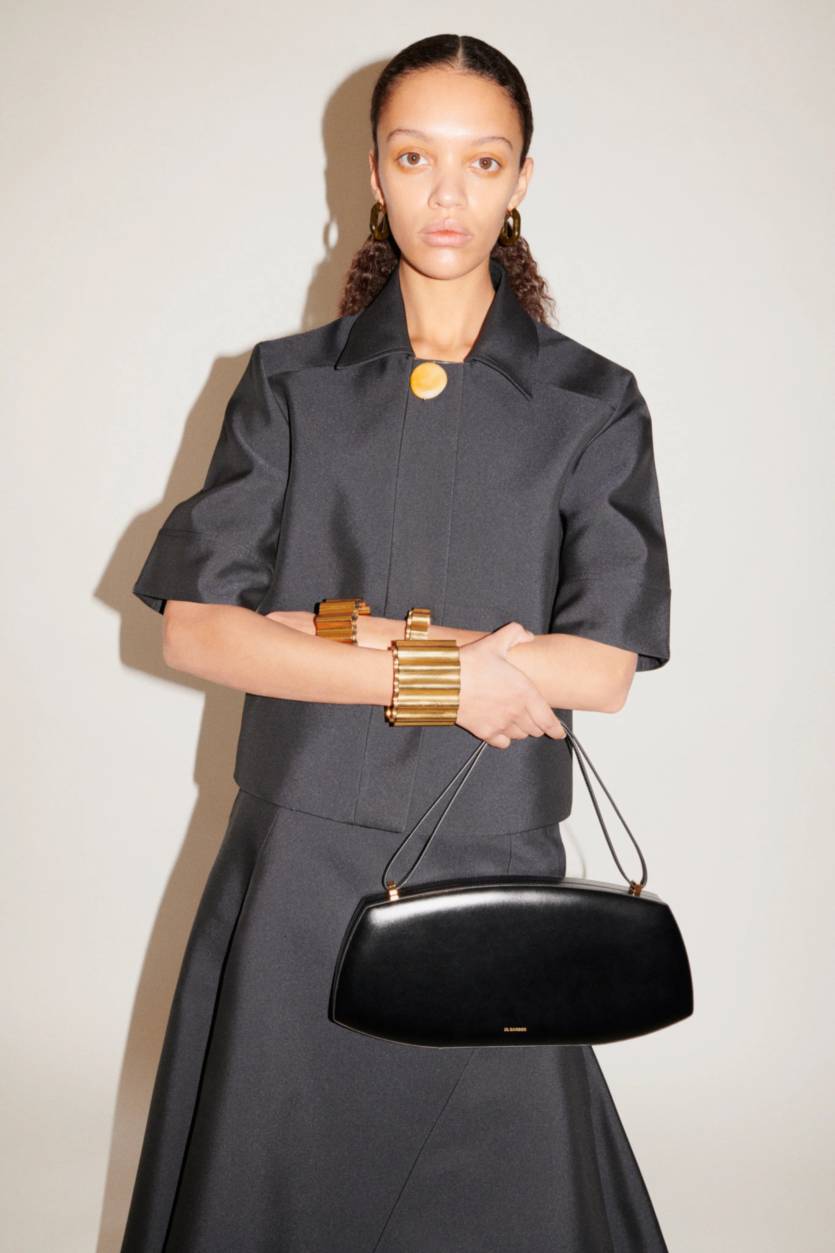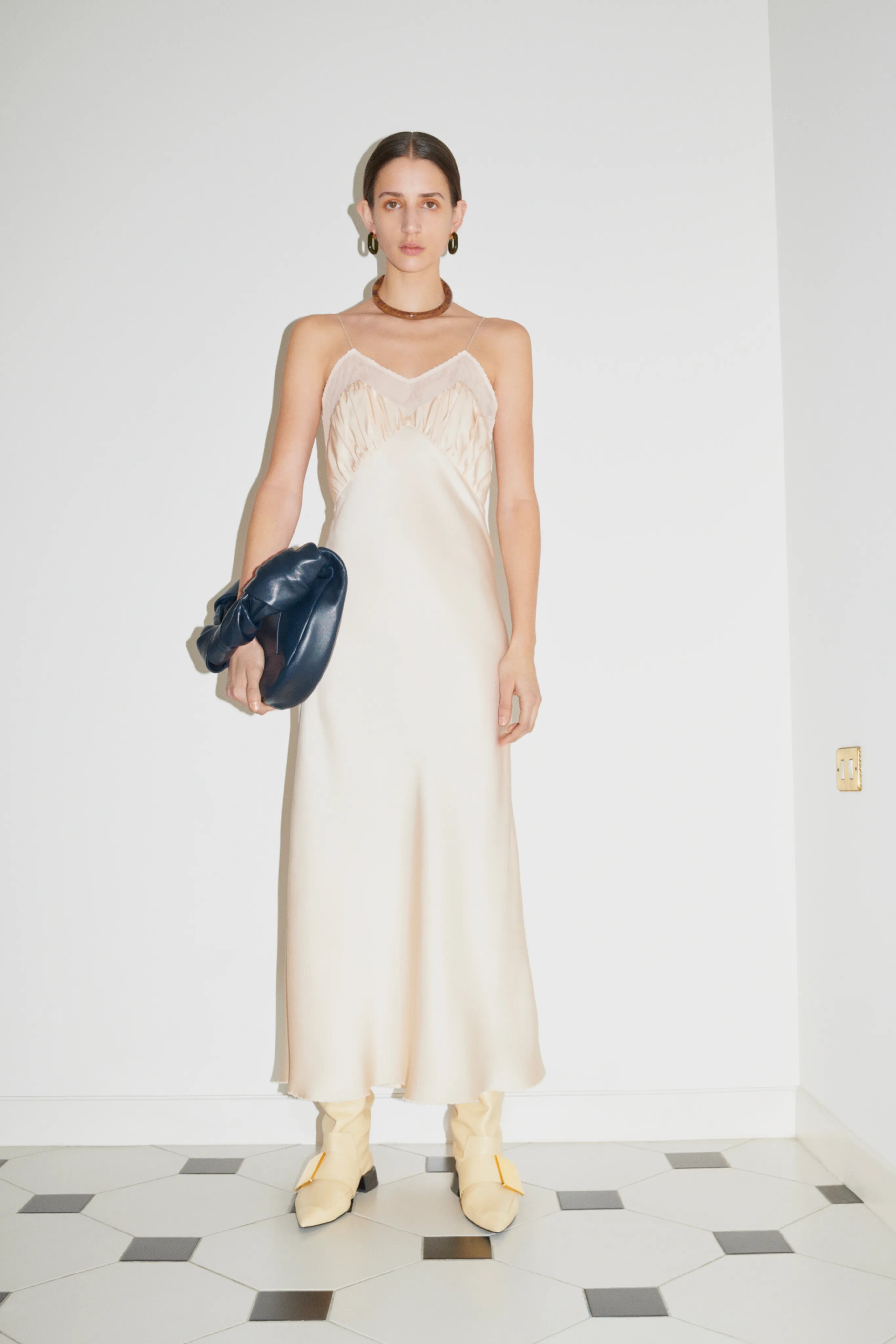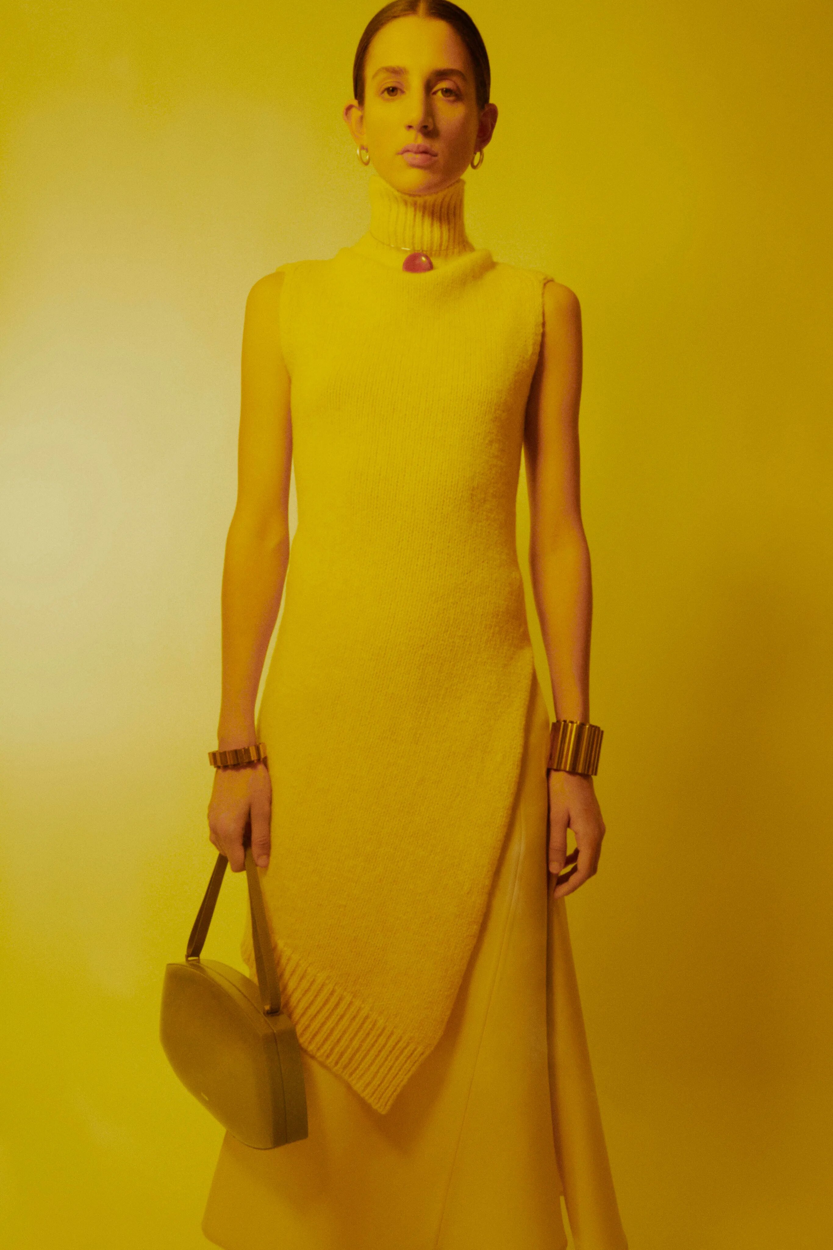 Украшения коллекции — колье в виде золотых лент и из крупных бусин, монолитные браслеты и серьги. Вечерняя мода также размыта утилитарными повседневными красками: платье с пелериной дополняет яркий лонгслив, а шелковые брюки идут в паре с теплым свитером. И напротив, поверх вязаного гольфа Мейер предлагает носить парку из сатина. Баланс между простотой, роскошью, торжественностью и комфортом дизайнер выдержал в точных пропорциях.