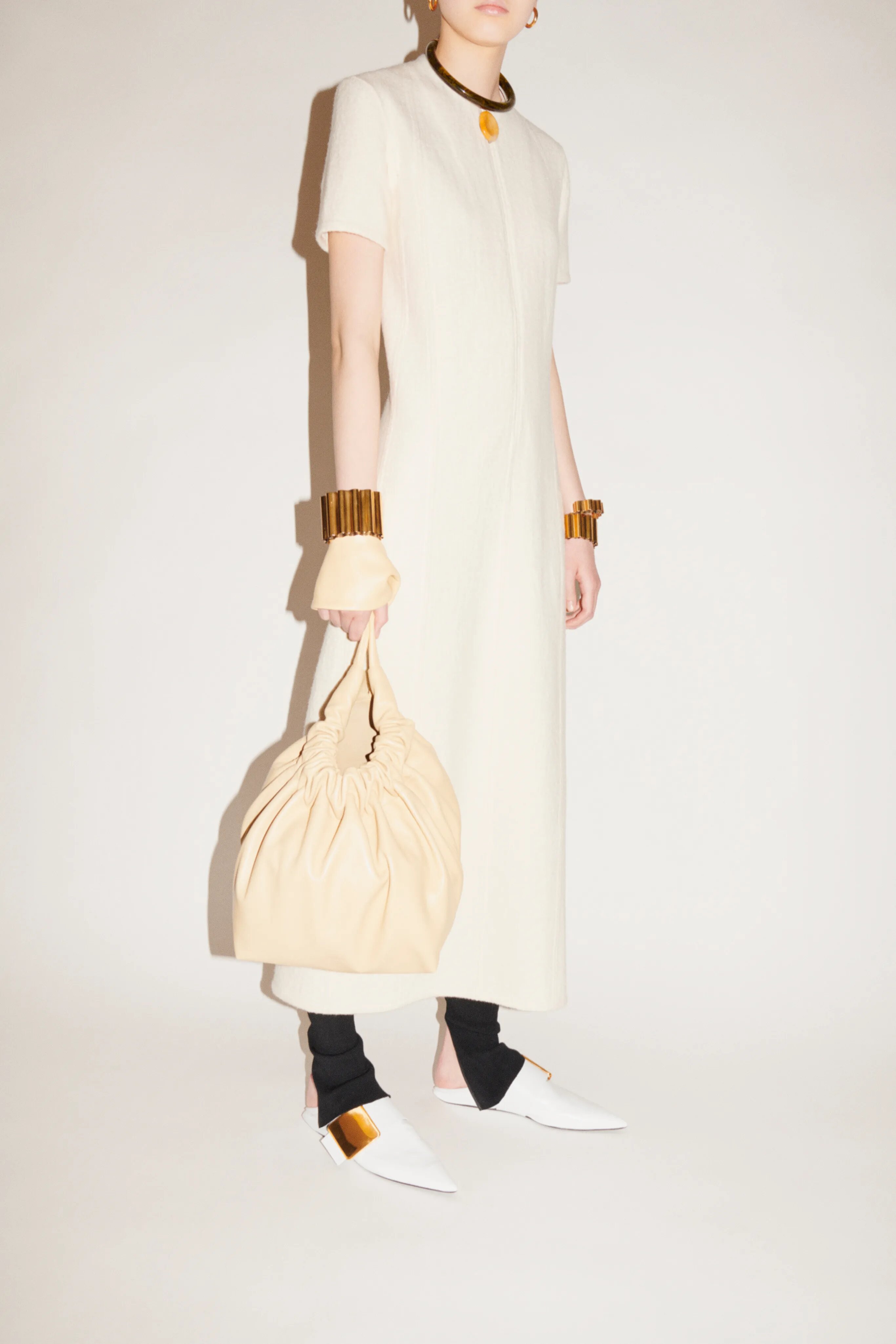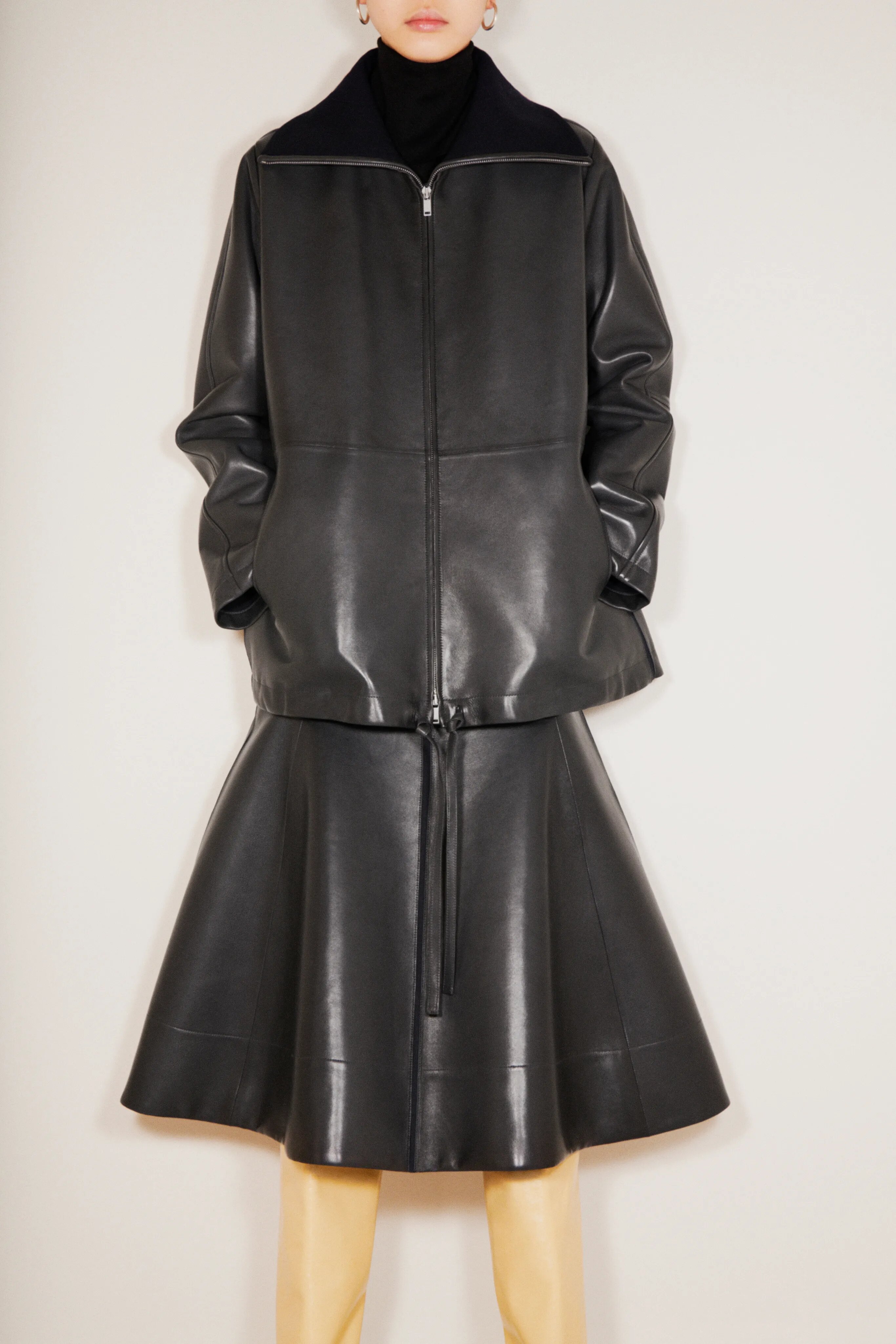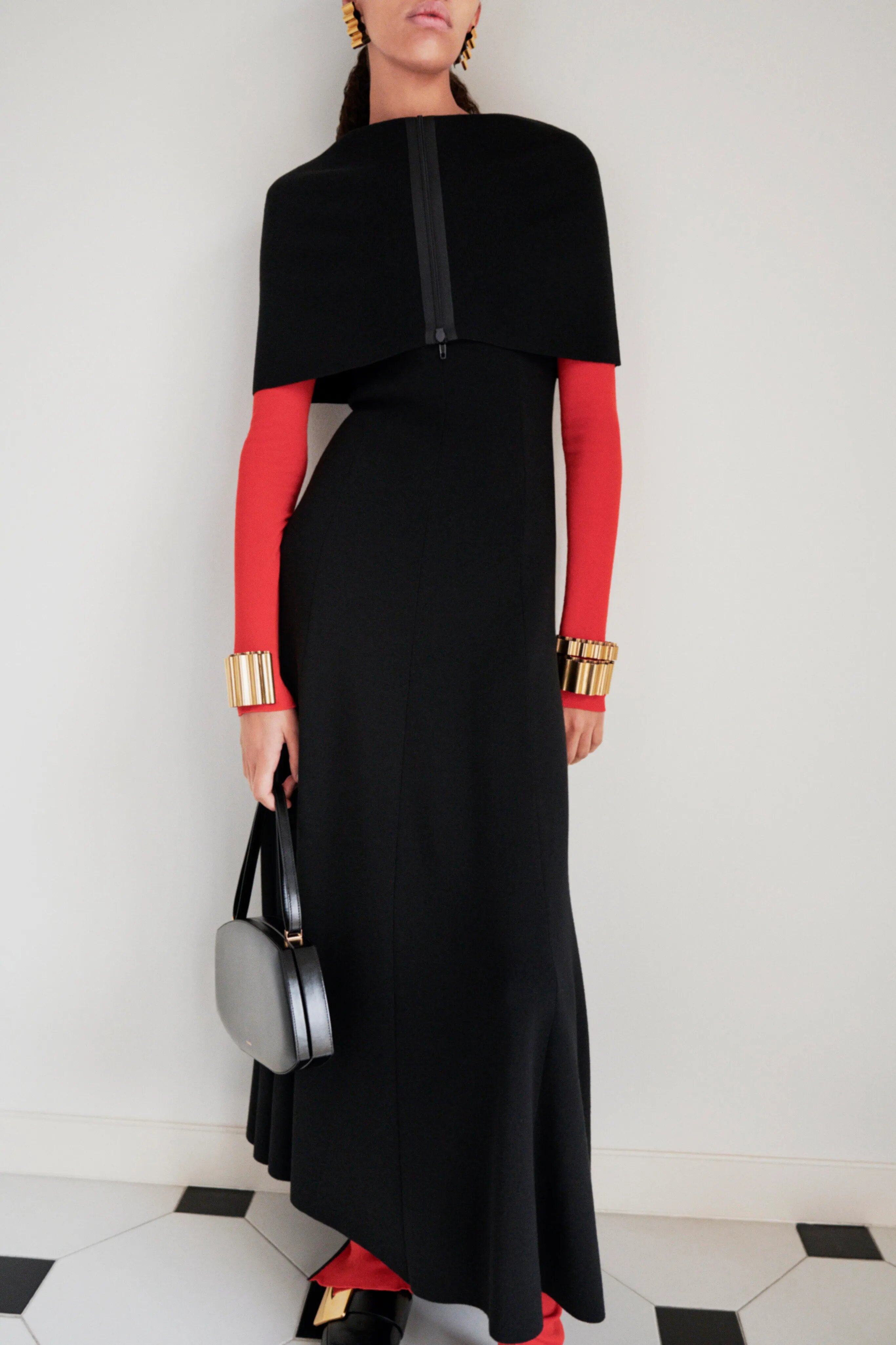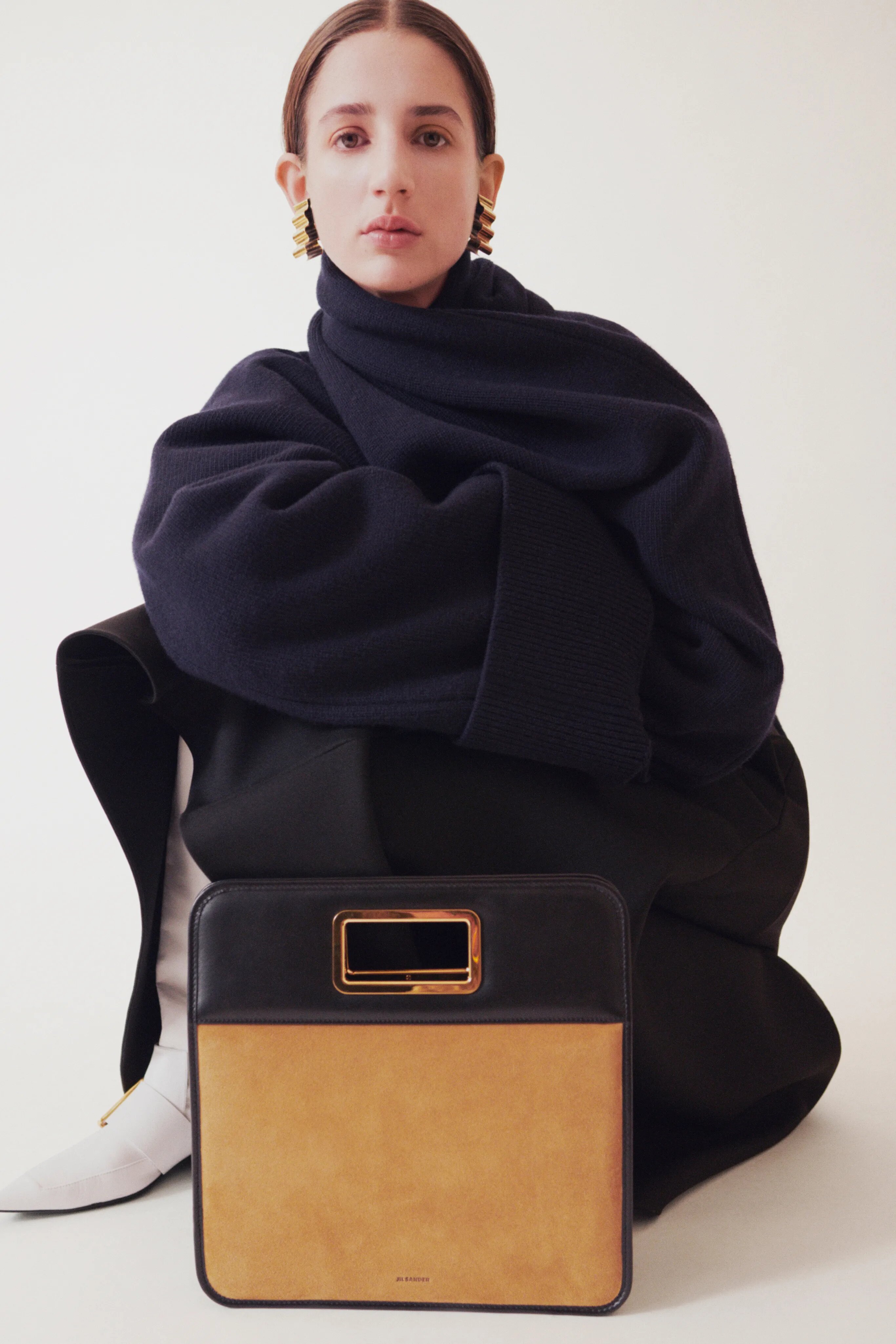 Украшения коллекции — колье в виде золотых лент и из крупных бусин, монолитные браслеты и серьги. Вечерняя мода также размыта утилитарными повседневными красками: платье с пелериной дополняет яркий лонгслив, а шелковые брюки идут в паре с теплым свитером. И напротив, поверх вязаного гольфа Мейер предлагает носить парку из сатина. Баланс между простотой, роскошью, торжественностью и комфортом дизайнер выдержал в точных пропорциях.