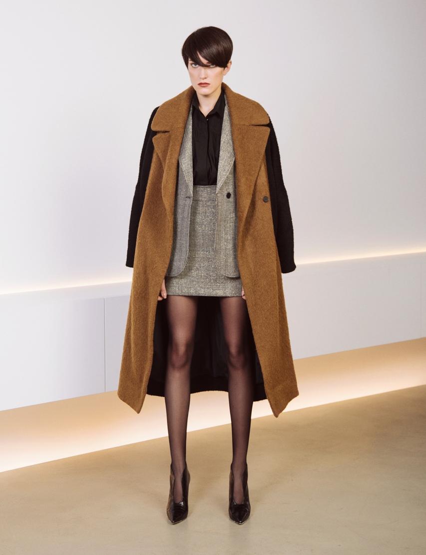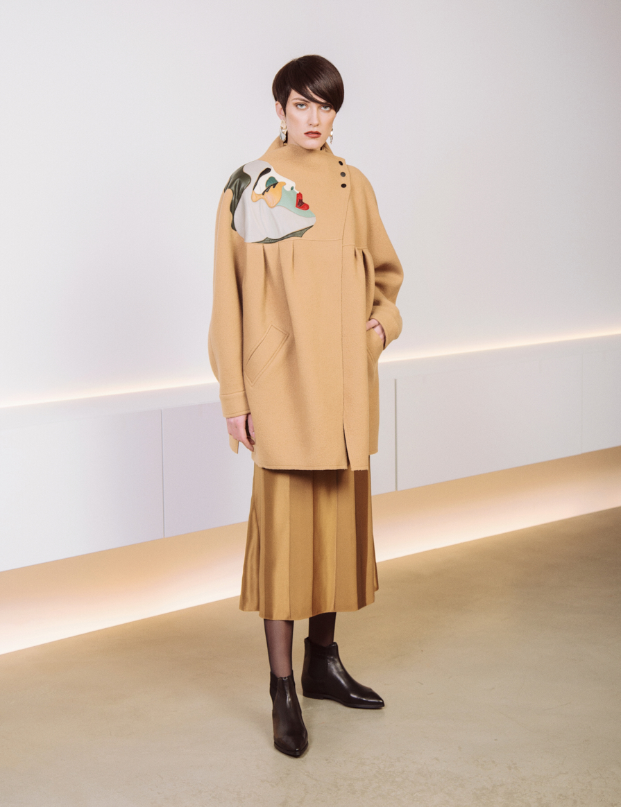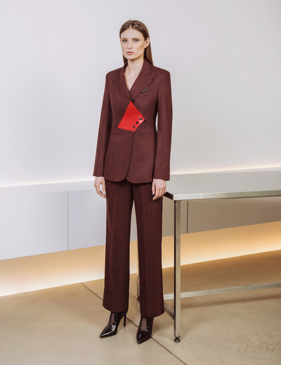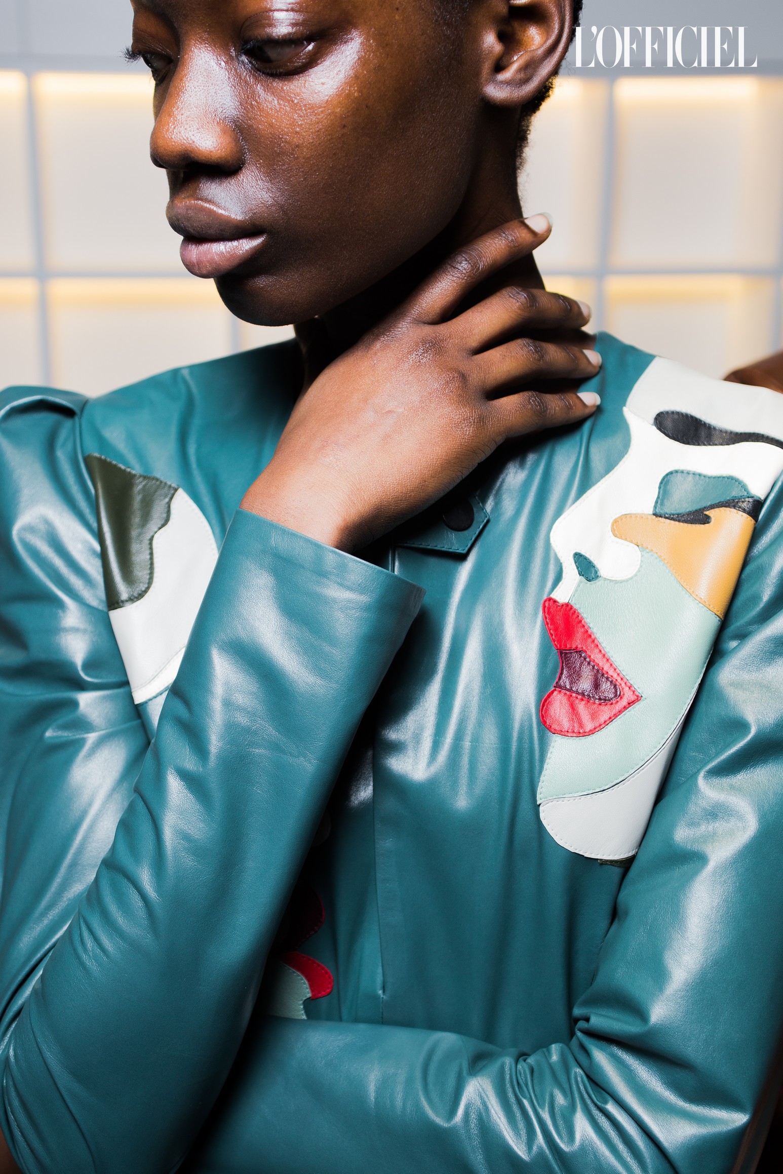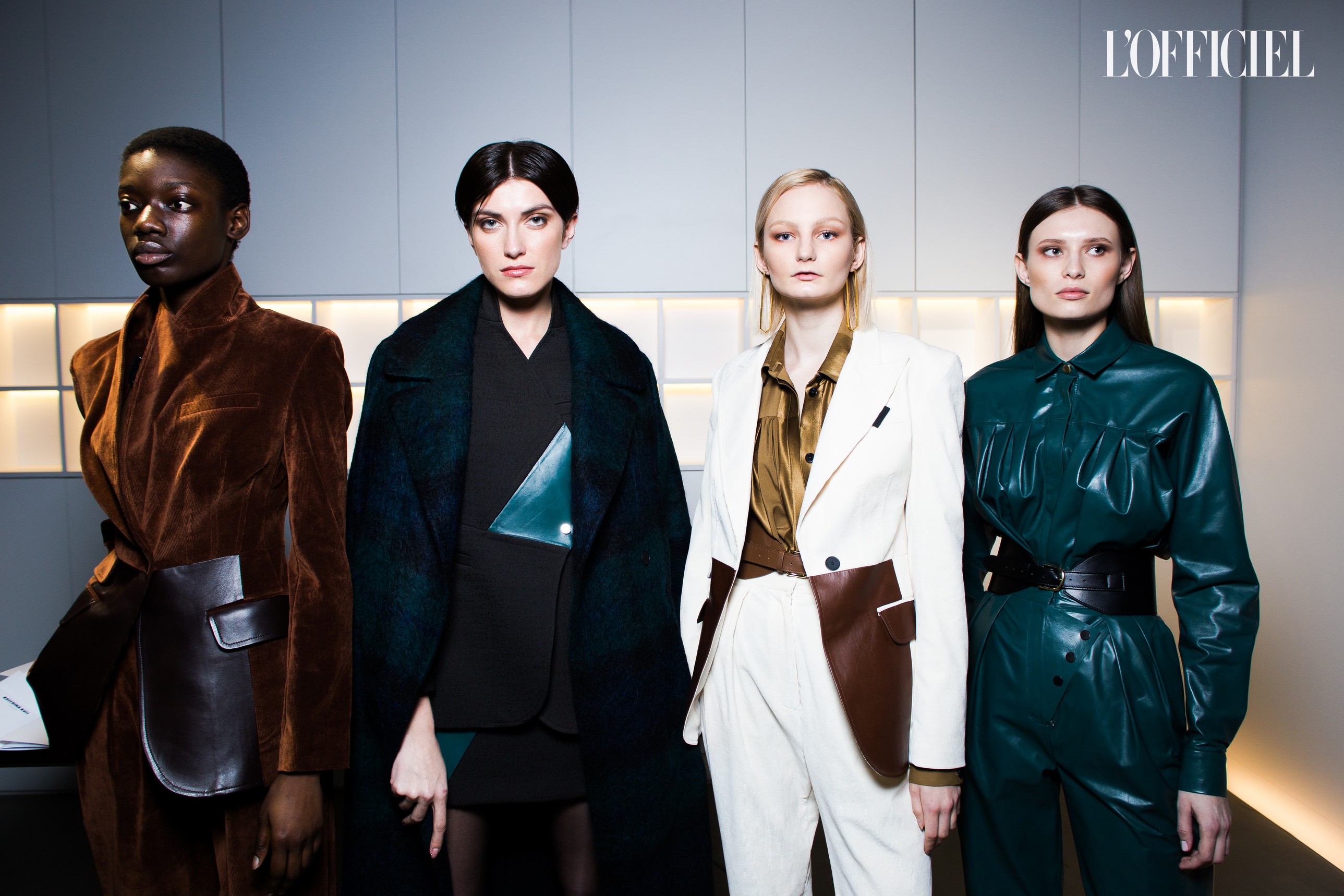 В коллекции Katerina Kvit также представлены вещи с изображением портрета девушки — он расположился в виде цветных аппликаций на силуэтных кожаных платьях, жакетах и плащах. Женщина, о которой рассказывает дизайнер, ищет своё отражение в окружающих людях и стремится передать его с помощью визуальных символов и кодов. Сама коллекция выдержана в духе канонической женственности 30-40-х годов прошлого века — с четким акцентом на талии, ровной линией плеча и элегантными аксессуарами. Объёмные платья на моделях были дополнены широкими поясами, брючные костюмы в духе Марлен Дитрих — контрастными шелковыми вставками, а платья — кожаными.
