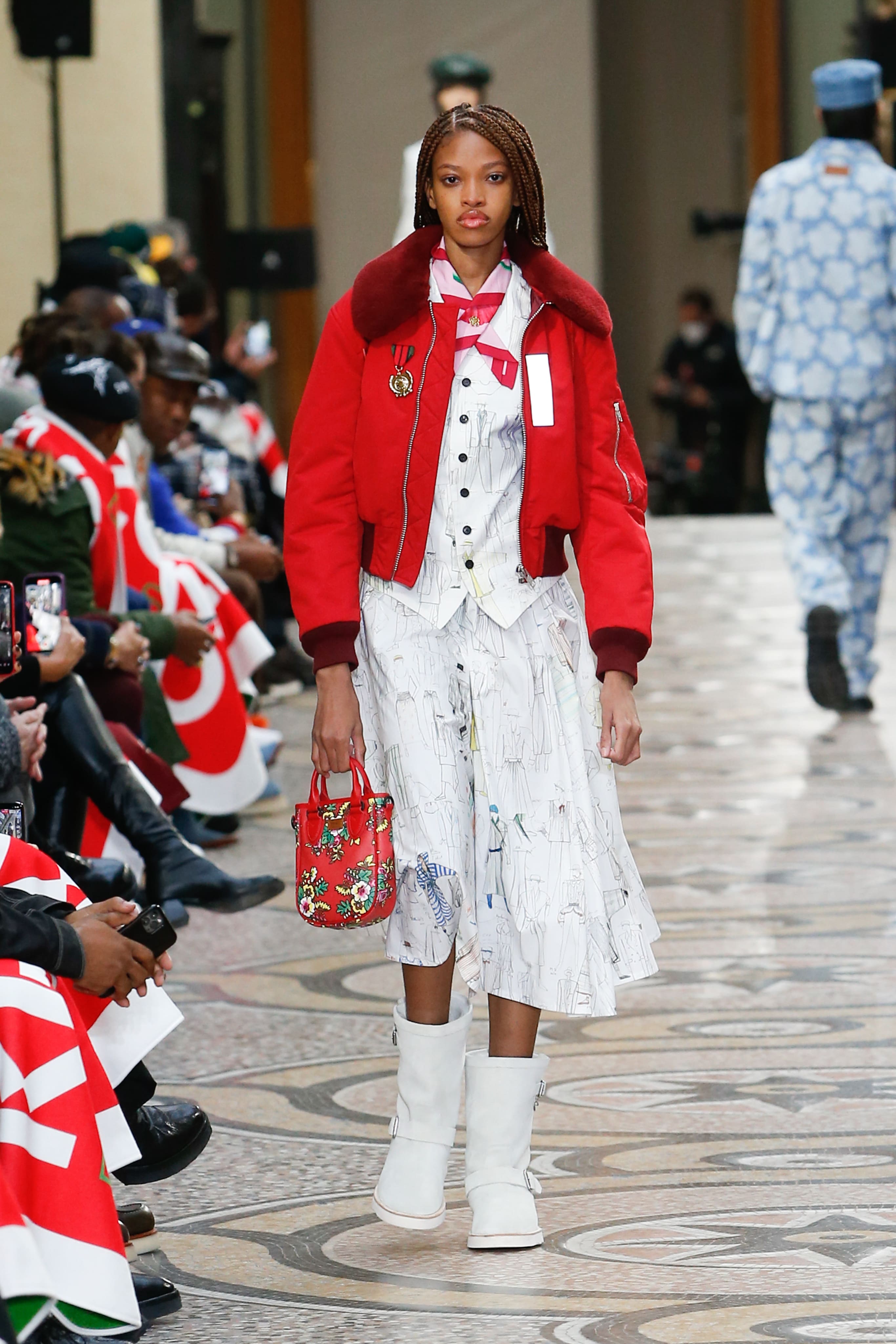 Ключевым принтом Ниго выбрал классический мак, с которым всегда ассоциировался дом Kenzo, — его дизайнер нанес на нарочито упрощенную "рабочую" одежду из денима, юбки миди, рубашки и верхнюю одежду. Среди аксессуаров можно заметить знакомые шарфы с животными и остроумные версии вязаных шапок — дополненные рисунком в виде кошачьих ушей. В цветовой палитре угадывается свежий зеленый оттенок, который часто использовал сам Кензо. Также новую жизнь обрел знаменитый тигр Kenzo, которого в последние годы видели только на разноцветных худи. Ниго решил напомнить о японской многослойности, кэмпе и гранже, смешав бомберы, клубные куртки и платья пэтчворк, свитеры с цветами и деловую моду, а также силуэтные пальто ярких цветов и жилеты-фартуки, цветные "строительные" перчатки и сумки, напоминающие ланчбоксы.