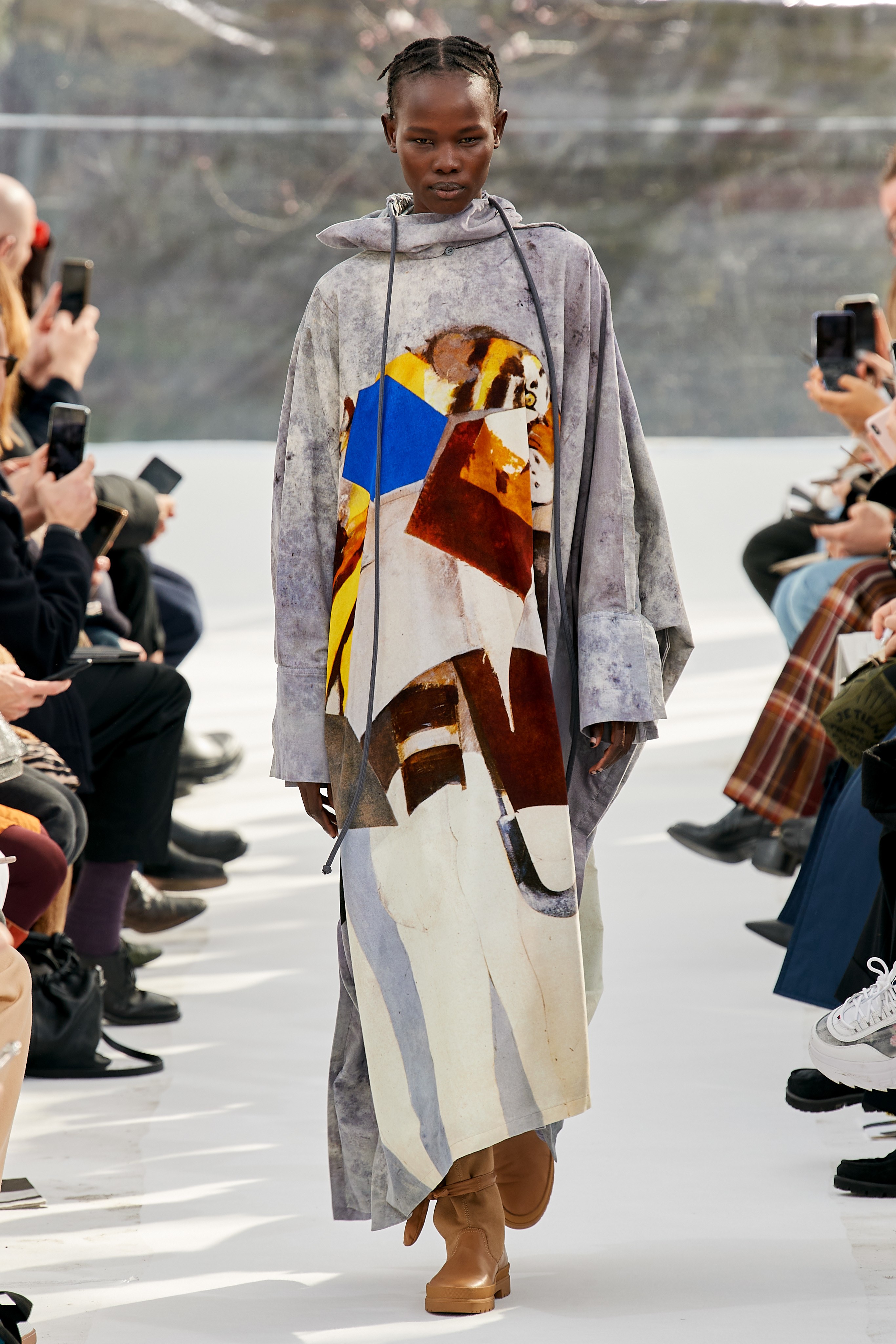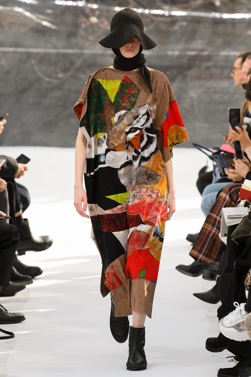 На что обратить внимание: головной убор с мантией, принты в виде портретов диких животных, ультраширокие брюки, перевязанные лентами.