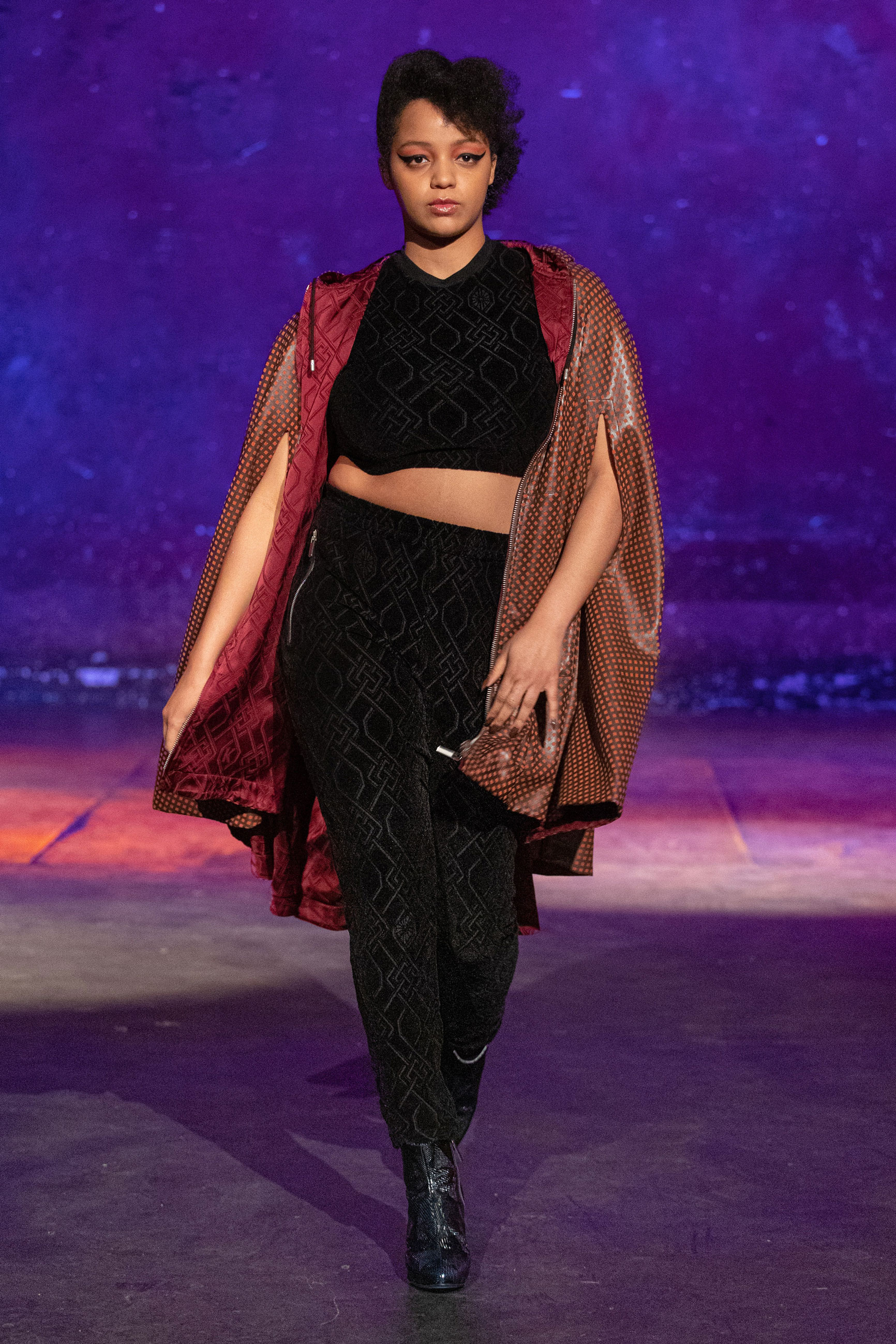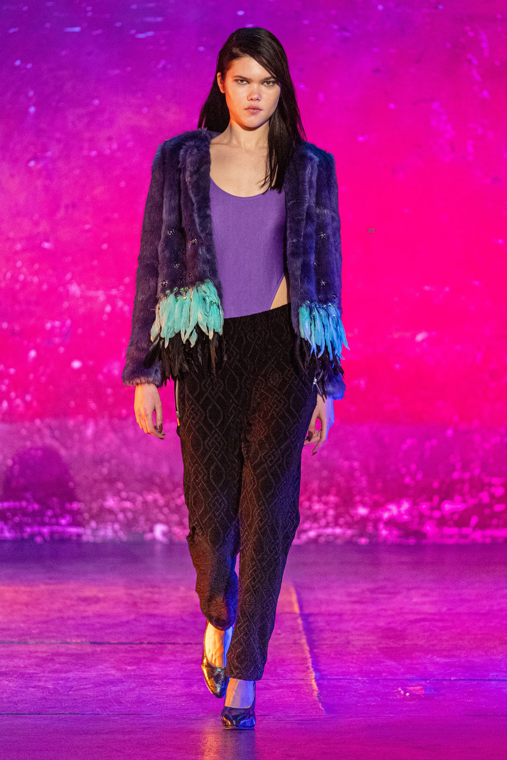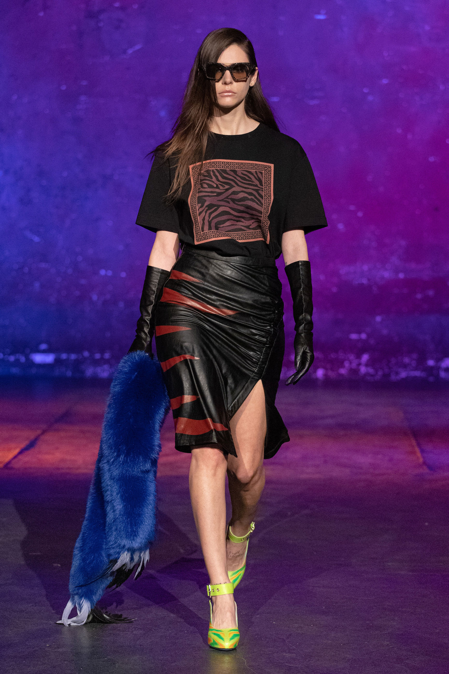 Коллекция включает в себя вещи спортивного кроя, адаптированные к динамике человеческого тела, будто специально для комфортных перевоплощений. Удлиненные футболки, платья с горловинами, брючные костюмы из кожи и жаккарда, а также бархатные наряды украсили принты в виде крыльев сказочного существа и языков пламени. На отдельных вещах эти формы перешли в животные узоры под зебру или тигра. Дизайнер уделила особое внимание сложной технике в изделиях из гусиных и петушиных перьев — укороченной накидке, цветной муфте и объемных аппликациях на топах и жакетах. К смеси из уличного шика и чувственной эклектики бренда Кристель Коше добавила высокий приоритет комфорта, сделав акцент на эластичном дениме, бархате и спортивных костюмах.