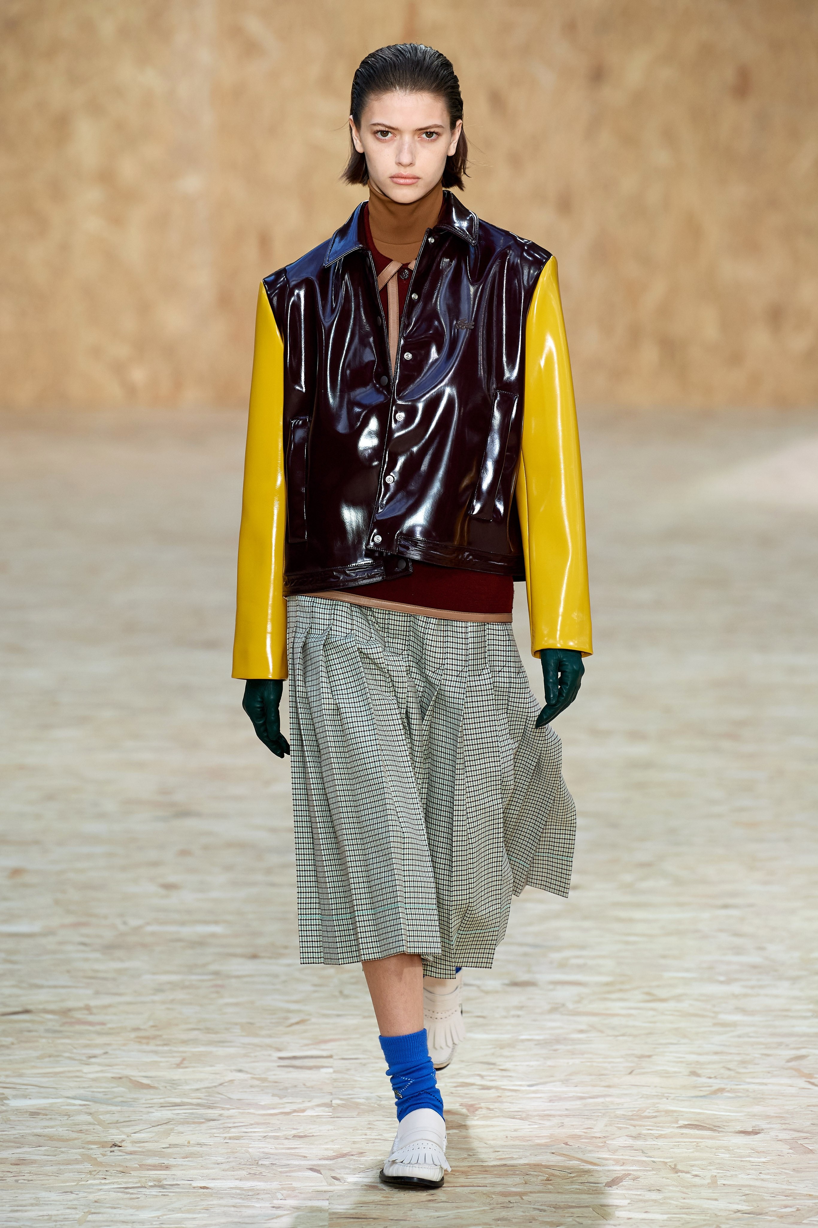 На что обратить внимание: брючный костюм поверх яркой водолазки, вязаный жилет поверх рубашки в клетку, сочетание желтого с коричневым, мягкая фетровая кепка, виниловая клубная куртка и плиссированная юбка.
