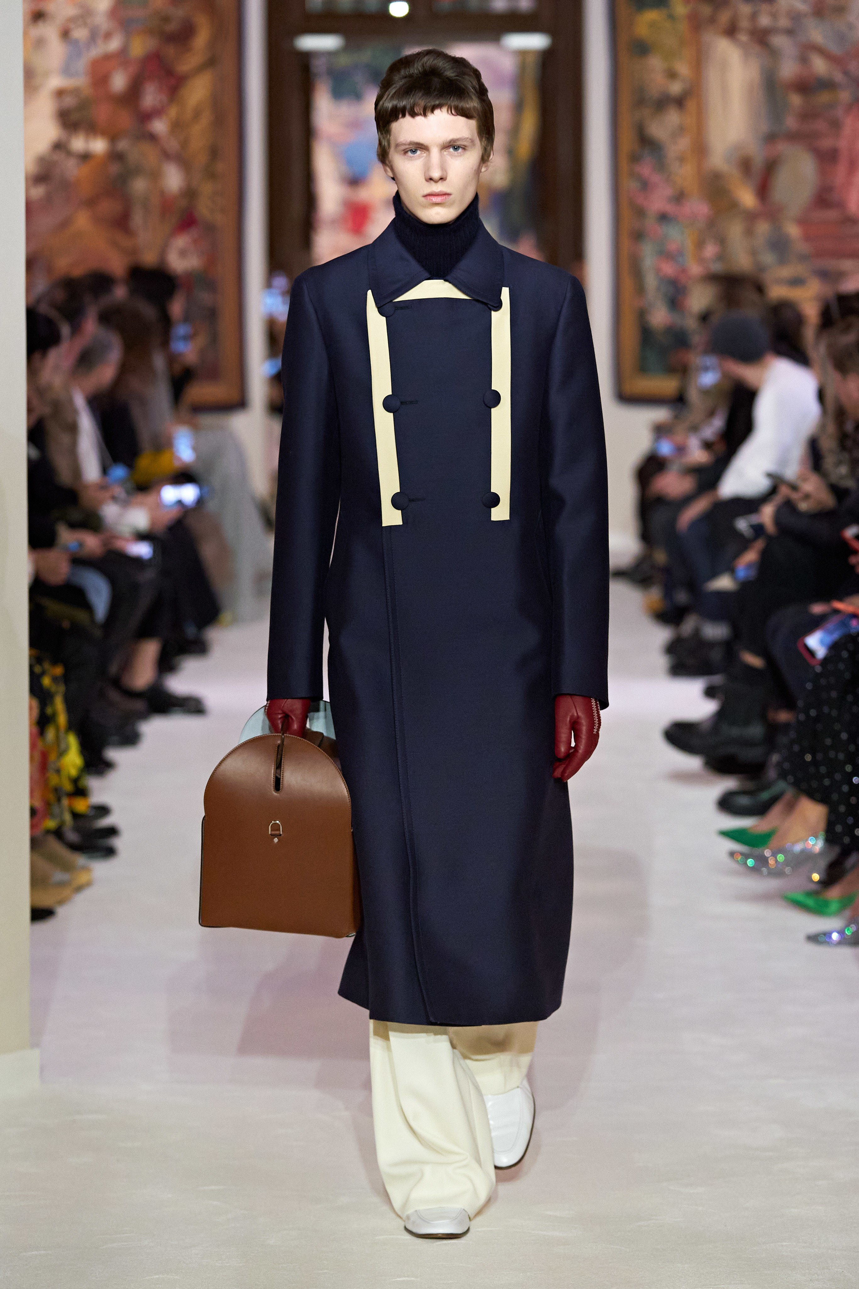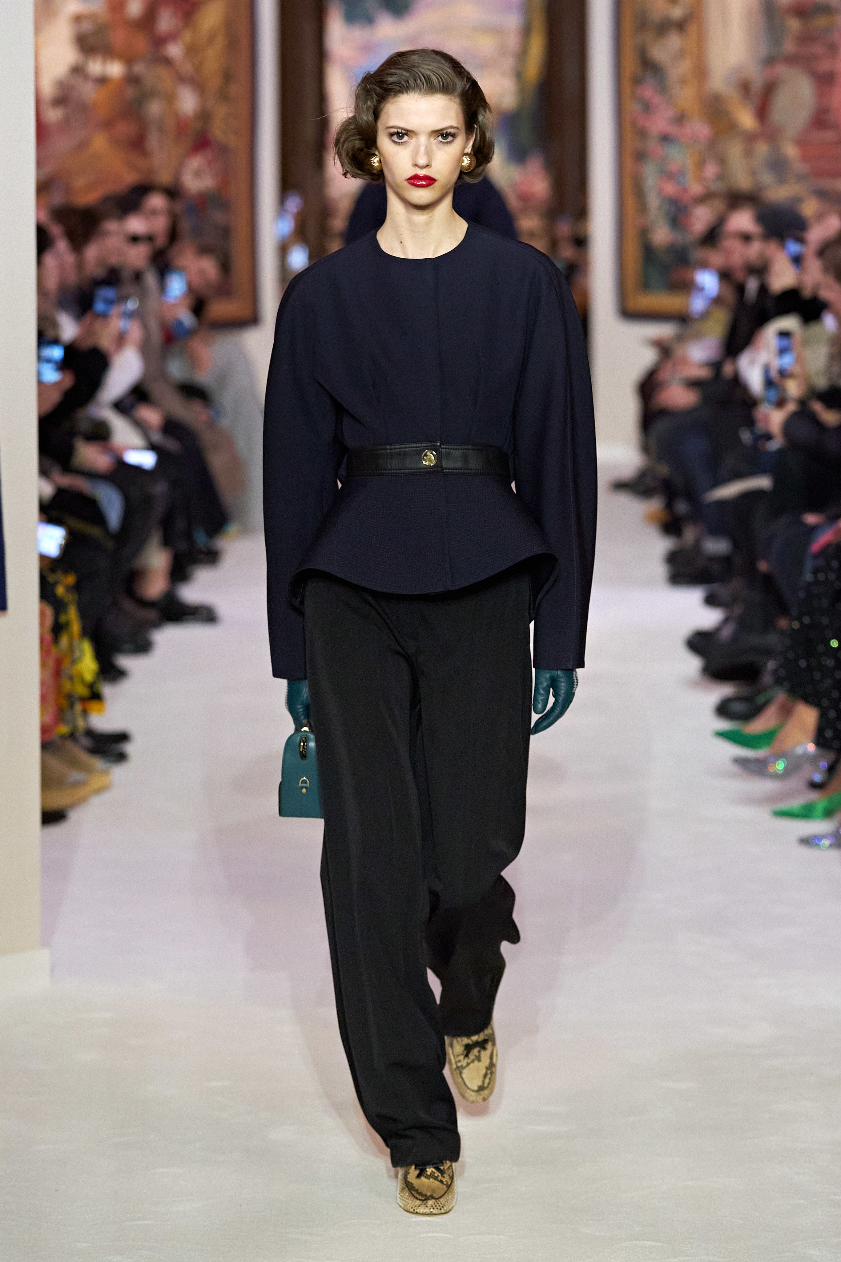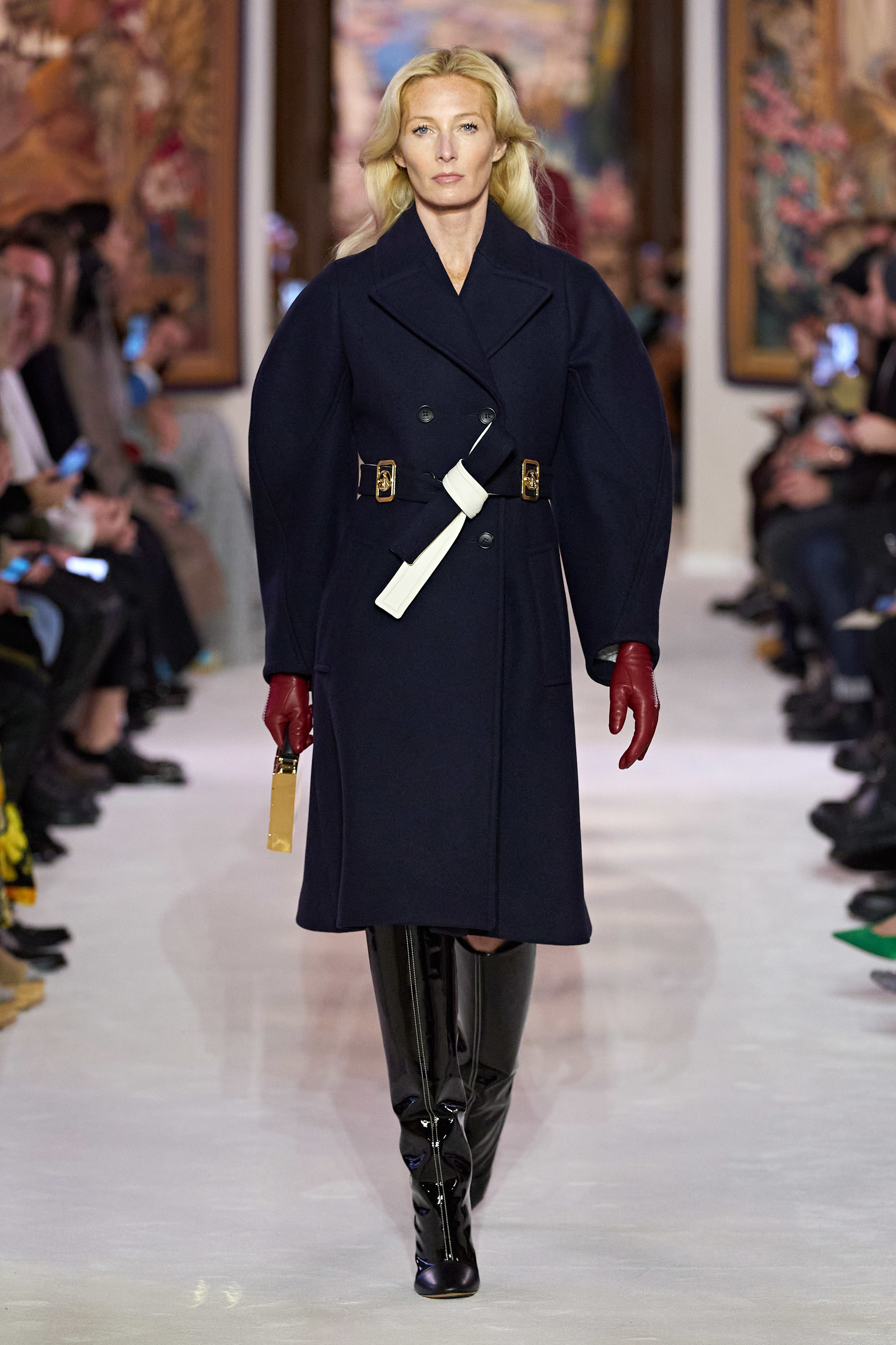Ключевые элементы: платья и джемперы-кейпы с отделенными рукавами, брючные костюмы с двубортными пиджаками и жакетами, шляпки-шлемы, пуховые горжетки, платья с контрастными продольными вставками, минималистичные вечерние платья, сумки-саквояжи, расписные плащи.
