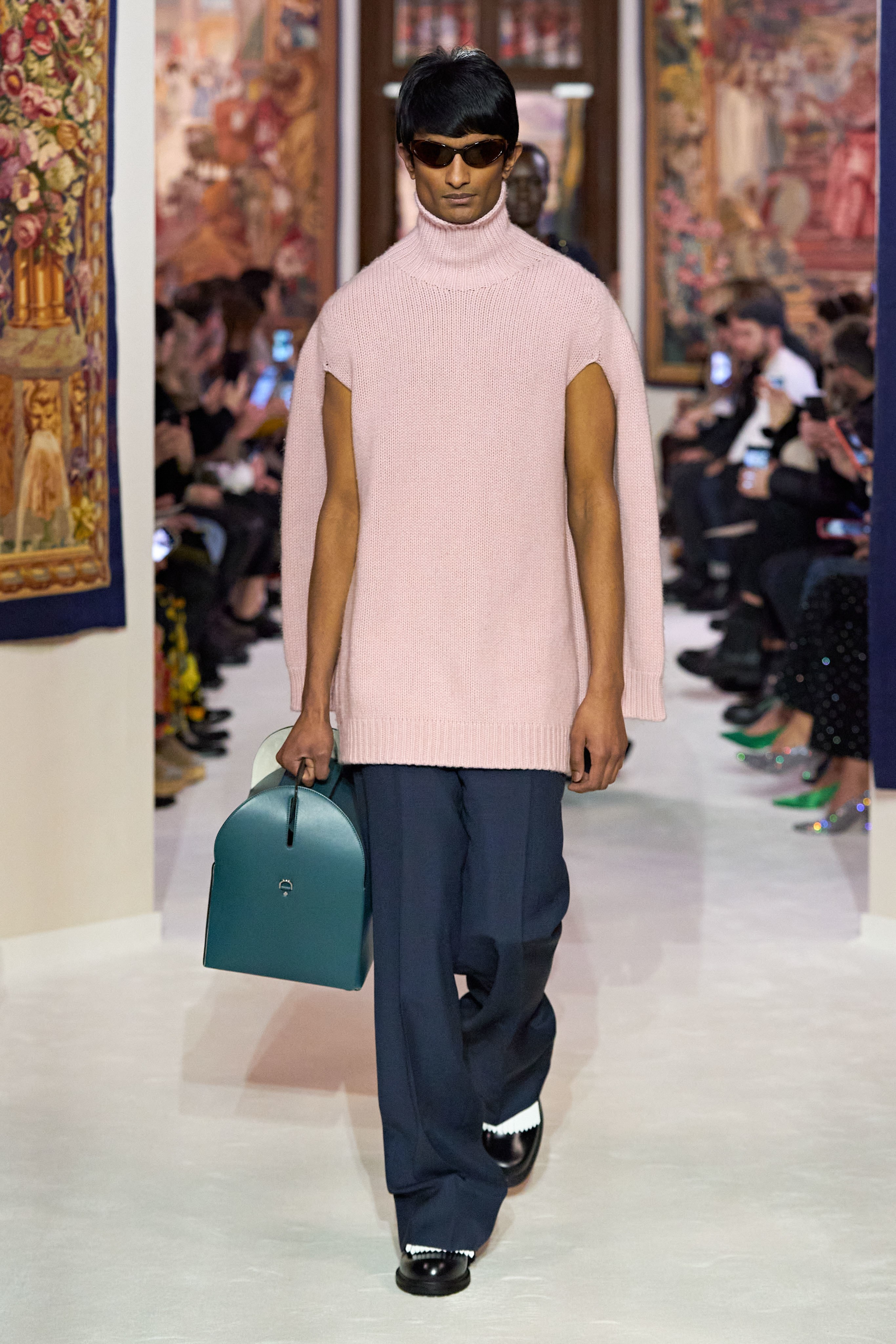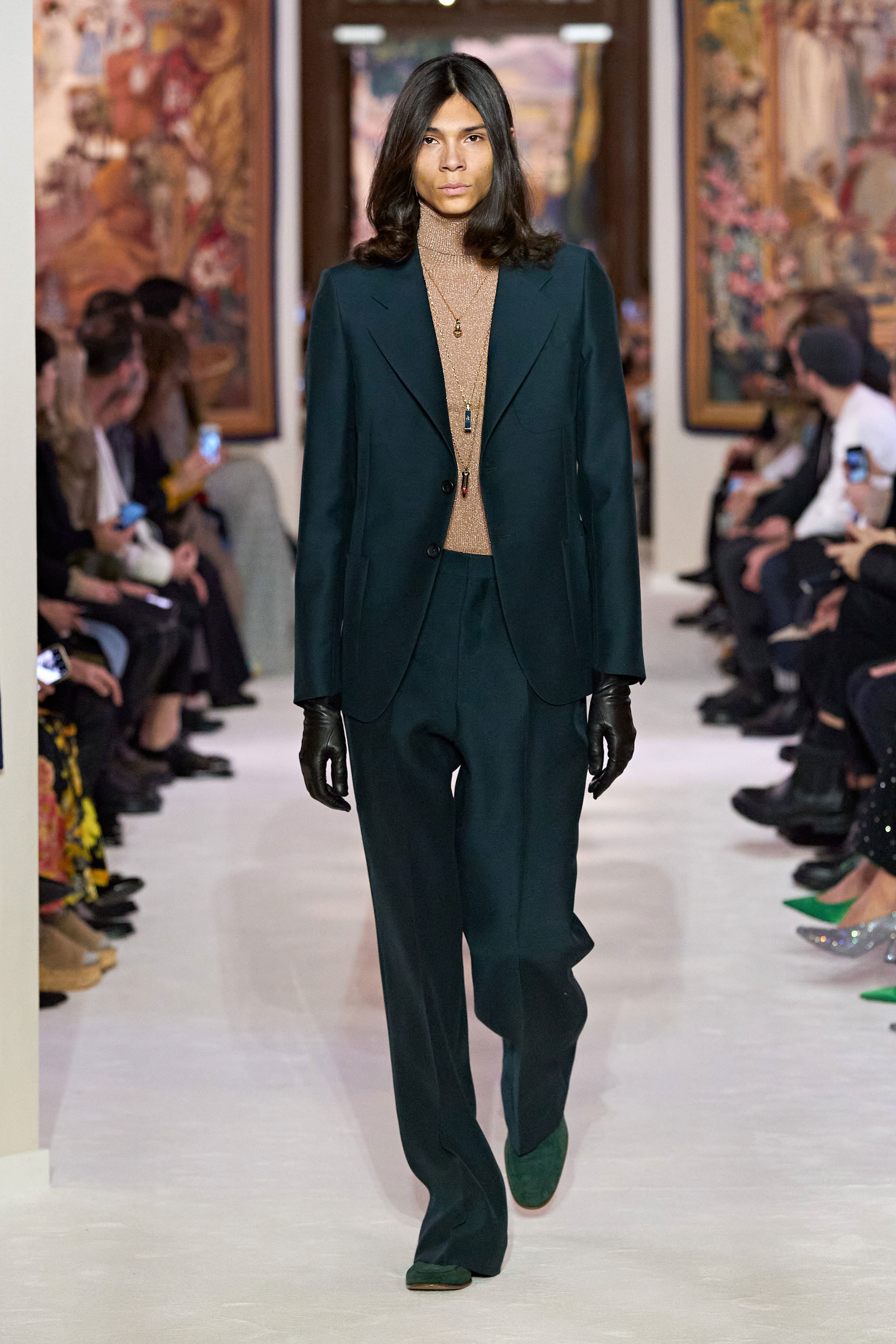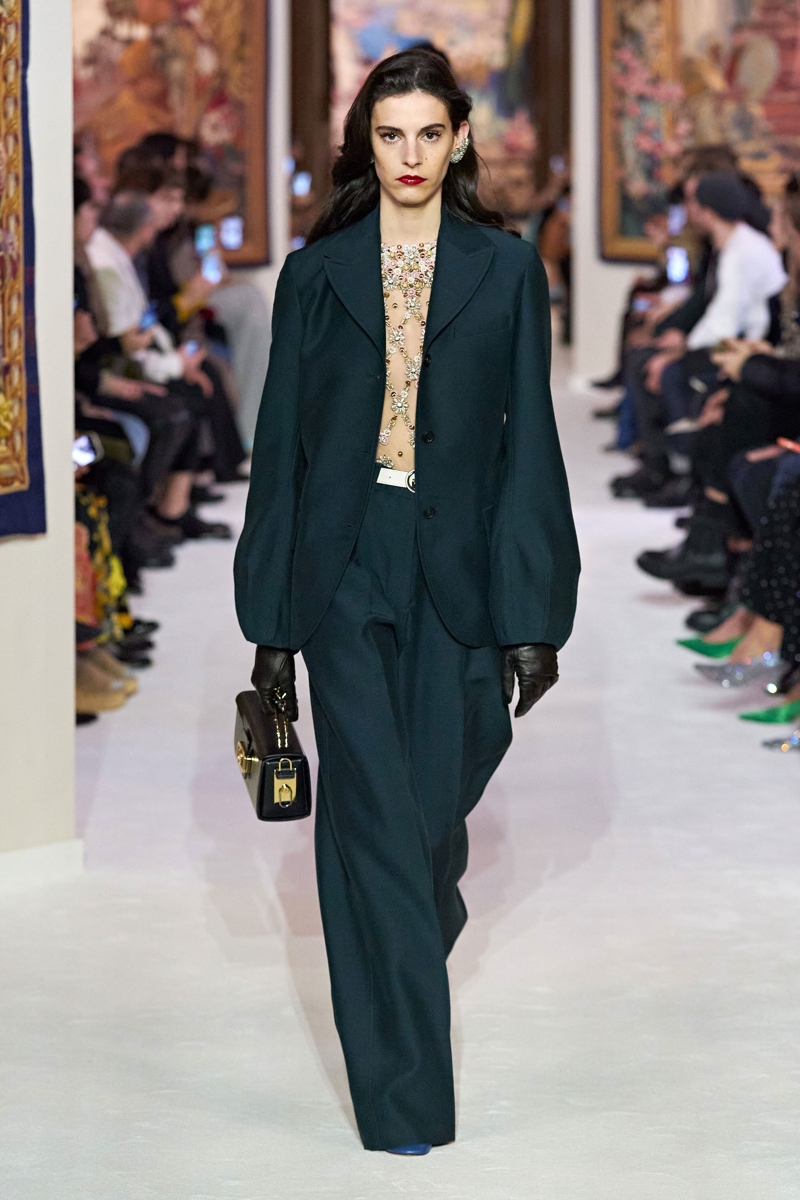 Ключевые элементы: платья и джемперы-кейпы с отделенными рукавами, брючные костюмы с двубортными пиджаками и жакетами, шляпки-шлемы, пуховые горжетки, платья с контрастными продольными вставками, минималистичные вечерние платья, сумки-саквояжи, расписные плащи.