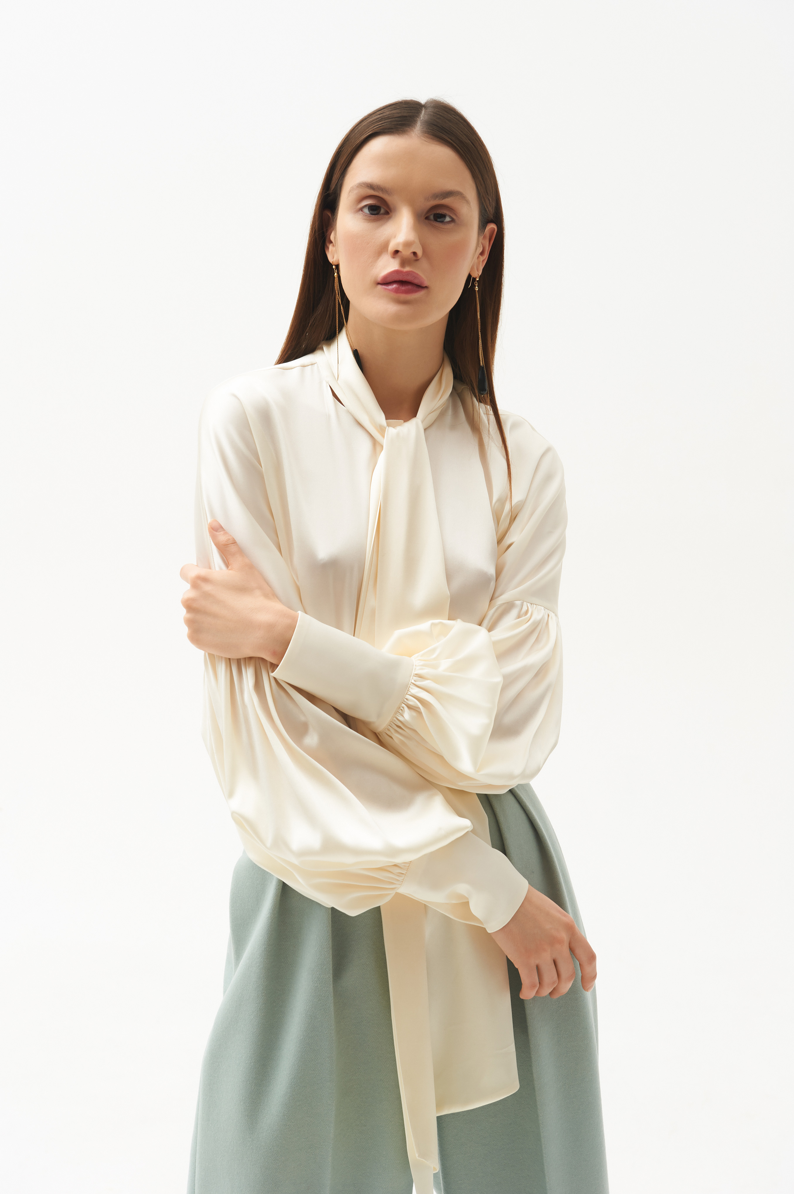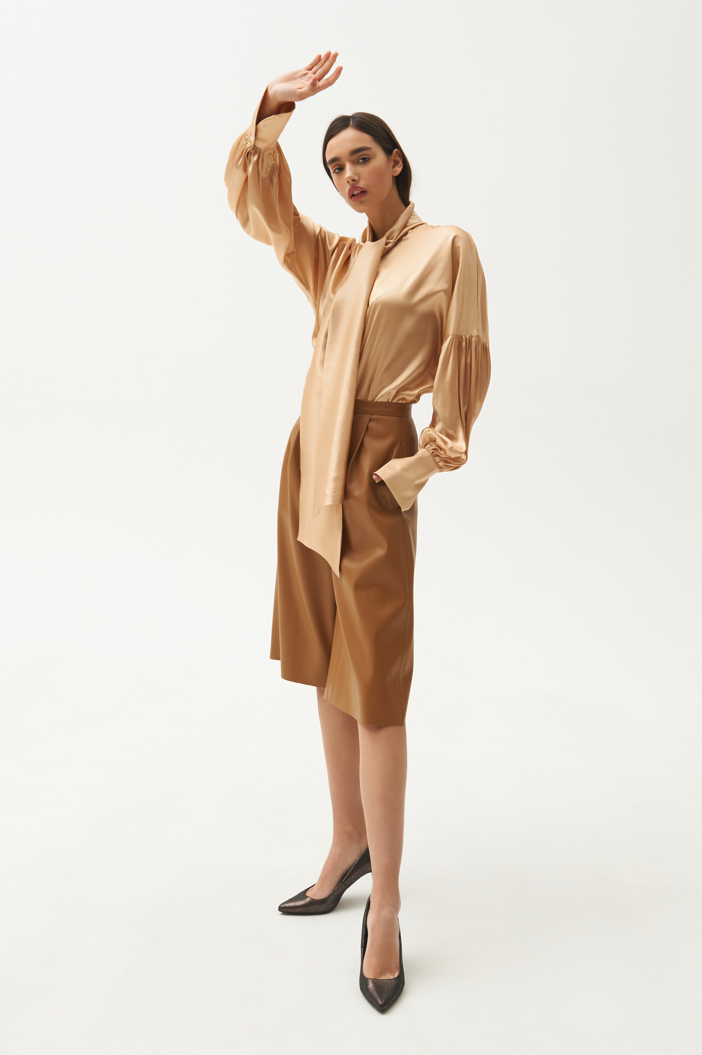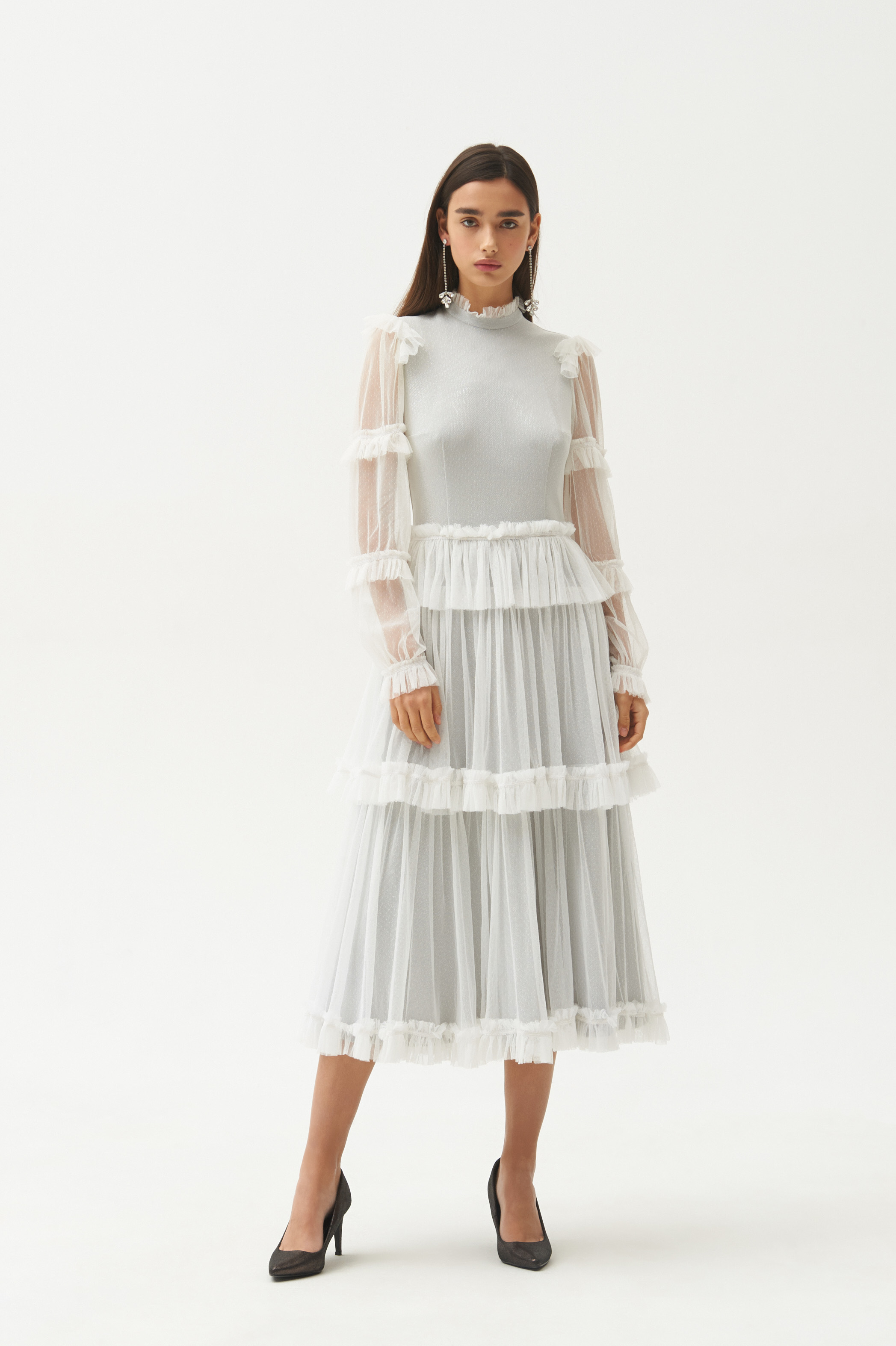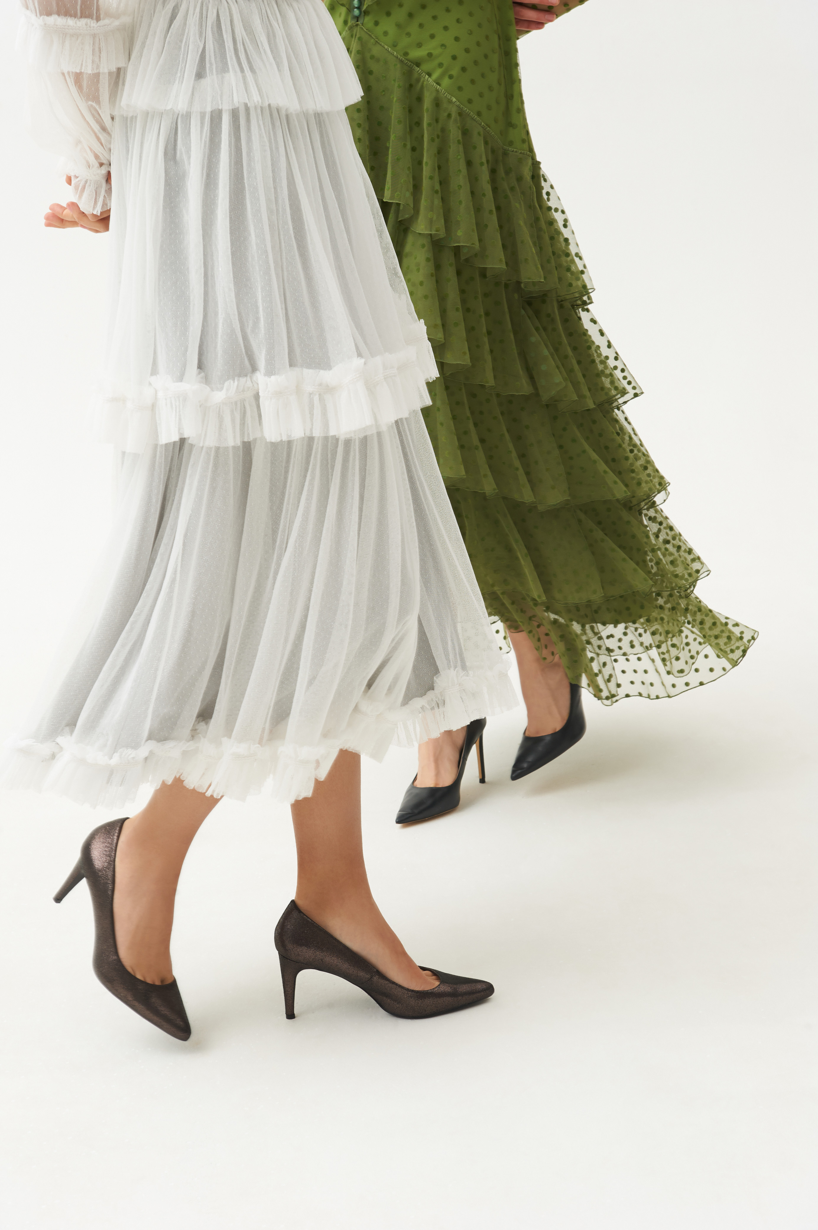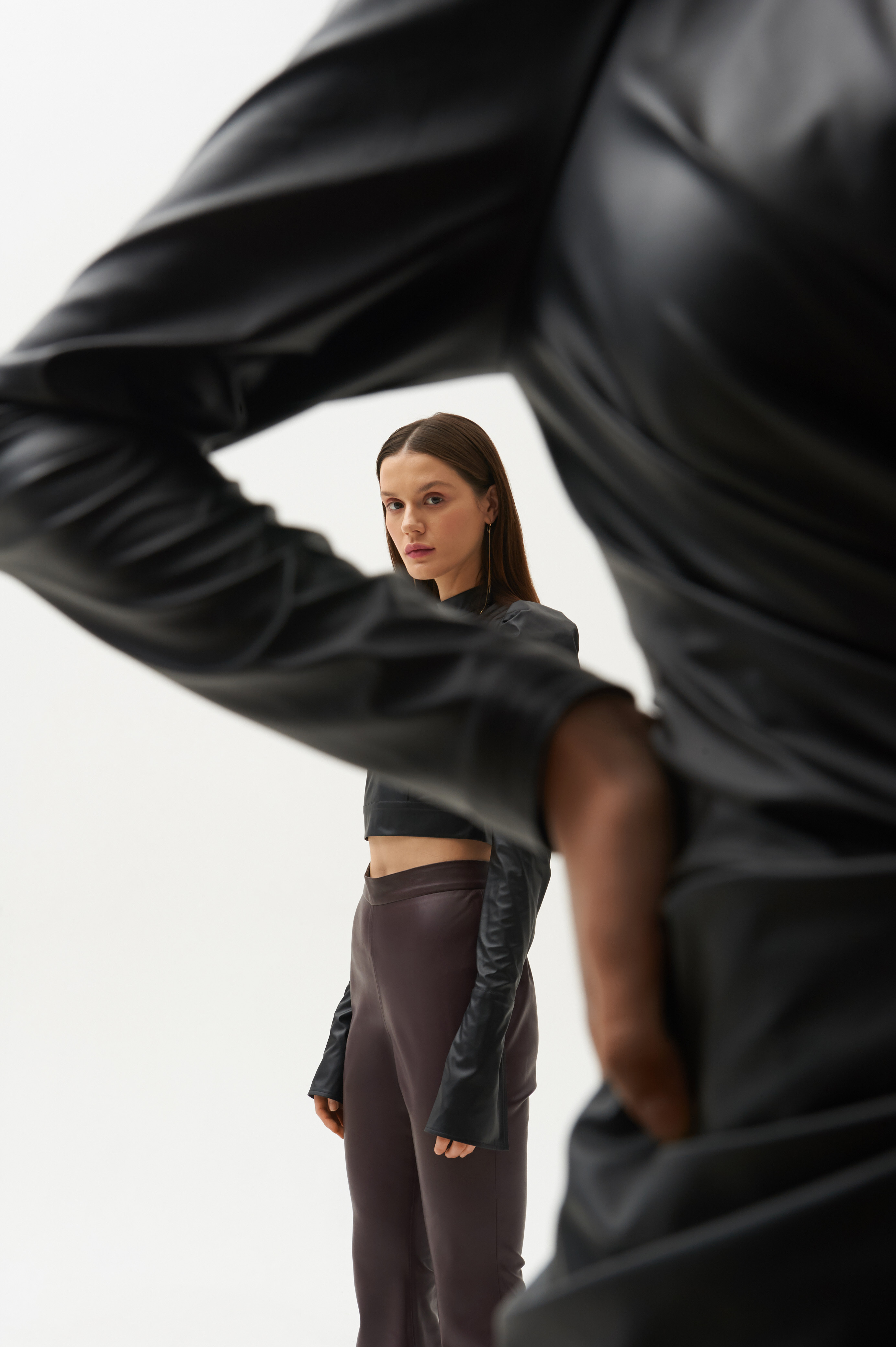 С ними в комплекте дизайнер предлагает носить минималистичные блузы из шелка, черные драпированные кроп-топы, короткие платья с кокетливым вырезом и длинные многослойные платья из фатина.