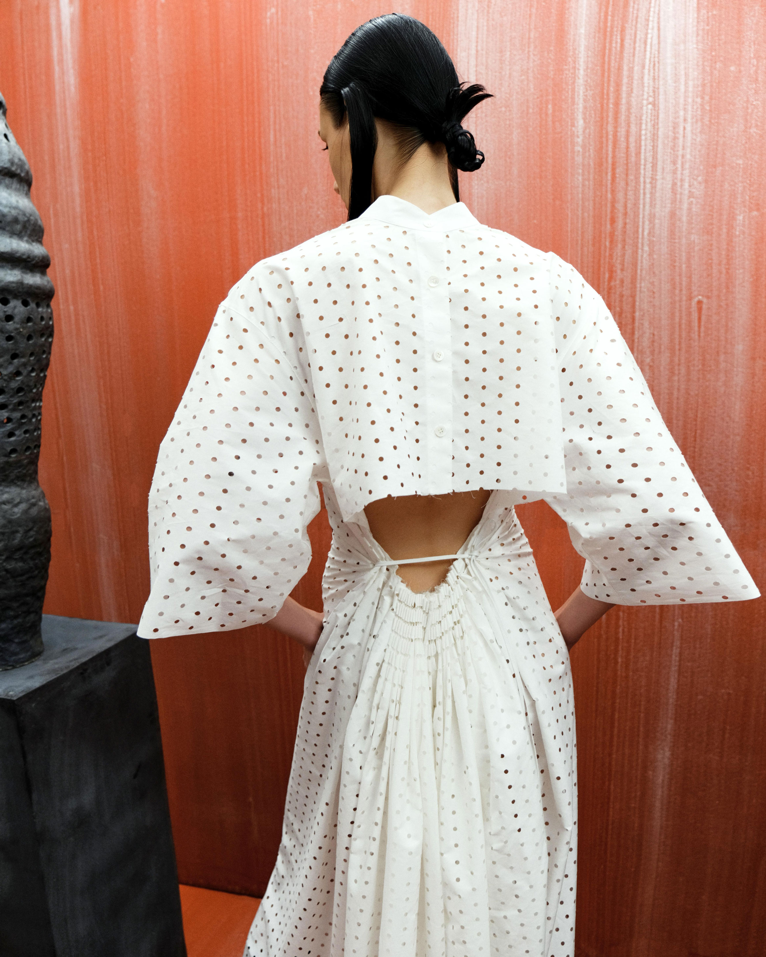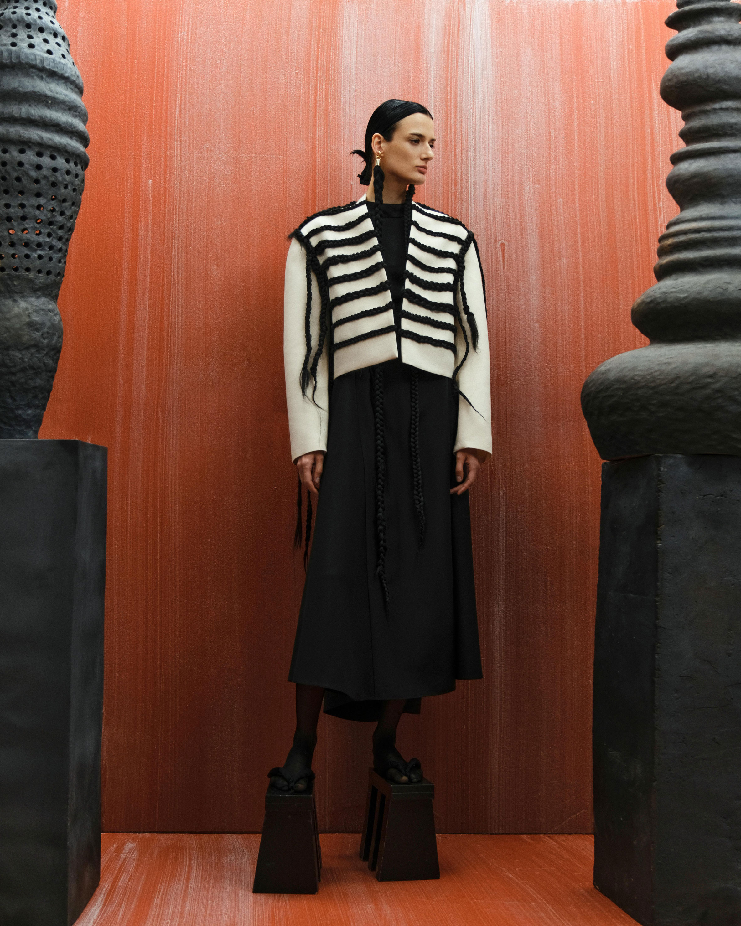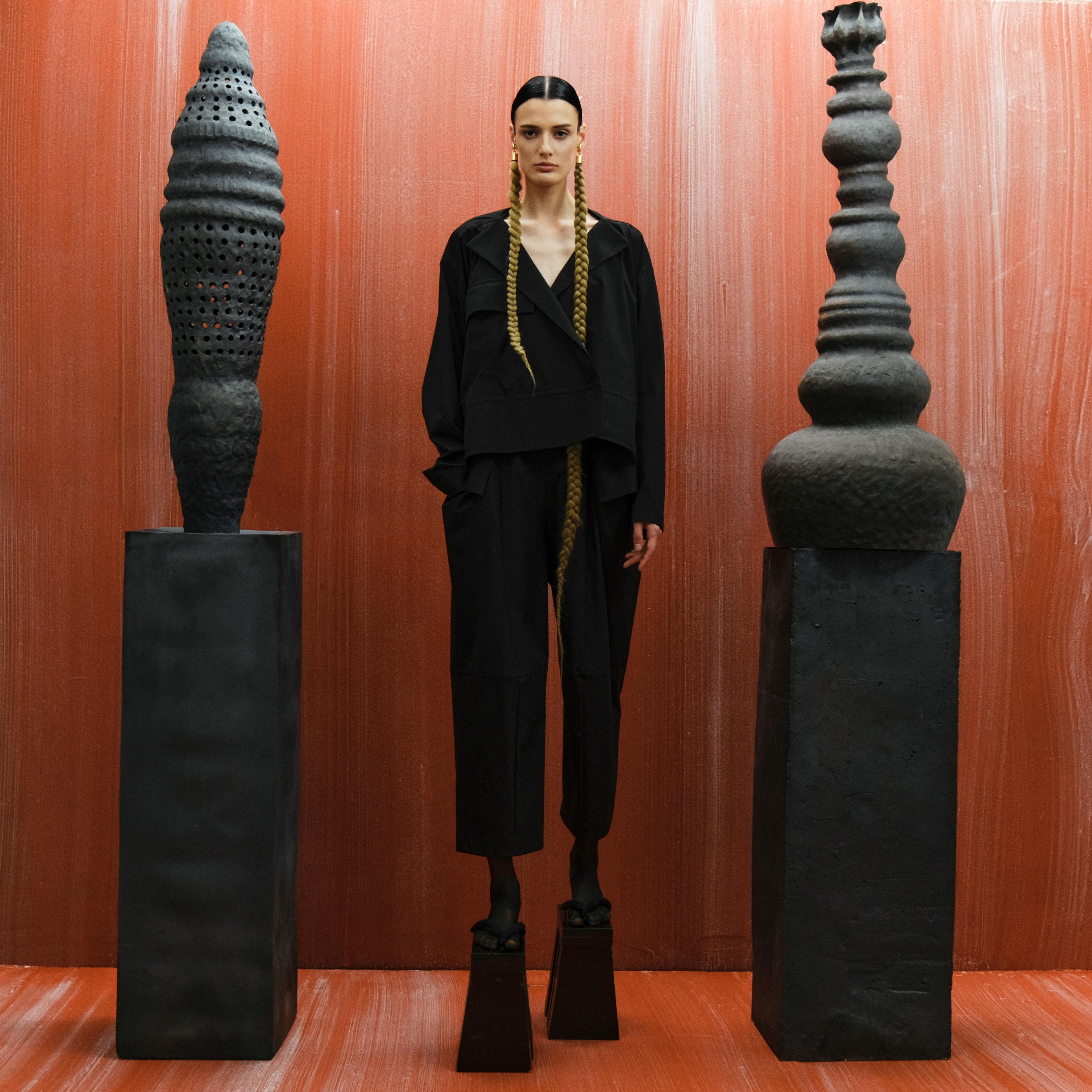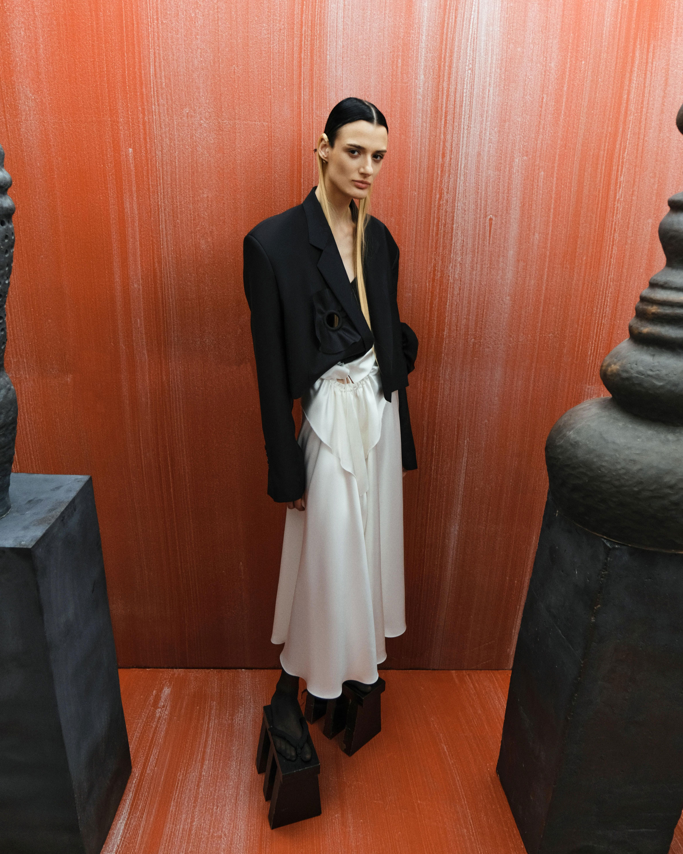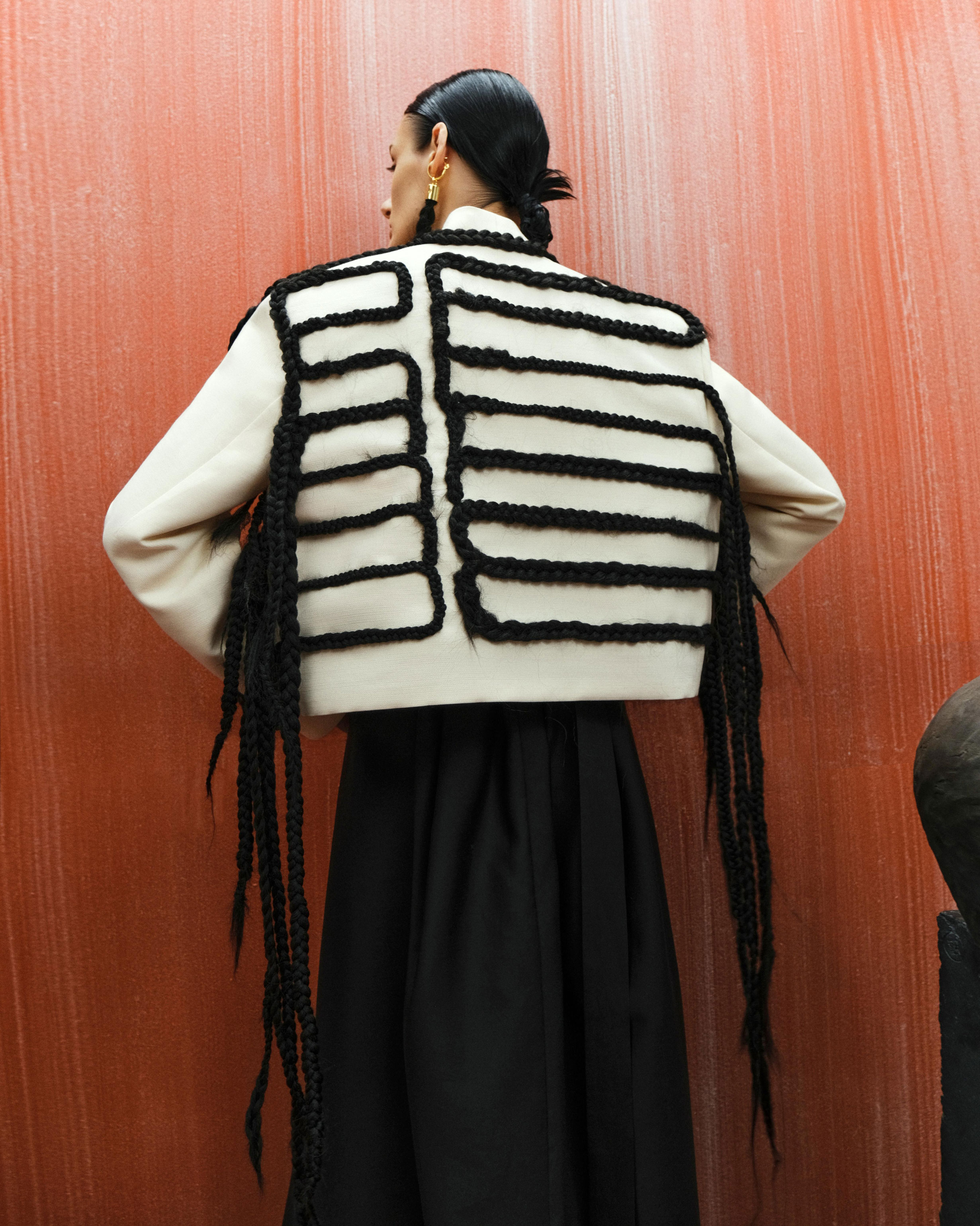 В рамках Недели моды в Париже была представлена весенняя коллекция Лилии Литковской. Дизайнера вдохновило творчество художника Кита Харинга, тема трансцендентного взаимообмена мужского и женского. Так, классические маскулинные рубашки превратились в лоскутные куртки, а знаковые для ДНК бренда костюмы "с мужского плеча" стали гендерно-нейтральными. Их, как и элегантные платья миди, украсили гиперболизированные люверсы-застежки. Солярные символы, отсылающие к солнцу и цикличному возобновлению жизни, то встречаются в перфорации, то угадываются в идеально скругленной линии плеч. Ключевым аксессуаром стали серьги и чокеры — косы, придающие каждому образу пограничное, почти матриархальное изящество. Орнамент из кос также увенчал белоснежную куртку.