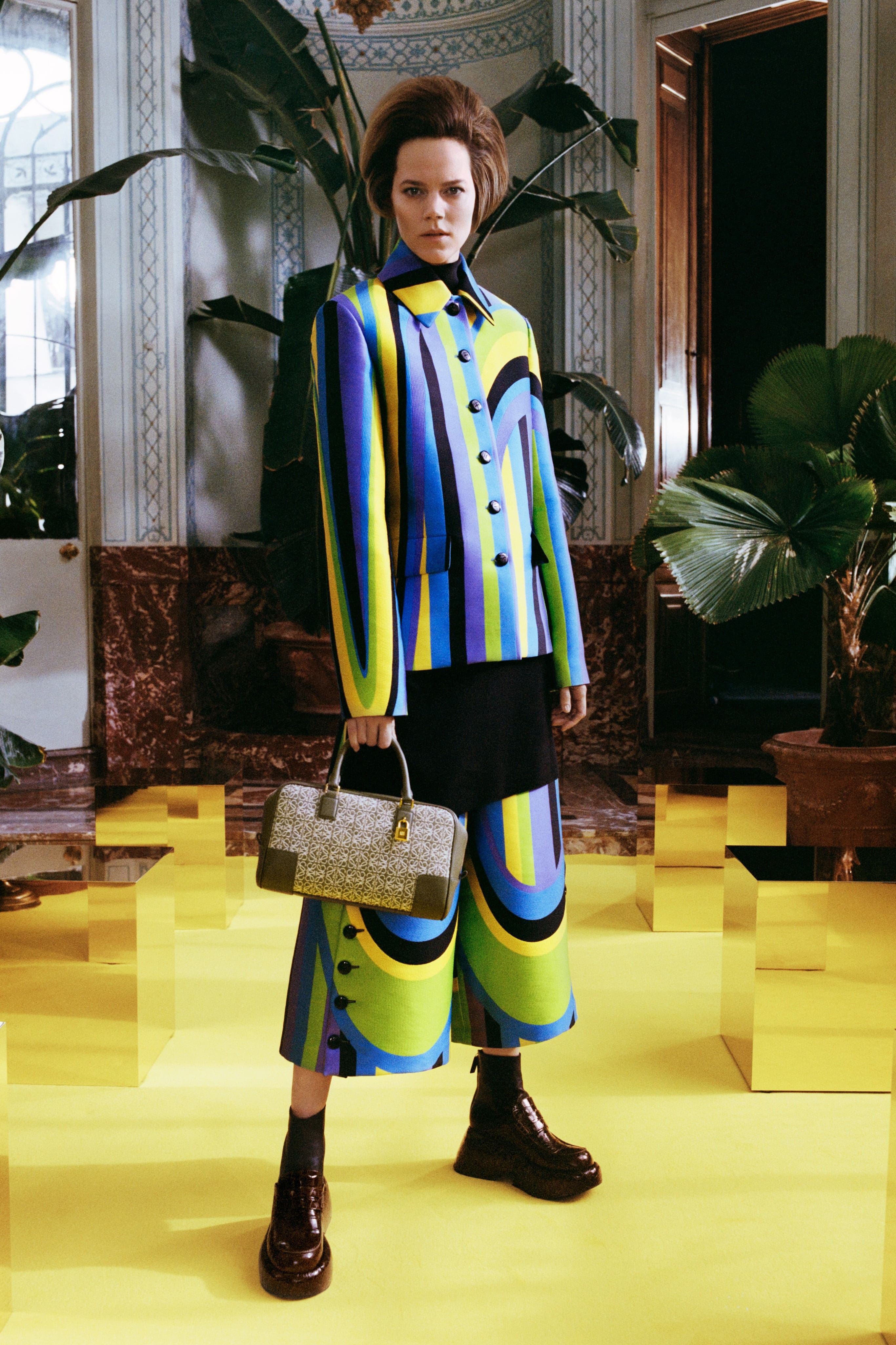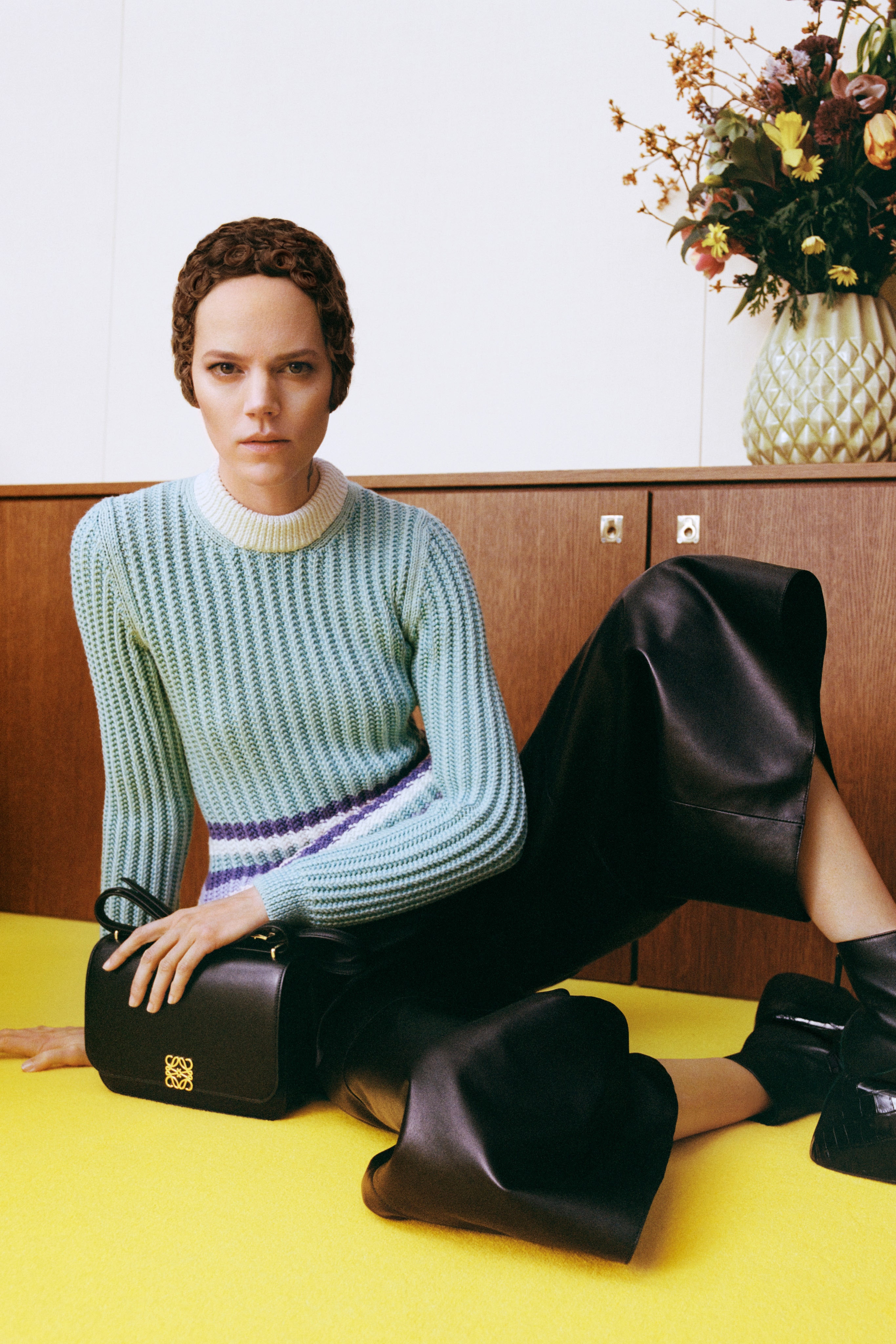 Костюмы чистых, расширенных силуэтов украшают гигантские кисти, будто на изысканных торшерах, цветные свитеры стягивают пояса с резными орнаментами, а на руках моделей красуются браслеты с крупными медальонами и нанесенными монограммами Loewe.