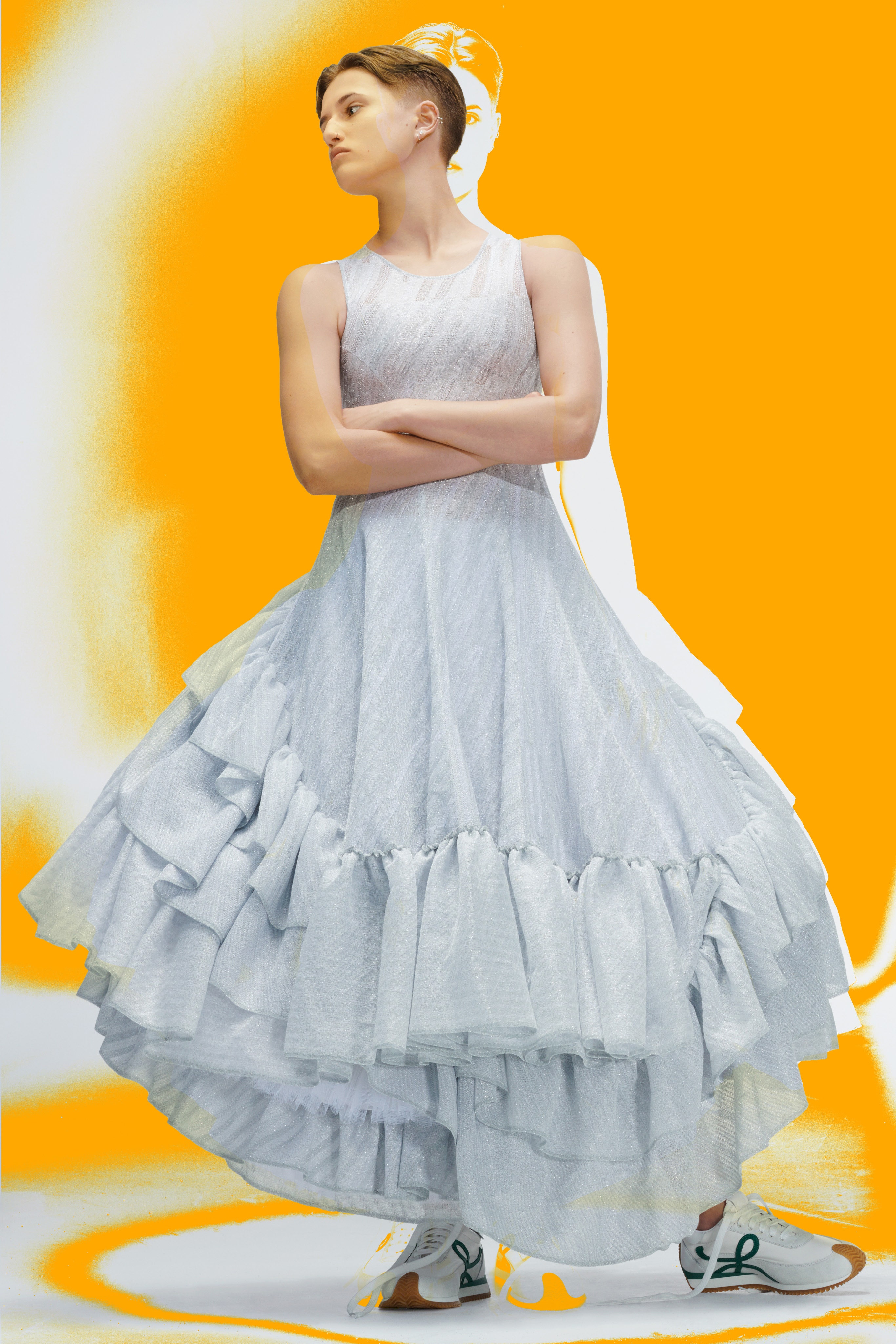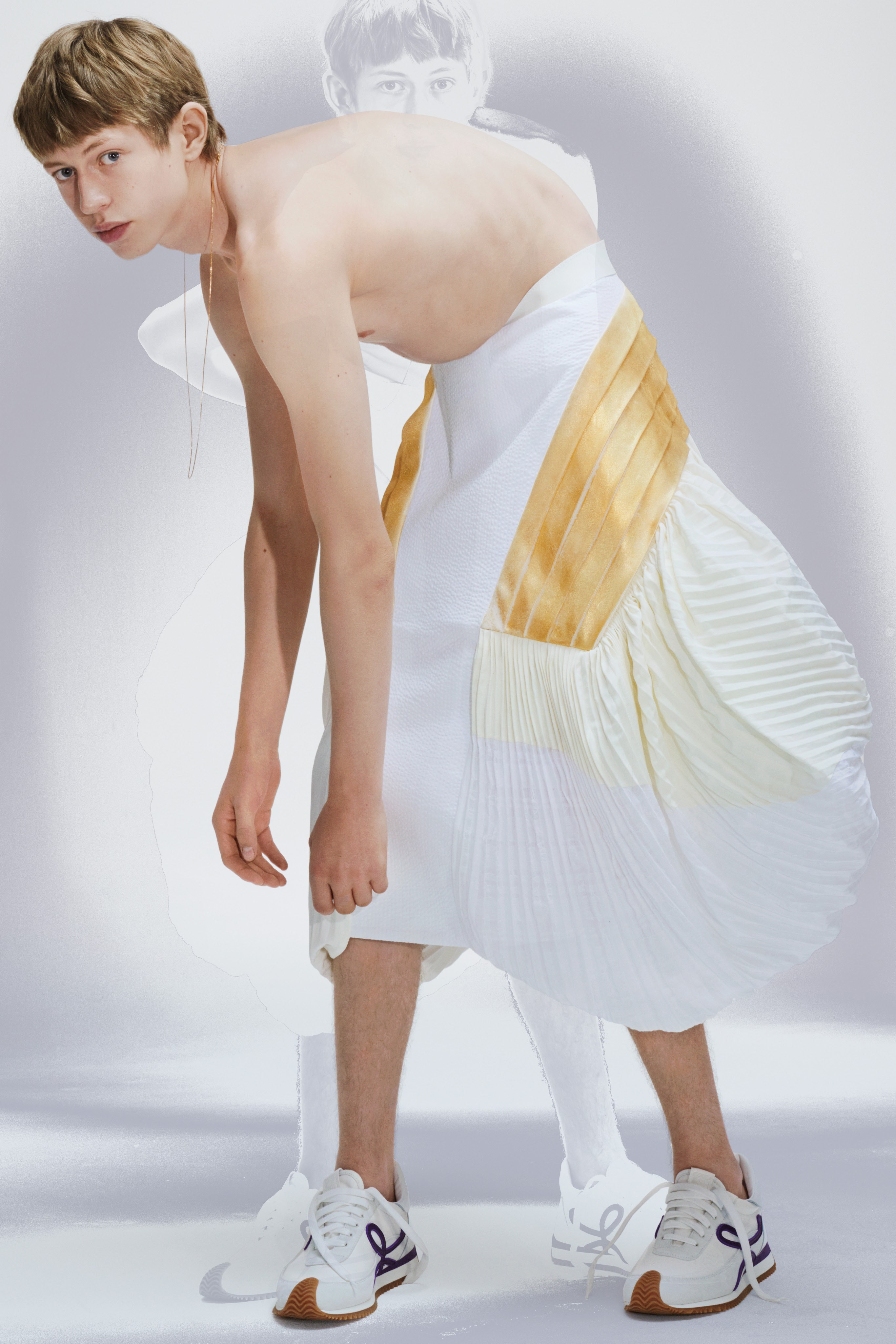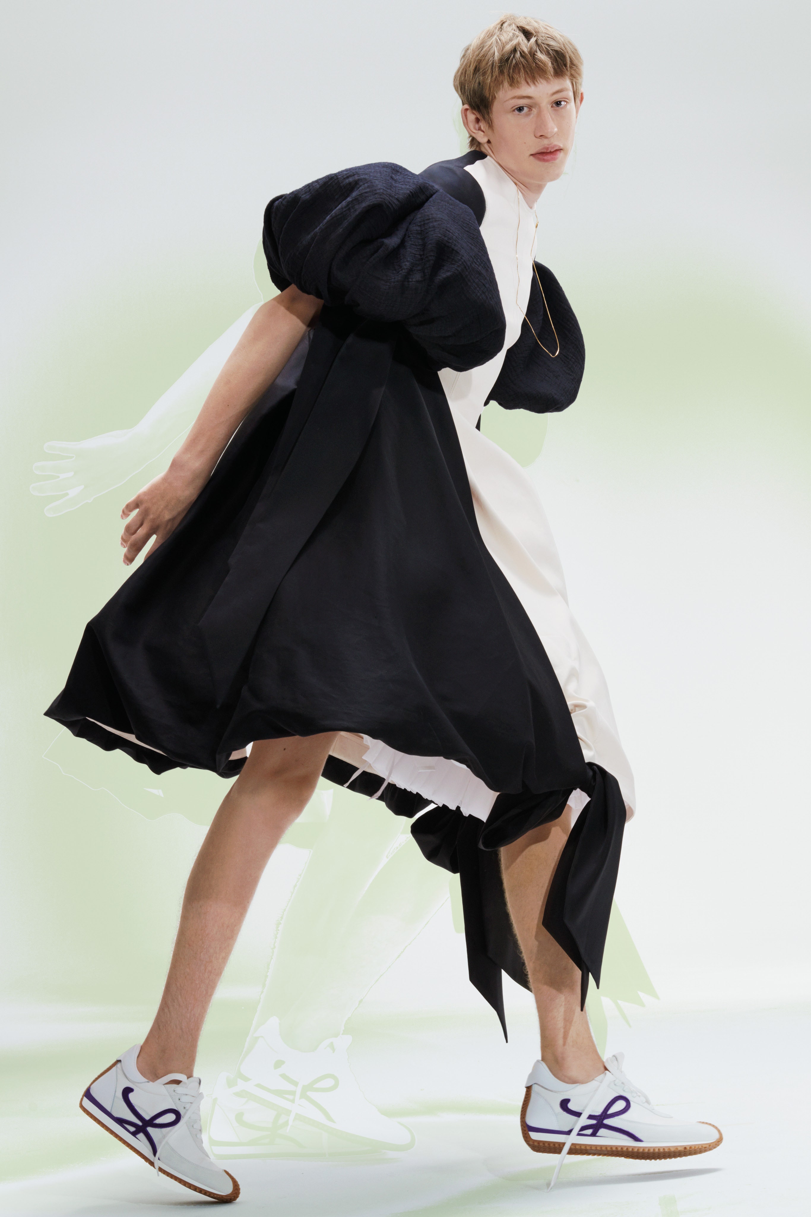 В новой коллекции Джонатана Андерсона для Loewe разные платья соединены в одно узлами, поверх драпированного мини расположился прозрачный кринолин из фатина, а у рубашки поло рукава как в лучших нарядах героинь сериала "Династия". Нарочито кукольные платья из шитого кружева дополнены маленькими сумочками, что вполне очевидно, зато элегантные пальто и вечерние наряды сплошь "раздуты" гиперобъемными буфами и плиссировками и представляют собой нечто среднее между сценическими костюмами балета Оскара Шлеммера и модной выходкой. От этого весенняя коллекция только интереснее.