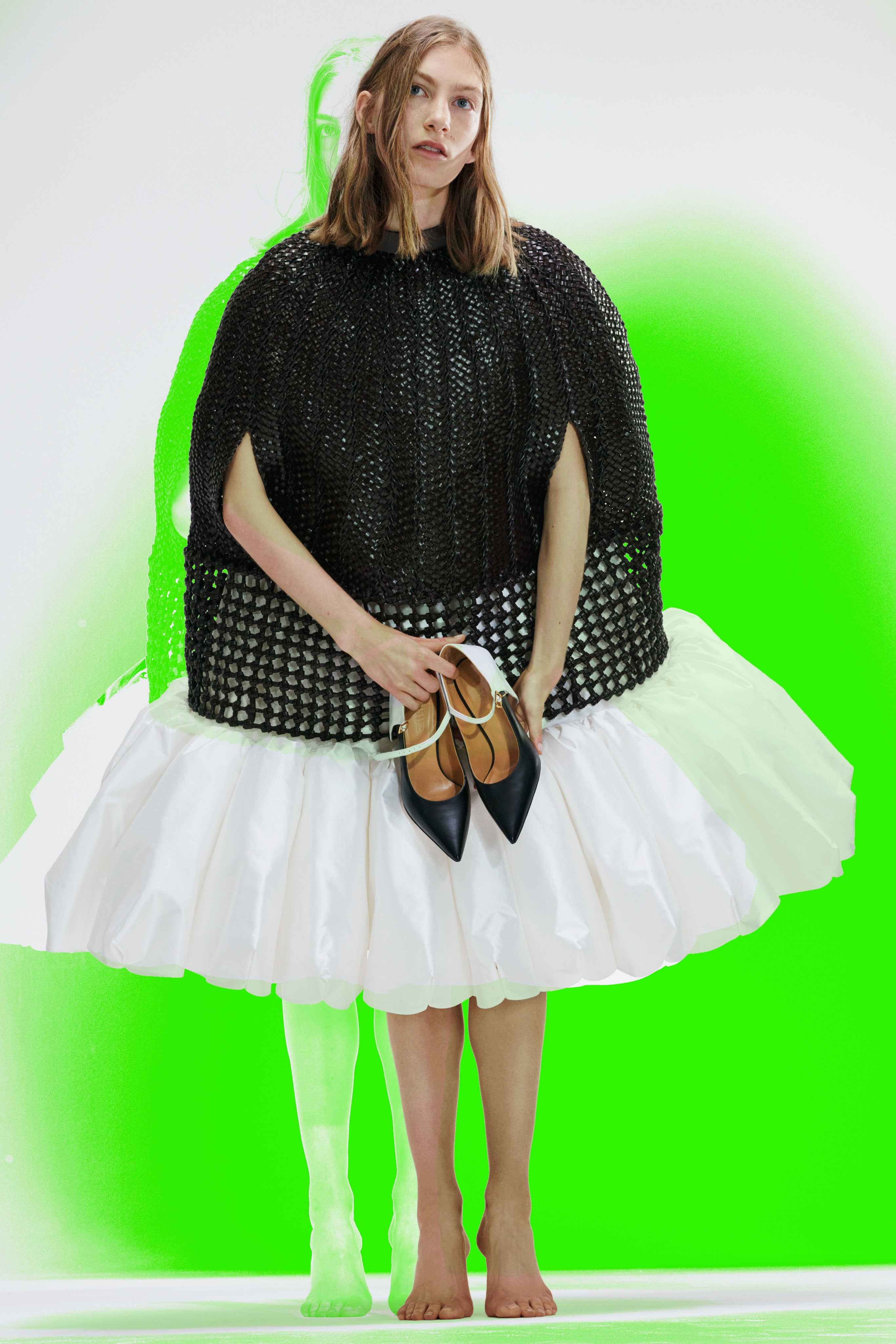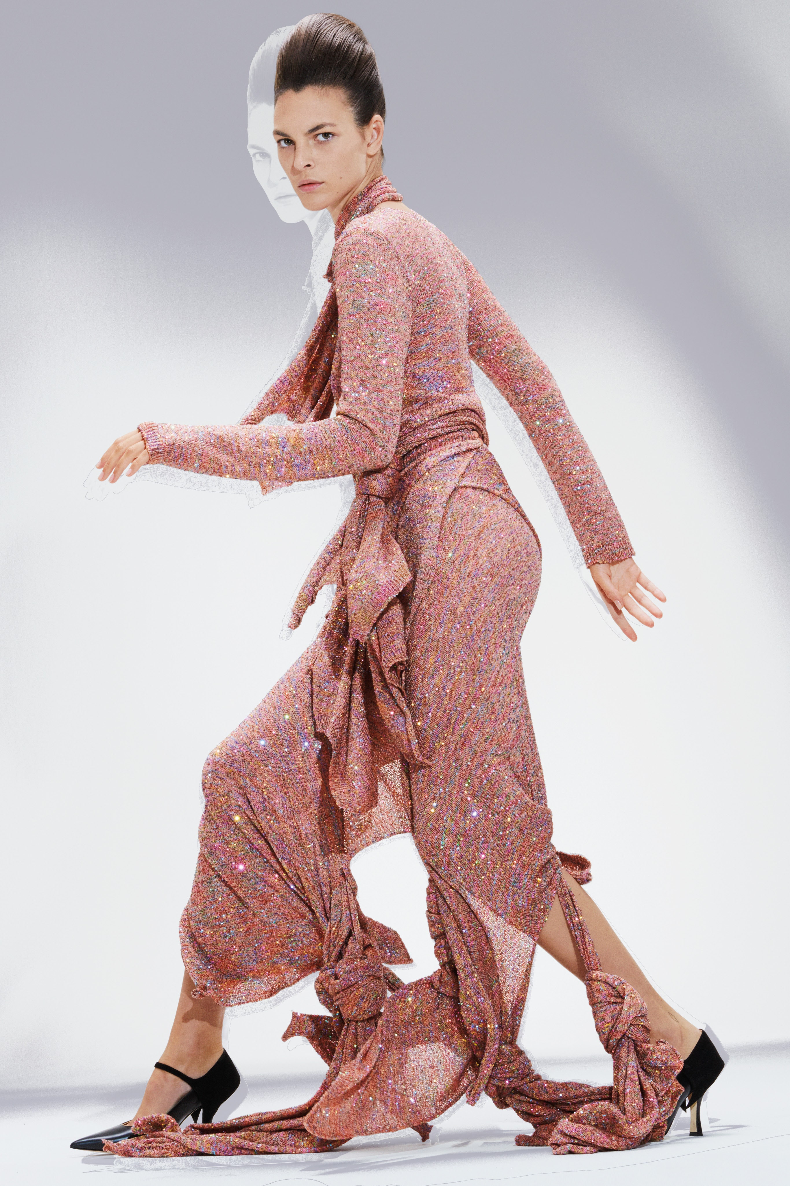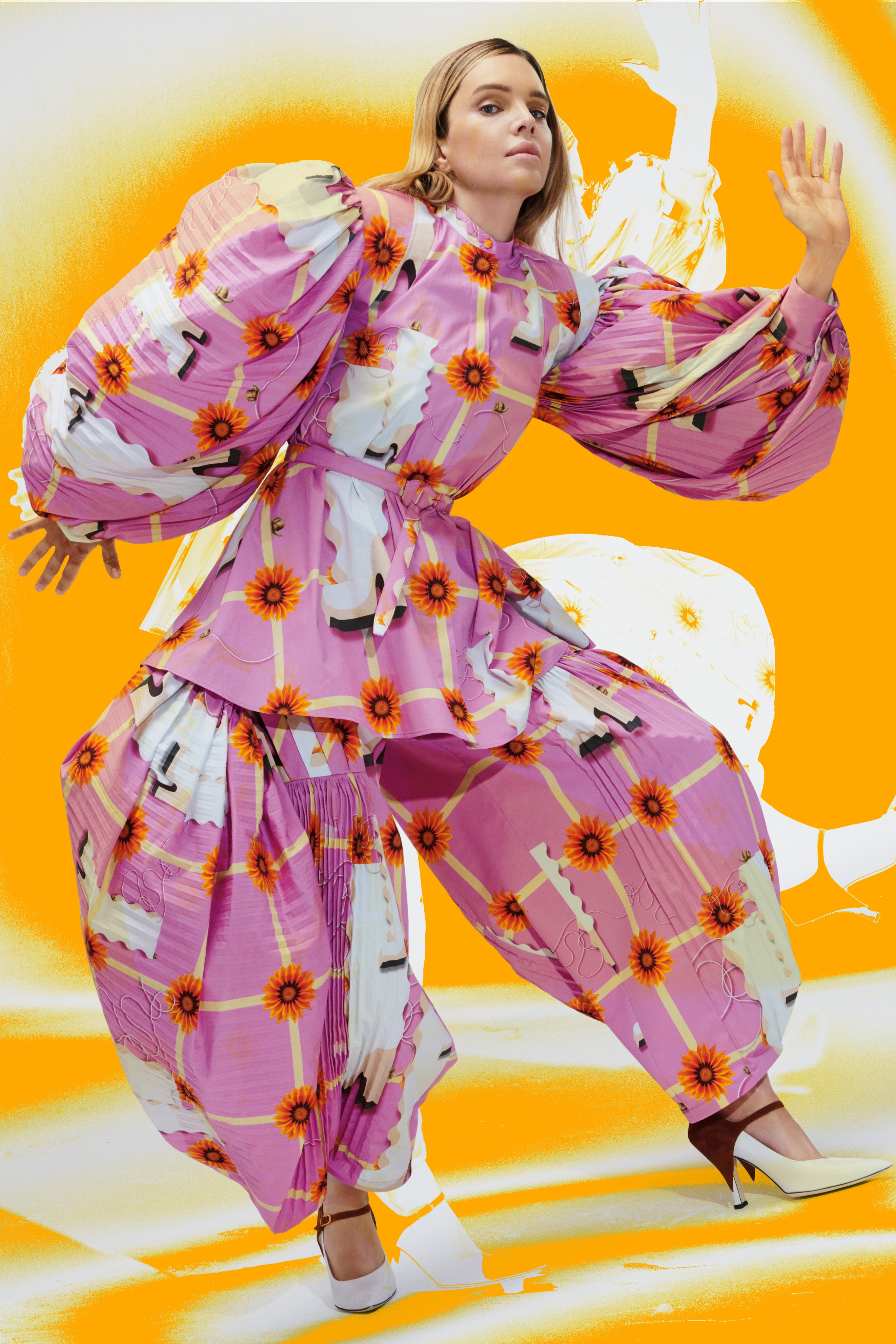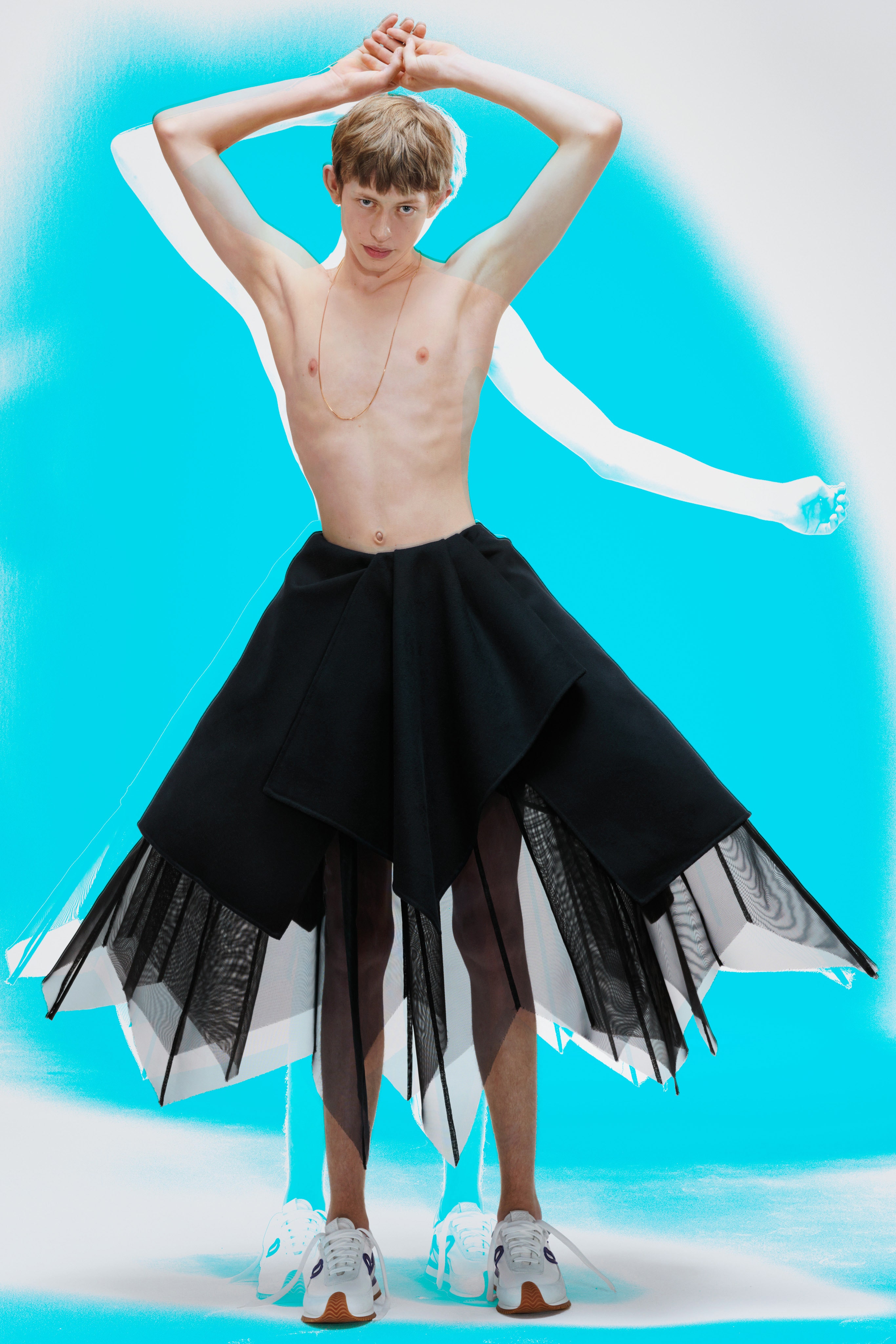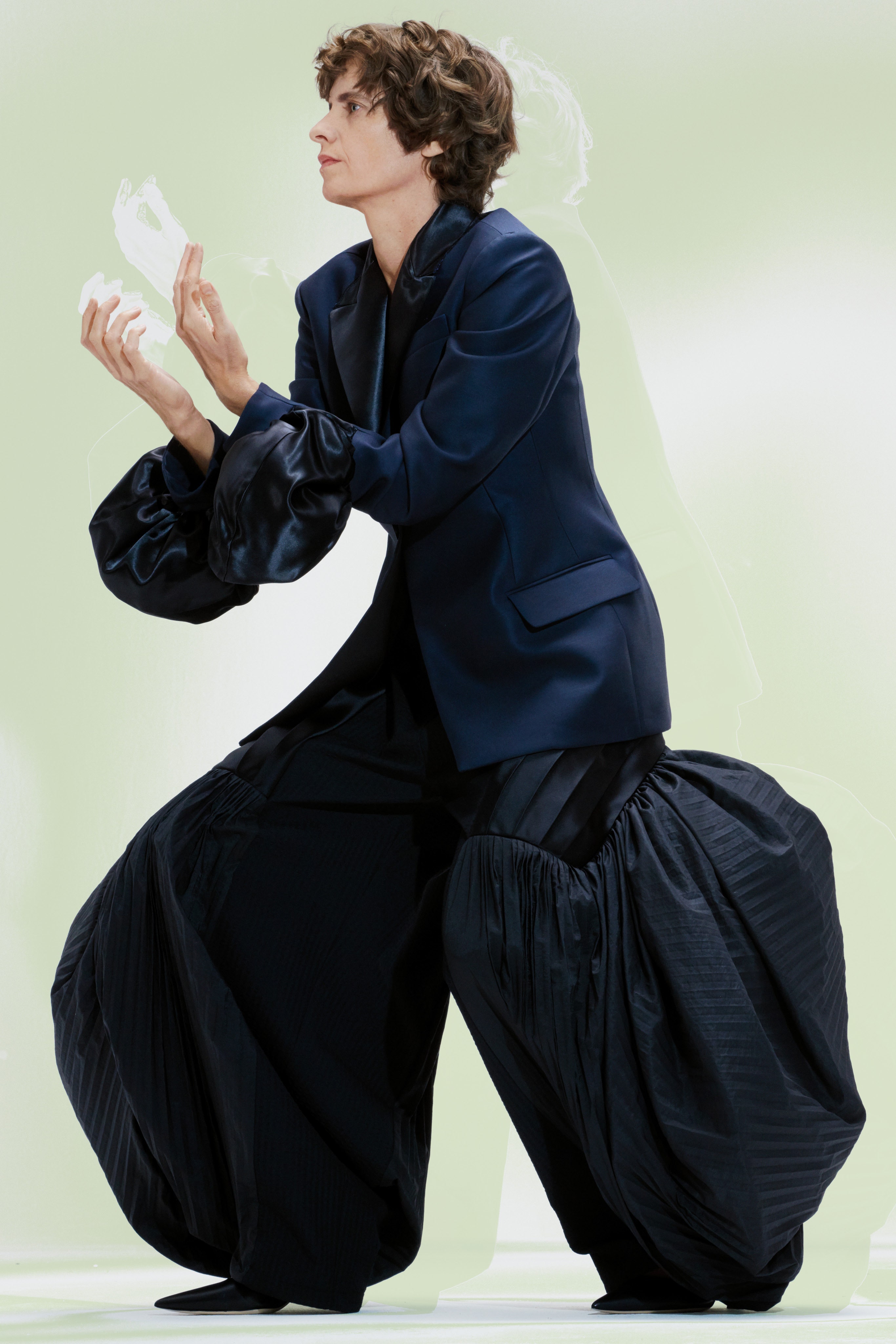 Узнаваемые для дизайнера силуэты разрослись до фантастических. Блестящий облегающий наряд в духе молодого Дэвида Боуи будто разрезан на лоскуты и связан узлами. Платья макси из тафты похожи на мантии, а пышные юбки созданы вне гендерных традиций — их в лукбуке бренда примерили модели-мужчины. Один из самых эффектных костюмов из едва заметно плиссированного шелка покрыт принтом из гербер и клетки.