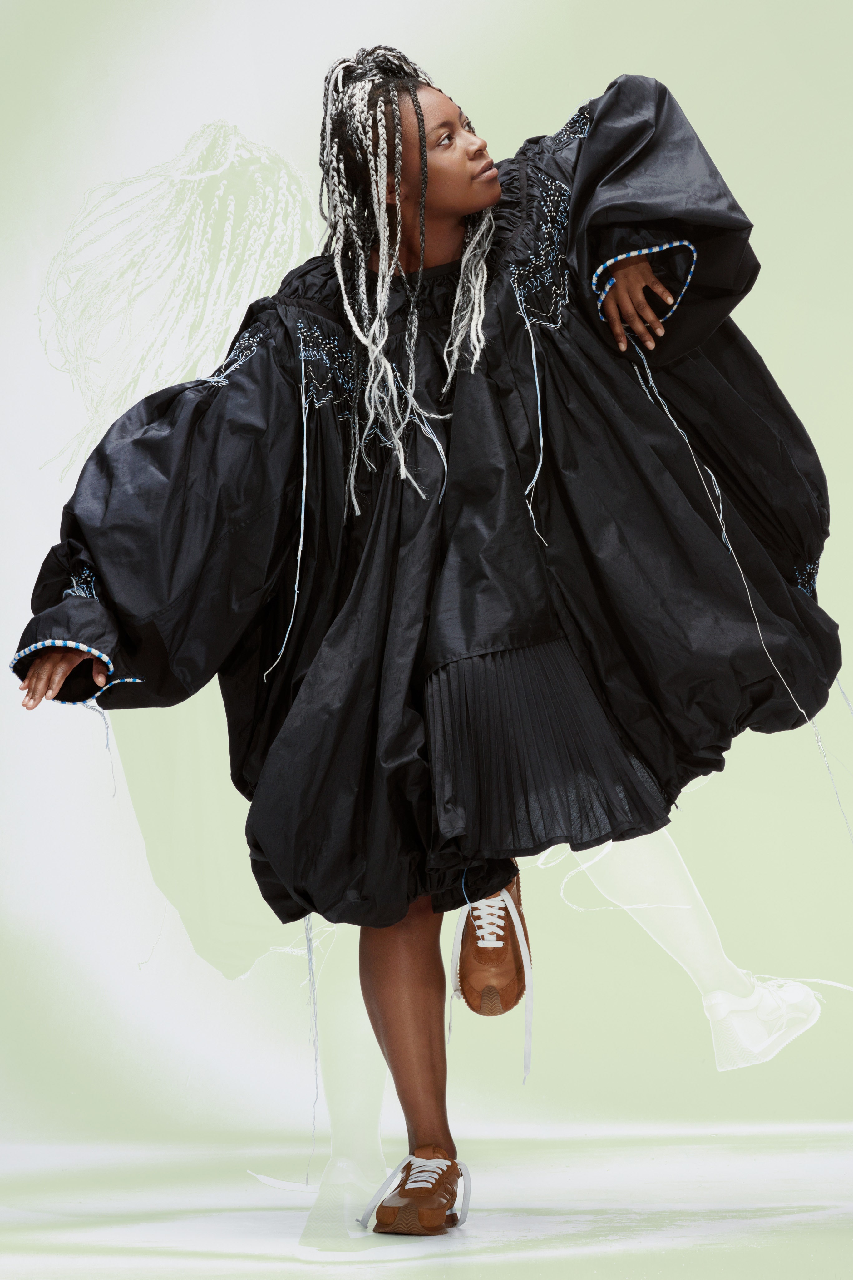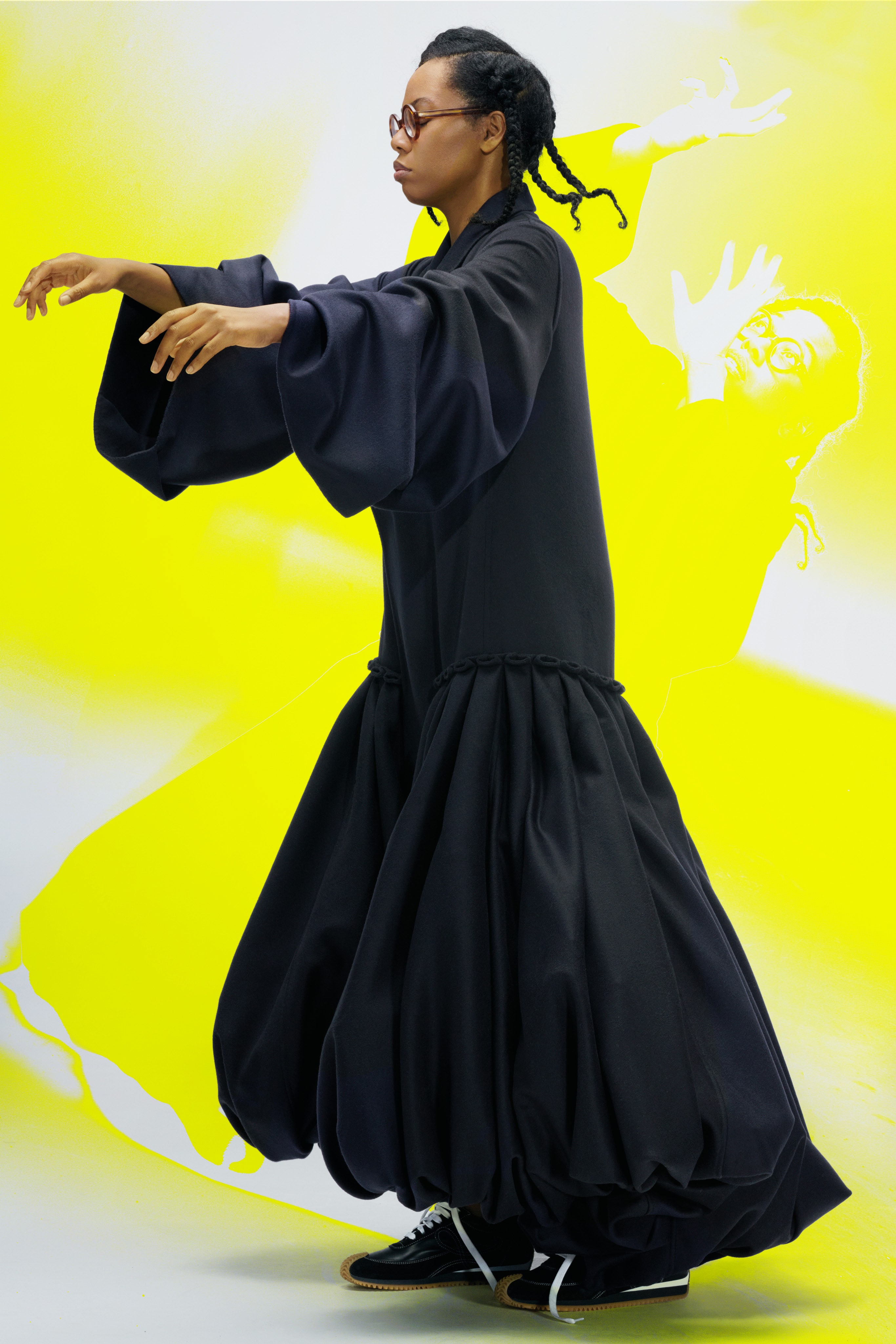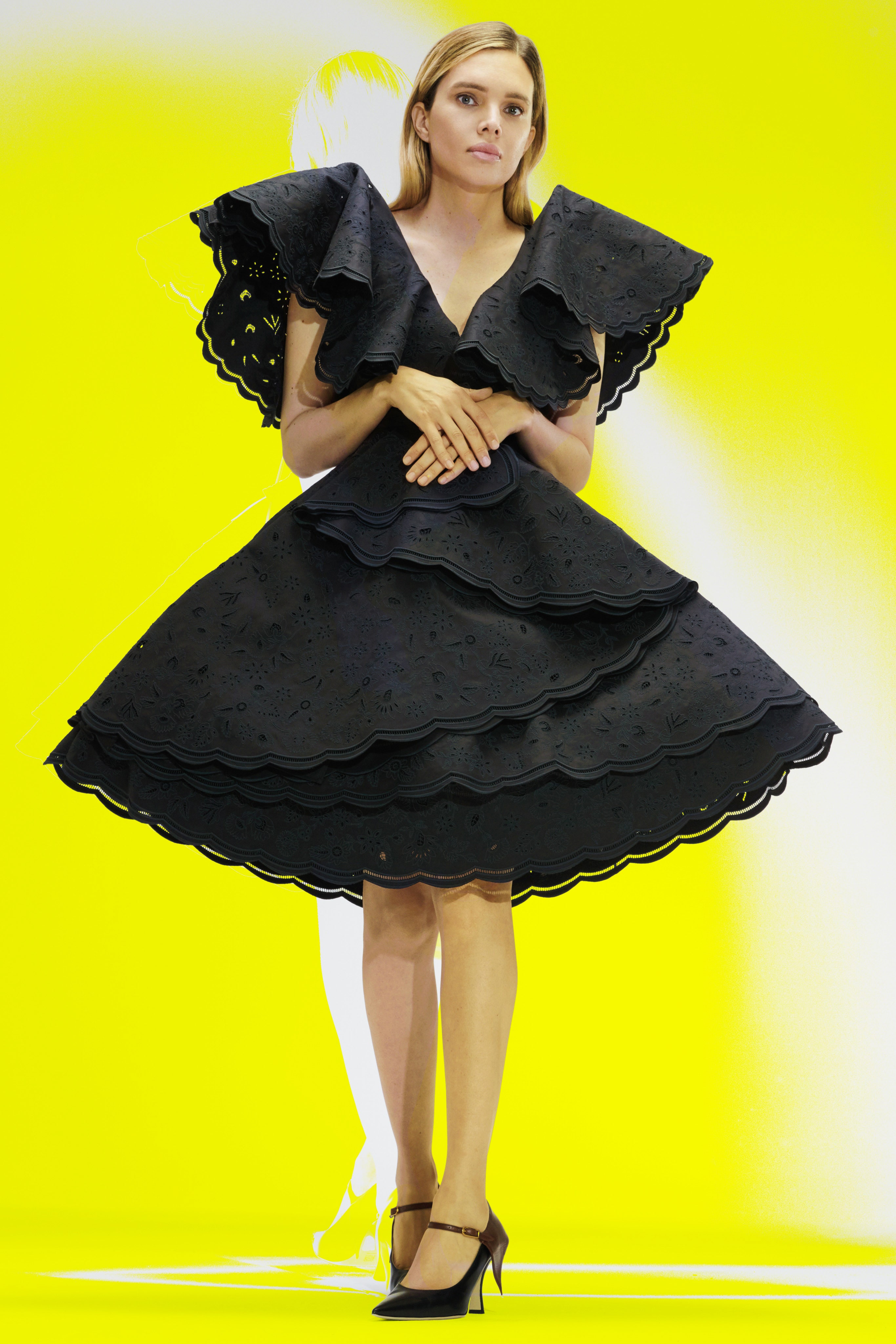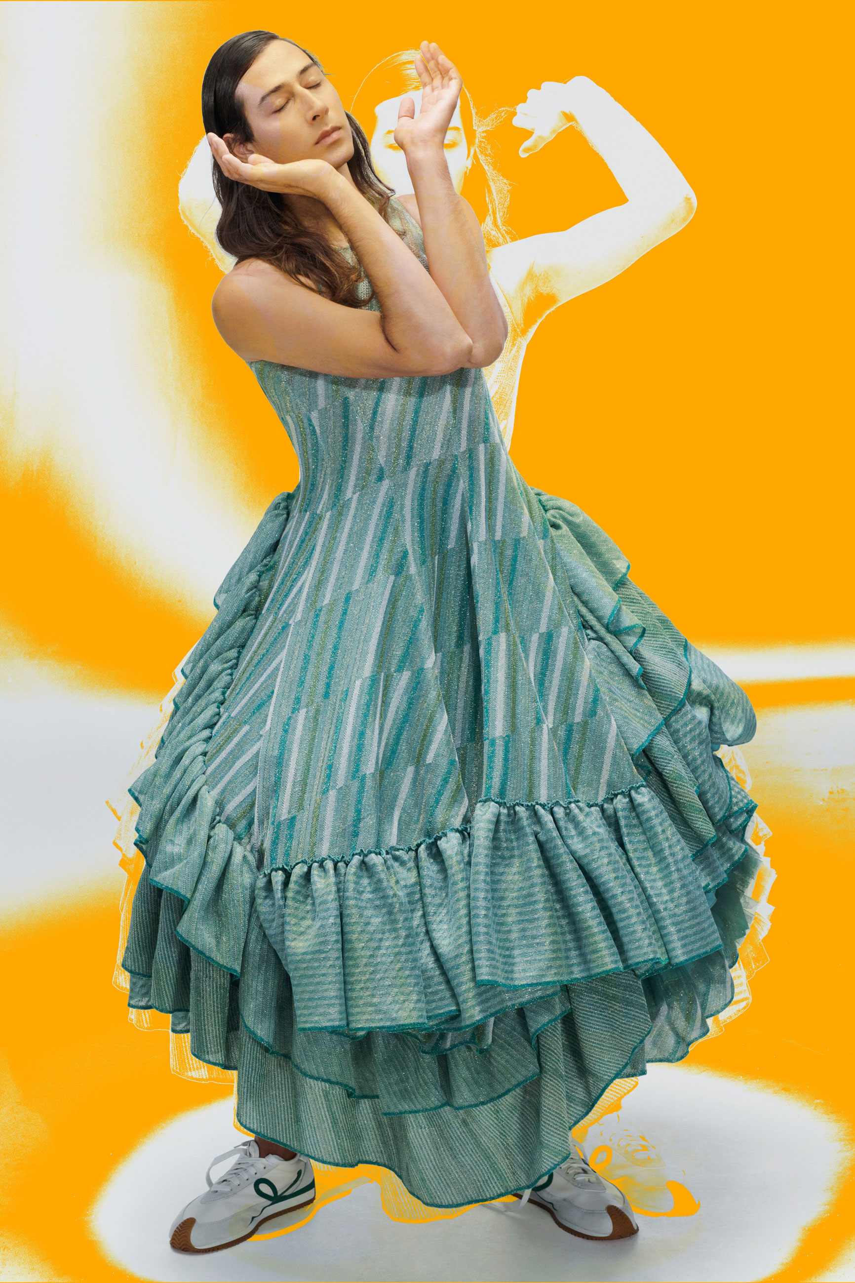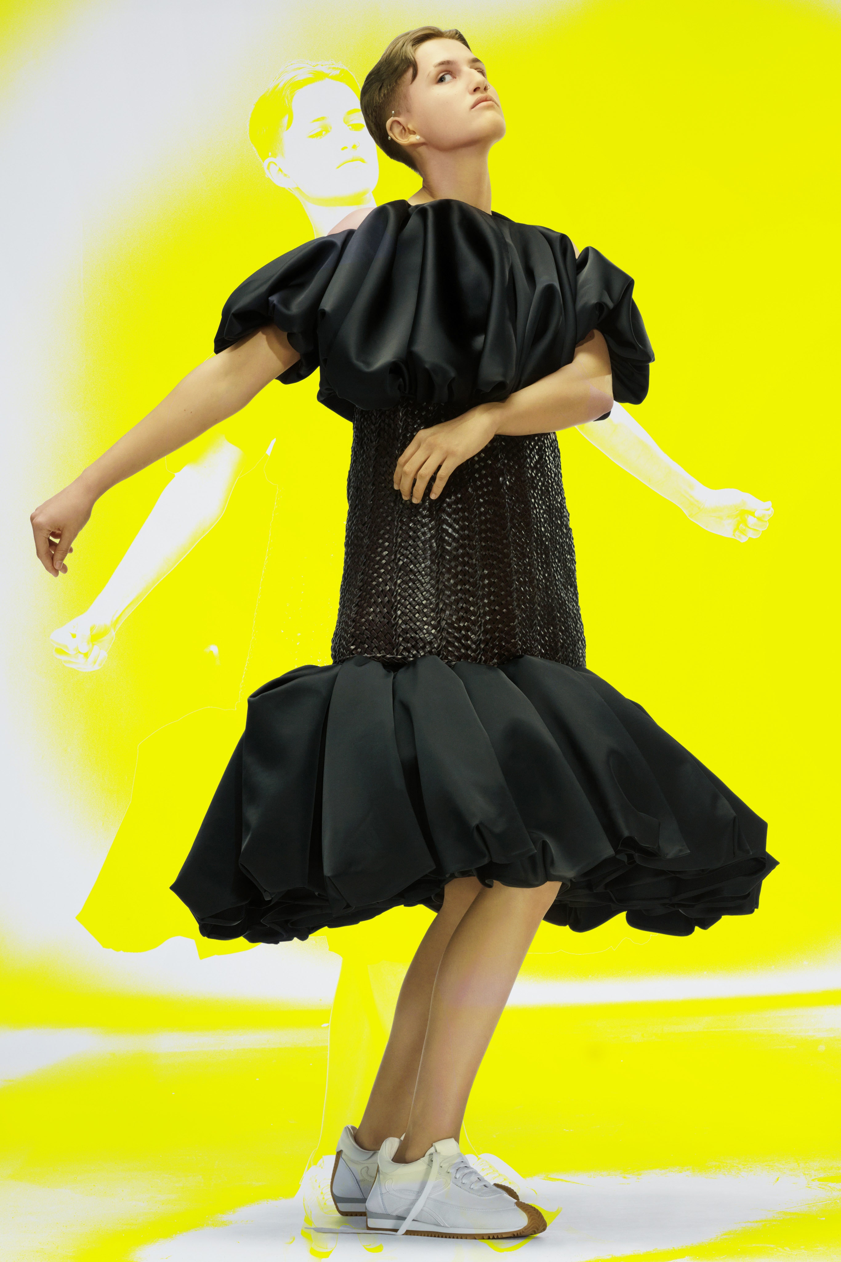 Узнаваемые для дизайнера силуэты разрослись до фантастических. Блестящий облегающий наряд в духе молодого Дэвида Боуи будто разрезан на лоскуты и связан узлами. Платья макси из тафты похожи на мантии, а пышные юбки созданы вне гендерных традиций — их в лукбуке бренда примерили модели-мужчины. Один из самых эффектных костюмов из едва заметно плиссированного шелка покрыт принтом из гербер и клетки.