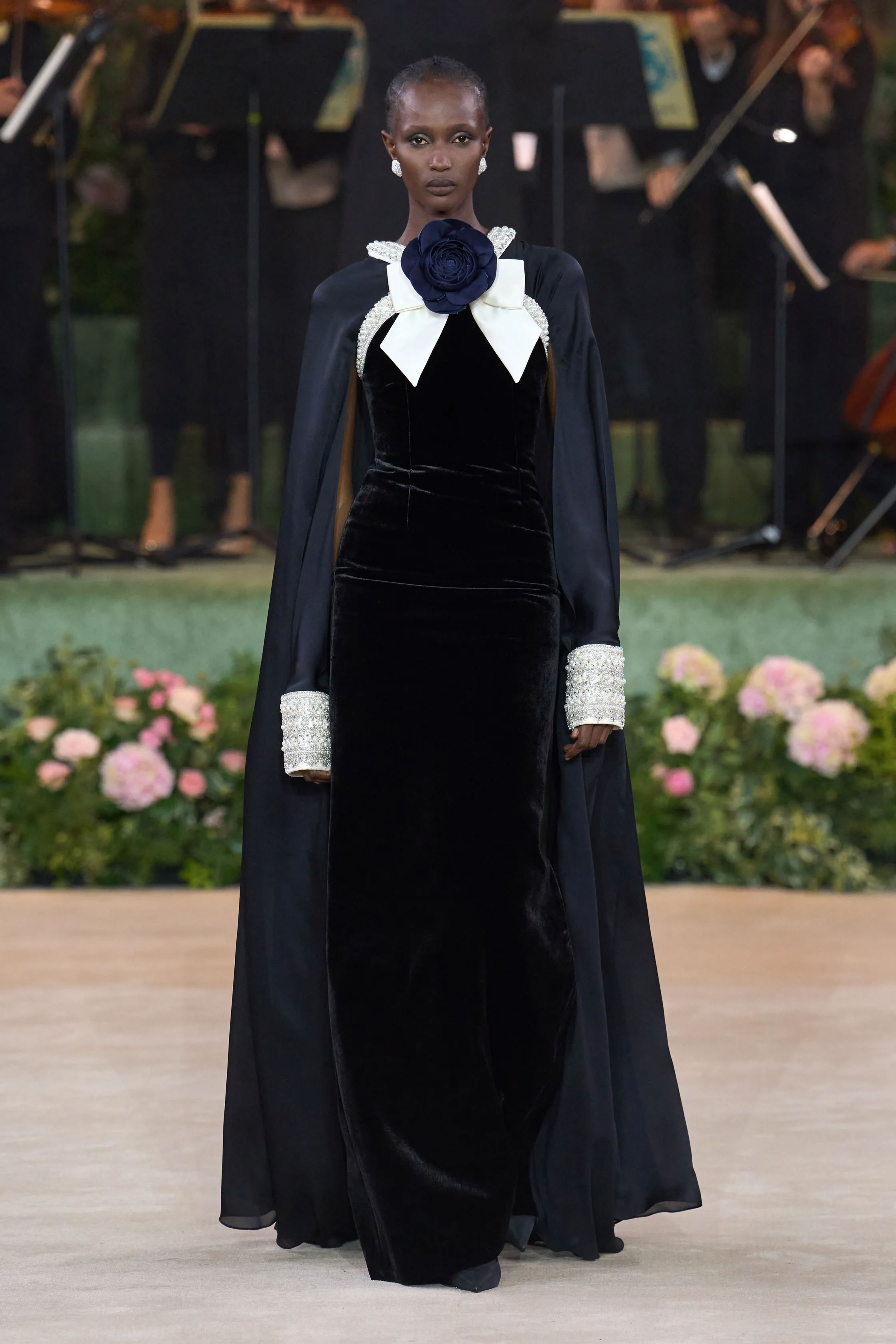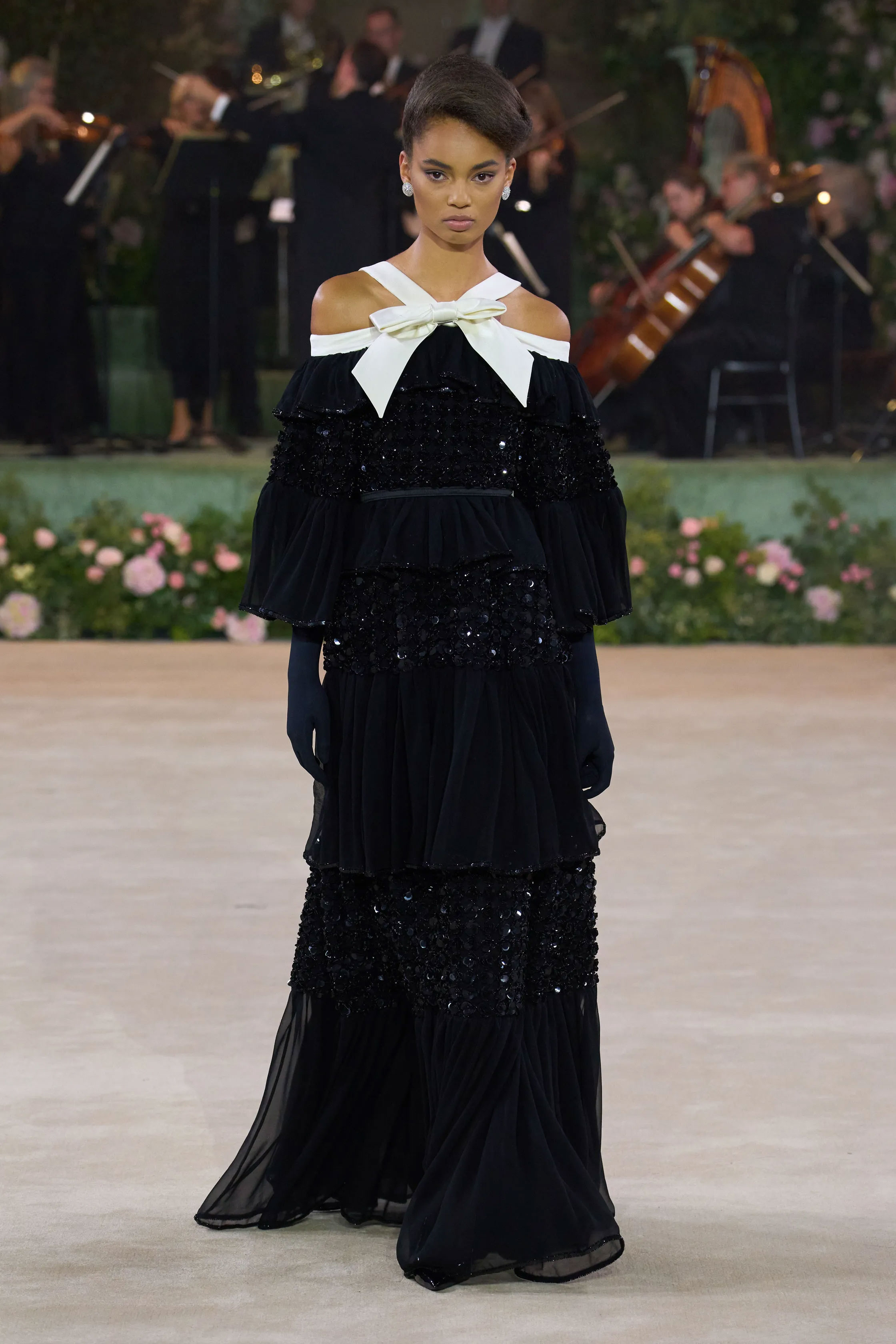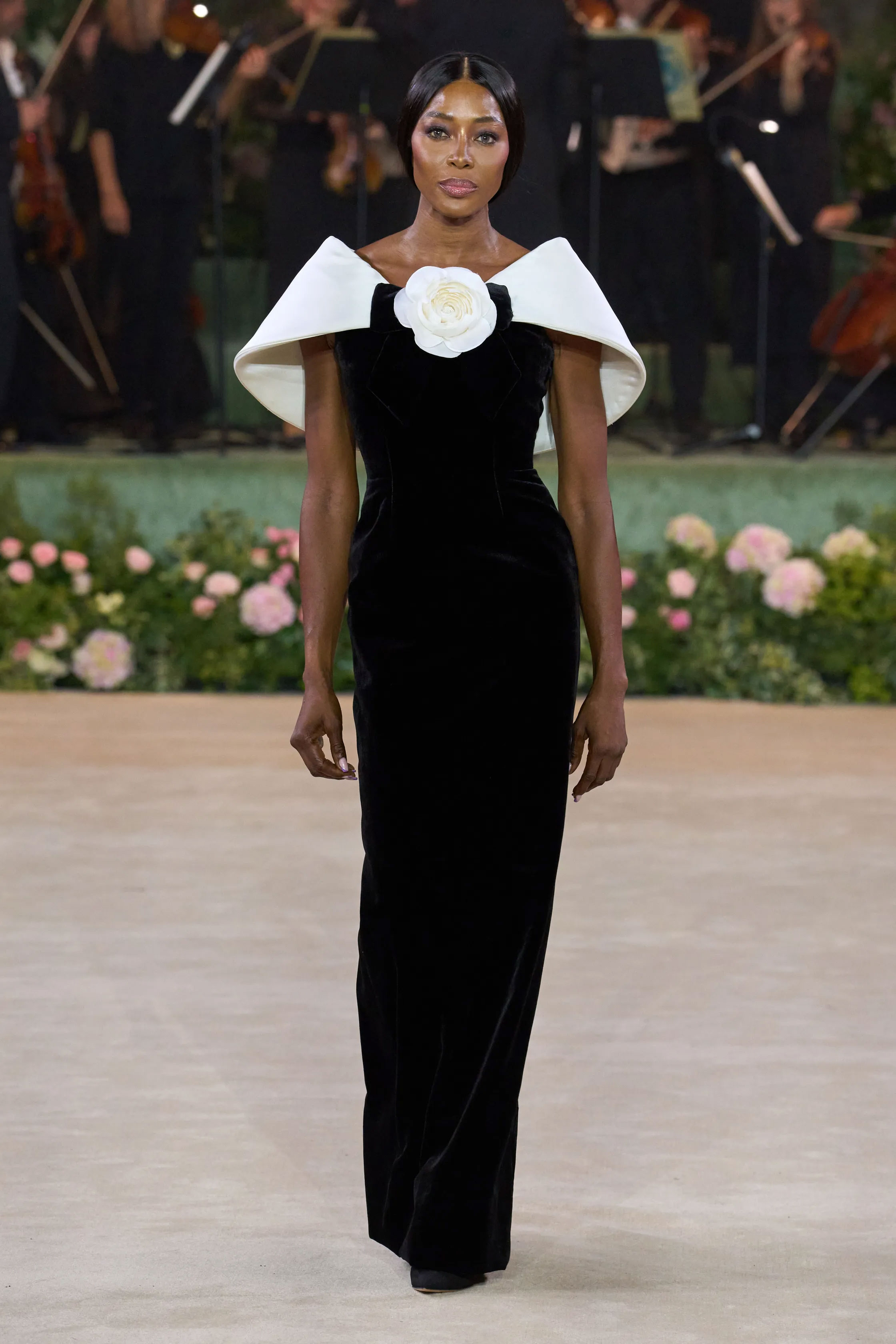 Шоу RICHARD QUINN відбулося в декораціях, що нагадували оперну постановку: старовинний театральний фон, восьмиметрові вежі з гортензій, оркестр, хор і сяйво шести кришталевих люстр. Показ відкрила Наомі Кемпбелл у чорній оксамитовій сукні з параболічним білим коміром, прикрашеним камелією та об’ємним бантом. Далі на подіумі з’явилися 52 образи — корсети, пишні спідниці, дюжини нижніх спідниць, метри атласу й розсипи кристалів.