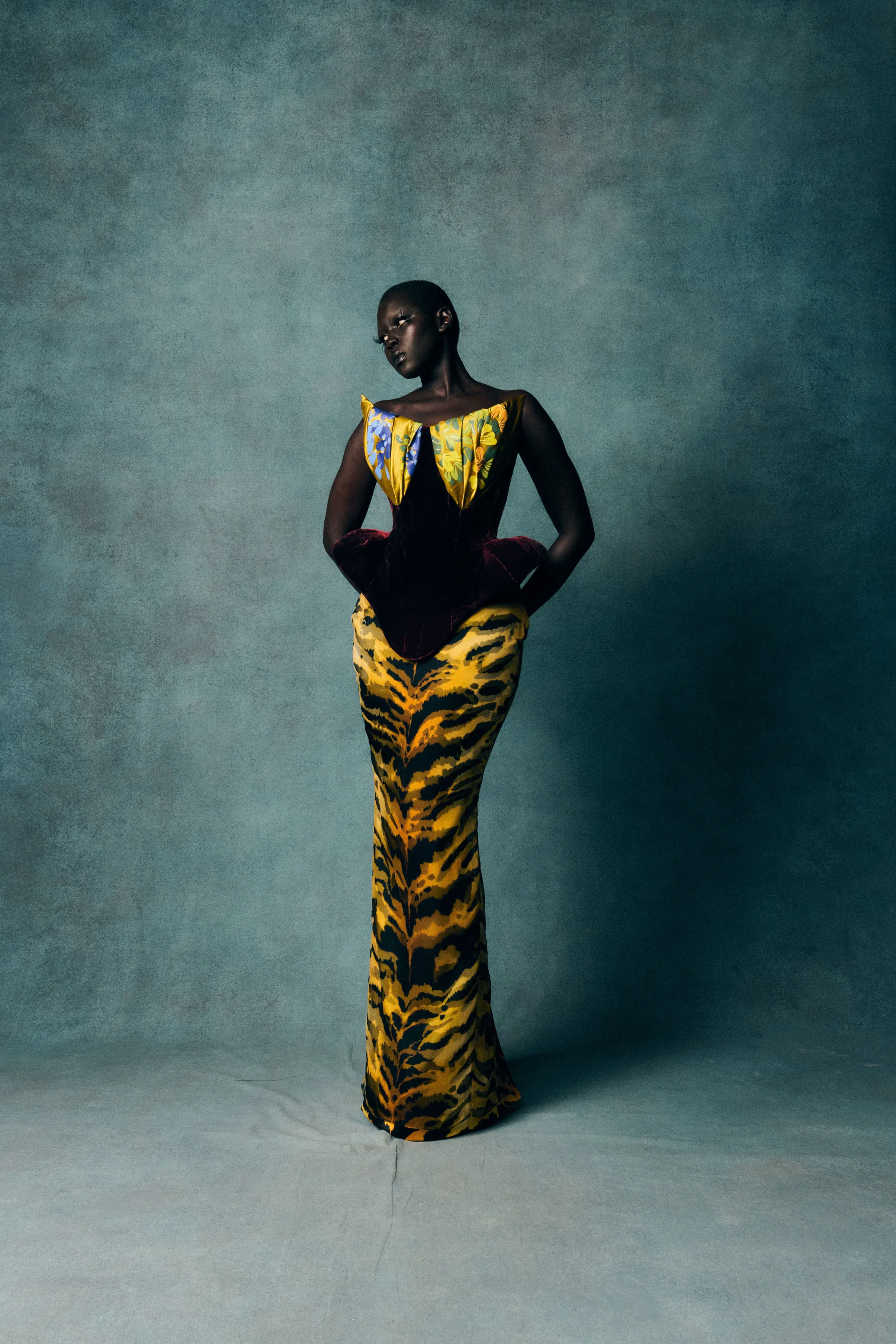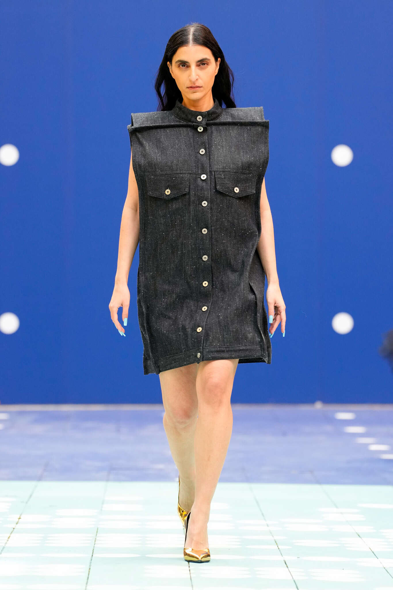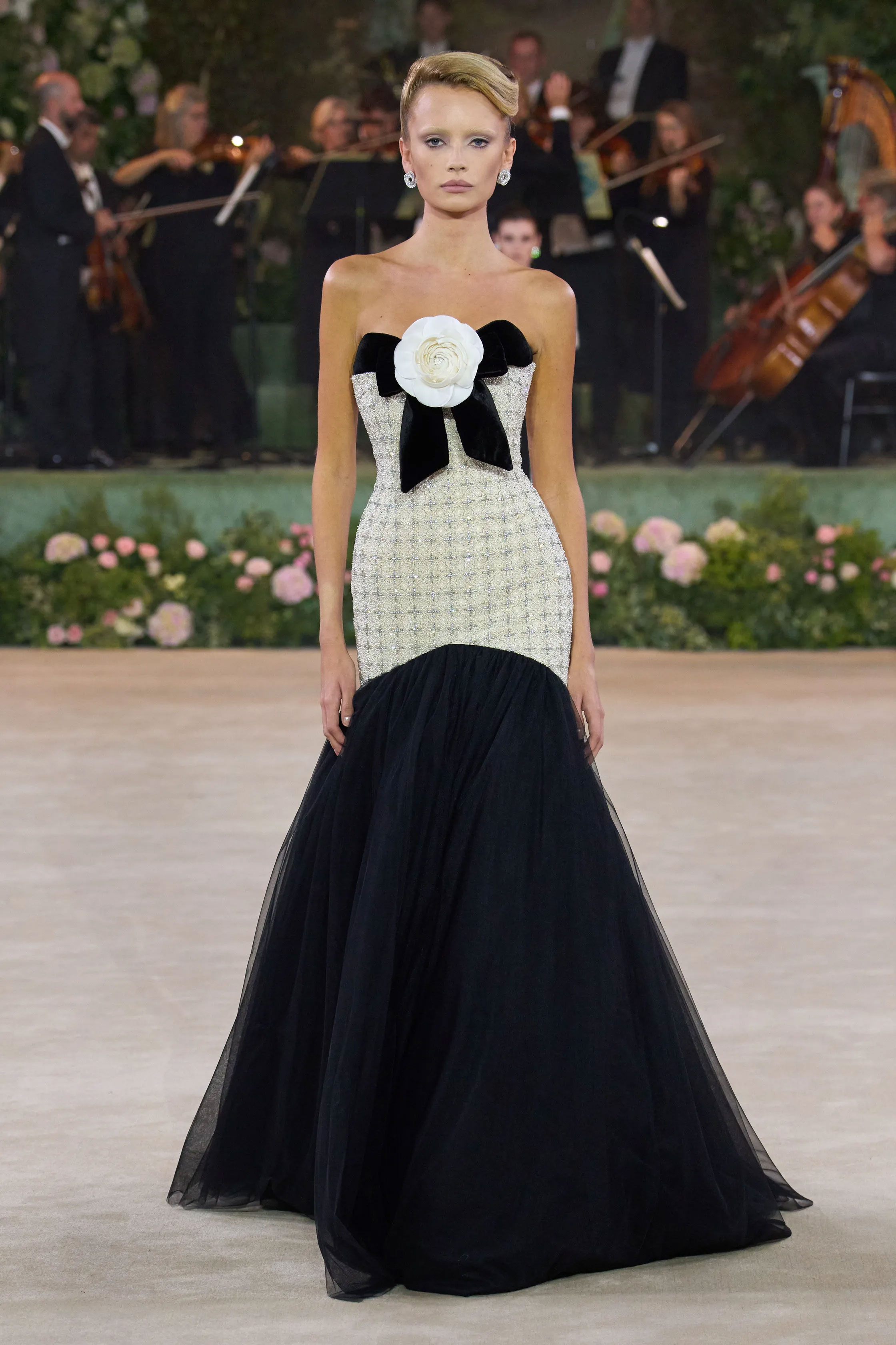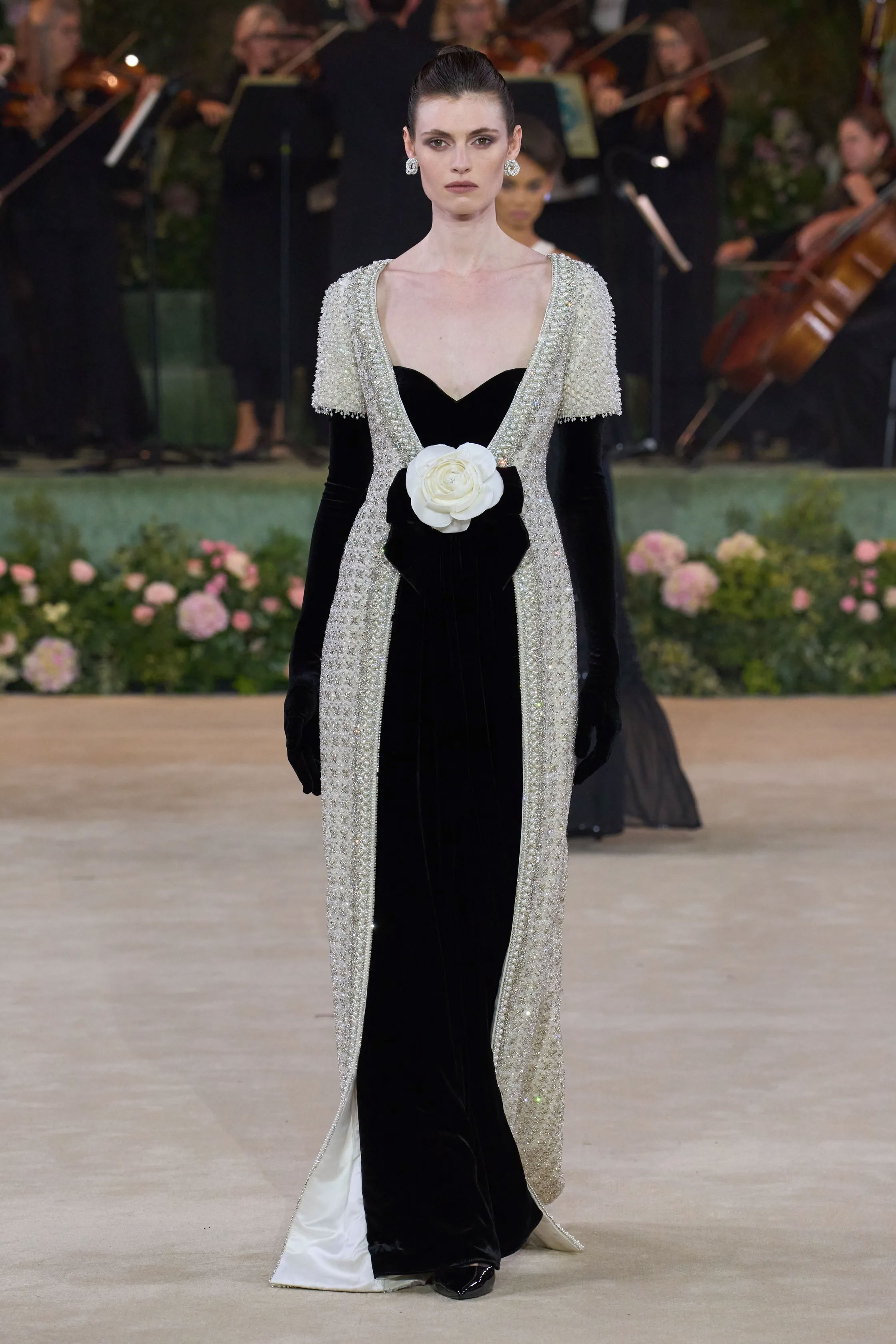 Шоу RICHARD QUINN відбулося в декораціях, що нагадували оперну постановку: старовинний театральний фон, восьмиметрові вежі з гортензій, оркестр, хор і сяйво шести кришталевих люстр. Показ відкрила Наомі Кемпбелл у чорній оксамитовій сукні з параболічним білим коміром, прикрашеним камелією та об’ємним бантом. Далі на подіумі з’явилися 52 образи — корсети, пишні спідниці, дюжини нижніх спідниць, метри атласу й розсипи кристалів.