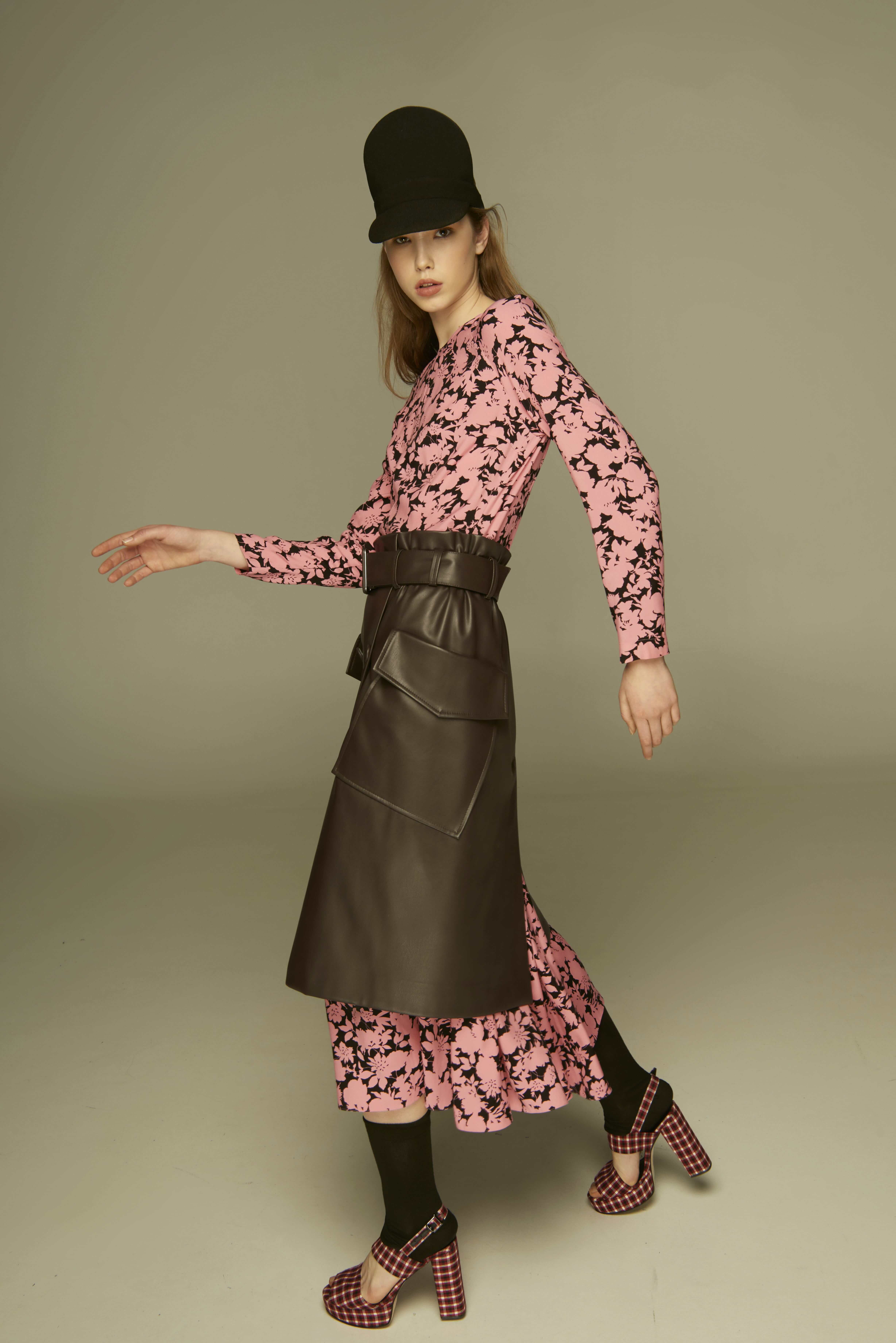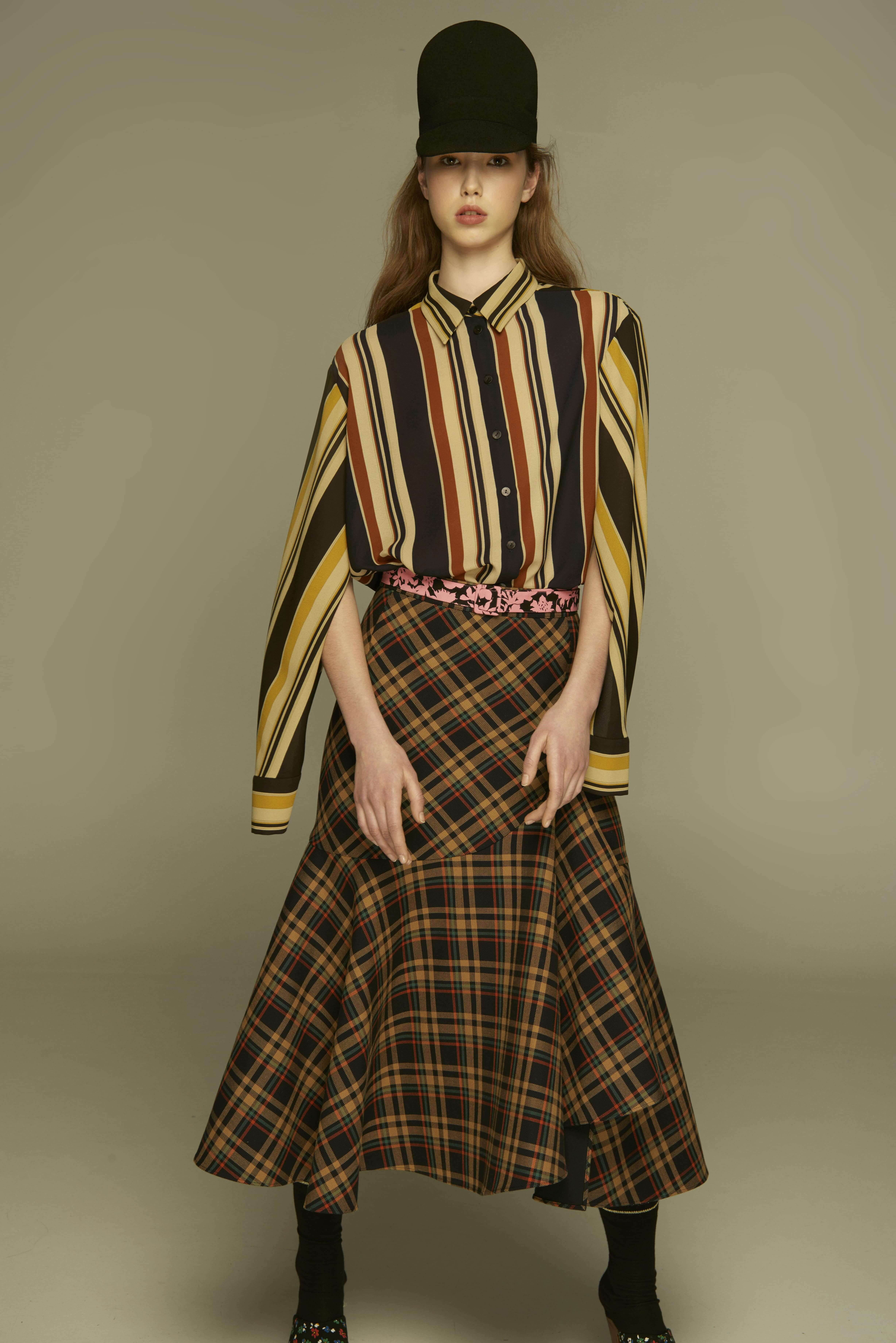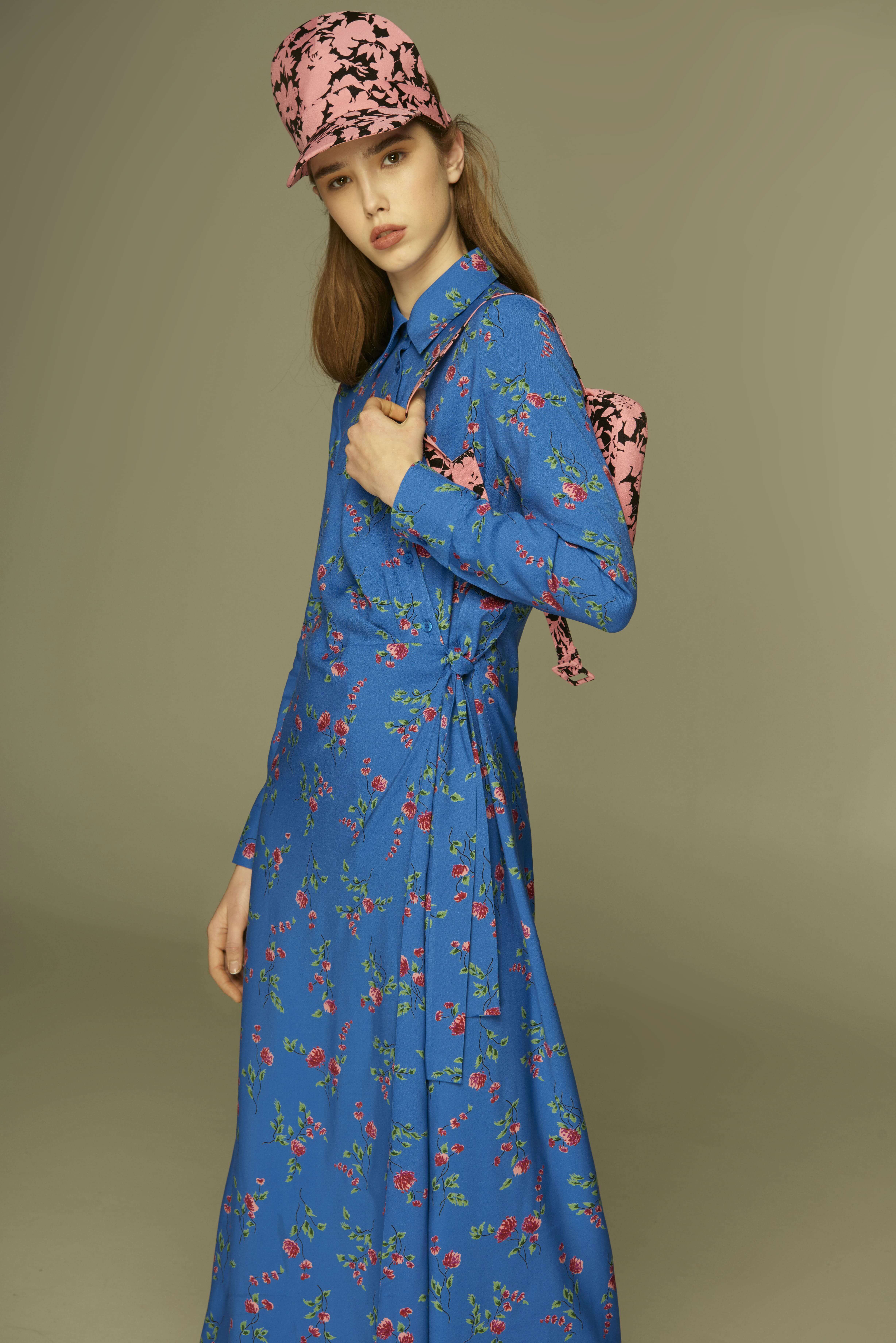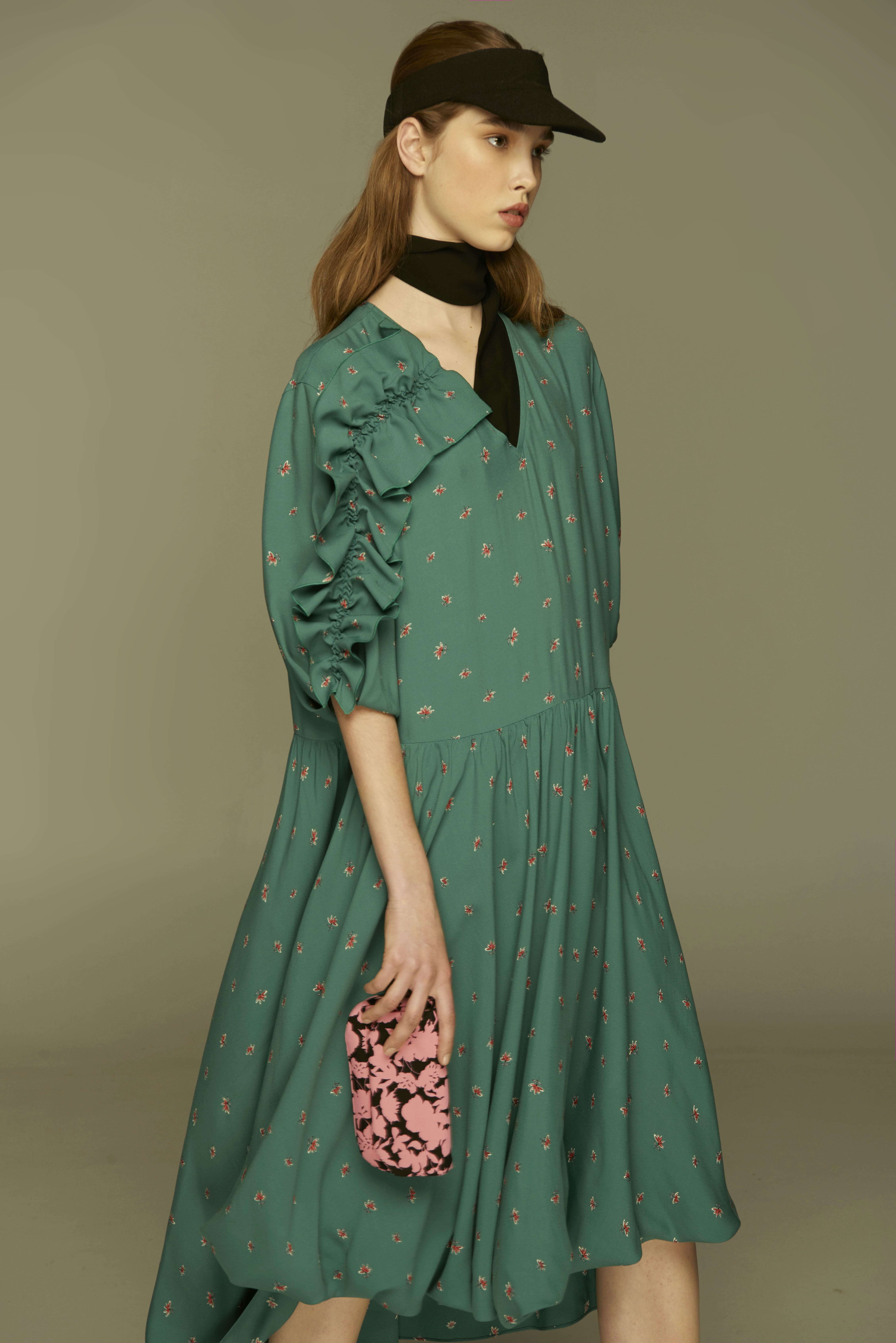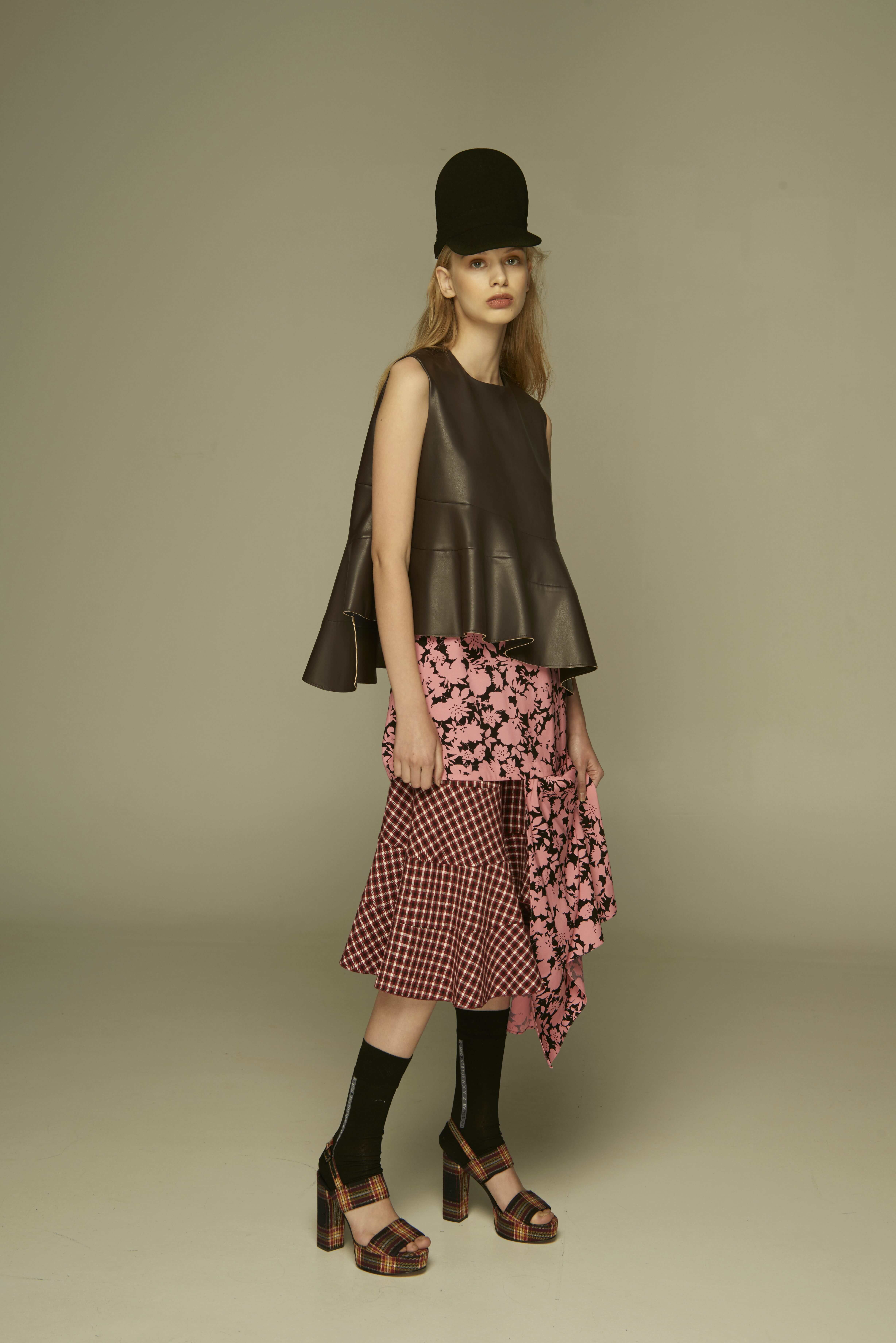 В коллекции присутствуют элегантные и уютные пальто, нежные платья, необычных форм головные уборы. Сочетания цветочных принтов с размытой клеткой, вкрапления ярких оттенков розового или нежно-голубого эффектно аккомпанируют объёмным конструкциям вещей, многослойности и разнообразию фактур.
