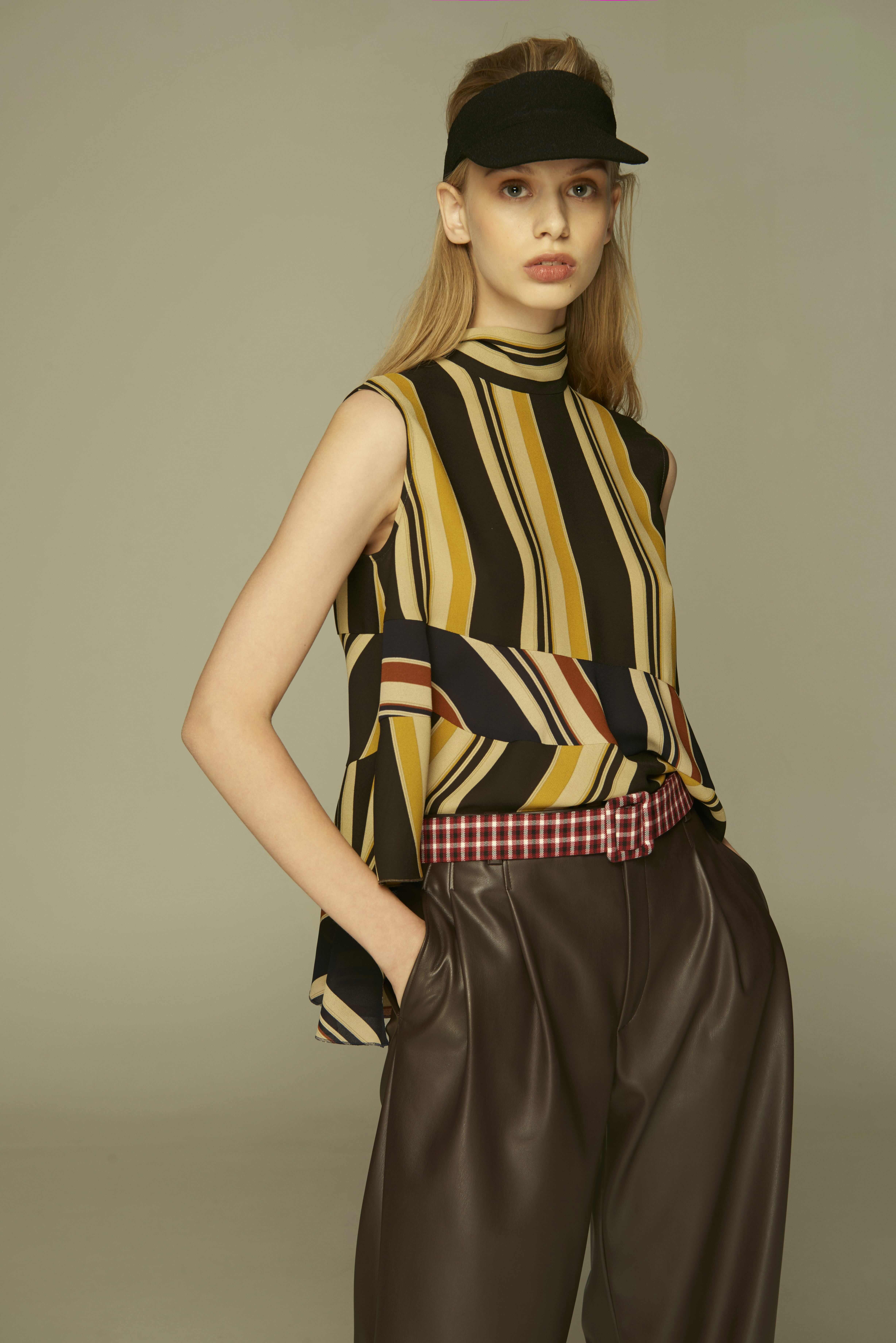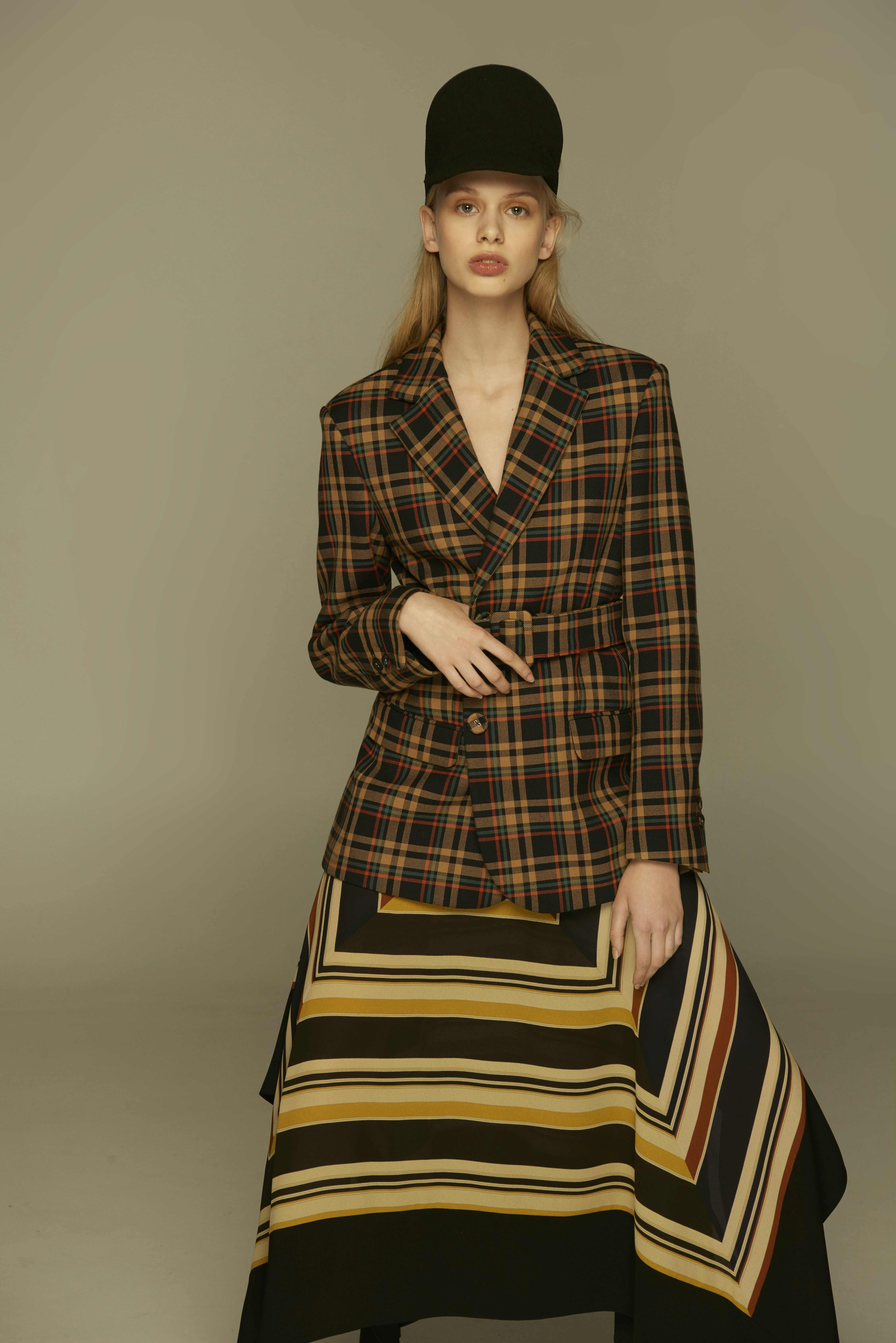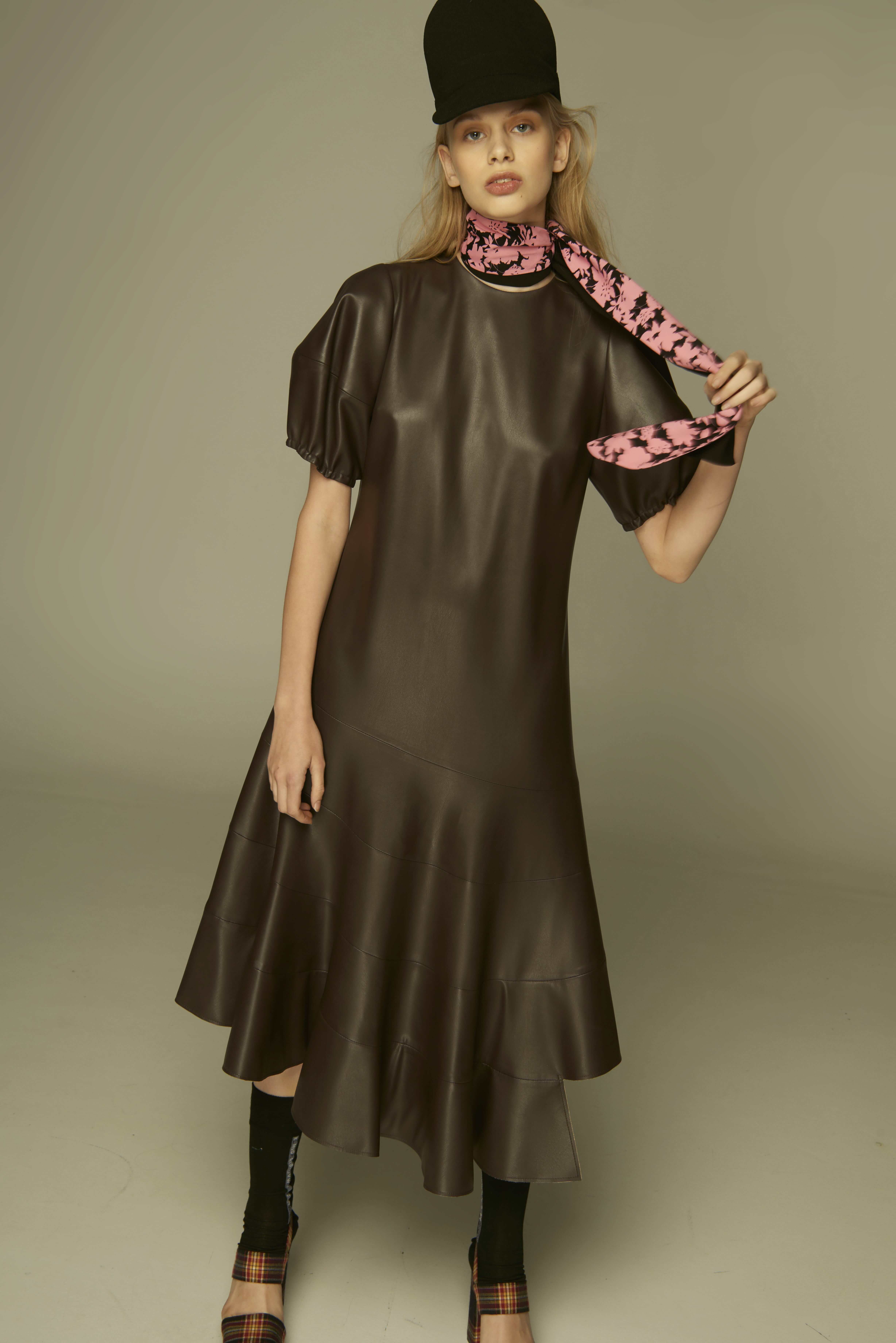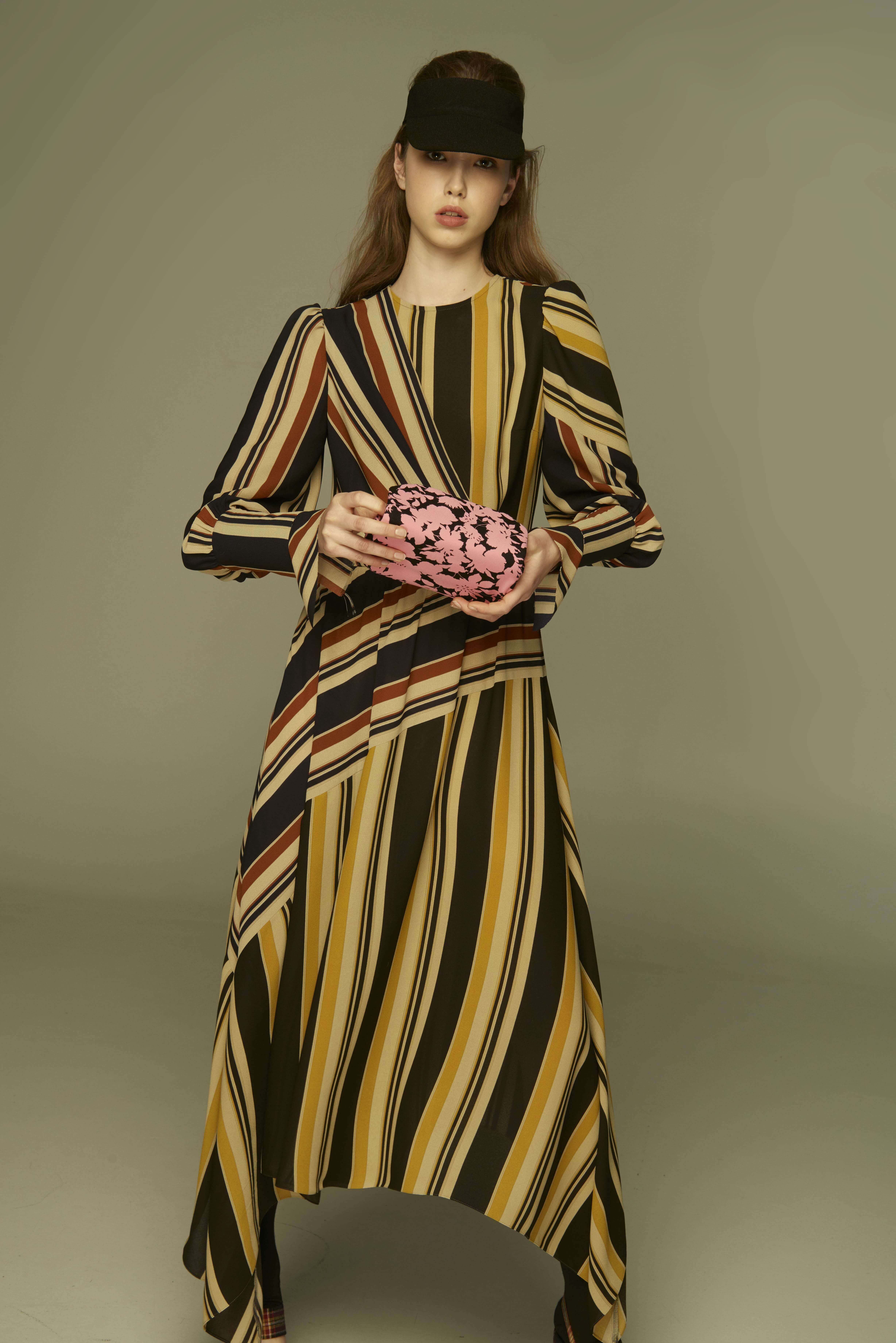 В коллекции присутствуют элегантные и уютные пальто, нежные платья, необычных форм головные уборы. Сочетания цветочных принтов с размытой клеткой, вкрапления ярких оттенков розового или нежно-голубого эффектно аккомпанируют объёмным конструкциям вещей, многослойности и разнообразию фактур.
