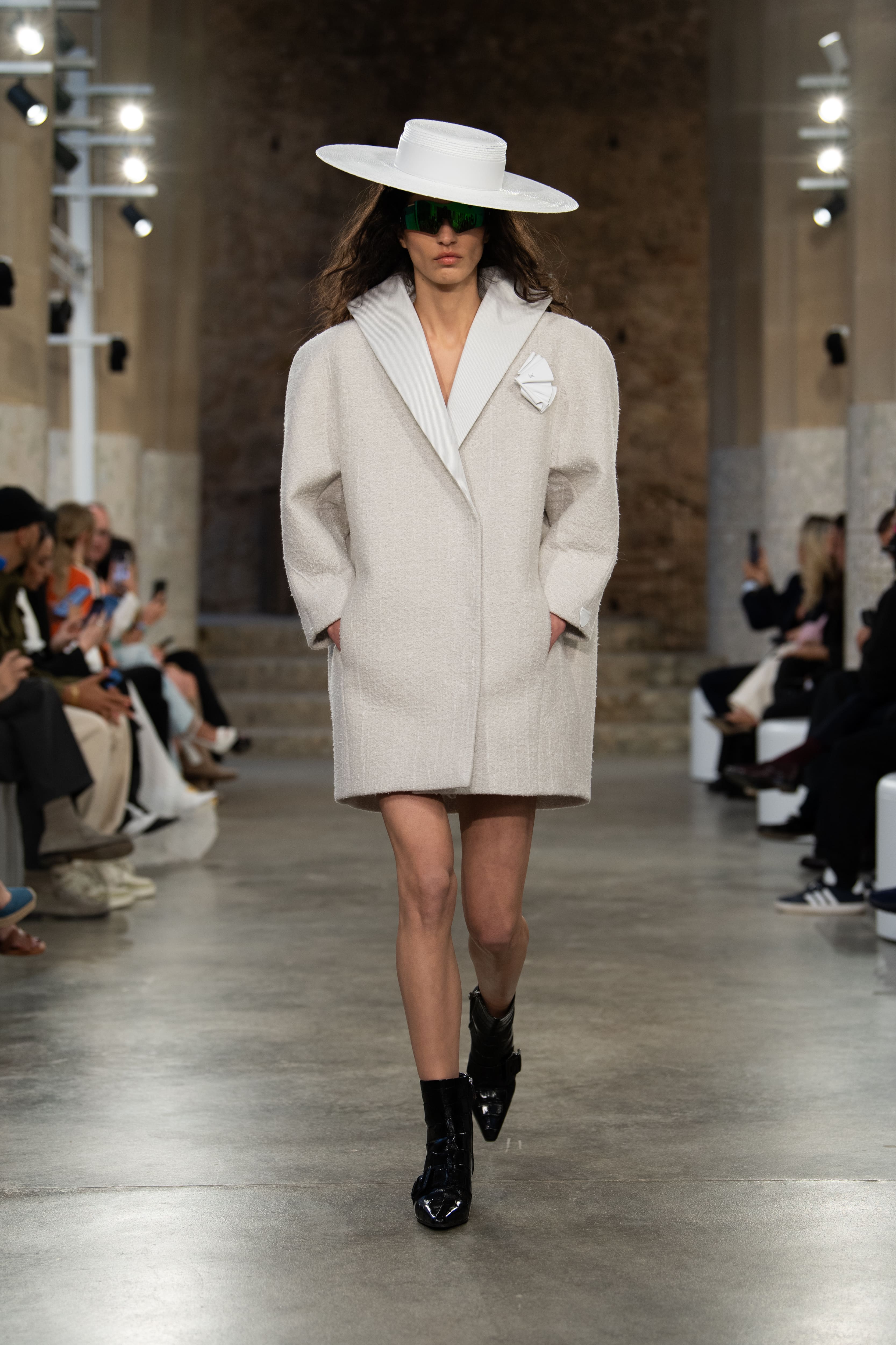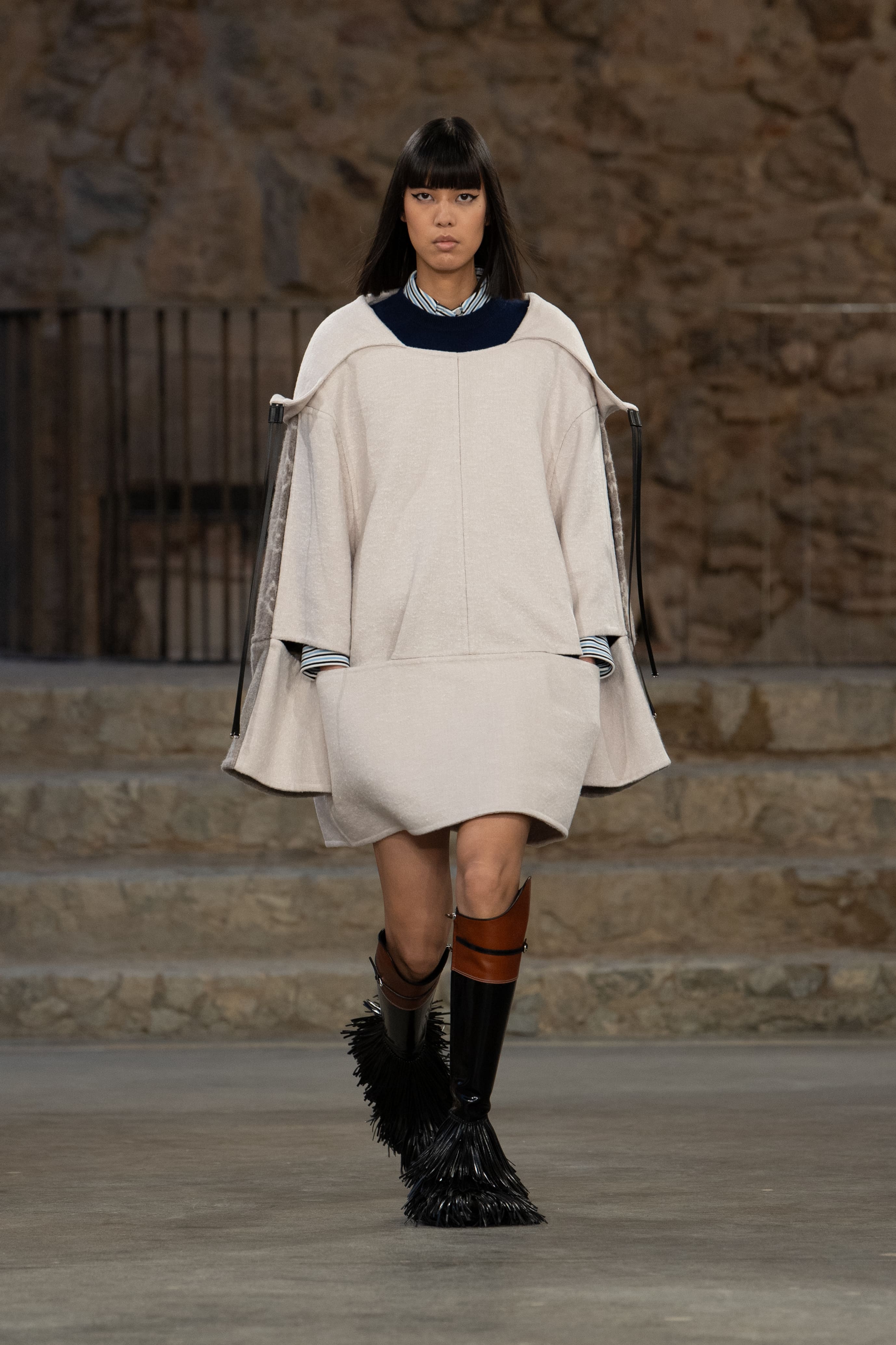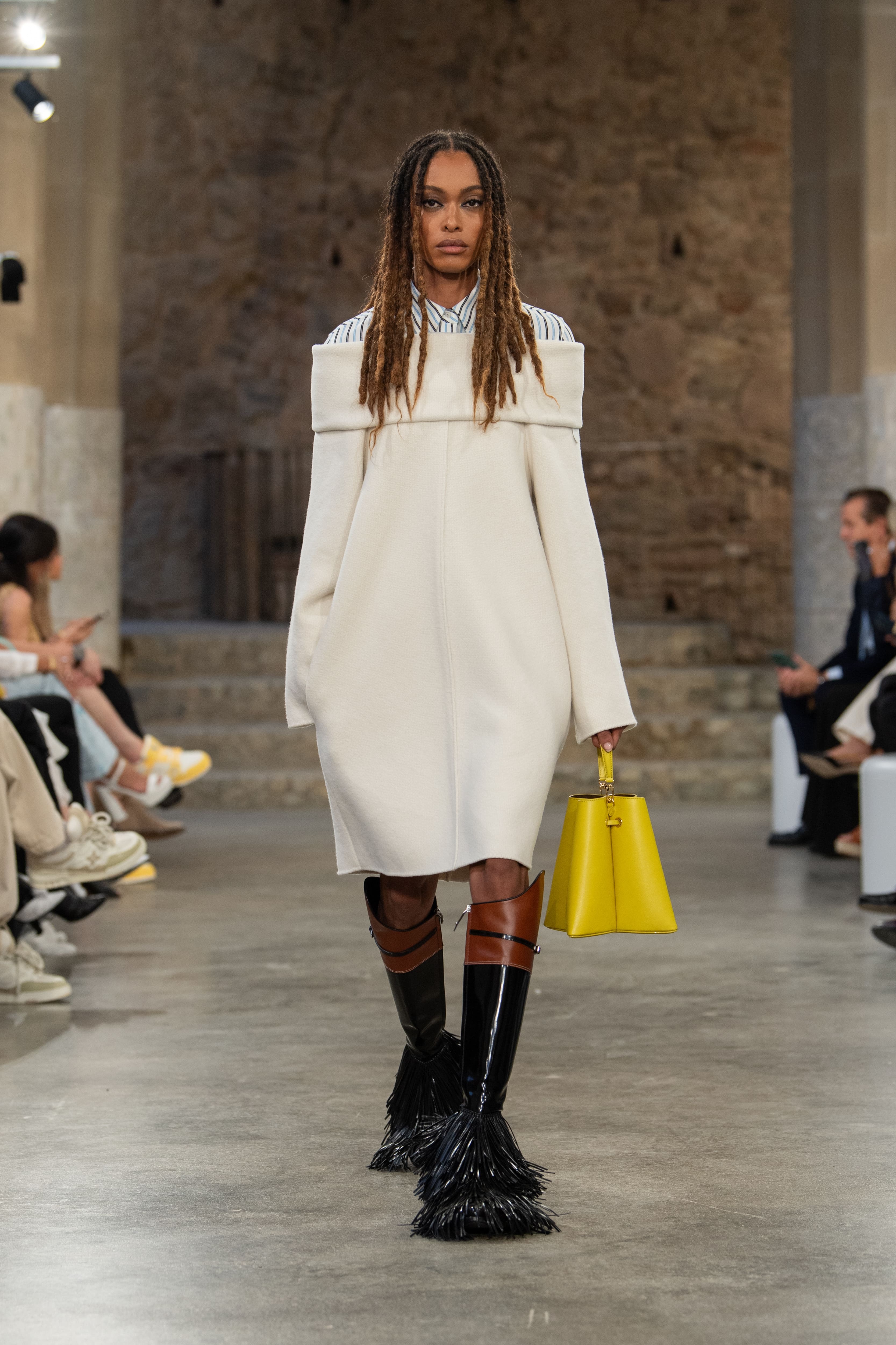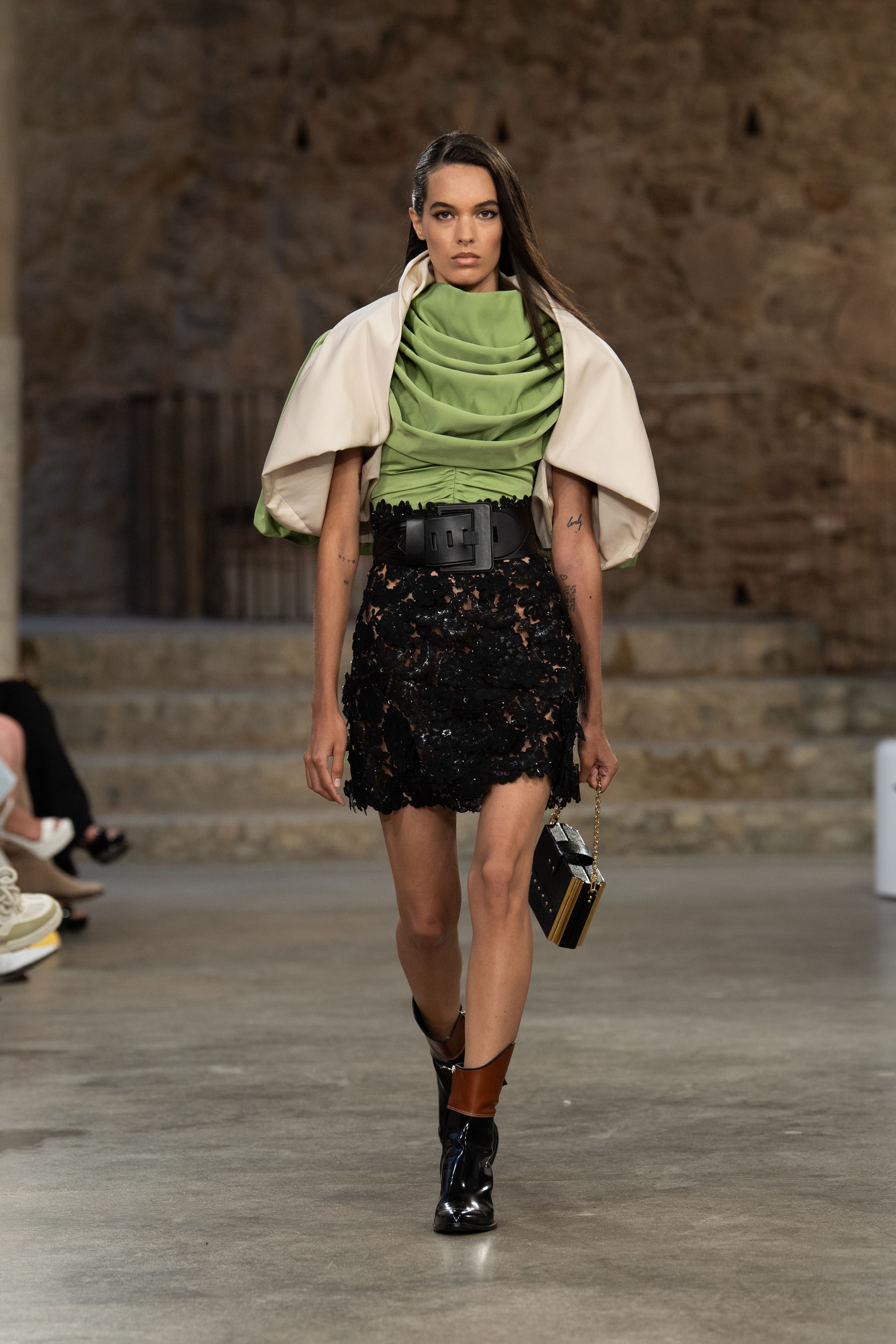 У нову іспанську подорож креативний директор Ніколя Геск’єр рушив із друзями дому — Софі Тернер, Леа Сейду, Сіршою Ронан, Хлоєю Грейс Морец та Фібі Дайневор. До фронт-роу доєднався і його колега Жюльєн Досенна — креативний директор Rabanne, історія дому й засновника якого — іспанця Пако Рабанна — надихнула дизайнера Louis Vuitton на створення такої ж експериментальної, як і інші образи, деконструйованої мереживної спідниці.