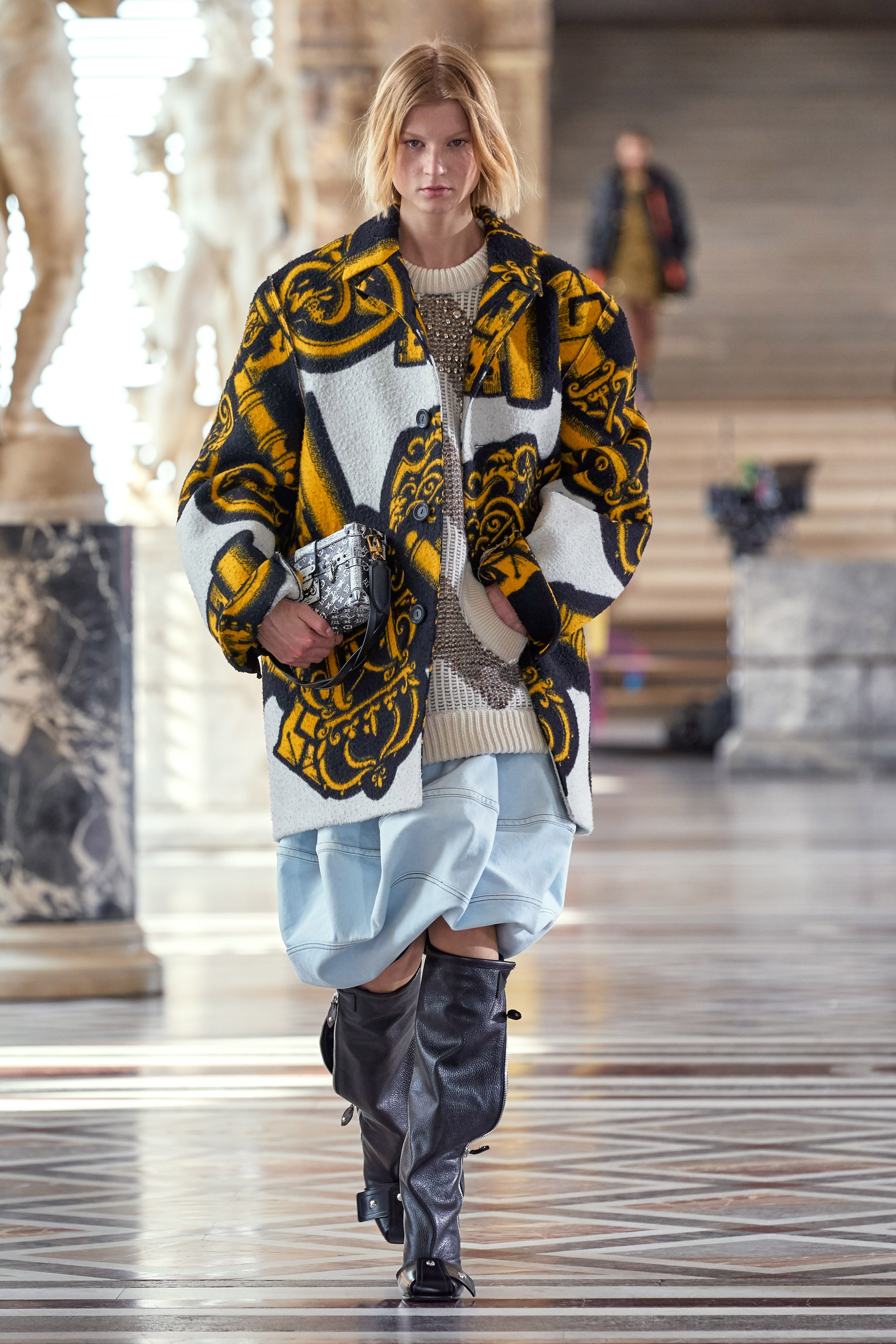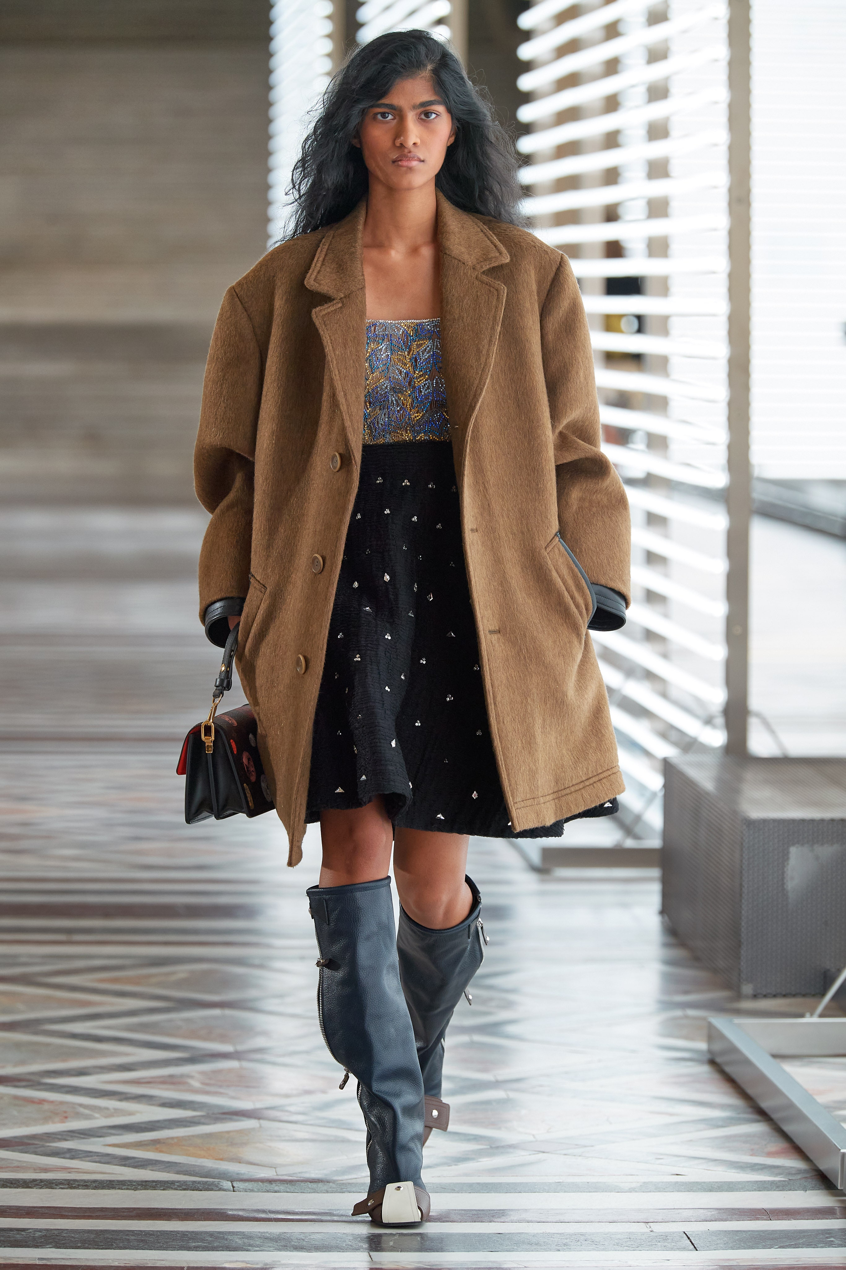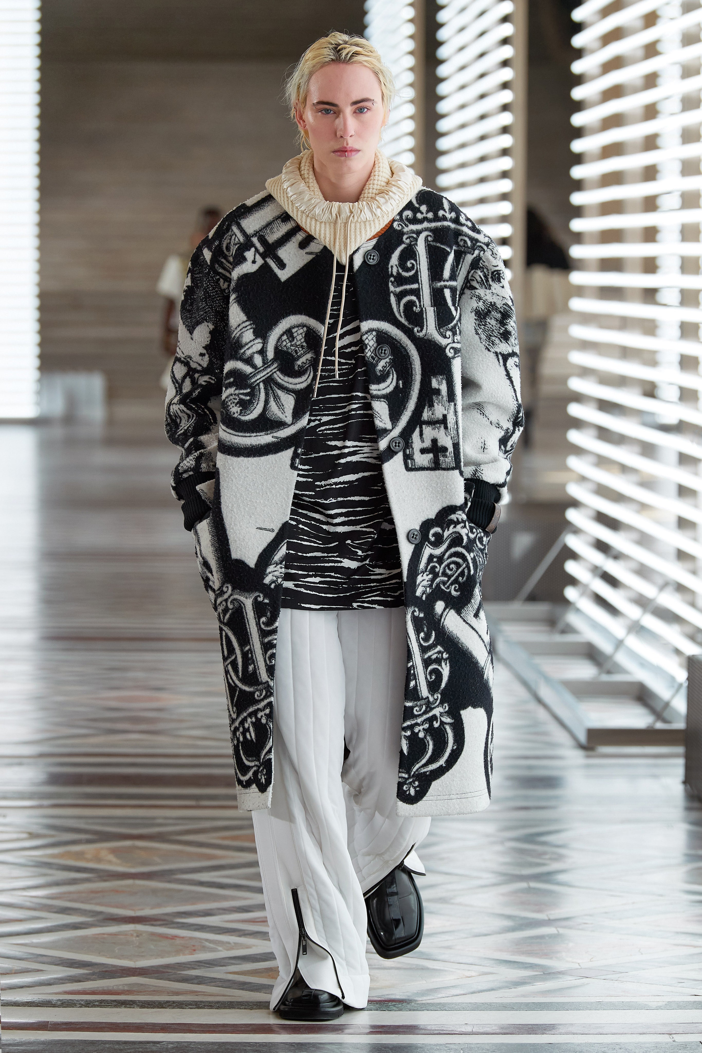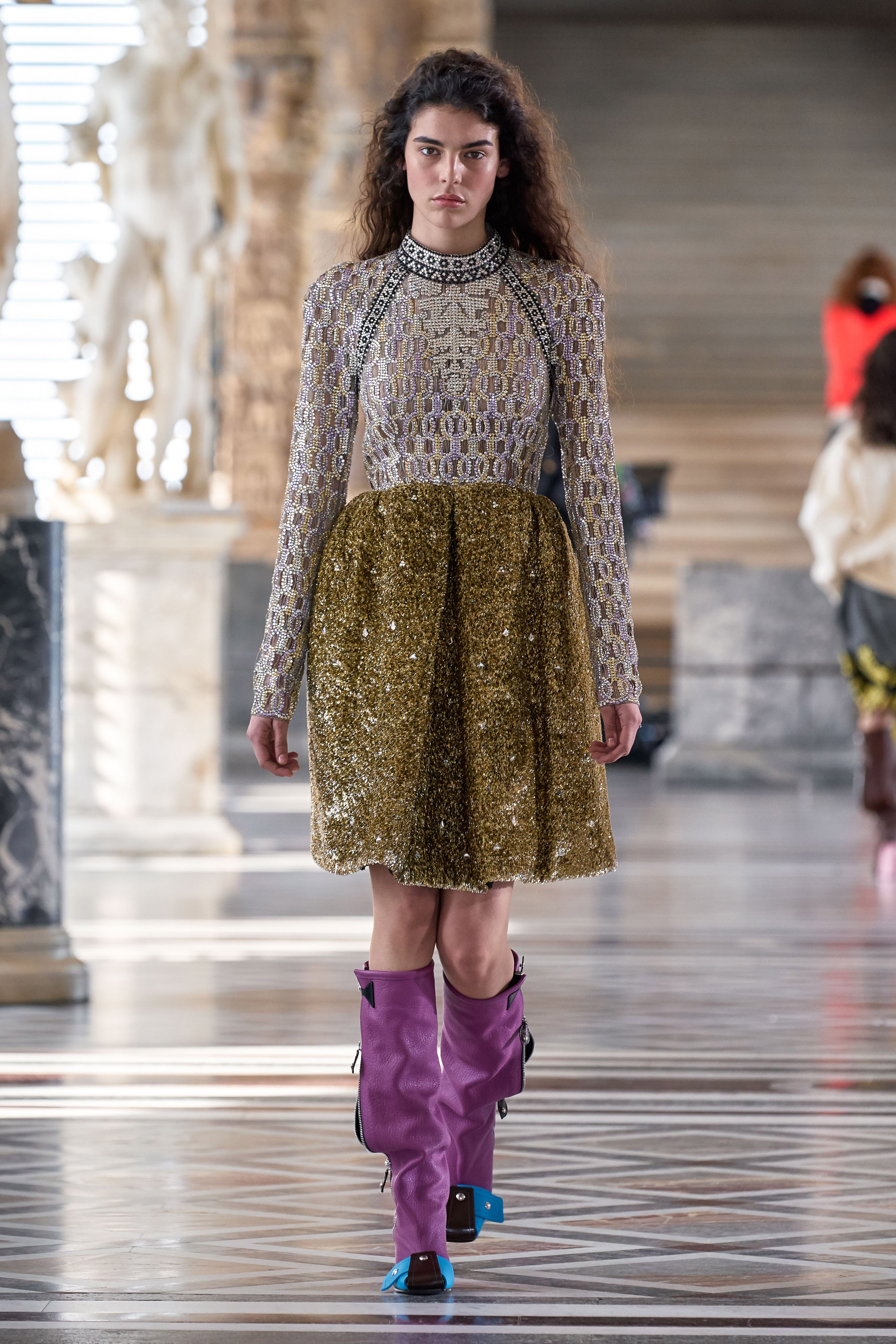 Фактуры вязаных жилетов и джемперов напоминают рельефы на дорических колоннах древнегреческих храмов, а дубленки покрывают орнаменты в виде змей и оливковых ветвей. Образы, созданные Жескьером, привычно напоминают конструктор: щедро декорированные платья, роскошные жаккардовые брюки или асимметричные джемперы, объемные пальто и плечистые пиджаки. В новом сезоне эклектичная и в то же время однородная эстетика Жескьера звучит еще более жизнеутверждающе, благодаря элементам праздничного и церемониального: сияющим глянцевым поверхностям, декору в виде жемчуга и золотых орнаментов, рюшам и оборкам.