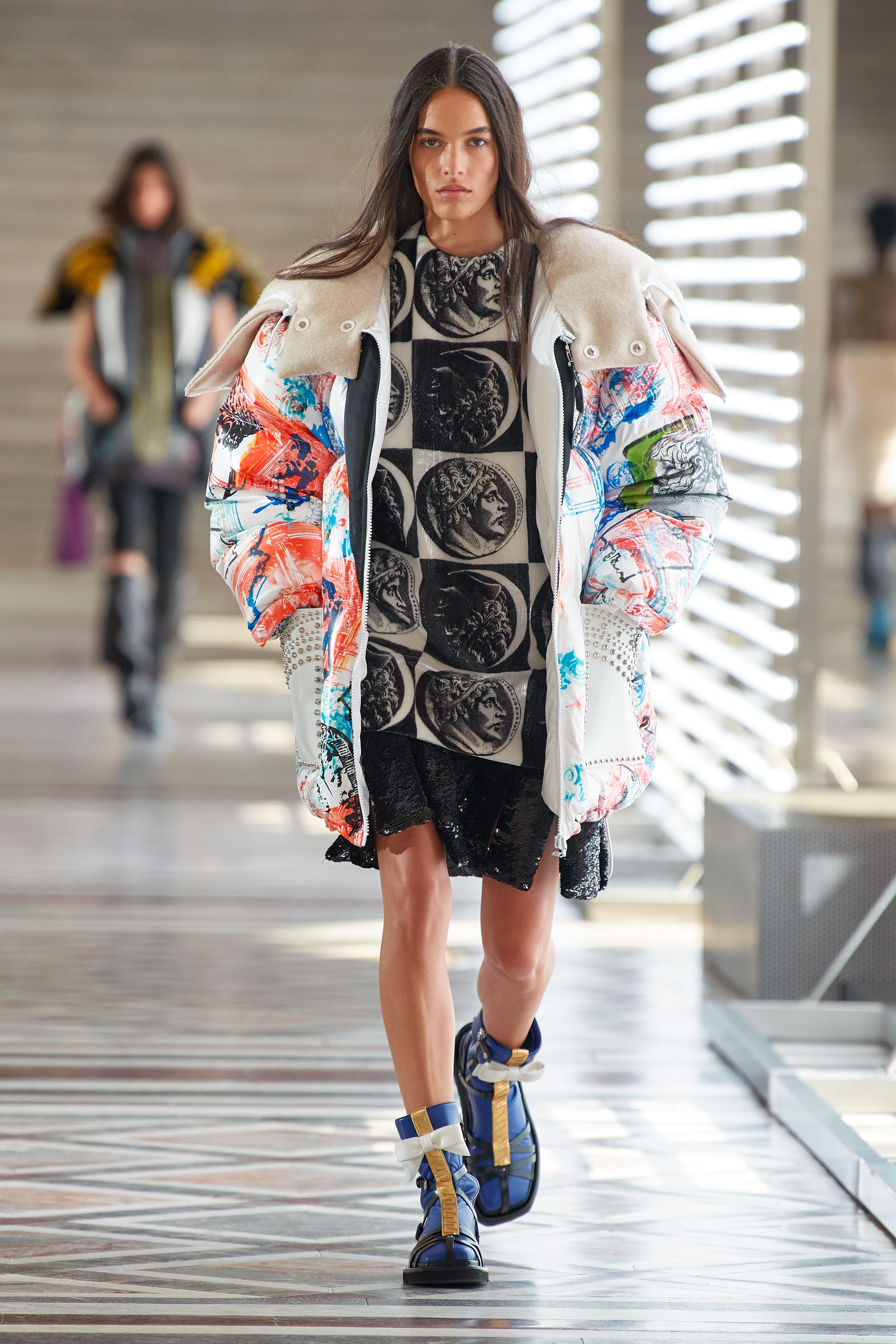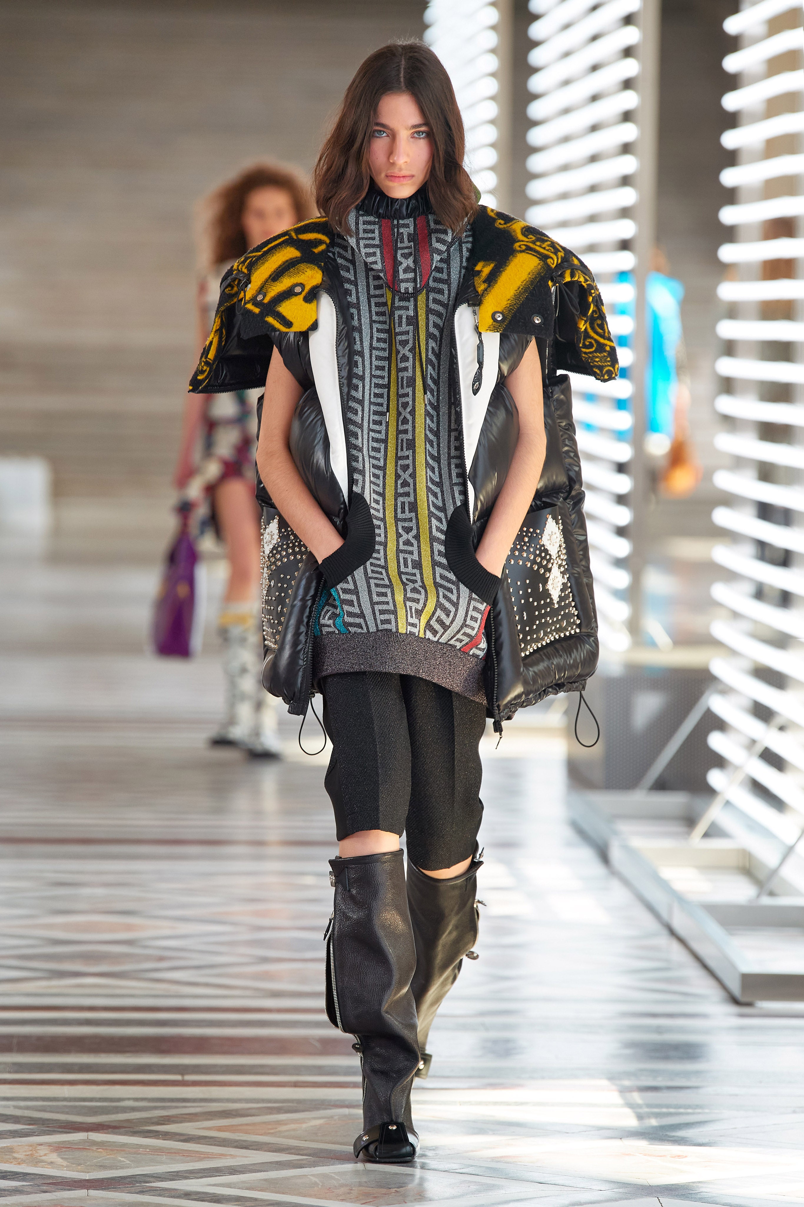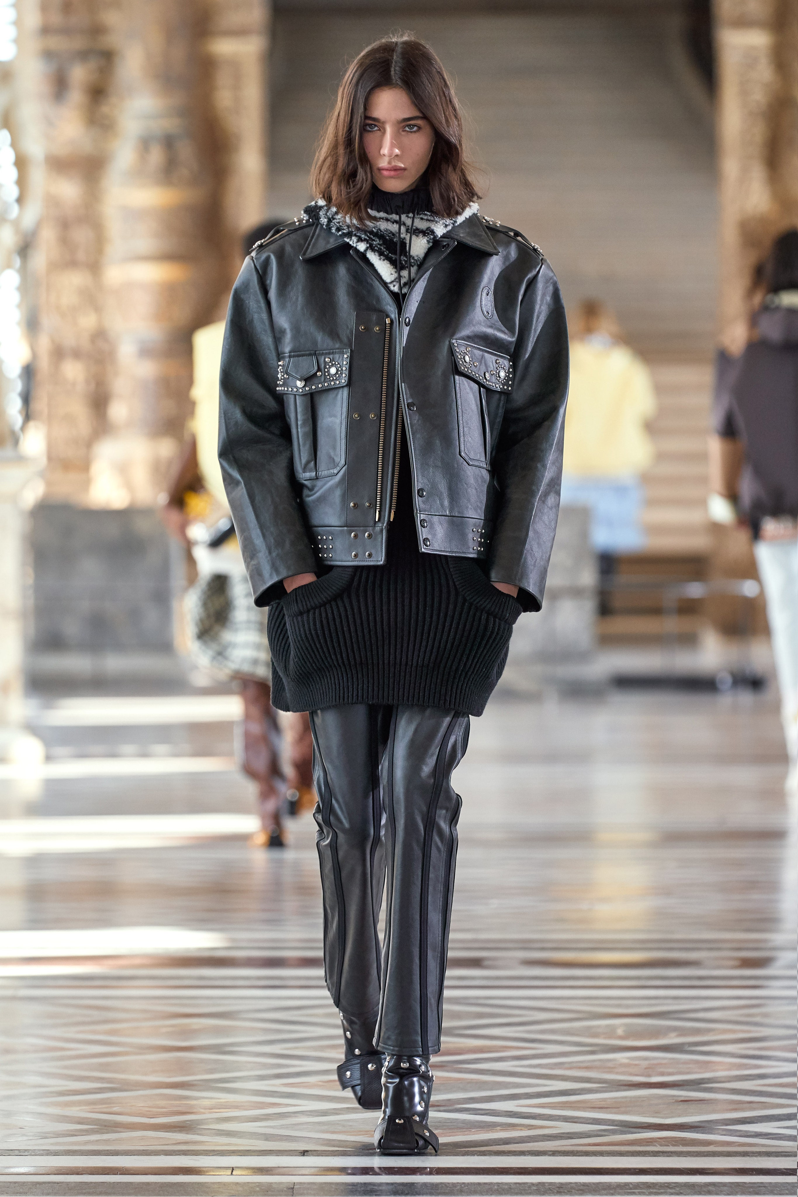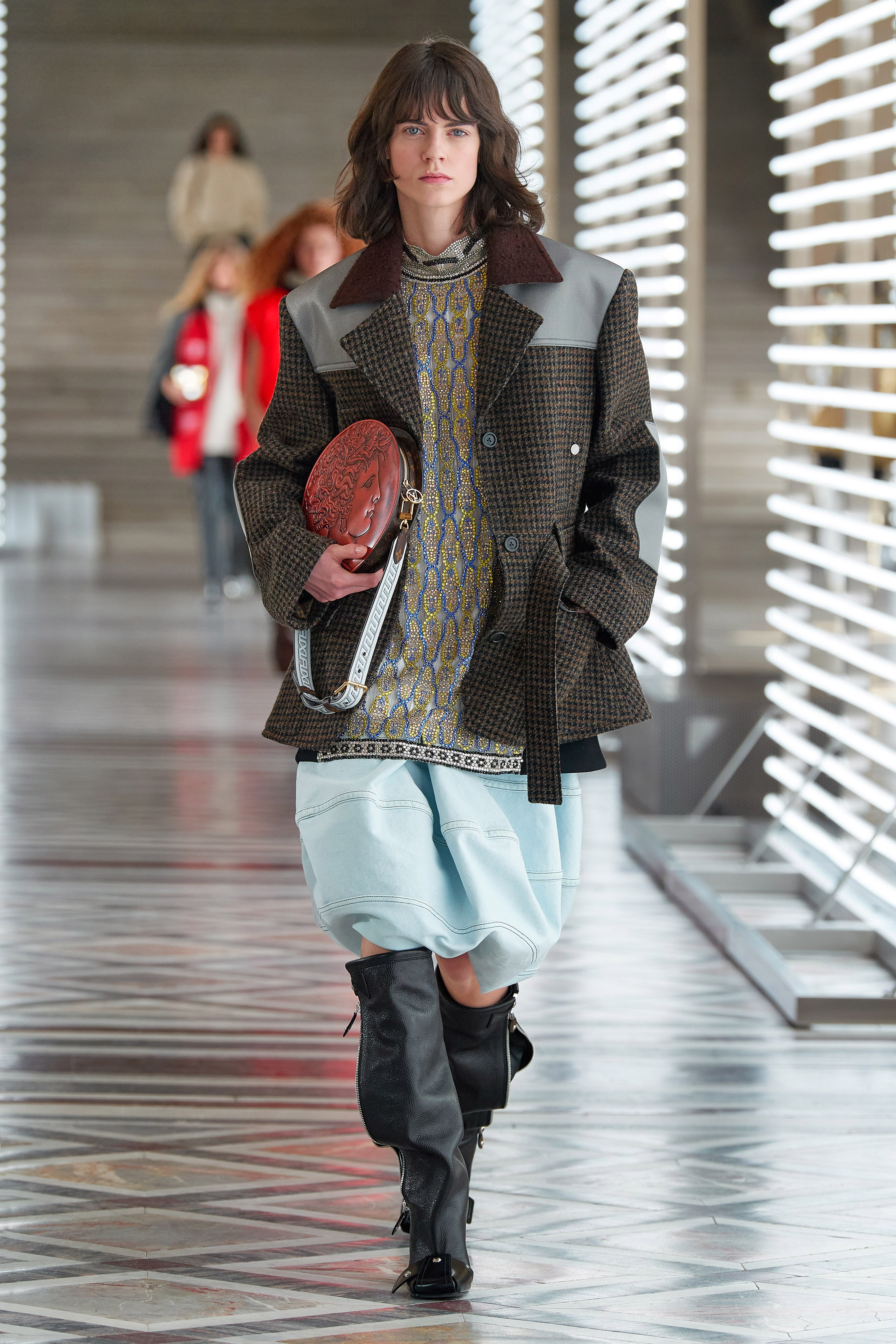 Фактуры вязаных жилетов и джемперов напоминают рельефы на дорических колоннах древнегреческих храмов, а дубленки покрывают орнаменты в виде змей и оливковых ветвей. Образы, созданные Жескьером, привычно напоминают конструктор: щедро декорированные платья, роскошные жаккардовые брюки или асимметричные джемперы, объемные пальто и плечистые пиджаки. В новом сезоне эклектичная и в то же время однородная эстетика Жескьера звучит еще более жизнеутверждающе, благодаря элементам праздничного и церемониального: сияющим глянцевым поверхностям, декору в виде жемчуга и золотых орнаментов, рюшам и оборкам.