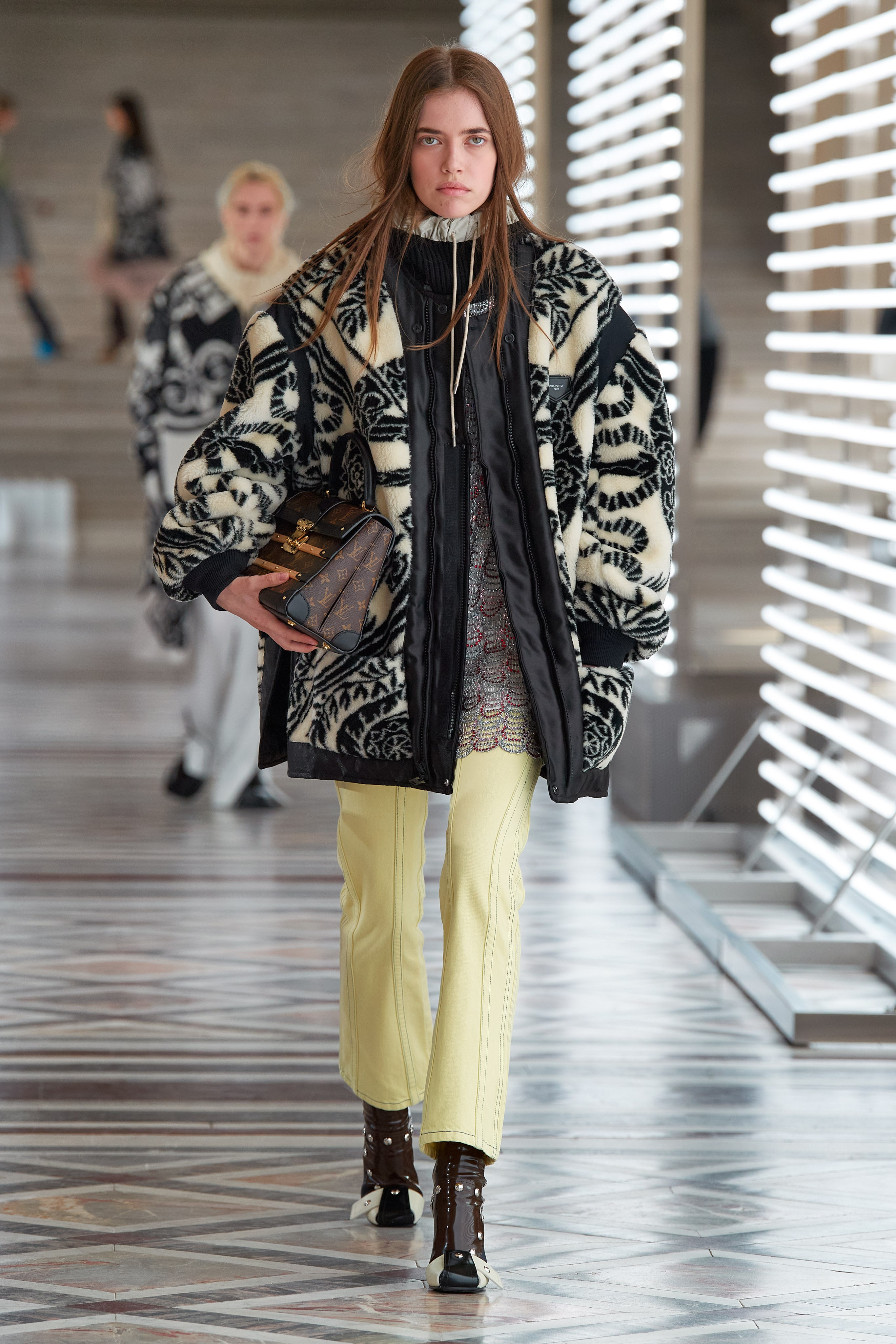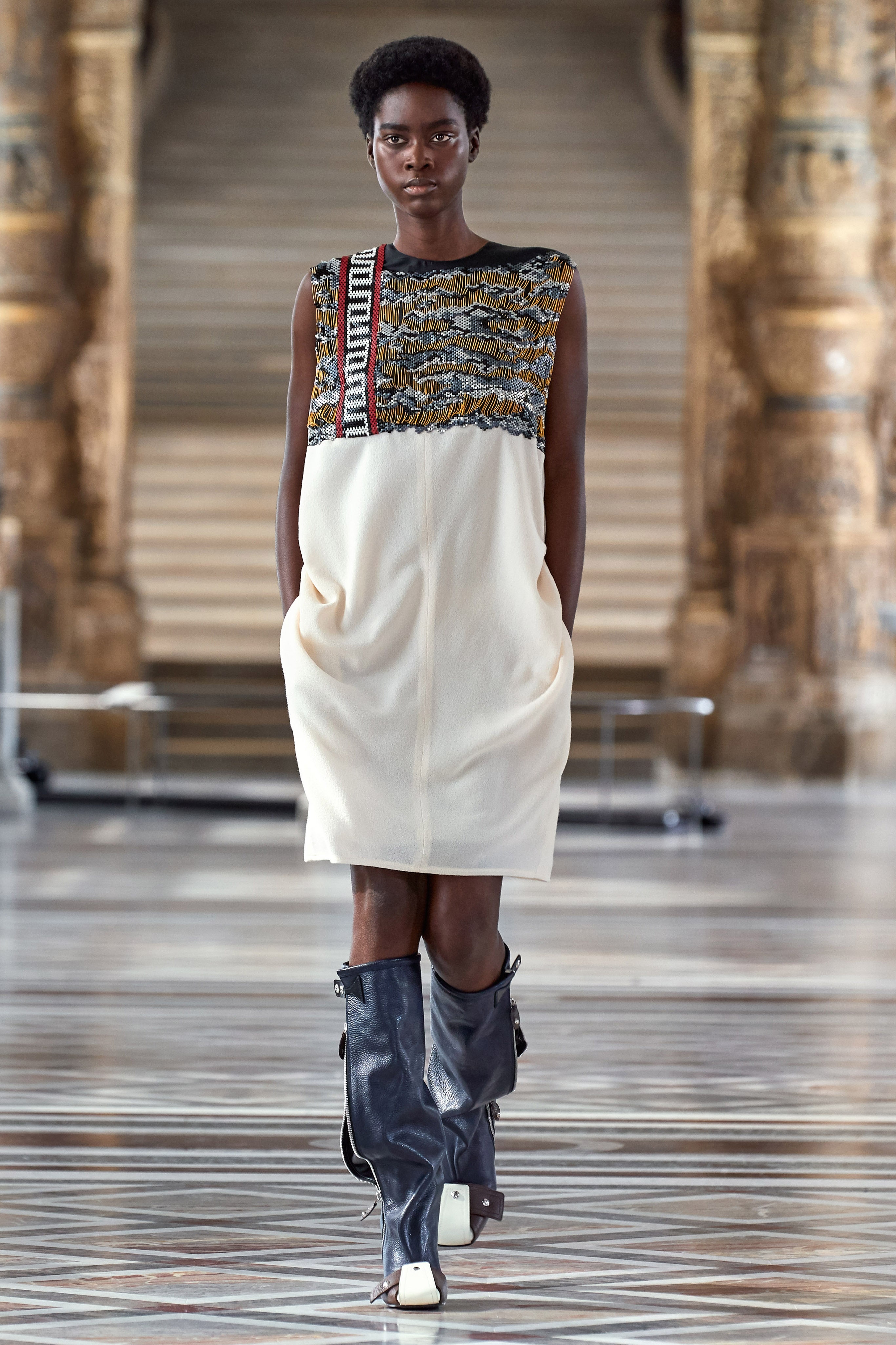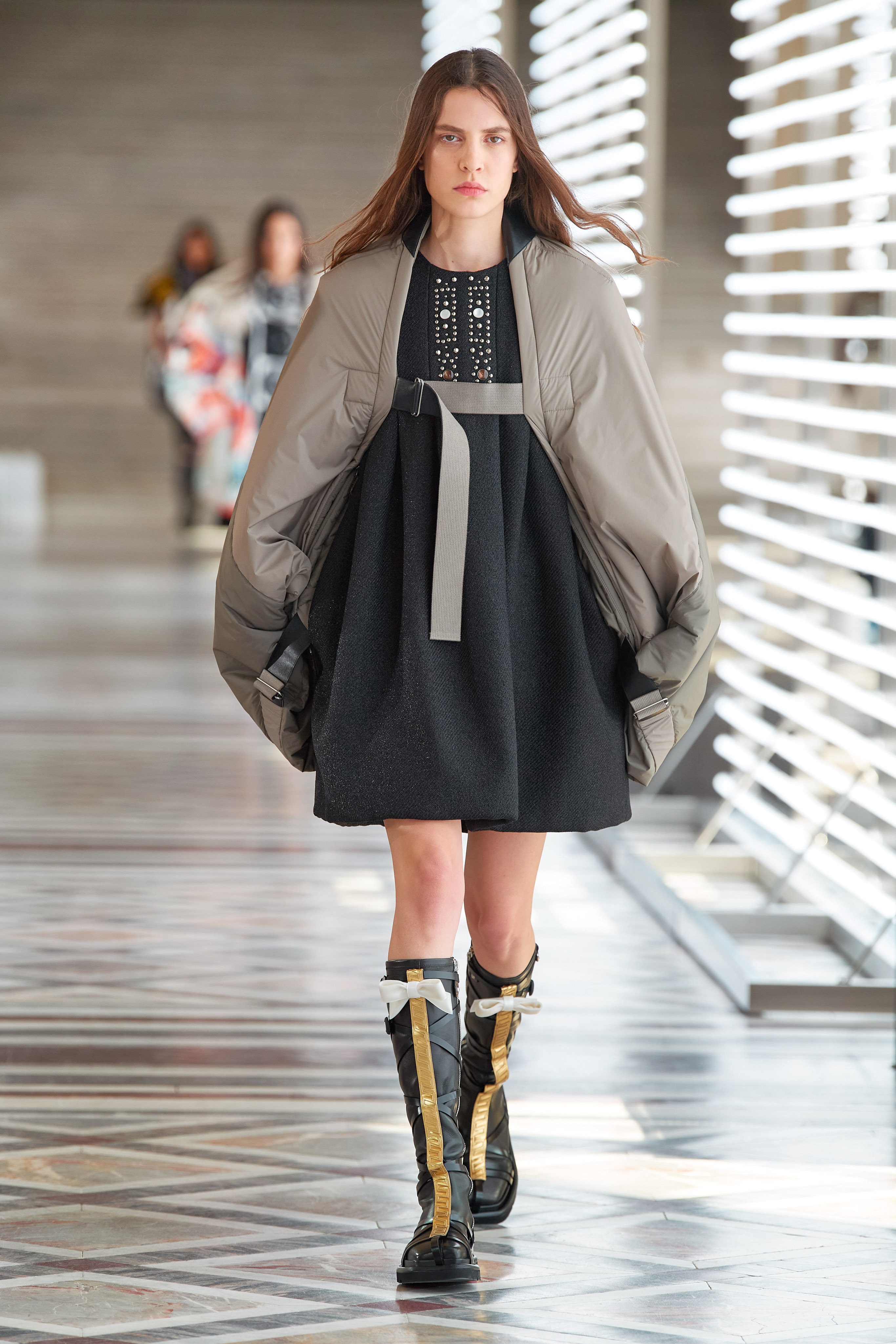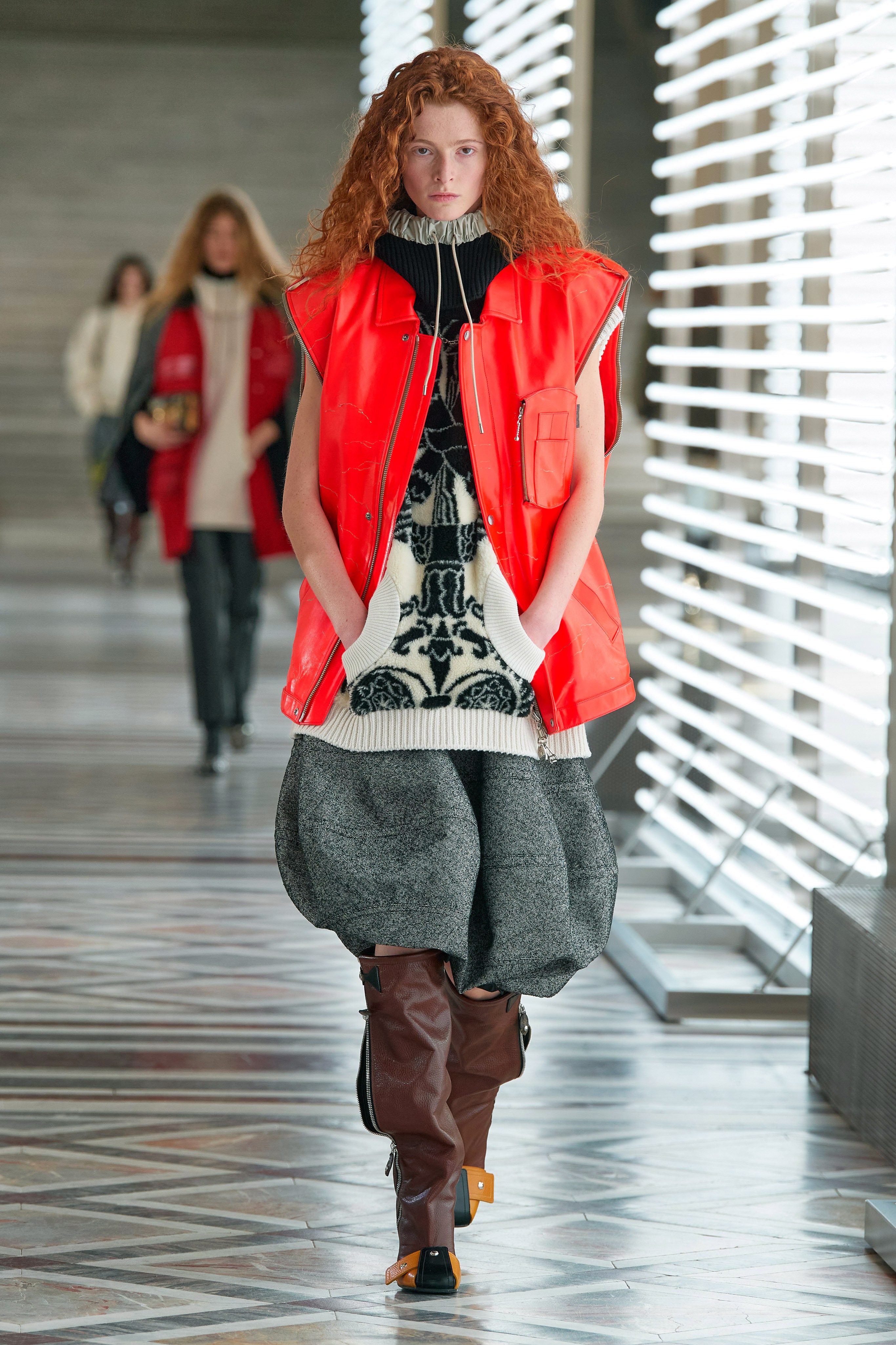 Фактуры вязаных жилетов и джемперов напоминают рельефы на дорических колоннах древнегреческих храмов, а дубленки покрывают орнаменты в виде змей и оливковых ветвей. Образы, созданные Жескьером, привычно напоминают конструктор: щедро декорированные платья, роскошные жаккардовые брюки или асимметричные джемперы, объемные пальто и плечистые пиджаки. В новом сезоне эклектичная и в то же время однородная эстетика Жескьера звучит еще более жизнеутверждающе, благодаря элементам праздничного и церемониального: сияющим глянцевым поверхностям, декору в виде жемчуга и золотых орнаментов, рюшам и оборкам.