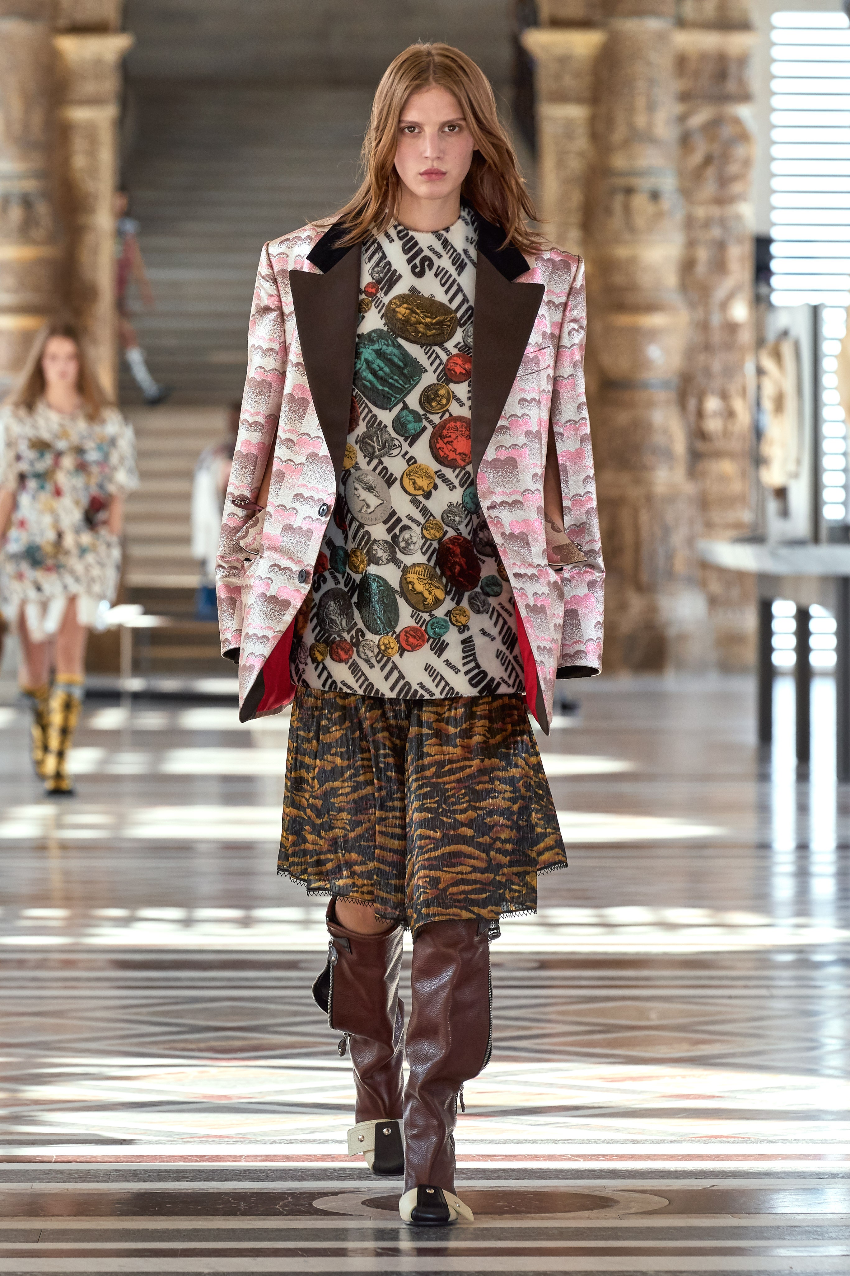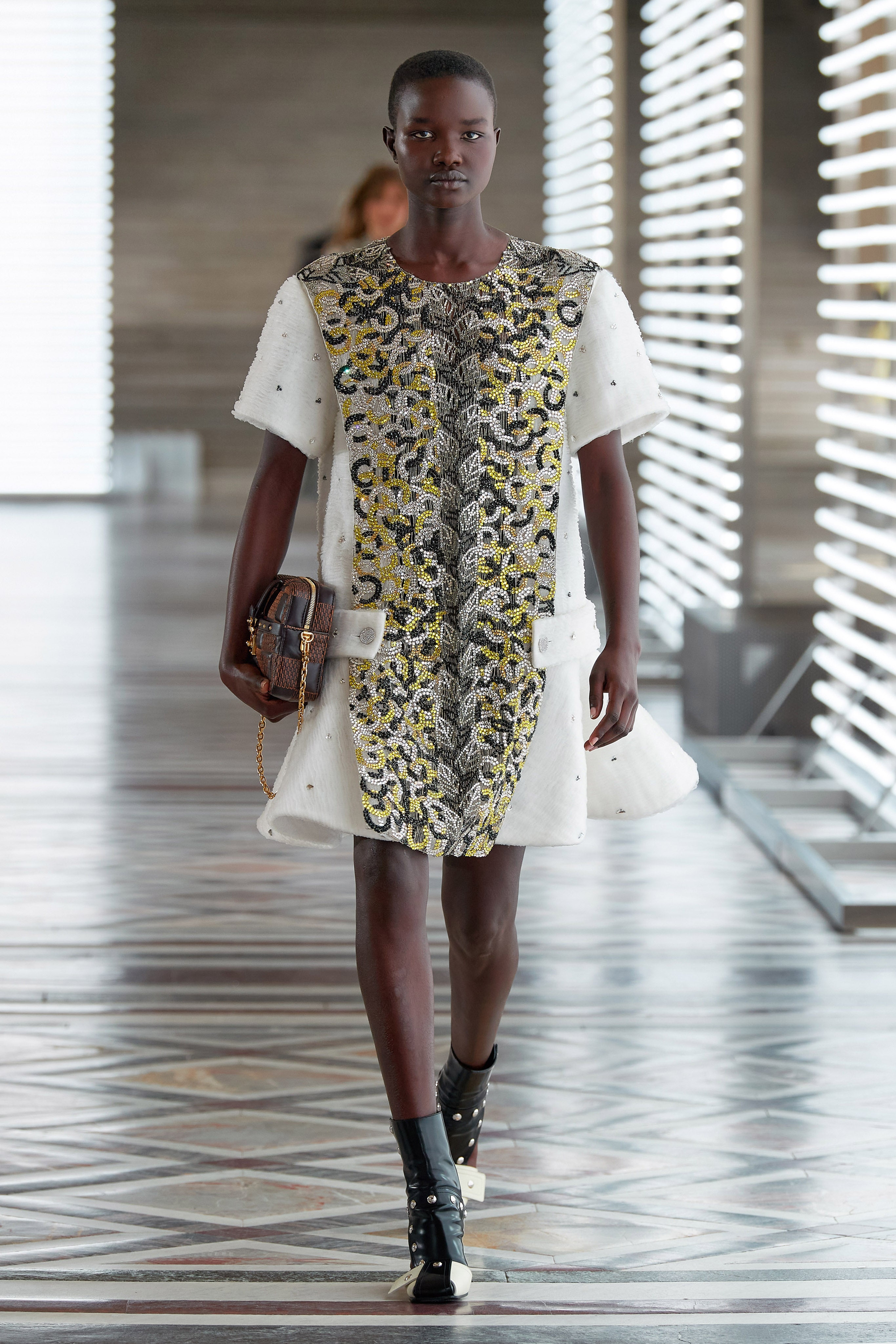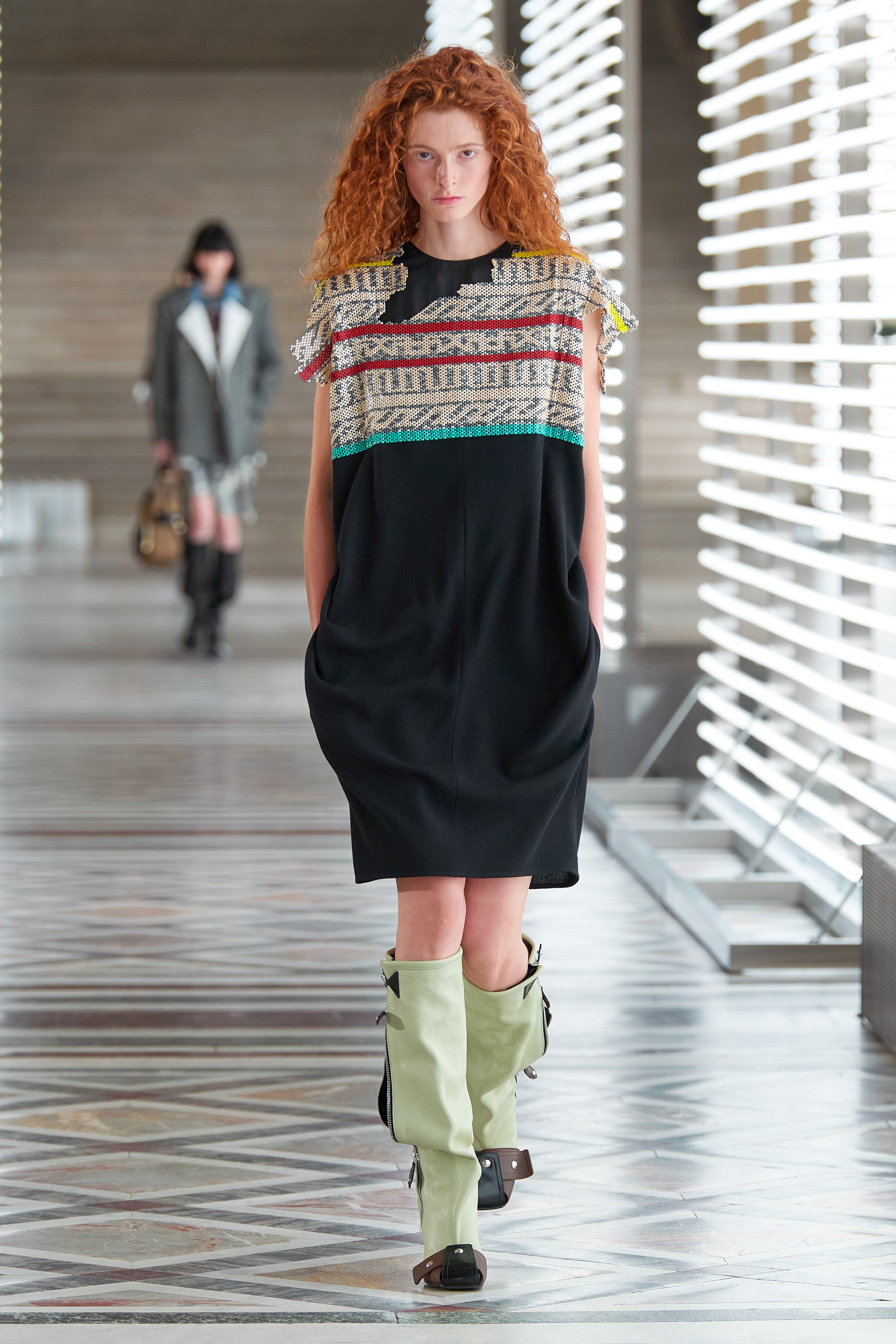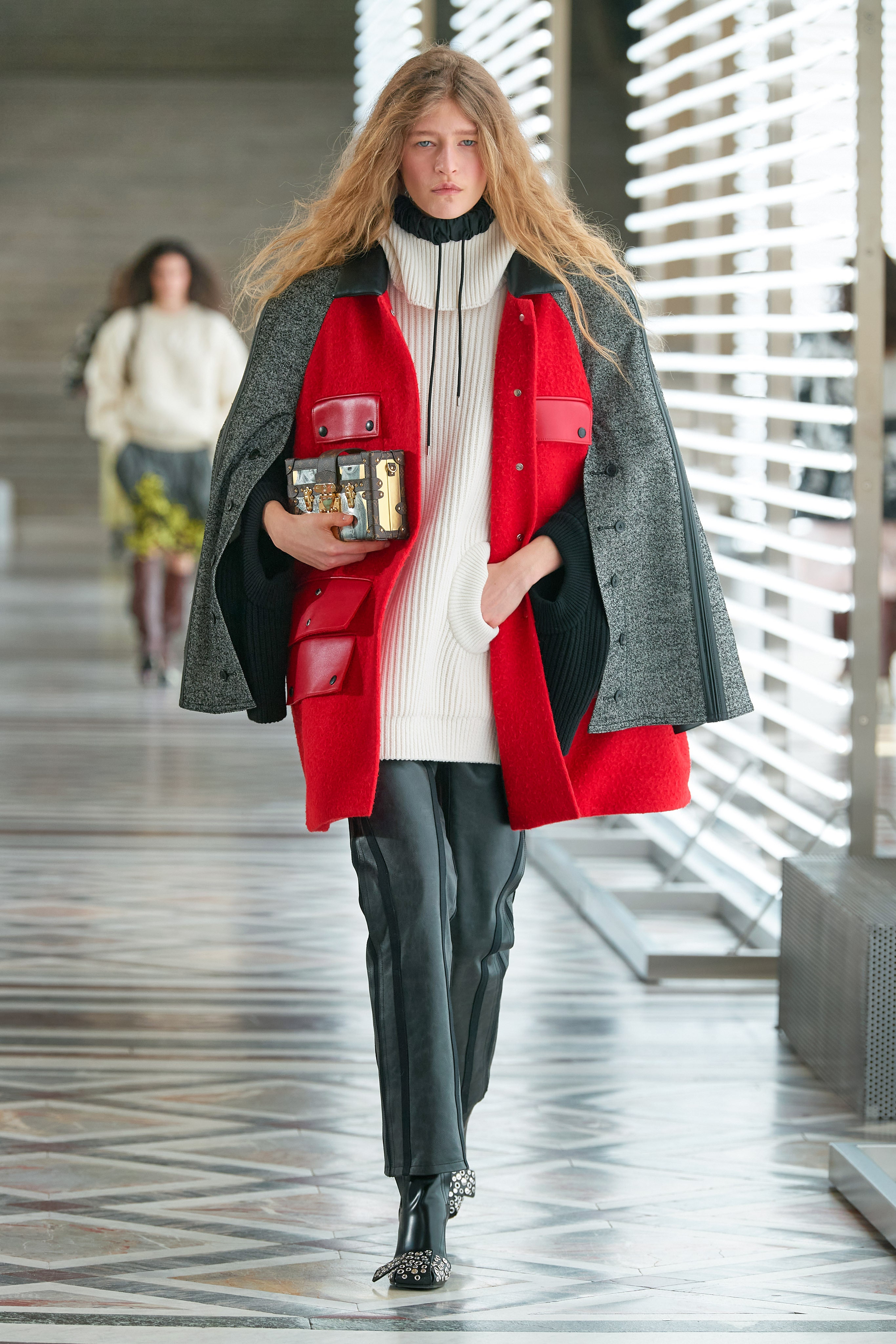 Фактуры вязаных жилетов и джемперов напоминают рельефы на дорических колоннах древнегреческих храмов, а дубленки покрывают орнаменты в виде змей и оливковых ветвей. Образы, созданные Жескьером, привычно напоминают конструктор: щедро декорированные платья, роскошные жаккардовые брюки или асимметричные джемперы, объемные пальто и плечистые пиджаки. В новом сезоне эклектичная и в то же время однородная эстетика Жескьера звучит еще более жизнеутверждающе, благодаря элементам праздничного и церемониального: сияющим глянцевым поверхностям, декору в виде жемчуга и золотых орнаментов, рюшам и оборкам.