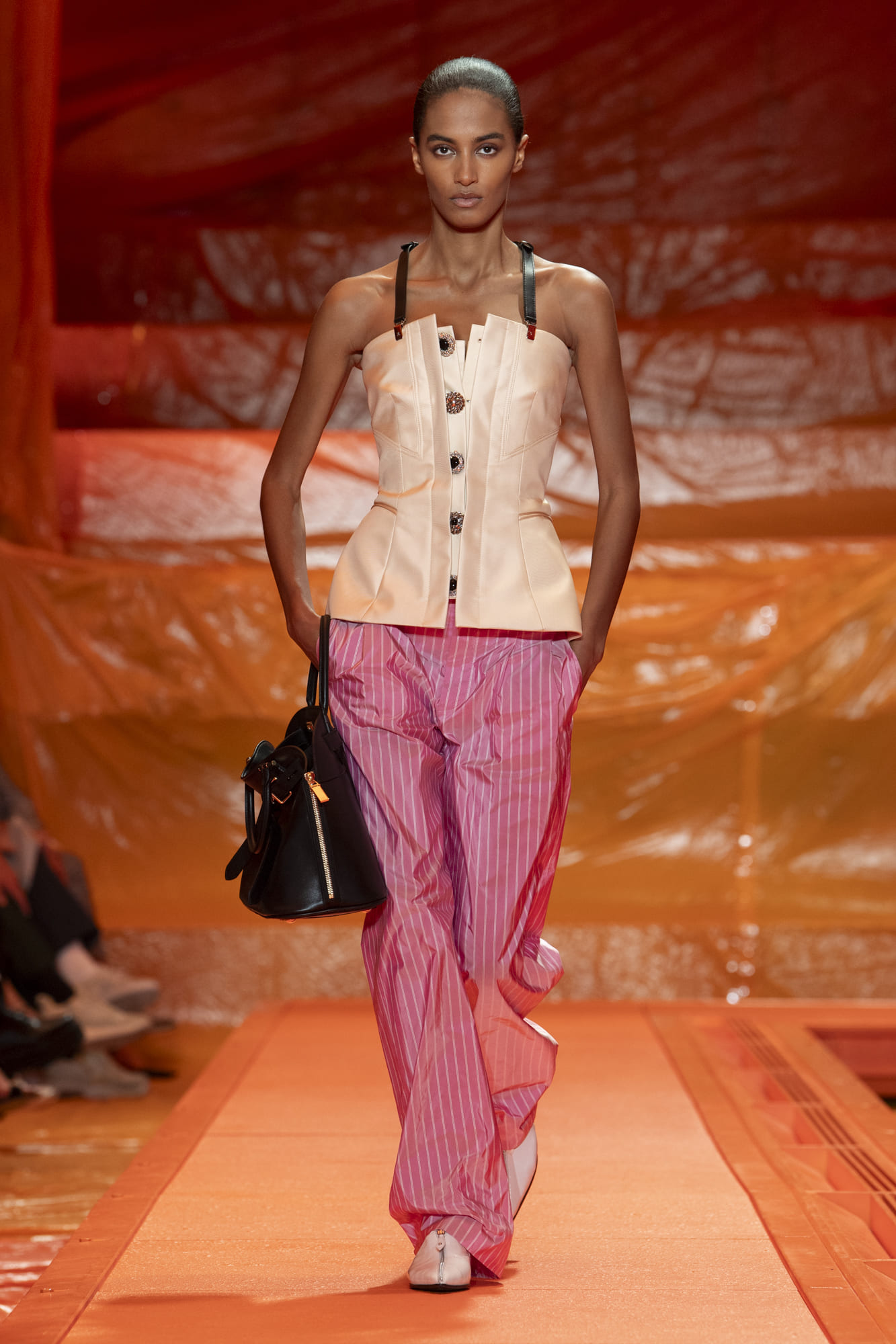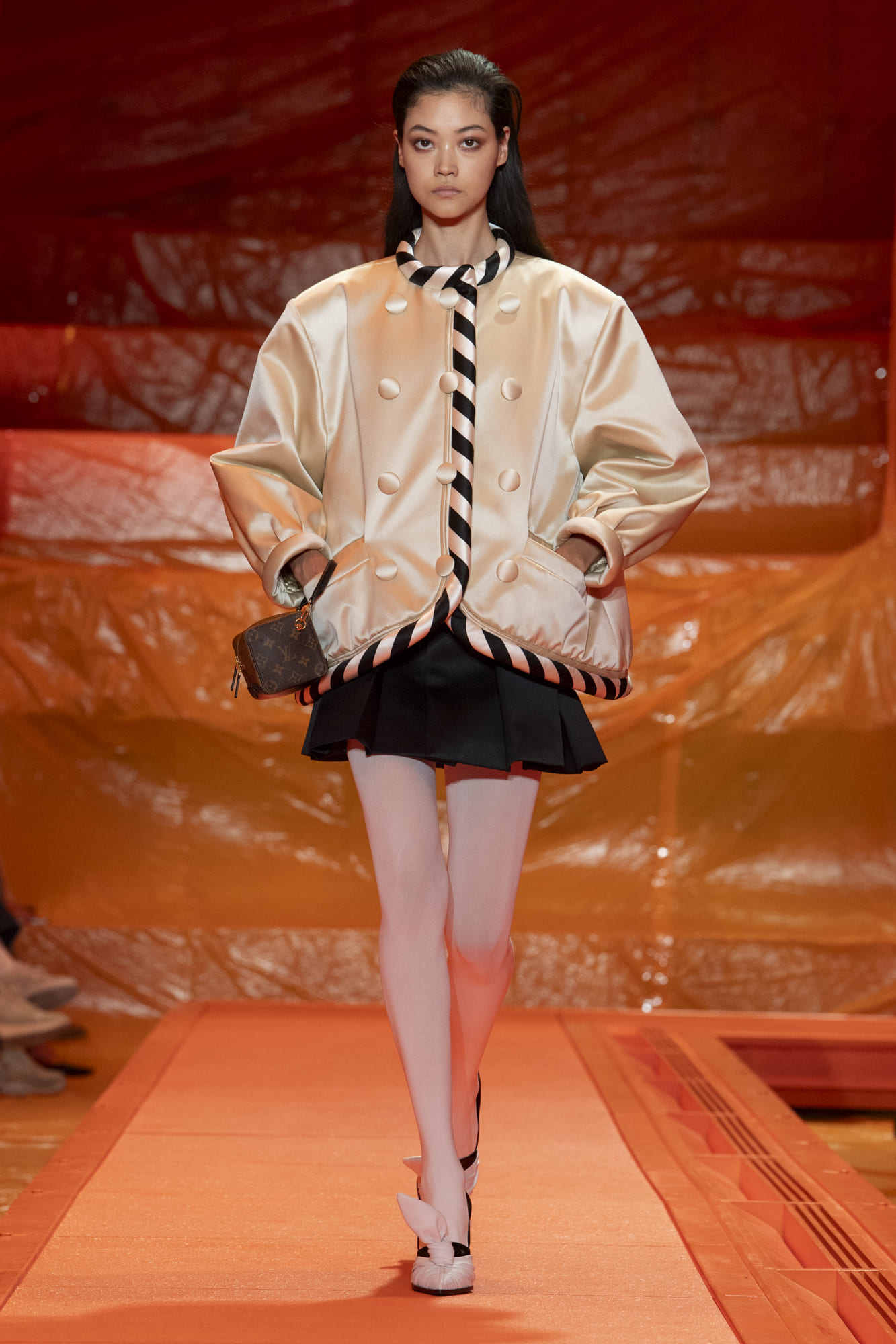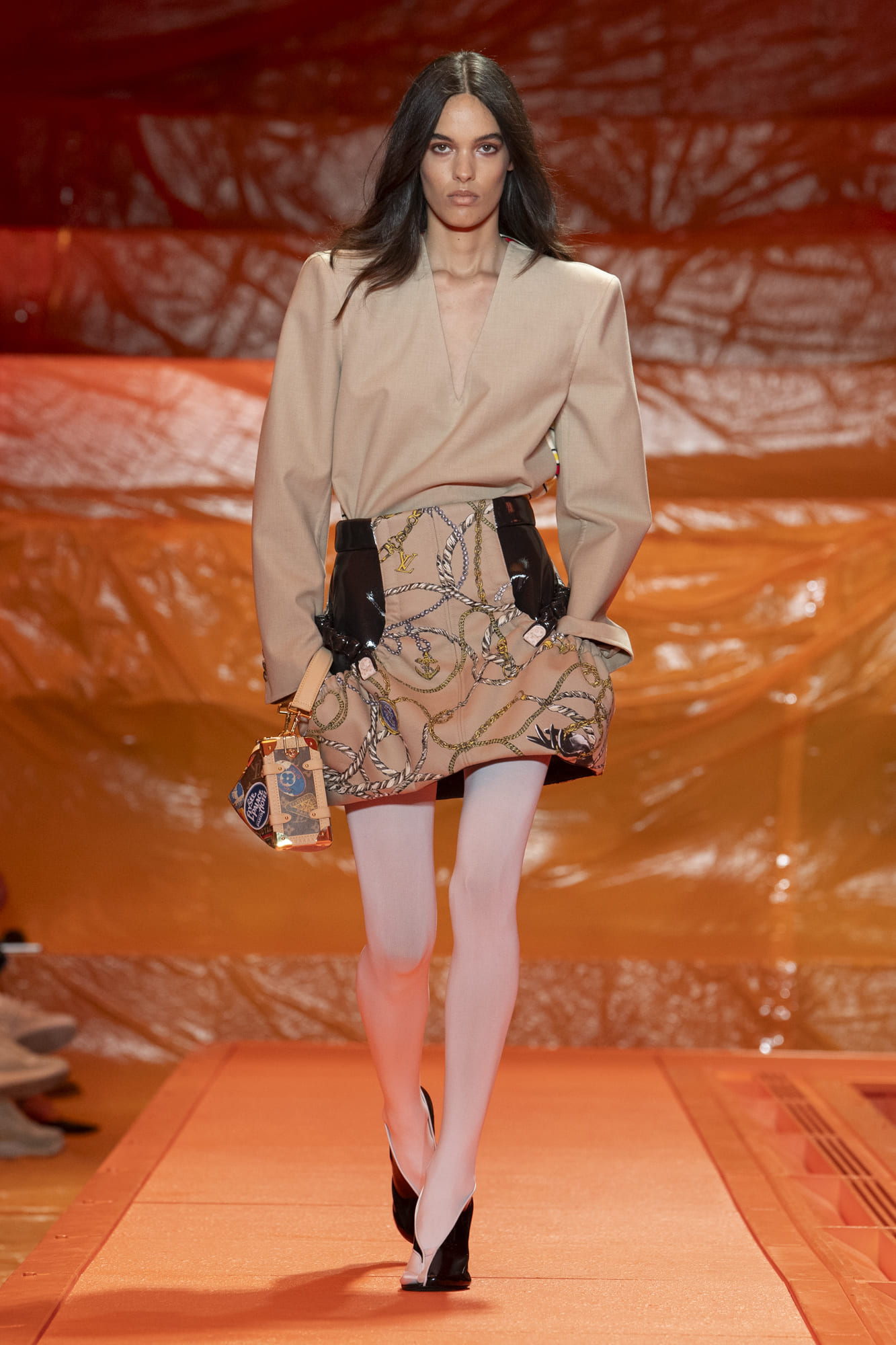 На початку показу були продемонстровані довгі повітряні спідниці з мусліну й шармезу в парі з бомберами або шовковими блузами. На стегнах моделей розмістився шкіряний ремінь — із монограмою Louis Vuitton, у чорному чи білому кольорі та в горошковий принт. Корсетні топи й сорочки без ґудзиків комбінувалися з багатошаровим низом. Образи з білими колготками, структурним верхнім одягом, монохромними комплектами й об'ємними плечима відсилали до стилю 80-х.