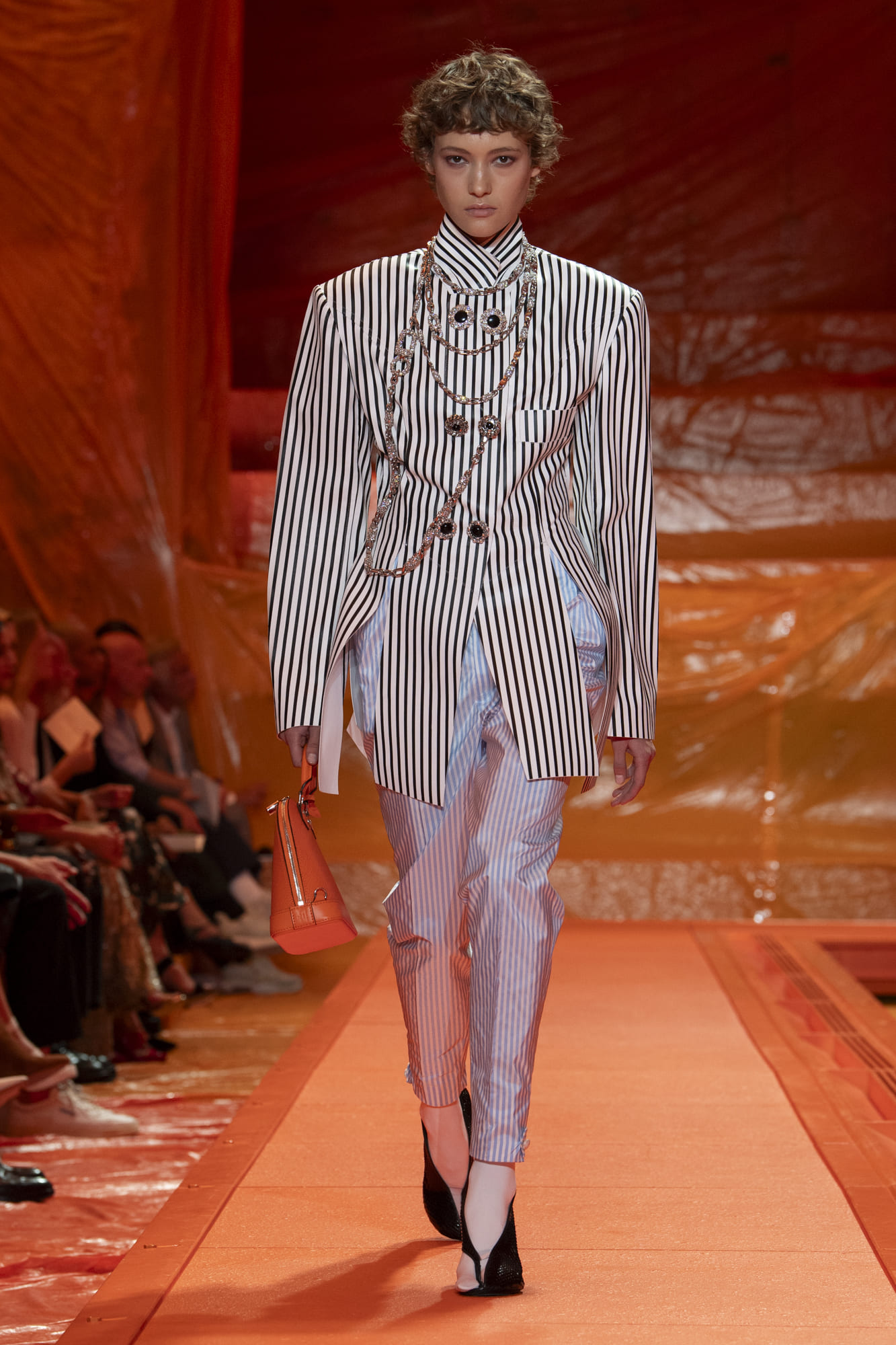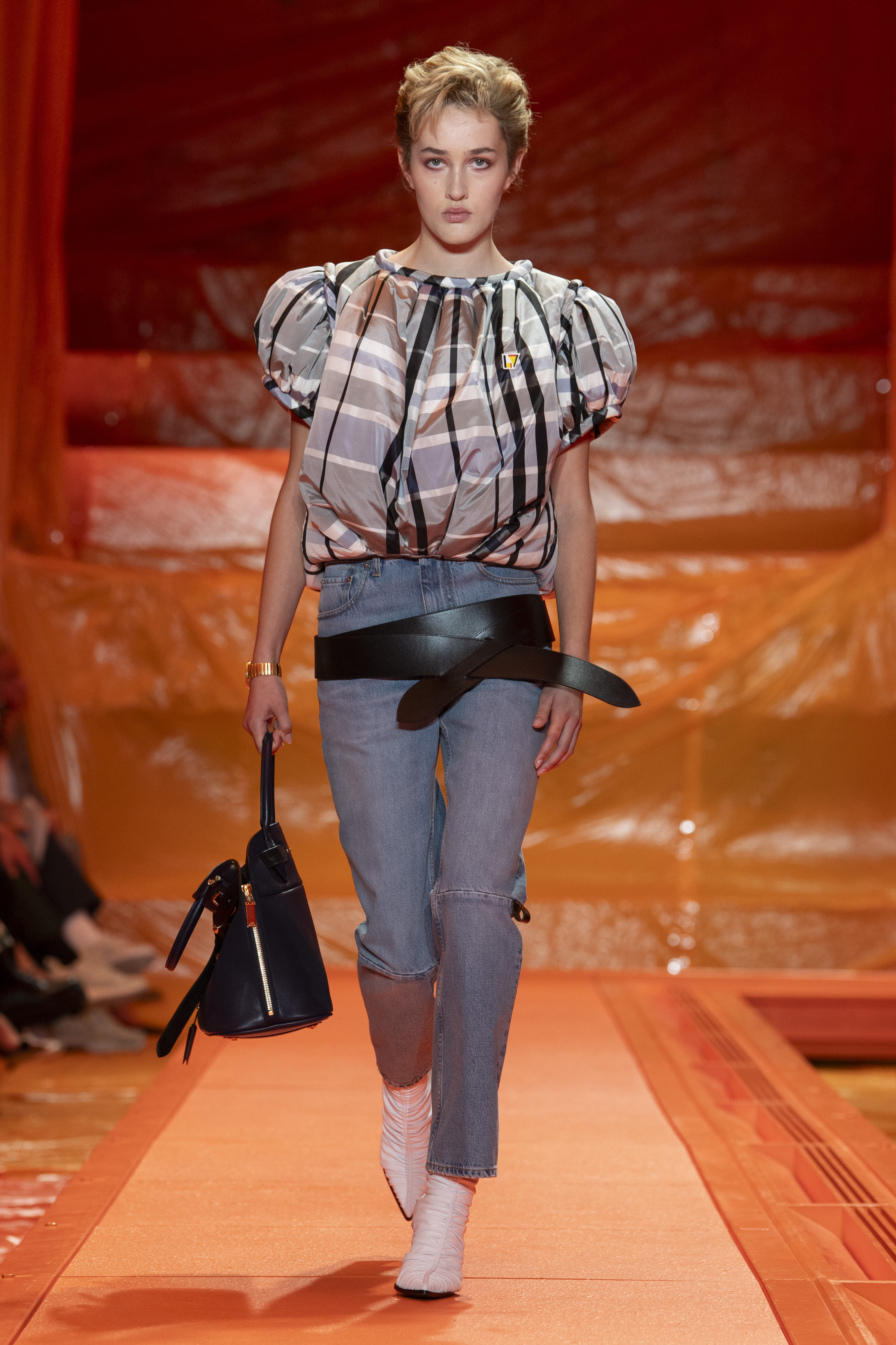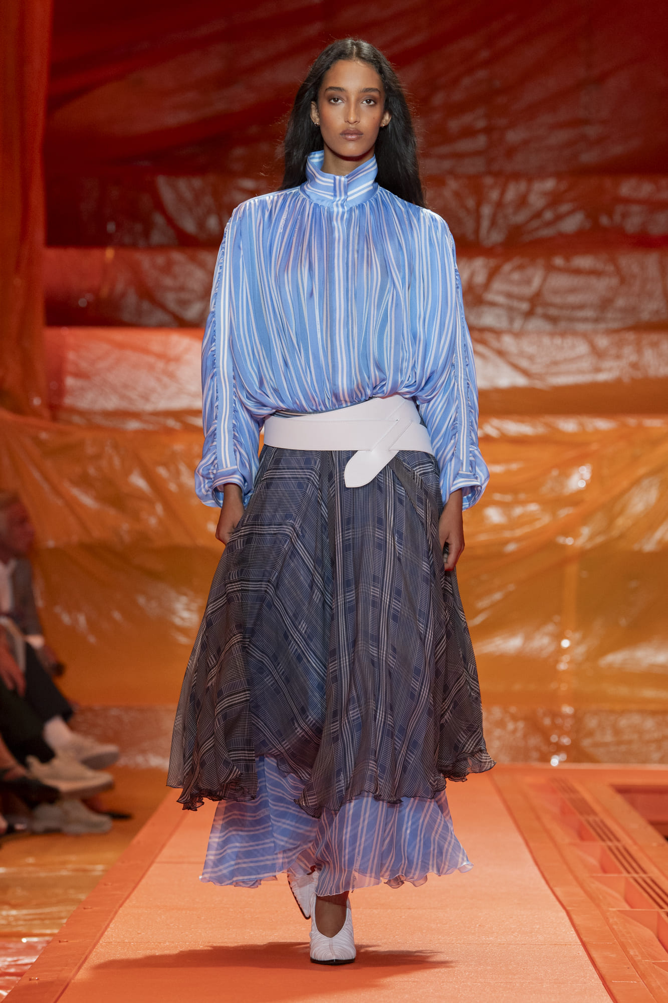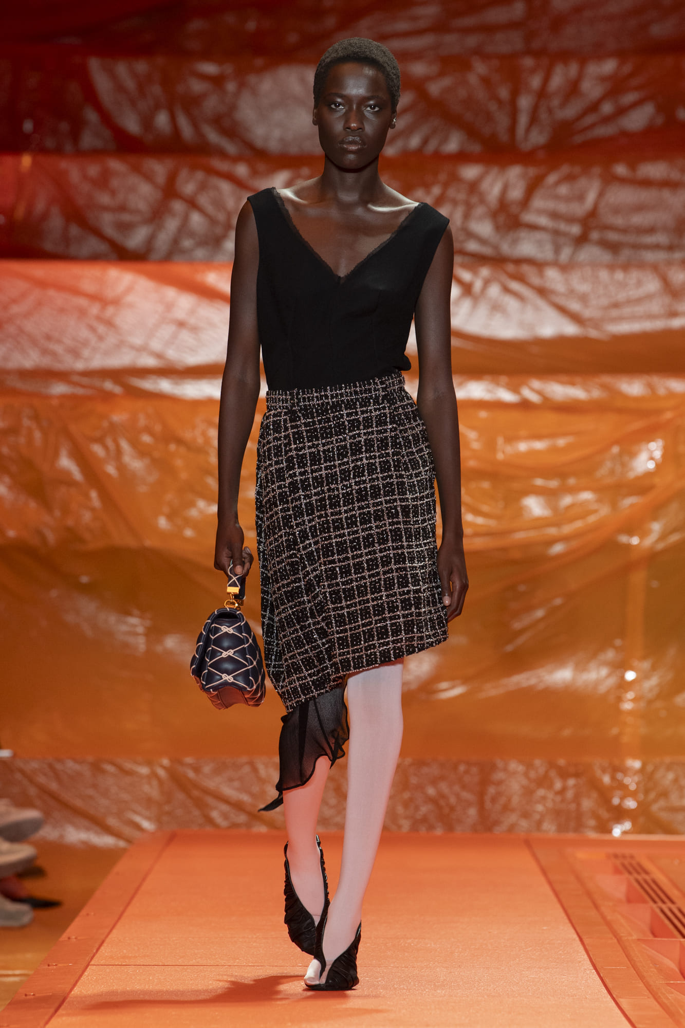 На початку показу були продемонстровані довгі повітряні спідниці з мусліну й шармезу в парі з бомберами або шовковими блузами. На стегнах моделей розмістився шкіряний ремінь — із монограмою Louis Vuitton, у чорному чи білому кольорі та в горошковий принт. Корсетні топи й сорочки без ґудзиків комбінувалися з багатошаровим низом. Образи з білими колготками, структурним верхнім одягом, монохромними комплектами й об'ємними плечима відсилали до стилю 80-х.