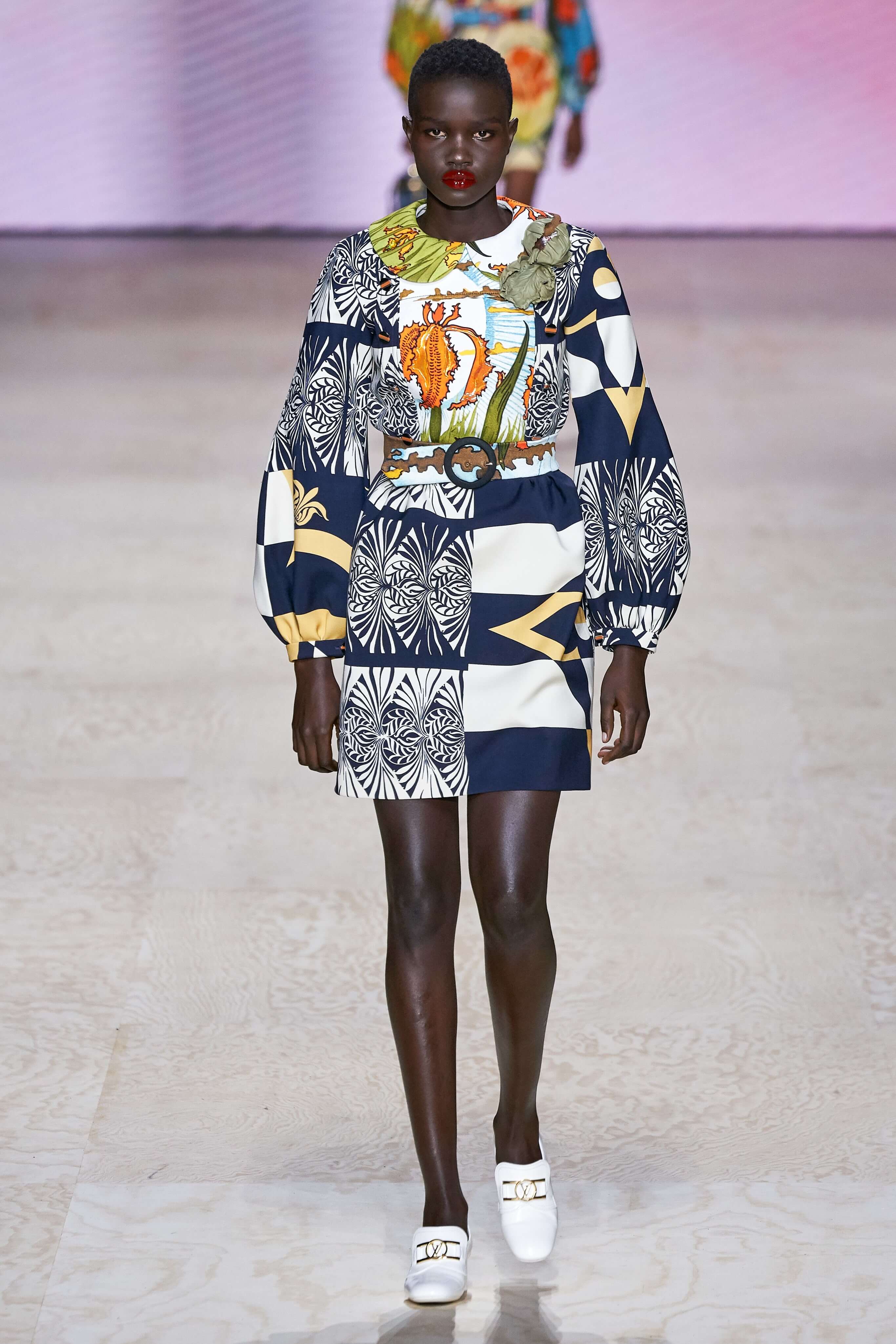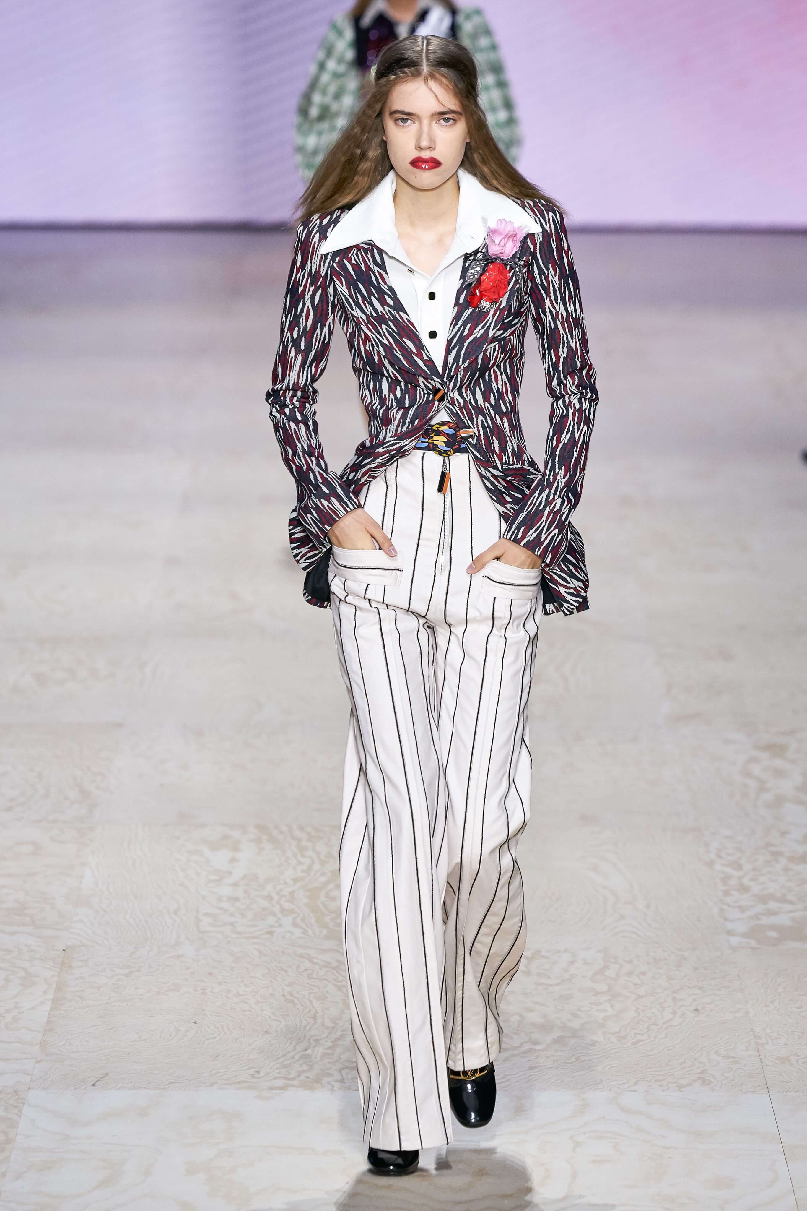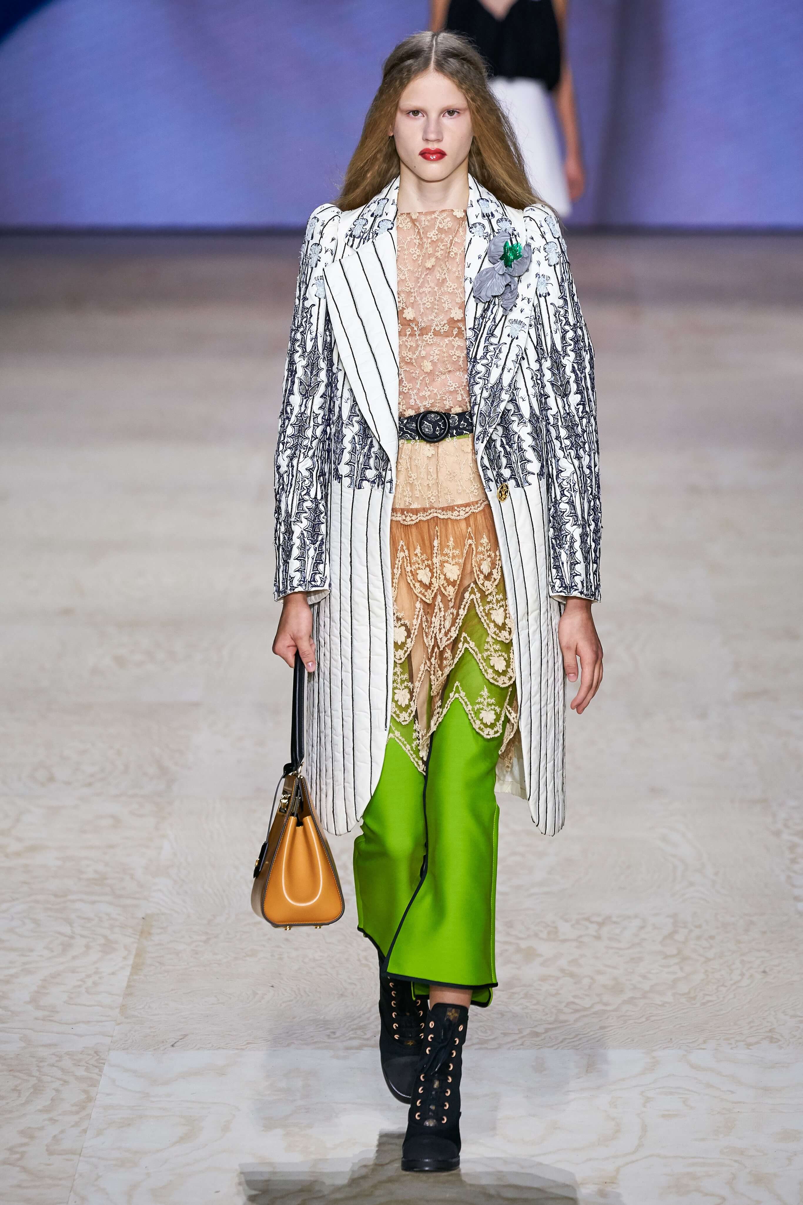 Одними из самых эффектных в коллекции стали образы с широкими белыми брюками, надетыми вместе с горчичным тренчем, лиловым пальто из кожи и платьями с белыми манишками и увеличенными у манжет рукавами, достоверно цитирующими моду великолепной эпохи, но всё же совершенно нестаромодные. Лёгкая и изящная стилистика коллекции в очередной раз доказывает талант Николя Гескьера вписывать историю моды в современность так, что представляешь это себе на модниках какого-нибудь 2030 года.